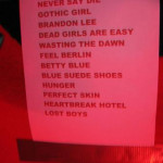 Dort befand man sich in überaus zahlreicher Gesellschaft, platze der Raum doch fast aus allen Nähten und der Temperaturunterschied zwischen Bühnen- und Barraum betrug locker um die 10 Grad. Falls jemand noch den Besuch einer finnischen Sauna eingeplant hatte, hatte er somit gewissermaßen fast schon zwei Fliegen mit einer Klappe erledigt. Der ursprünglich für 23:10 Uhr angesetzte Beginn verzögerte sich um zehn Minuten, bis dann schließlich die Musikkonserve ein Einsehen hatte und stattdessen das Intro ertönte, gefolgt von der Band, die mit "Bury Alive By Love" umgehend in die Vollen ging. Es folgte der erste mit Spannung erwartete Song vom Anfang Februar erscheinenden neuen Album "Screamworks- Love In Theory And Practice": "Heartkiller", seines Zeichens auch die erste Singleauskopplung, bewies Live-Tauglichkeit und das übliche Händchen für schöne Melodien. Als nach "Rip Out The Wings Of A Butterfly" immer noch keine Kippe in der Hand von Sänger Ville Valo, bis dato bekanntlich berüchtigter Kettenraucher, aufgetaucht war, stieg in dem einen oder anderen langsam der Verdacht auf, ob hier vielleicht tatsächlich jemand dem Nikotin abgeschworen haben könnte, denn im Tavastia herrscht zwar Rauchverbot, aber das hatte Herrn Valo bis dahin auch nie gestört und für jemanden, der sich gerade für die Dauer eines Eindreiviertelstunden-Sets auf Nikotin-Entzug befand wirkte er reichlich fröhlich und erzählte munter Anekdoten, deren Inhalt beziehungsweise Bedeutung allerdings weitestgehend den finnischsprachigen Anwesenden vorbehalten blieb. Mit einem Verweis auf BLACK SABBATH wurde das nächste neue Lied in Gestalt von "Love, The Hardest Way" angekündigt, dessen opulent-düsteres Kirchenorgel-Intro einen sich für einen Moment lang fast in einem irgendwie ins Dunkle abgerutschten Gottesdienst wähnen ließ und die Erwartungen bezüglich des zugehörigen anstehenden Albums zusätzlich erhöhte. Wer das Lied auf der Setlist zu finden versucht, sucht im übrigen vergeblich und sei daher an dieser Stelle erklärungshalber an den Punkt namens "Sullon Faijaa" verwiesen, da der gute Ville bei der Gestaltung und Benennung seiner handschriftlichen (wahrscheinlich sollte man eher schon sagen "gemalten") Setlisten mitunter beträchtliche Kreativität an den Tag legt. Für Überraschung im Set sorgte jedoch nicht nur neues Material, sondern auch das eine oder andere ältere Lied, das es schon geraume Zeit nicht mehr live zu bestaunen gegeben hatte, so zum Beispiel "Love Said No", die herrliche Schmachtnummer "Bury Me Deep Inside Your Heart" und das wirklich eine kleine Ewigkeit in der Versenkung verschwunden gewesene "Pretending". Alles in allem war Material von sämtlichen Alben vertreten- etwas, das in letzter Zeit eher Seltenheitscharakter gehabt hatte, da man insbesondere "Deep Shadows & Brilliant Highlights" in den letzten Jahren live ganz gerne unter den Tisch fallen lassen hatte. Mit dem bittersüßen "Scared To Death" war noch mehr Neues am Start, bevor "The Sacrament" als letztes Lied angekündigt wurde und Ville mit einem zuckersüß ins Publikum geflöteten "The Sacrament is... all of you!" schloss. Da schlagen Herzen höher. Entsprechend wurde energisch nach einer Zugabe verlangt und diese in Form von "When Love And Death Embrace" vom Debüt-Album "Greatest Lovesongs Vol. 666" auch gewährt, bevor der Spaß dann nach einer Spielzeit von über eindreiviertel Stunden endgültig vorbei war. Gut war´s, viel zu schnell vorbei (gefühlte Zeit steht hier wie immer gegen Echtzeit- wie Einstein schon wusste: Zeit kann ja so relativ sein) und die Spannung aufs pünktlich zum Valentinstag erscheinende Album dürfte noch ein Stück gewachsen sein. Wir warten also aufs Christkind- oder, ähm, nein, vielleicht doch nicht ganz, auch wenn man Ville Valo auf dem einen oder anderen Foto ja durchaus schon in Jesus-artigen Posen zu sehen bekam...