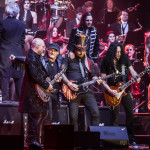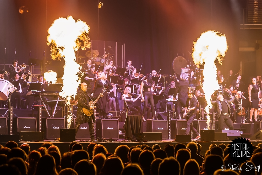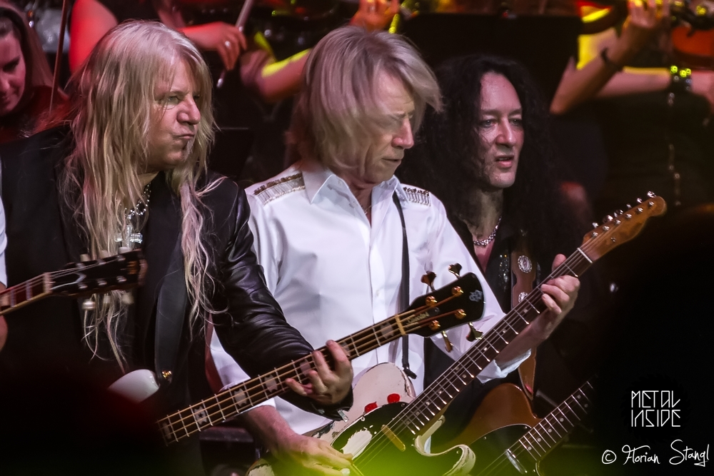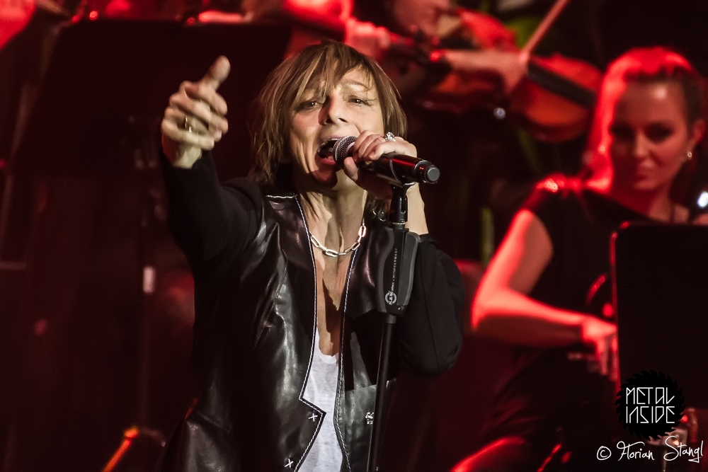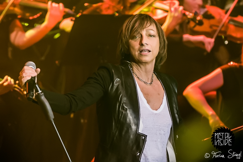Am Feuer wurde jedenfalls nicht gespart, gleich bei der gelungenen Eröffnung durch Marc Storace gab es bei „Long Stick Goes Boom“ jede Menge Flammensäulen. Der Rest des Abends wechselte dann zwischen rockigen und eher ruhigen Stücken. Schade, dass Sänger und Gitarrist Oliver Hartmann (HARTMANN, AVANTASIA) diesmal keinen eigenen Song singen durfte. Und wenn man schon mal kritisch hinschaut und -hört: Der Sound in der Arena tut keinem Orchester dieser Welt gut, zu vieles geht im Brei unter. Manche Songs waren nur mit Mühe zu erkennen. Eric Martin und Rick Parfitt erzählten zwar sympathische, aber teils etwas langatmige Geschichten. Gianna Nannini musste nach ihrem ersten Song erst mal eine ganze Weile nach Luft schnappen (dafür ist ihre Stimme auch mit 60 Jahren noch so rau und kraftvoll wie in den 80ern). Und dass Ian Gillan sein Organ nur noch mit Mühe ausquetschen kann, wissen nicht nur Fans von DEEP PURPLE.