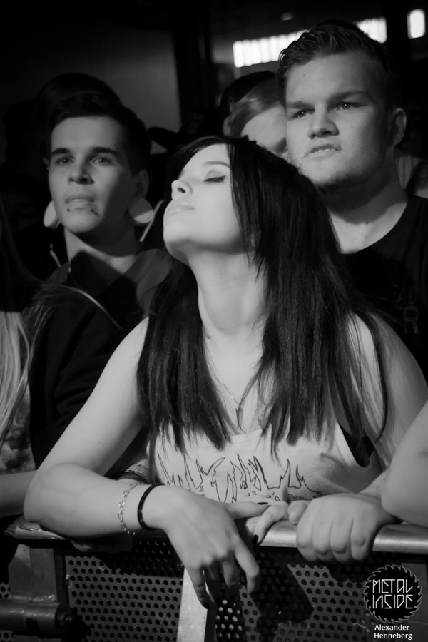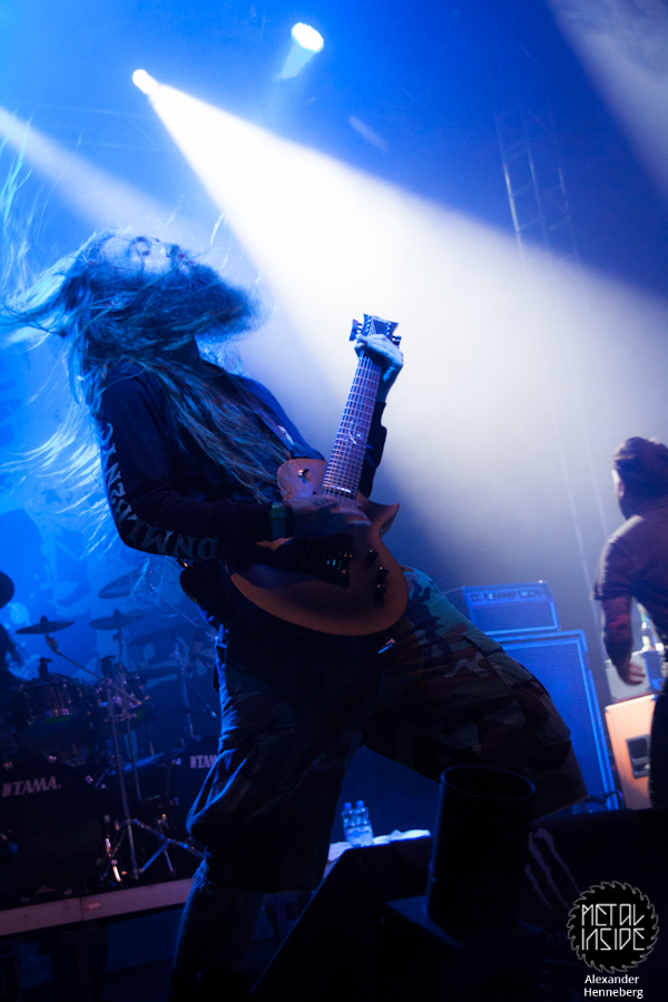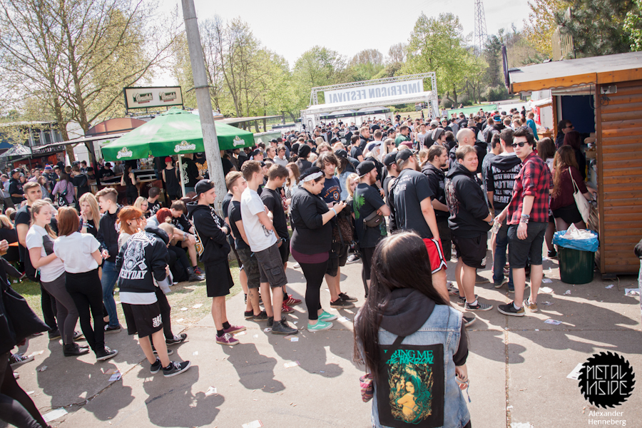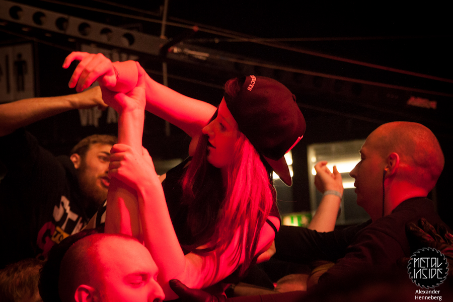 Das Pilgern zum Agra Gelände begann wieder sehr zeitig, immerhin wollte auch jede der sage und schreibe 15 Bands dran kommen, und die erste davon schon kurz nach 10 Uhr. Den Anfang machten WALKING DEAD ON BROADWAY, die die zum Teil noch müde wirkenden Menschen ordentlich wach brüllten, nach gerade einmal 25 Minuten mussten sie allerdings schon die Bühne räumen. MALEVOLENCE/NAPOLEON bekamen 5 Minuten mehr, zum wirklich warm werden reichte das aber dennoch nicht. Trotzdem kam ihr rhythmischer Metal gut an und war eingängig. Ganz allmählich wurde zum Ende hin die Menschentraube vor der Bühne größer, die sich bereits auf ADEPT freuten, dann aber auch noch vorher ordentlich mitmachten. ADEPT dagegen waren gar nicht mal so gut, natürlich mussten auch sie sich auf ihre 30 Minuten beschränken, aber während das Publikum fleißig vor sich hin moshte und ordentlich mitging, lief die Band selbst eher nur im ersten Gang. Diese eher durchschnittliche Leistung machten dafür im Anschluss CARNIFEX wieder weg und setzten sogar noch richtig einen drauf. "Lie To My Face" war dabei ihr wohl bester Song, der von der Crowd mit Gegrölle und Jumpen beantwortet wurde. Man kann also sagen, sie wussten wie man ihre durchaus nur knappen 30 Minuten voll ausnutzt.