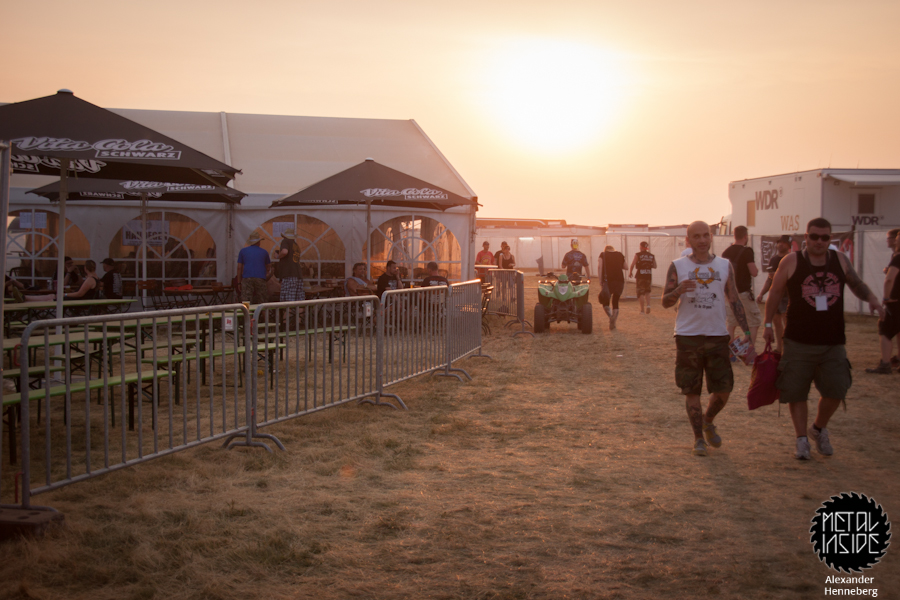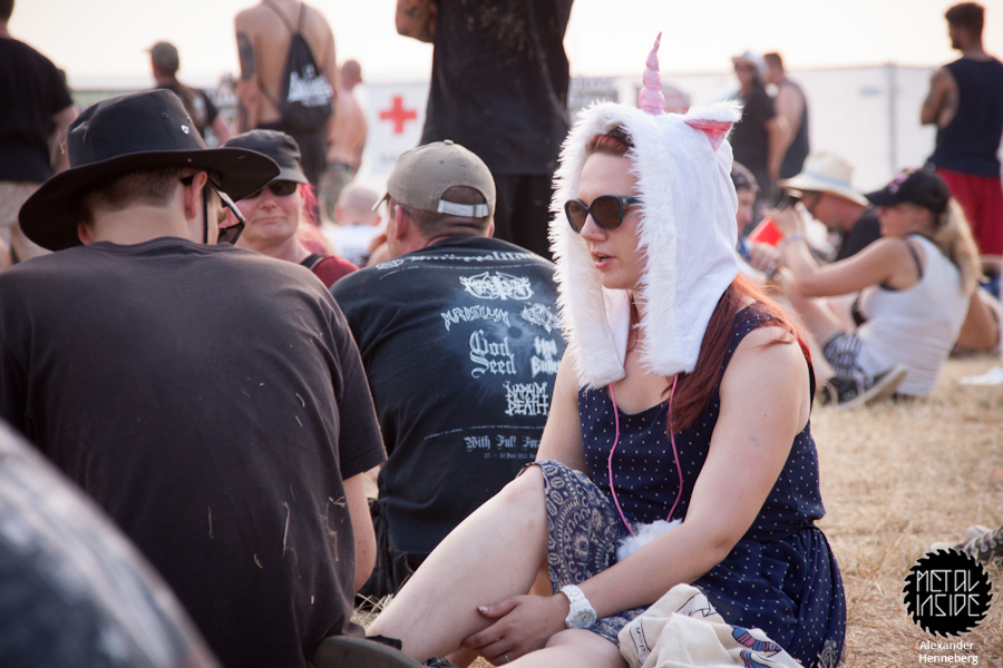 Schon gegen 7 Uhr brannte die Sonne unerträglich und das eigene Zelt wurde zu einer Sauna. Da war es äußerst erfrischend direkt morgens unter eine kalte Dusche zu springen und sich etwas abzukühlen. Wer keinen Pavillon oder Sonnenschirm hatte, suchte eine ganze Weile, ehe er einen schattigen und vor allem noch freien Platz fand. So gestaltete sich das Warten auf die erste Band eher anstrengend.