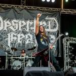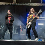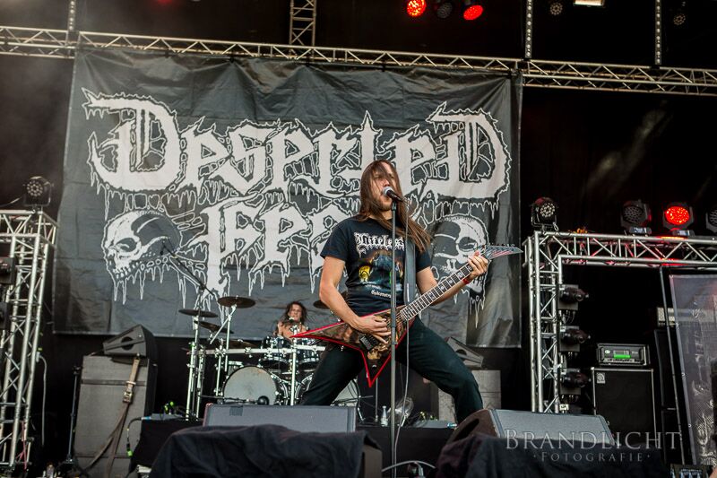 Zur besten Nachmittagsteezeit, bestiegen mit DESERTED FEAR eins der momentan heißesten Eisen im deutschen Death Metal Zirkus und somit dem mMn momentan besten Weltweit, die Bühne zu einem Heimspiel. Auch wenn die vier Jungs eifrig die Steckdosen der Republik unsicher machen, hab ich es bisher nie geschafft sie mir mal anzuschauen. Ich hatte die Hoffnung das der Trubel und die vielen Auftritte nicht zu sehr auf die Qualität ihrer Livequalitäten drücken und wurde schnell beruhigt. Ich habe selten eine Band auf der Bühne gesehen, die mit so viel Spaß in den Backen ihre Musik präsentiert. Ansagen wie „Wir sind froh und stolz darauf hier für euch Spielen zu dürfen!“ hört man ja öfter.....hier glaubt man es nicht nur, hier merkt man das es so ist! Die Jungs kriegen den Auftritt über die Mundwinkel nicht von ihren Ohren weg und ballern eine schöne Mischung aus ihren beiden Alben unters Volk, die die Hitze die immer noch auf dem Rollfeld herrscht vergessen lässt. Als dann mit Sirenen und Kanonenschüssen Field of Death eingeläutet wird, hinterlassen DESERTED FAR ein grinsendes, glückliches Trümmerfeld. Nicht umsonst einer DER Newcomer 2014/15. Das sie dann bei der Autogrammstunde völlig aus dem Häuschen sind, weil sie auf der einen oder anderen Kutte unterschreiben dürfen und sich bei jedem, dem sie ihre Unterschrift geben eifrig bedanken, passt da bestens ins Bild.....Daumen Hoch die Herren, bleibt so! (dl)