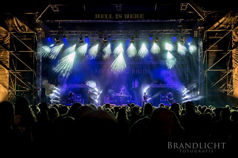 Als Abschluss stand ich dann noch in den hinteren Reihen als My Dying Bride die Bühne betraten und das große Leiden begann. Dies ist übrigens wörtlich gemeint, denn kaum eine andere Band beherrscht es so perfekt Leid und Seelenqual in Musik zu pressen und auch Live rüber zu bringen.Es fiedelten die Geigen, es jaulten die Gitarren und Aaron Stainthorpe starb tausend Tode vor seinem Mikro. Den glänzenden Augen der Leute um mich herum nach zu urteilen machten sie dies auch vorzüglich, aber meins war es einfach nicht. Ich habe zu My Dying Bride noch nie einen Zugang gefunden, was sich auch hier nicht änderte. Der Sound war aber top und die Fans nahezu verzückt, also ein voller Erfolg der Engländer. (dl)
