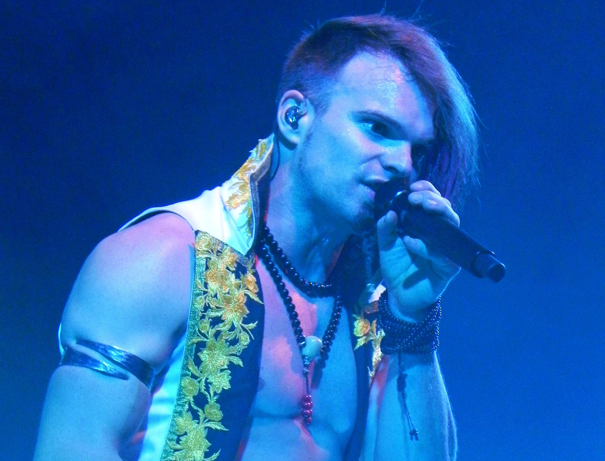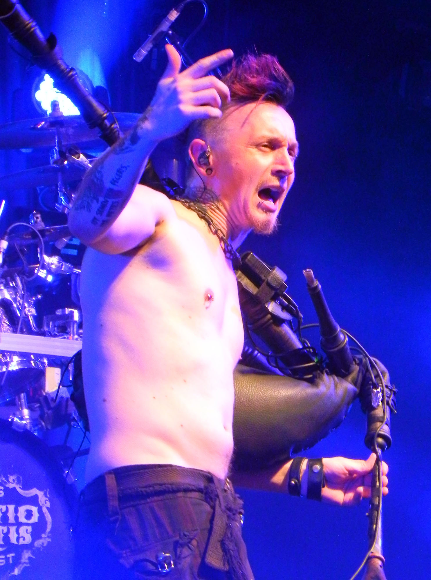 Stattdessen begannen die Umbauarbeiten auf der Bühne, Instrumente wurden abgebaut, Banner gehisst und Kabel verlegt, bis die erste Ansage vom Band erklang, die Vorstellung würde nun in Kürze beginnen. Das Spielchen wiederholte sich dreimal, ehe es schließlich um 20:45 Uhr tatsächlich so weit war, die Lichter erloschen und das in Zirkusthematik gehaltene Bühnenintro ertönte, während SALTATIO MORTIS auf der Bühne erschienen und mit „Wo Sind Die Clowns“, der ersten Single vom aktuellen Album „Zirkus Zeitgeist“, loslegten, woraufhin das Publikum geradezu in die Luft ging. „Zirkus Zeitgeist“ – diesen Zeitgeist aufzudecken und zu kritisieren haben sich die Spielleute auf die Banner geschrieben, gleichzeitig jedoch verkörpert das neue Material ihn textlich auch ein Stück weit: Subtilität war gestern, man möchte ja schließlich von jedem verstanden werden, und dazu muss – wer kennt es nicht—eben manchmal auch der ganze Zaun herhalten, wenn der Wink mit dem Zaunpfahl nicht mehr ausreicht. So könnten denn „Willkommen In der Weihnachtszeit“ und „Wir Sind Papst“ durchaus auch aus der trinkfreudigeren Zeit der TOTEN HOSEN stammen, Stimmung machten die Songs aber live allemal. „Wachstum Über Alles“, mit dem beim vorherigen Album die jetzige, hocherfolgreiche Richtung eingeschlagen worden war, durfte natürlich auch nicht fehlen, bevor mit dem wunderbar melancholischen „Nachts Weinen Die Soldaten“ ein klein wenig ruhigere Töne angeschlagen wurden. „Habgier Und Tod“ gab mit treibendem Dudelsack-Riff wieder richtig Gas und auch „Idol“ brachte das Publikum ordentlich auf Touren, bevor mit „Augen Zu“ und der Kirchenlied-Abwandlung „Maria“ mit seiner wunderschönen Melodie wieder ernstere Töne angeschlagen wurden, die sich später im KZ-Thematik und Vergebung behandelnden „Todesengel“ fortsetzten. Für Lacher war dennoch gesorgt, woran das Publikum mitunter auch nicht ganz unschuldig war: Jean Méchant, Der Tambour : „So, jetzt bin ich dran- die Kollegen meinten, ich soll hier jetzt mal so eine richtig schöne, pathetische Ansage machen, möglichst viel Pathos – “. Er wurde von einem Zwischenruf aus dem Publikum unterbrochen. Jean: „Was?! Hat da gerade einer gefragt `Was ist das? Pathos, pathetisch?´“. Kurze Pause, dann, staubtrocken: „Das ist dieser komische Käse, und wenn du den eine Weile liegen lässt und gut durchmischst, dann hast du Pastete.“ Manchmal darf es statt des Zaunpfahls eben auch Sarkasmus sein, ein Florett unter Knüppeln kann schließlich ausgesprochen erfrischend sein. Auch eine kleine, augenzwinkernde Verneigung vor der Stadt Köln wurde eingeflochten, als die Band als kleiner Gag am Rande die ersten Töne von BAPs „Verdamp Lang Her“ erklingen ließ. „Koma“ bildete einen der wenigen Ausflüge in ältere musikalische Gefilde, war doch generell auffällig, dass von den mittlerweile stolzen 15 Jahren Bandgeschichte zehn relativ stiefmütterlich behandelt wurden: lediglich fünf Lieder stammten aus der Zeit vor 2011, dem Jahr, in dem mit „Sturm Aufs Paradies“ – der Titel erwies sich als programmatisch – auch der Sturm auf die größeren Bühnen und die vorderen Chartplätze begann. Der Bandklassiker „Prometheus“ durfte aber natürlich nicht fehlen und wurde gebührend gefeiert und „Eulenspiegel“ mit großem Publikumseinsatz skandiert, bevor Sänger Alea darauf hinwies, dass man ja inzwischen ein Alter erreicht habe, in dem man nun langsam müde werde uns ins Bett müsse, früher sei das anders gewesen – Auftakt zu „Früher War Alles Besser“, dem letzten Song vor dem ersten Bühnenabgang.