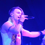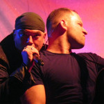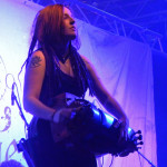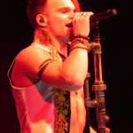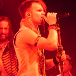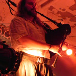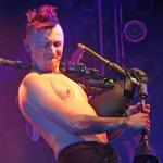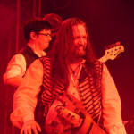 Die tückische Müdigkeit ließ sich jedoch zum Glück durch Publikumsermunterung noch einmal vertreiben, auch wenn in der kurzen Pause vor der Zugabe deutlich wurde, dass sich im Publikum ein Generationswechsel abspielte: das sonst in diesem Punkt so geübte SaMo-Publikum („Spielmannsschwur“ skandieren, „Saltatio….MORTIS“ brüllen) wirkte diesmal etwas orientierungslos – es schien an Übung und Traditionskenntnis zu mangeln, man wollte zwar ganz klar eine Zugabe, schien aber nicht so recht zu wissen, wie man diese bewerkstelligen sollte, so dass sonst übliche, einhellige Schlachtrufe der Menge nicht zustande kamen. Da aber glücklicherweise manchmal eben doch die Absicht zählt und die Spielleute diese erkannten, füllte sich die Bühne rasch wieder mit Leben und die Band gab mit dem Klassiker „Tritt Ein“ noch einmal volle Breitseite. Alea nahm ein Bad in der Menge und ließ sich durchs Publikum reichen, wobei ihn offenbar die Technik im Stich ließ: er absolvierte den Auftritt gesanglich tadellos, kommentierte jedoch bei seiner Rückkehr auf die Bühne, an seinem InEar-Monitor herum nestelnd, dass ihm „seine Öhrchen“ abhanden gekommen seien: „Früher wäre mir das nicht passiert!“ – Daraufhin Lasterbalk: „Ja, früher hättest auch gerafft, wenn zwei Songs ohne Pause und Ansage ineinander übergehen!“. Allgemeines Gelächter. Alea: „Oh, echt? Sorry! Ich brauchte aber halt nun mal die Pause, weil ich meine Ohren verloren habe, verdammt!“. Es folgten noch „Worte“ und Trinklied“, bevor man zum großen Finale ansetzte: nie, niemals darf es ein SALTATIO-Konzert ohne den „Spielmannsschwur“ geben, verbindet das Lied doch Band und Publikum und stellt eine Art gegenseitigen Treueschwur da. Entsprechend gab es kein Halten mehr und die Menge sang aus Leibeskräften mit, bevor sich die sichtlich gerührten Spielleute nach satten zwei Stunden Spielzeit wortreich für den gelungenen Tourauftakt bedankten und verabschiedeten. Der „Zirkus Zeitgeist“ mag weiterziehen, aber bei der derzeit herrschenden Resonanz kommt er sicherlich bald wieder in die Stadt – freuen wir uns also schon einmal darauf!