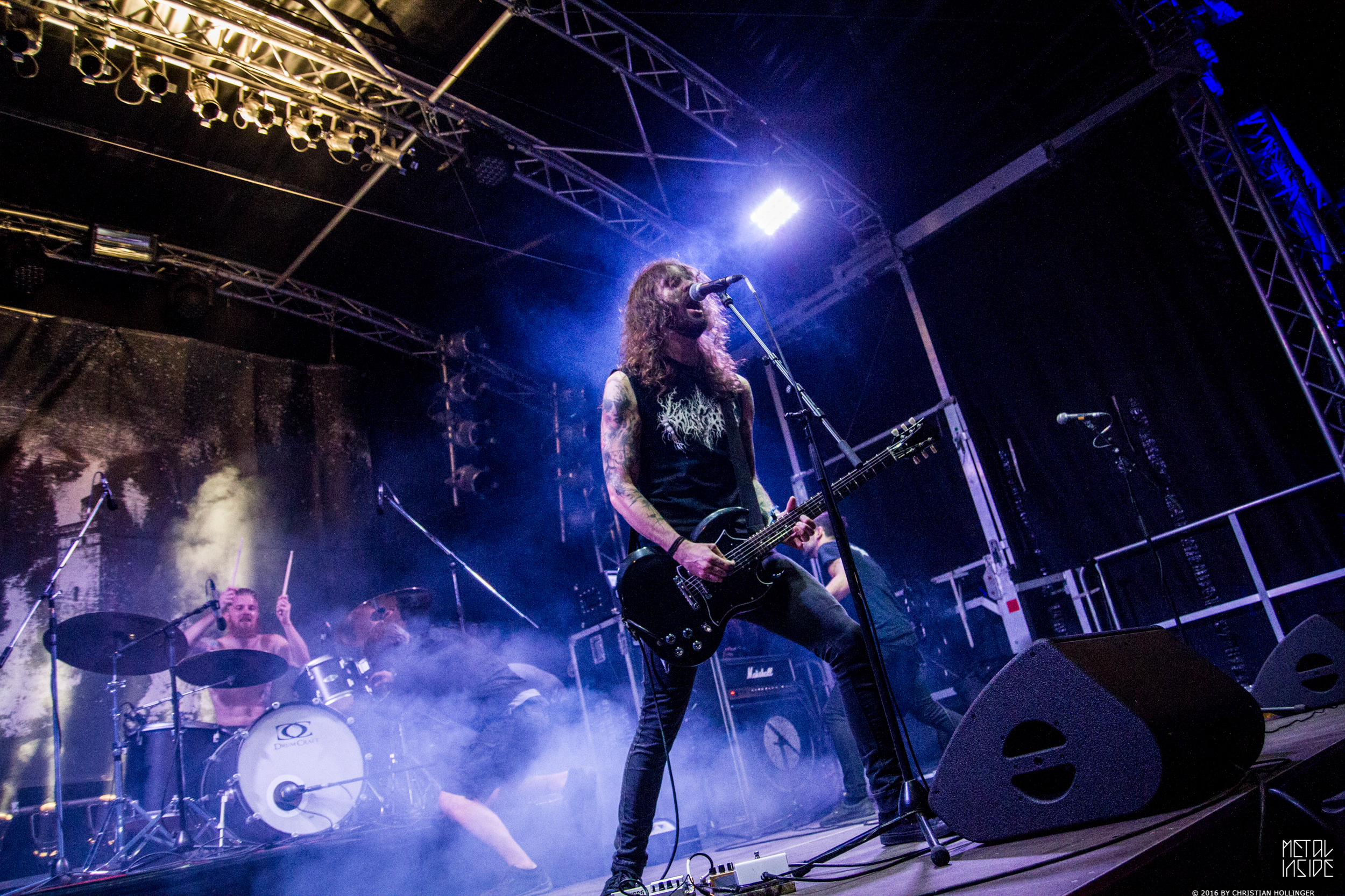 Den Abschluss sollte dann die undefinierbare Black-, Doom-, Sludge-... Mischung von DOWNFALL OF GAIA auf der kleinen Camel Stage machen. Mit düsterer Stimmung, offenen Gitarrensounds mit den Rücken zur Bühne und den Humbuckern zum AMP verwandelten die Jungs ihre Spielzeit in eine melancholisch-düstere Metalshow.