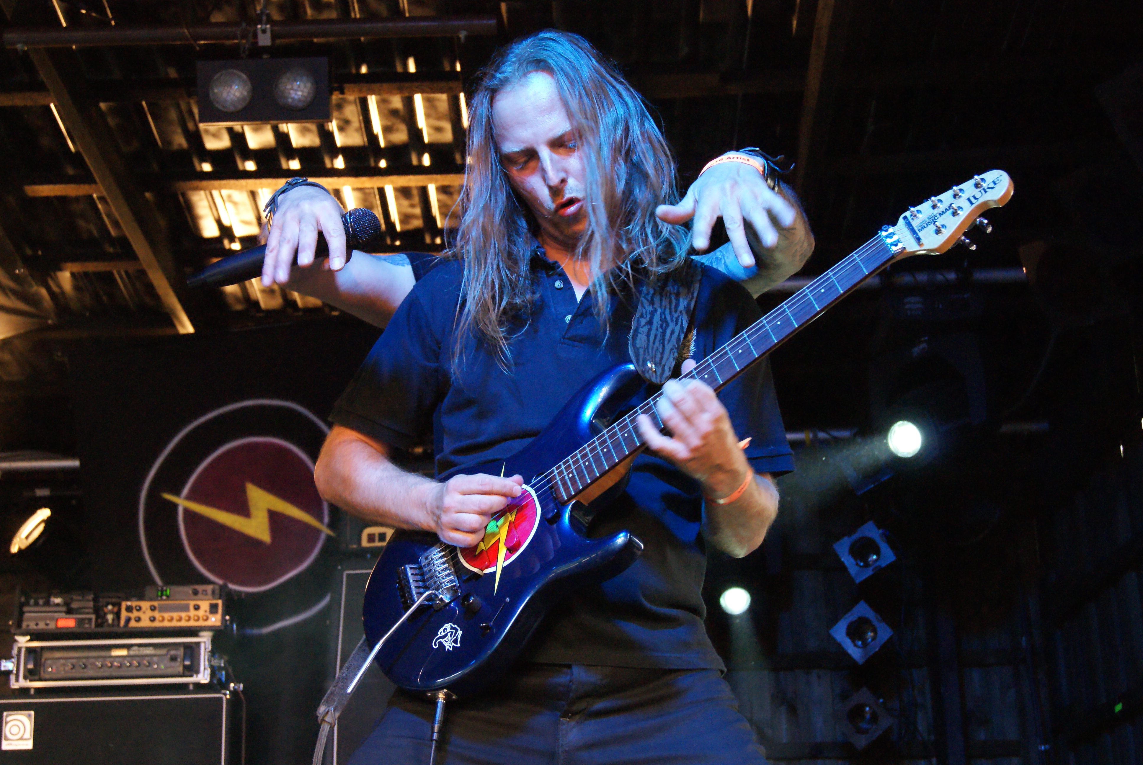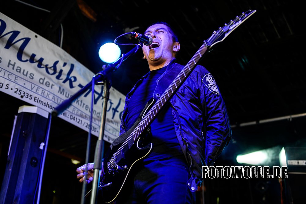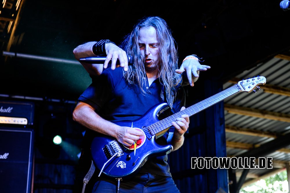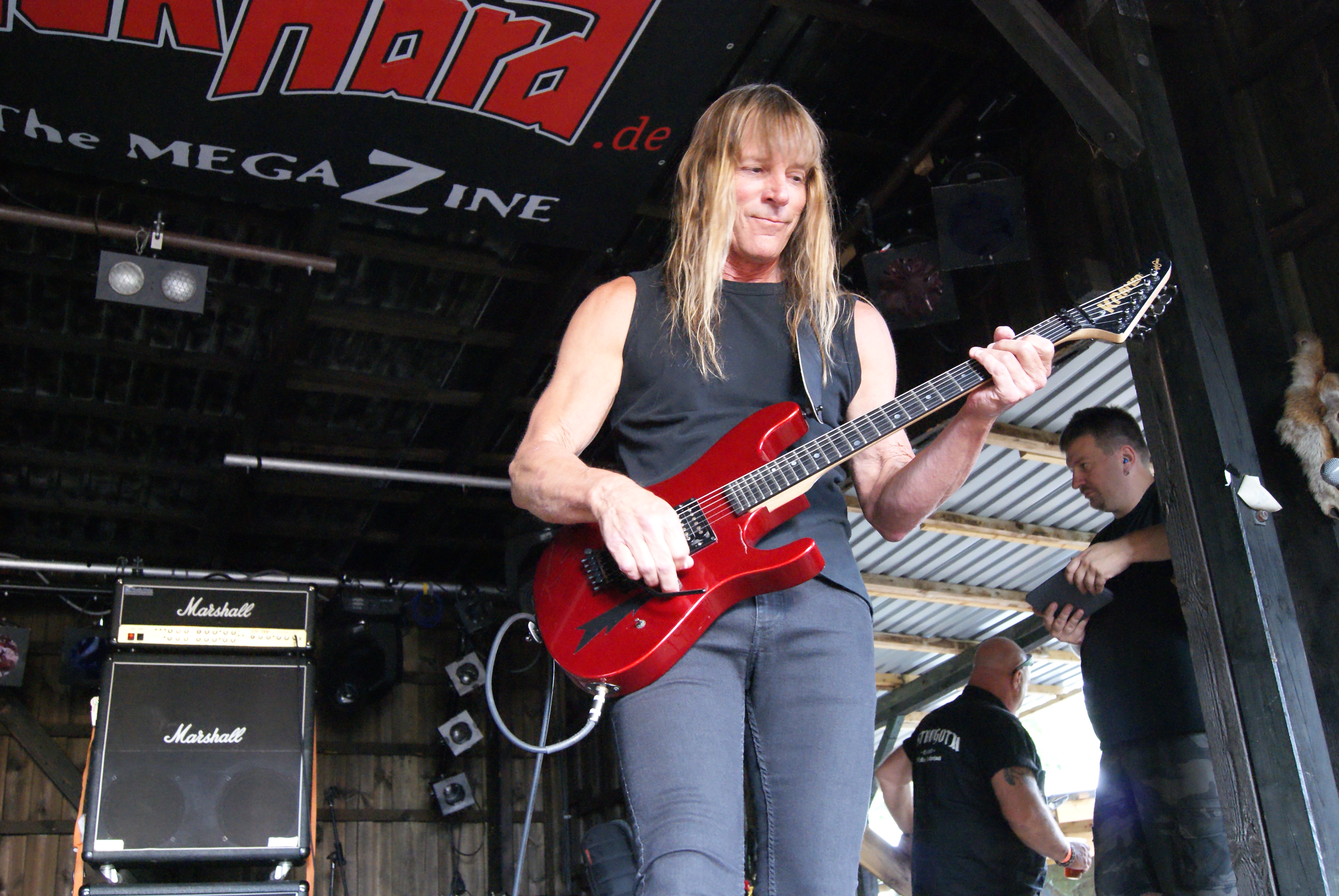 Das Niveau blieb aber hoch. Die Amis Q5 sind ein gerngesehener Gast im Garten zu Brande-Hörnerkirchen. Nach der kurzen (Live-) Reunion von 2009 sind sie jetzt wieder permanent am Start und haben sogar ein neues Album („New World Order“) herausgebracht. Aber der heutige Auftritt stand ganz im Zeichen der Klassiker. „Pull The Trigger“, „Lonely Lady“, „Missing In Action“, „Ain’t No Way To Treat A Lady“, „Teenage Runaway“, „Let Go”. Jonathan Scott K. (welcher offensichtlich den gleichen „Blasenrhythmus” hatte wie ich…zumindest traf ich ihn dauernd auf dem Klo!!) hat kein µ von seiner stimmlichen Brillianz eingebüßt. Und zeigt gerade bei den ruhigeren Stücken eine nicht unbedingt zu erwartende stimmliche Variabilität. So kann er das Reibeisenorgan ab und zu bei Seite legen und bekommt eine schon fast soulige Note in seine Stimme. Begleitet wird er von seinen langjährigen Mitstreitern Rick Pierce (Gitarre) und Evan Sheeley (Bass), welche auch einen sehr energischen Gig auf die Bretter zaubern. Aber auch die beiden „Rookies“ Gitarrist Dennis Turner und Drummer Jeffrey McCormack (Ex-FIFTH ANGEL, Ex-HEIR APPARENT) haben sich perfekt in die Band eingefunden. Die gute Stimmung innerhalb der Band überträgt sich auch sofort auf das Publikum und alle feiern ausgelassen mit Q5. Dass es beim abschließenden Klassiker „Steel The Light“ tatsächlich sehr dunkel wird und es anfängt wie aus Kübeln zu gießen, halte ich dann doch für übertrieben. Darauf angesprochen meinte Evan, dass dieser „Special Effect“ aber verdammt teuer gewesen sei…gerade das Timing sei extrem schwierig. Tolle, sympathische Band. Wir sehen uns 2017 auf dem KIT.