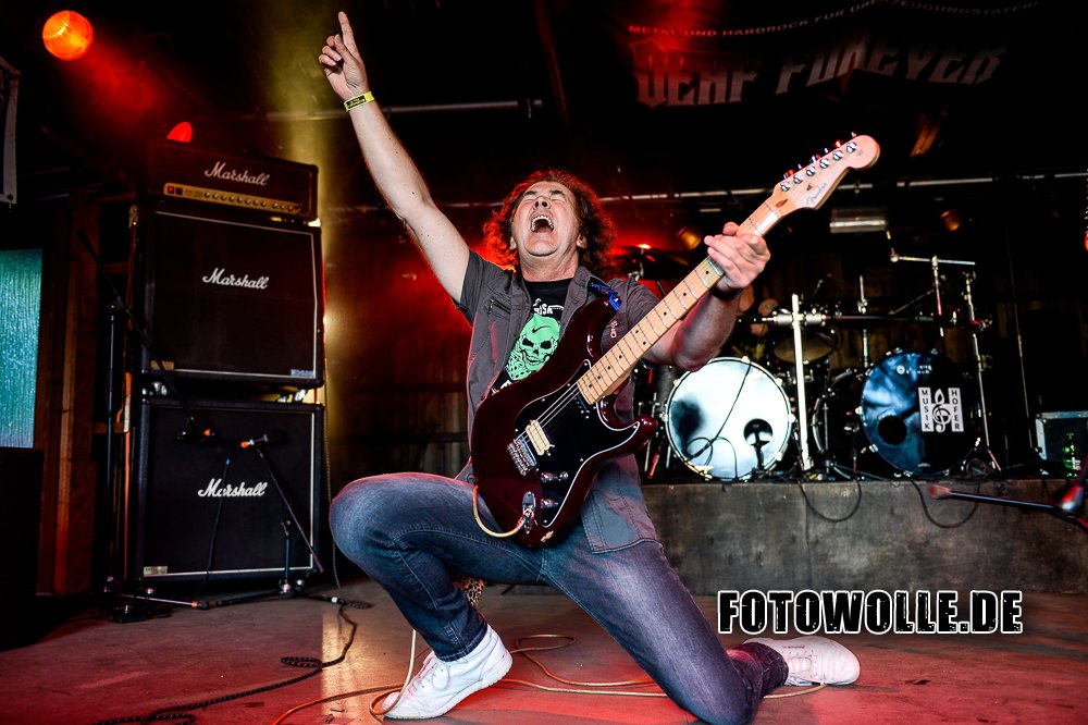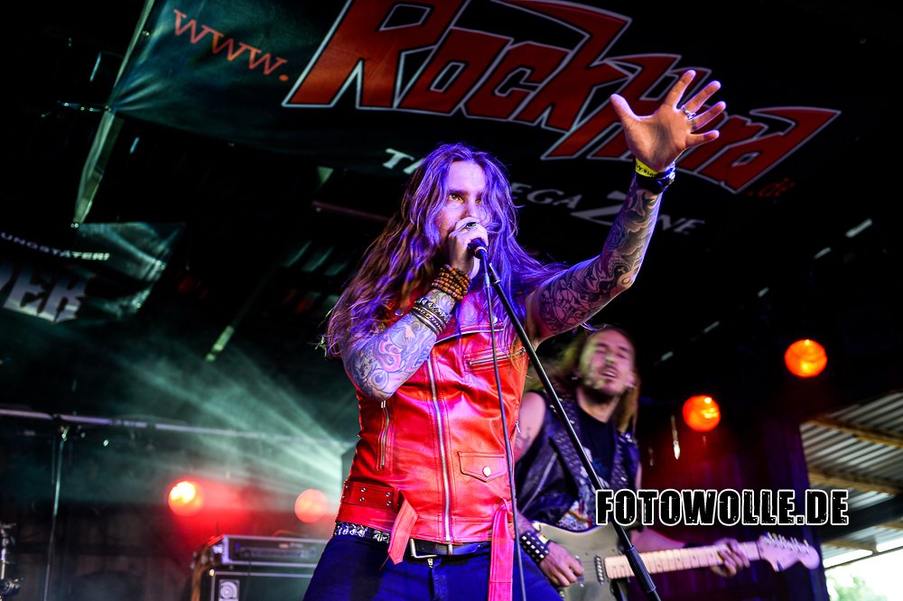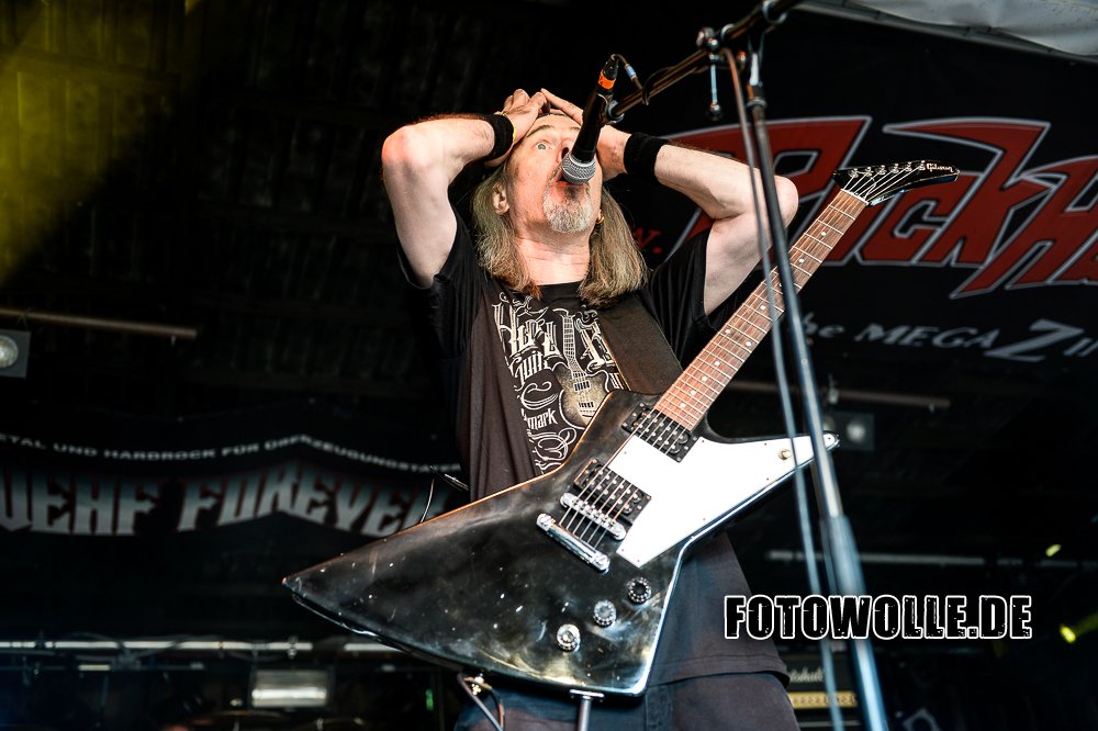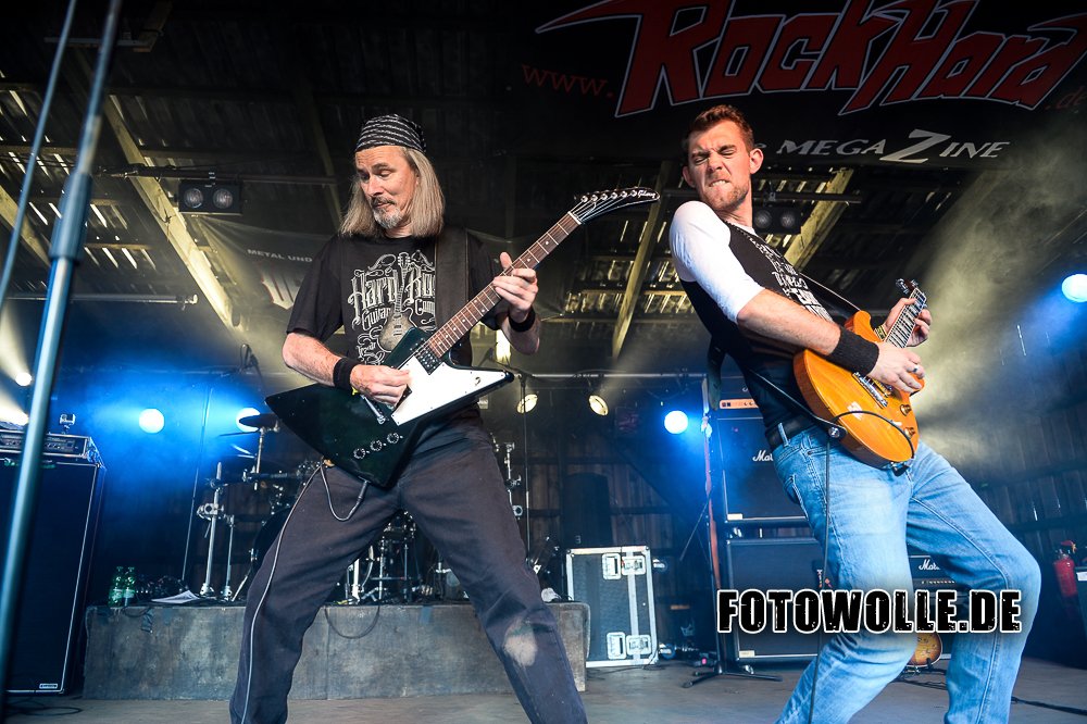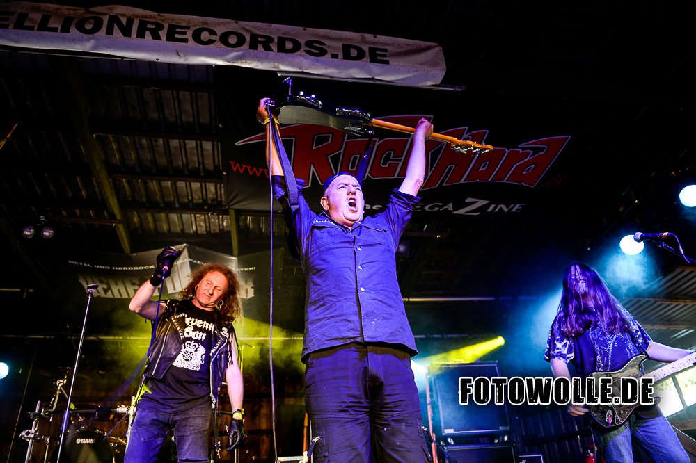 Für mich startete der Samstag mit einer weiteren NWoBHM-Veteranen Kapelle. SALEM. Das besondere an SALEM ist, dass hier nicht 1-2 Originalmitglieder mit diversen neuen Nasen auflaufen, wie es bei vielen anderen UK-Reunions der Fall ist, sondern alle heute auf der Bühne befindlichen Musiker auch schon in den frühen 80ern zusammen unterwegs waren. SALEMs Sangesmeister sieht zwar aus wie Drumlegende Tommy Aldridge, kann vermutlich aber besser singen und hat seinen Platz am Mikro somit zu Recht. SALEM sind für eine Band, deren erste Gehversuche aus dem Jahre 1981 datieren, erfreulich agil und haben augenscheinlich Lust am rocken. Zumindest sind sie nach OSTROGOTH schon die zweite Band des Festivals, die einen Titel namens „Rock Fever“ im Programm haben. Und da dieses wohl immer noch in ihnen wütet, kann man ihnen eine starke Leistung attestieren.