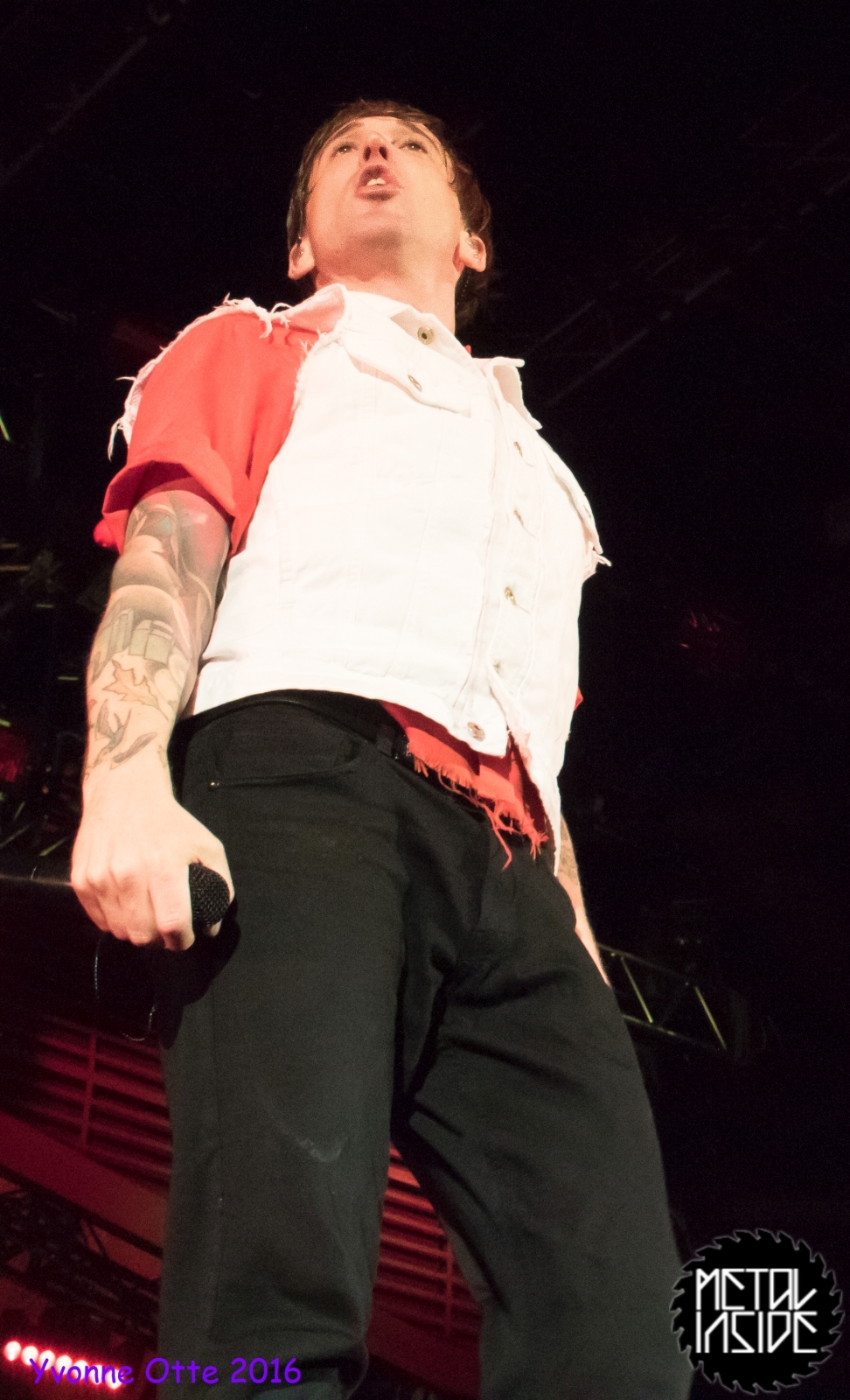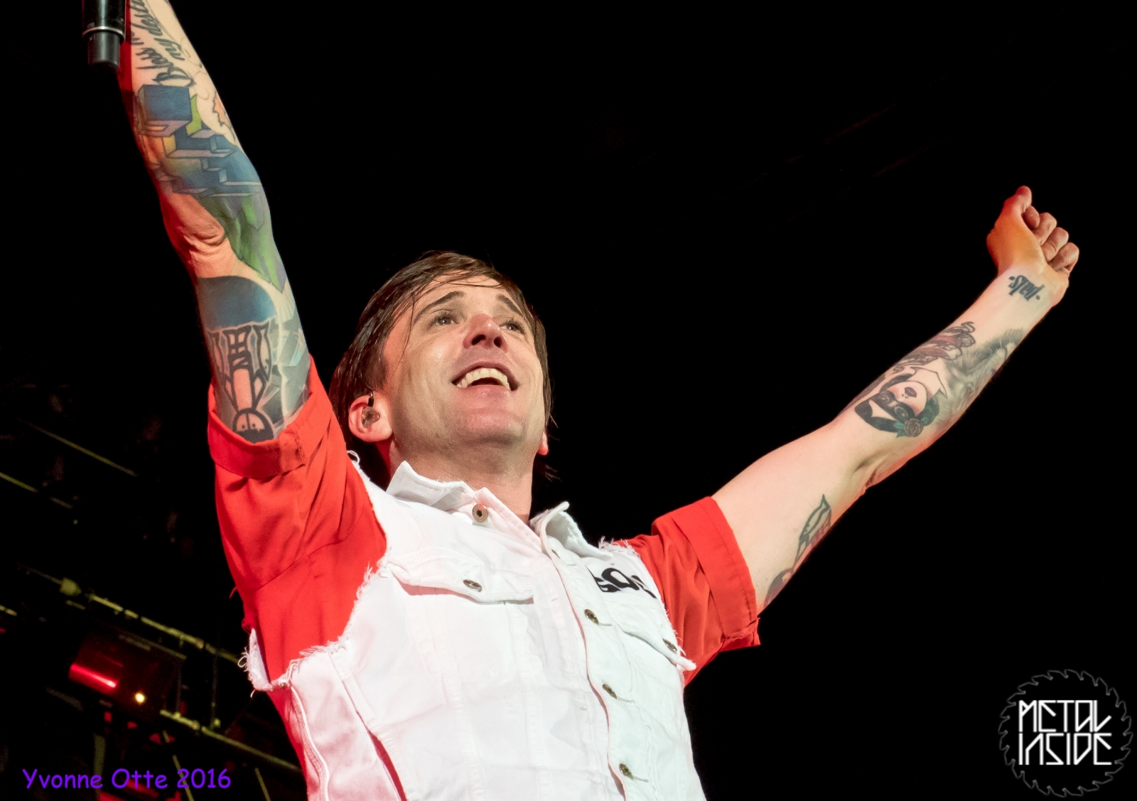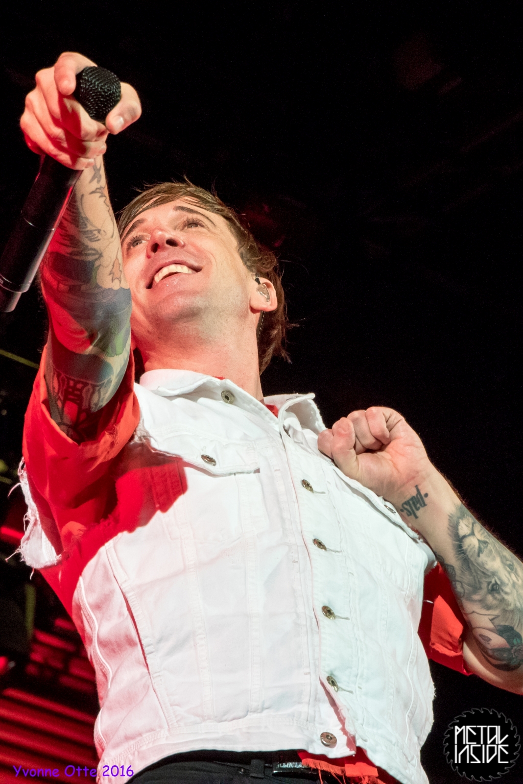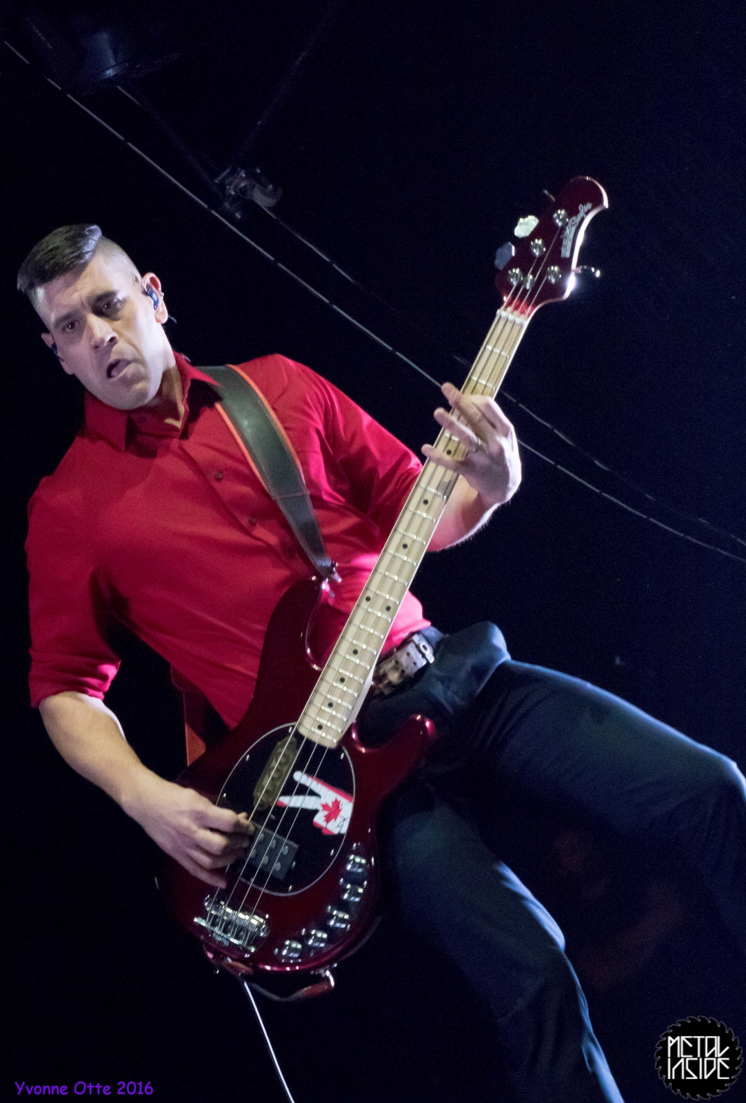Es folgte ein Blitzumbau und gegen 22 Uhr durften BILLY TALENT endlich auf die Bühne. Vom ersten bis zum letzten Ton herrschte eine fantastische Stimmung, die selbst die Band manchmal sprachlos gemacht hatte. Immer wieder „Billy Talent“-Chöre, die sich zwischen den Songs entwickelt hatten und eine sichtlich gut gelaunte Band, die richtig Bock hatte dieses Konzert zu spielen. Von der Stimmung her war es auch egal, ob ein alter Song gespielt wurde oder ein Neuer –alles kam gut an und wurde gefeiert. Die Songauswahl war gut gemischt durch alle Alben. 21. Songs wurden gespielt, davon kamen sechs vom neuen Album. Radiohits wie „Surrender“ oder „Fallen Leaves“ durften natürlich auch nicht fehlen. Selten auch einen Sänger gesehen, der so viel Spaß und so viel gelächelt hatte. Zwischen den Songs hat Benjamin meist kleine Ansagen gemacht: so wurde einmal an SCOTT WEILAND gedacht, dessen erster Todestag am Konzertabend war. Außerdem wurde erklärt, warum Schlagzeuger Aaron derzeit von Jordan Hastings (ALEXISONFIRE) vertreten wird. Grund dafür ist die MS-Erkrankung von Aaron, die es derzeit nicht zulässt, dass er auf Tour geht. Benjamin sagte auch, dass von jedem verkauftem Ticket ein Euro an Aarons MS-Stiftung gespendet werden. Bei einer ausverkauften Halle wie die Mitsubishi Electric Halle kommen da gut über7.000 Euro zusammen. Nimmt man dann die gesamte Tour, so kommt da doch eine beachtliche Summe zusammen. Gute Sache! Der Euro tut nicht weh, auch wenn die Tickets dadurch eventuell einen Euro mehr kosten. Die Menge macht es und mit so Summen kann die Stiftung schon sehr viel machen.