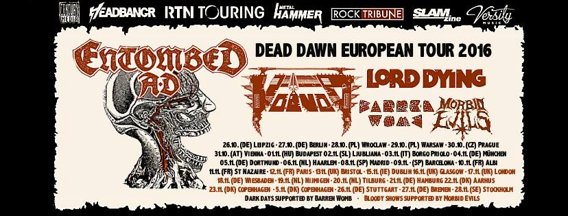 Totgesagte leben länger: nachdem sich ENTOMBED aufgelöst hatten, gründeten die ehemaligen Mitglieder 2014 einfach eine neue Band und nannten sie ENTOMBED A.D.. Seitdem hat die Band zwei Studioalben veröffentlicht, das letzte erst im Februar 2016. War ihr Comeback-Album „Back To The Front“ womöglich nicht der allergrößte Wurf, ist ihr aktuelles Werk „Dead Dawn“ erneut spitzenmäßiges Garn. Grund genug auf Tour zu gehen. Mit dabei sind diesmal VOIVOD, LORD DYING und MORBID EVILS.