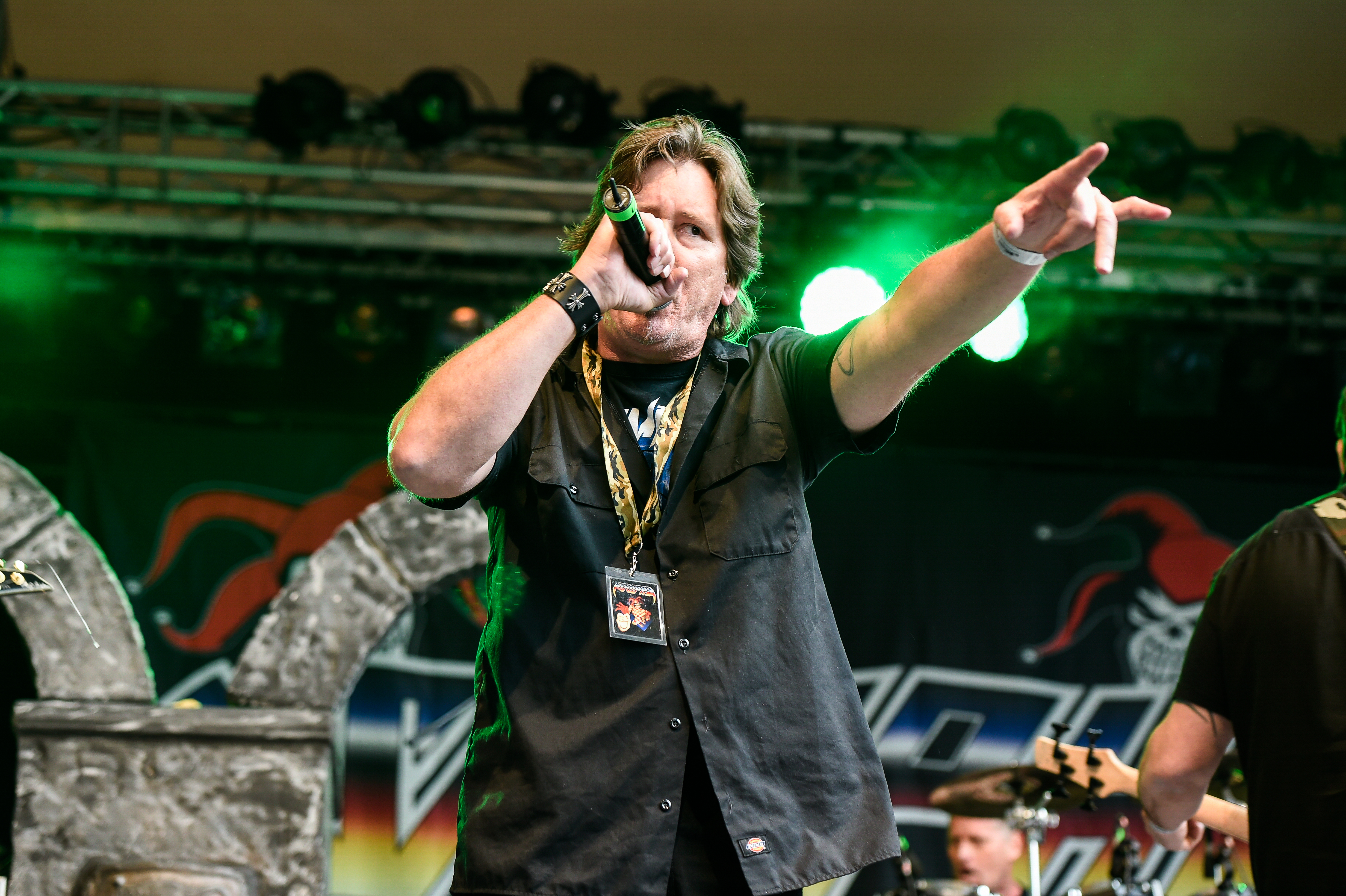 Nun wurde es Zeit für die erste Prügel-Reunion des Tages: ATROPHY aus dem FLOTSAM & JETSAM State Arizona wollen es auch nochmal wissen. Ihre beiden Alben „Socialized Hate“ (1988) und „Violent By Nature“ (1990) gelten gemeinhin als leider im Staub der Geschichte etwas untergegangene Kleinode der Speed / Thrash Historie, welche eine Wiederentdeckung durch jüngere Generationen an Nachwuchs-Thrashern durchaus verdient hätten. Optisch zwar gealtert wussten ATROPHY musikalisch sofort zu überzeugen. Der alte Biss war noch vorhanden und Abrissbirnen wie „Socialized Hate“ oder „Preacher, Preacher“ taten ihr Übriges, um die Menge sofort auf ihre Seite zu ziehen. Das abschließende „Beer Bong“ ließ dann auch noch den Partylevel nach oben schnellen. Coole Show, von in Würde gealterten Speed-Opis.
