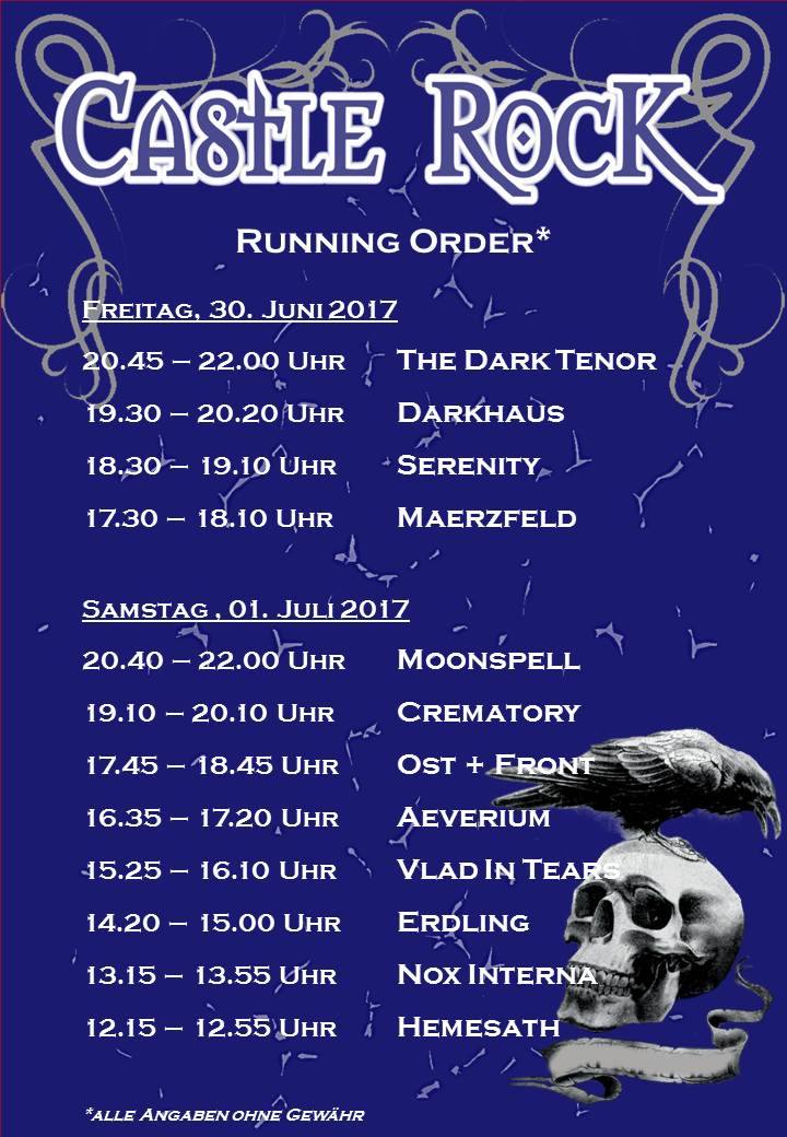 Abschließen sollten das Festival die Bands CREMATORY und MOONSPELL. Beides Bands, die alles auf der Bühne geben und ein würdiger Abschluss für das 18. CASTLE ROCK FESTIVAL waren! Bevor MOONSPELL auf die Bühne durften, wurde noch verraten, dass 2018 unter anderen: LACUNA COIL, STAHLMANN und TANZWUT bereits bestätigt sind! Nette Appetizer für das nächste Jahr und weitere Highlights werden sicherlich folgen.