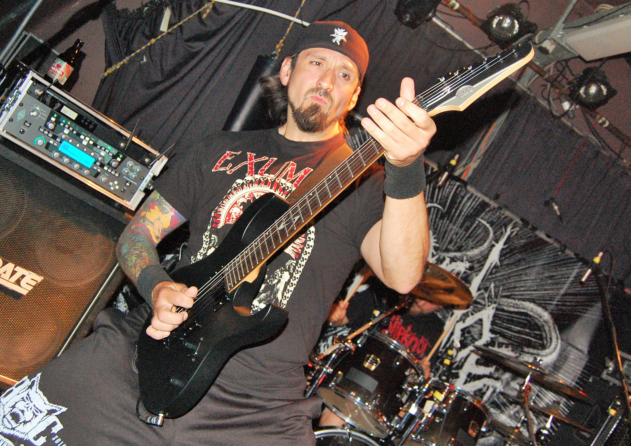 Irgendwie unpassend scheinen VAyL aus Berlin auf dem Billing zu sein – mit ihrem Stoner-Habitus. Da stehen da zwei Studenten und wissen nicht so recht, warum. Aber eben nur scheinbar. Denn als es richtig losgeht, geht die pimmelige Pickelhaube aka Hipsterzopf auf und der Kollege banged wie der Metal-Teufel. Musikalisch sind Songs wie „Follow The Goat“ „Amnesia“, zu dem es sogar ein Video gibt, oder „Tranquilized“ stonylässig as fuck und grooven ziemlich. Wenn jetzt die Ansagen entspannter wären als „Wir beeilen uns“ und die Brille besser säße, dann wäre hier der 1a-Live-Event zu nächsten Blubber-Party geritzt. Extrem cool kamen aber die Gasmaskenschaufenster-Puppe und das Glücksrad am Merch-Stand...