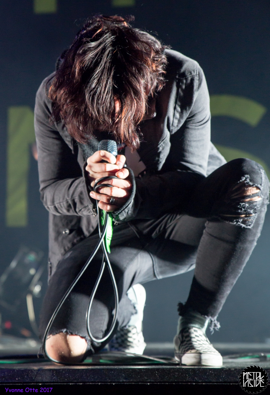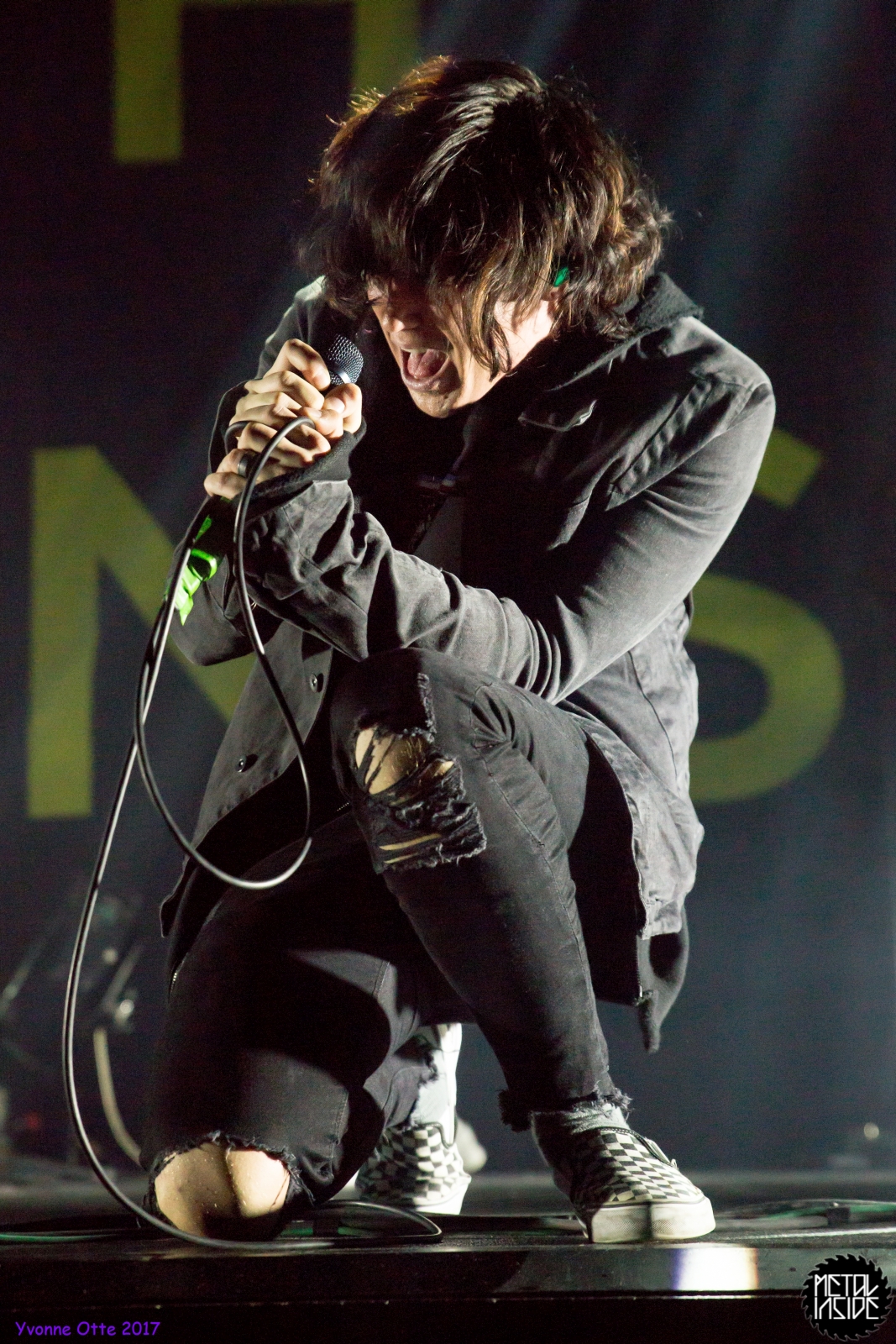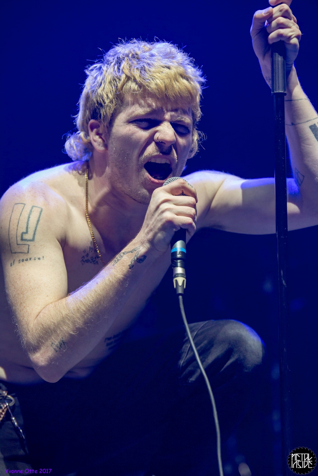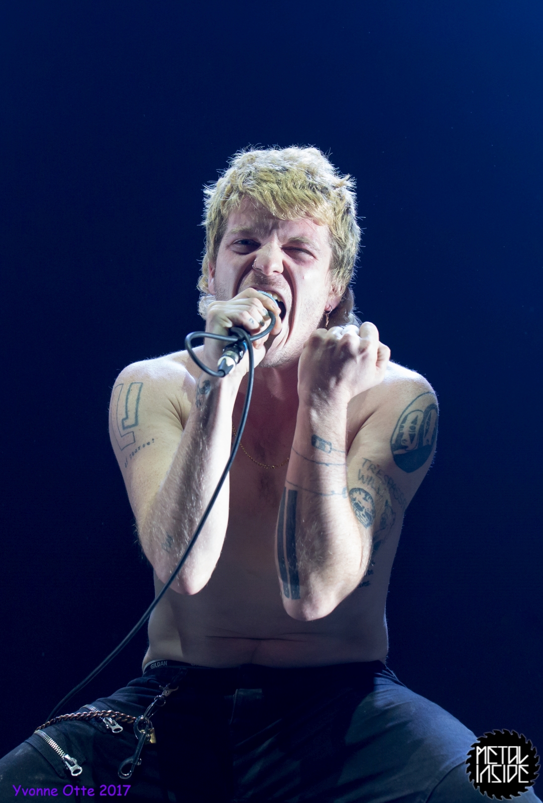 Danach wurde es aber laut, noch voller und energiegeladen. Sobald SLEEPING WITH SIRENS auf der Bühne waren, gab es für das Publikum kein Halt mehr (Kreischkonzert der Mädels inklusive). Besonders schön wahrscheinlich für das Mädchen in der ersten Reihe, als Sänger Kellinn Quinn die Zeichnungen, die sie ihn und der Band schenken wollte, angenommen hat. Das hat für alle ein sehr intensiver und herzlicher Moment, der vielen im Gedächtnis bleiben wird. Grundsätzlich geht diese Band ziemlich ab. Dabei bleibt sie sehr sympathisch und auch als nicht Fan macht es Spaß das Konzert zu beobachten. Toller Sound auch an diesem Abend. Außerdem eine Songauswahl, die sehr gut beim Publikum angekommen ist. SLEEPING WITH SIRENS durften etwas länger als PEARS spielen, aber für die Fans wohl immer noch zu kurz. Es folgte ein kurzer Umbau, damit RISE AGAINST endlich auf die Bühne konnten.