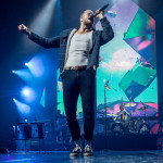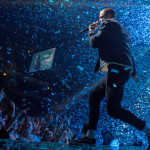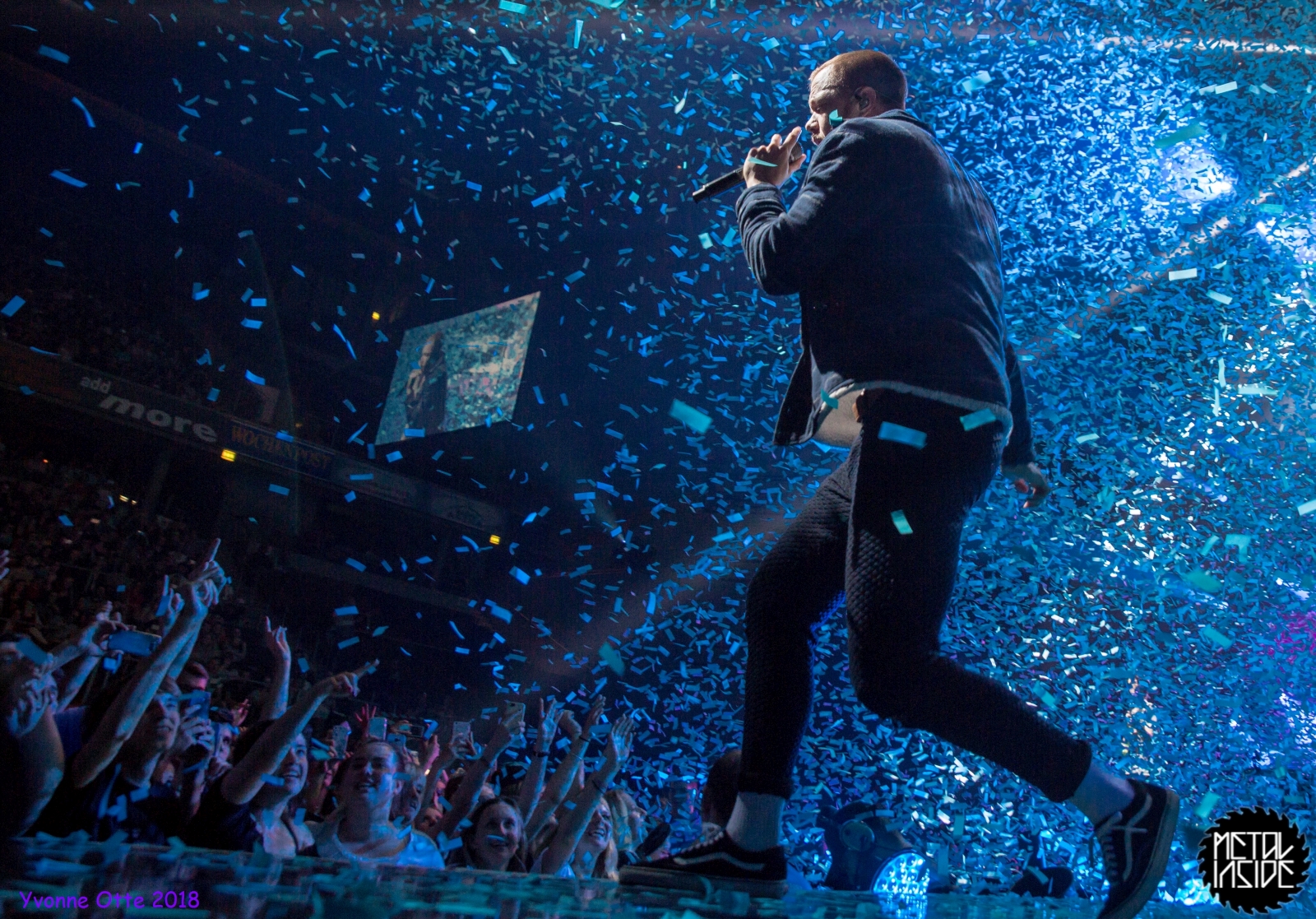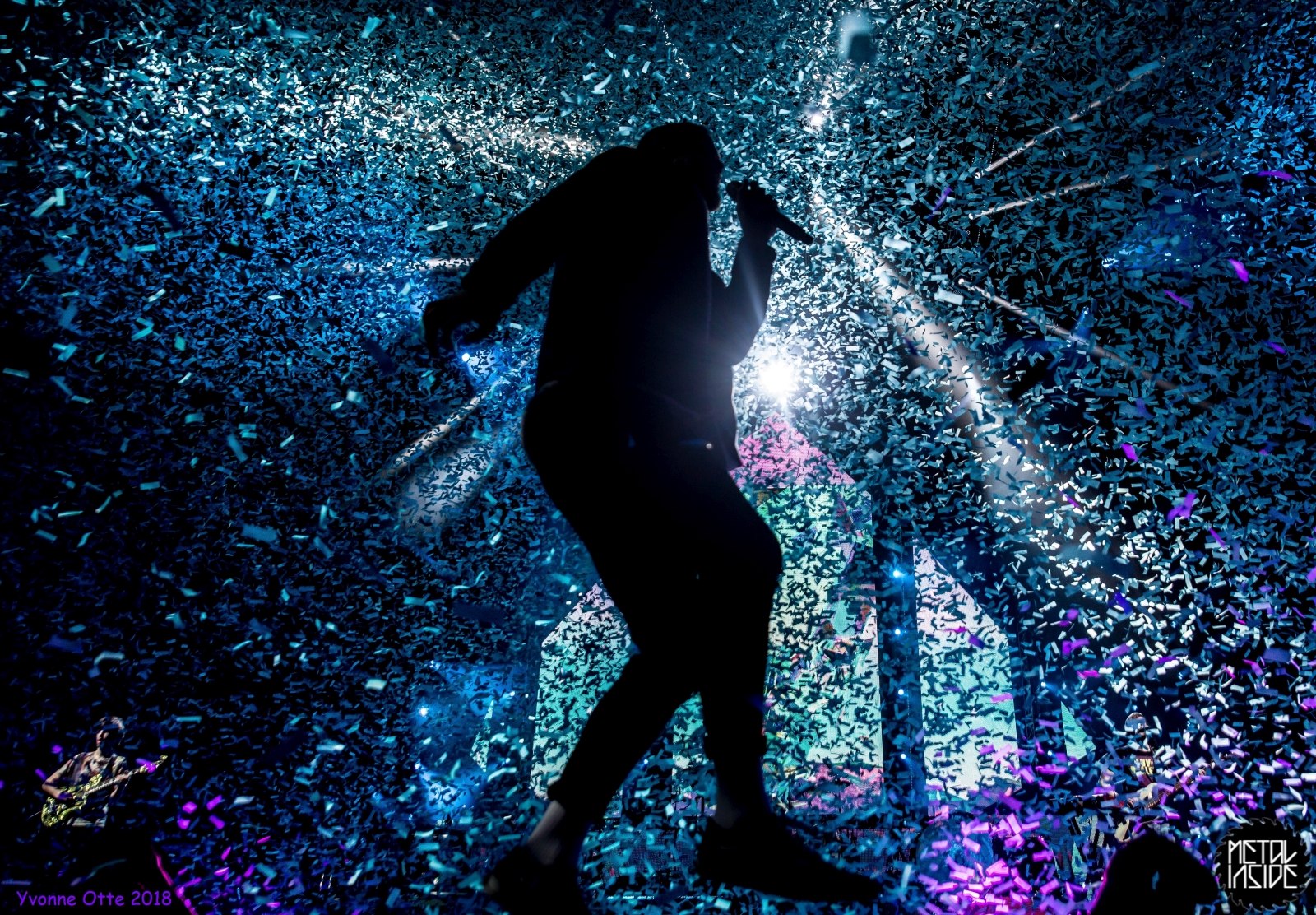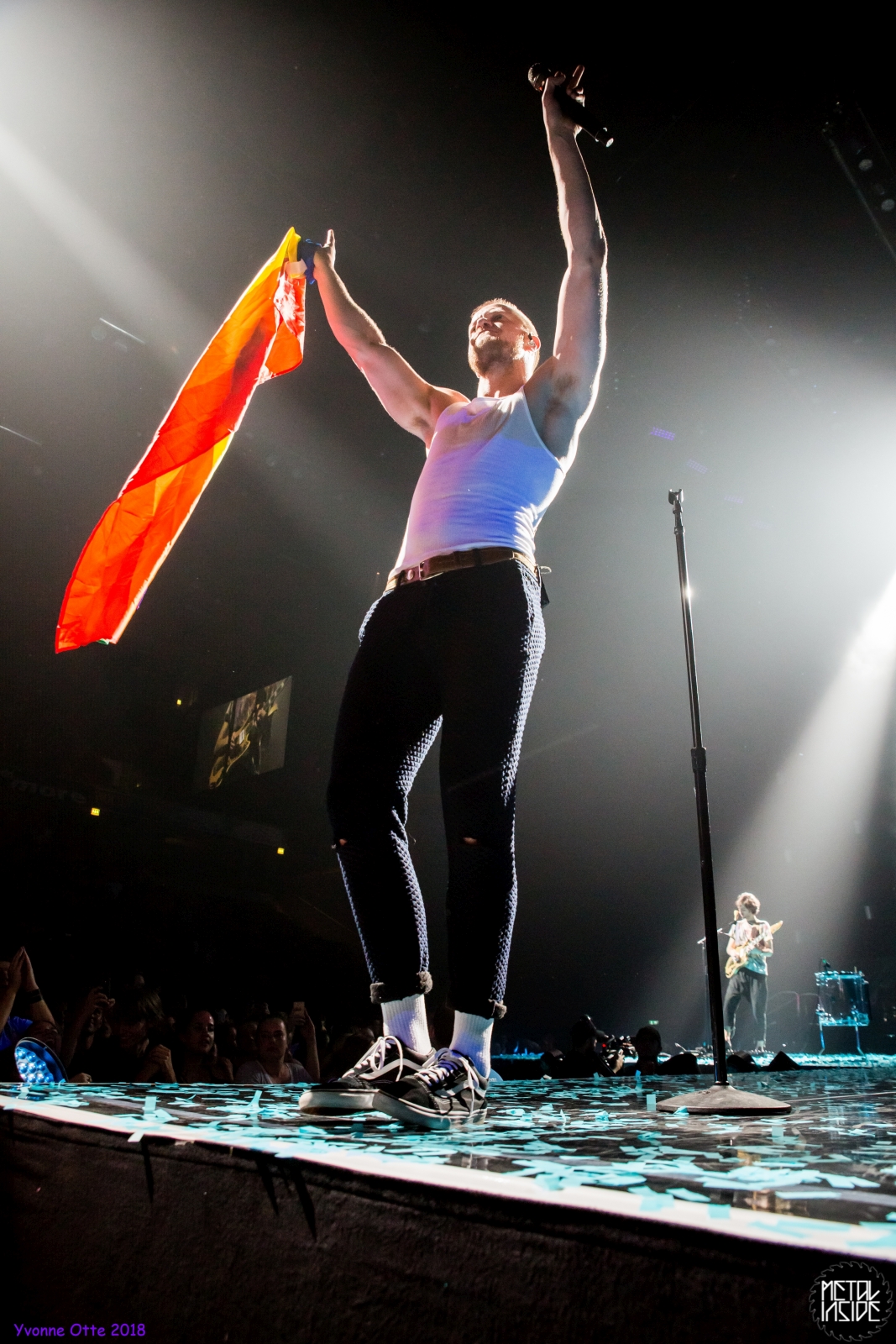 Pünktlich um 21:15 Uhr betraten die IMAGINE DRAGONS dann nach einen relativ langen Intro die Bühne. Mit Knall ging es los und so sollte es über 2 Stunden auch weiter gehen! Direkt beim ersten Song „I Don’t Know Why“ ließen sie es so richtig mit Konfetti krachen. Damit wurde bei dieser Show nun wahrlich nicht gegeizt. Eigentlich kann man schon sagen, dass es schwer für andere Bands sein wird, die an Konfetti verschossene Menge bei einer Show zu toppen! Oft verwenden Bands sowas zum Schluss, oder vor der Zugabe, oder eben bei einen einzigen Song. So nicht bei einer IMAGINE DRAGONS Show. Hier kam es bei gefühlt der Hälfte der Songs zum Einsatz und immer wieder wurde die Bühne mit Laubsaugern vom Konfetti befreit, weil Zentimeter dick die Konfettischicht auf der Erde lag und so natürlich Rutschgefahr bestand. Auffällig waren auch die Outfits der Band. Besonders das von Sänger Dan ist immer wieder besonders in den Fokus gerückt. Da er weiße Socken und ein weißes Unterhemd an hatte und an den Decken Schwarzlicht angebracht war, wurde er damit zum Strahlen gebracht und so konnte man ihn nicht mehr übersehen. Und nicht nur ihm, sondern auch den weißen Konfettiregen. Sah gigantisch aus!