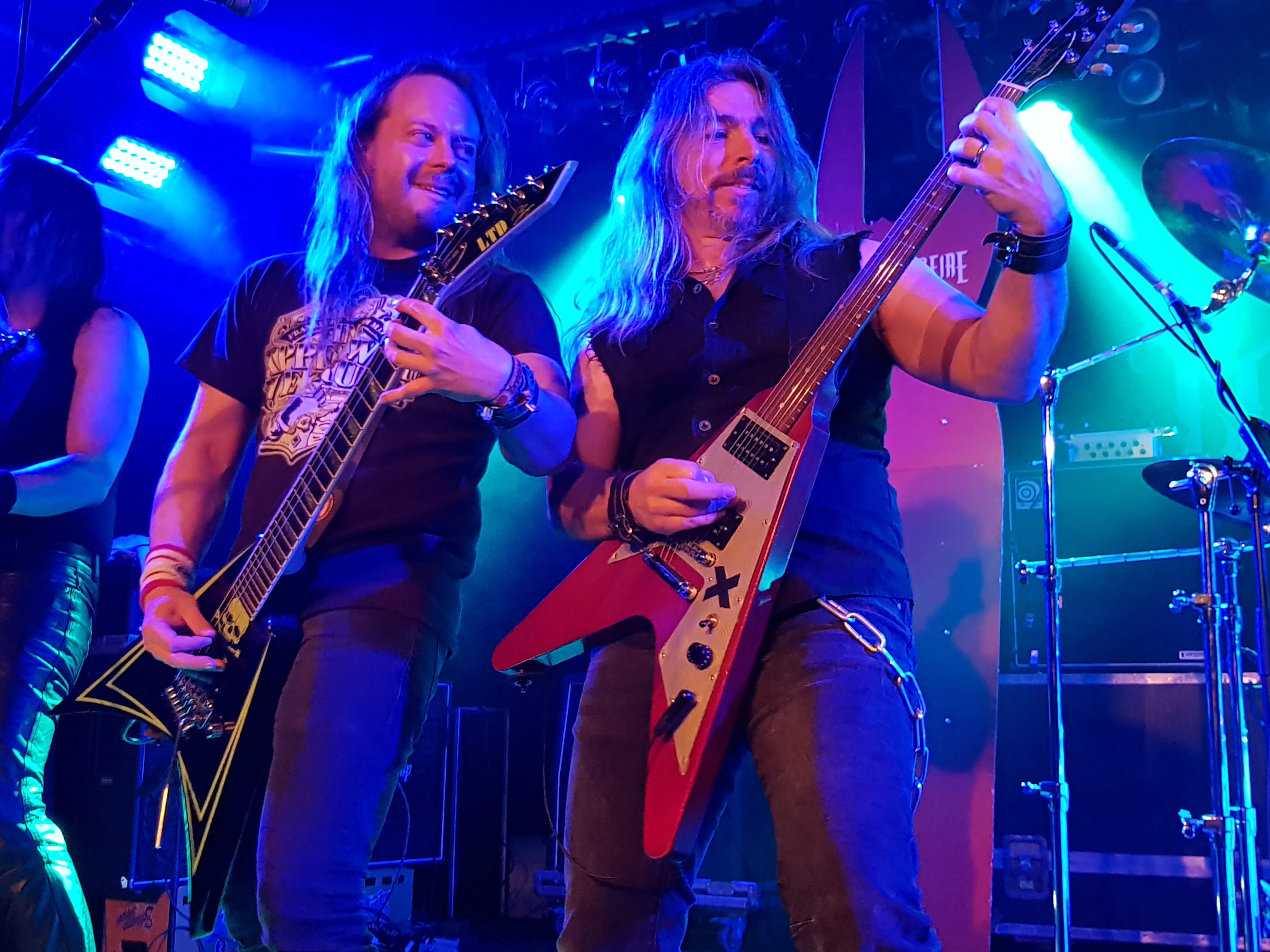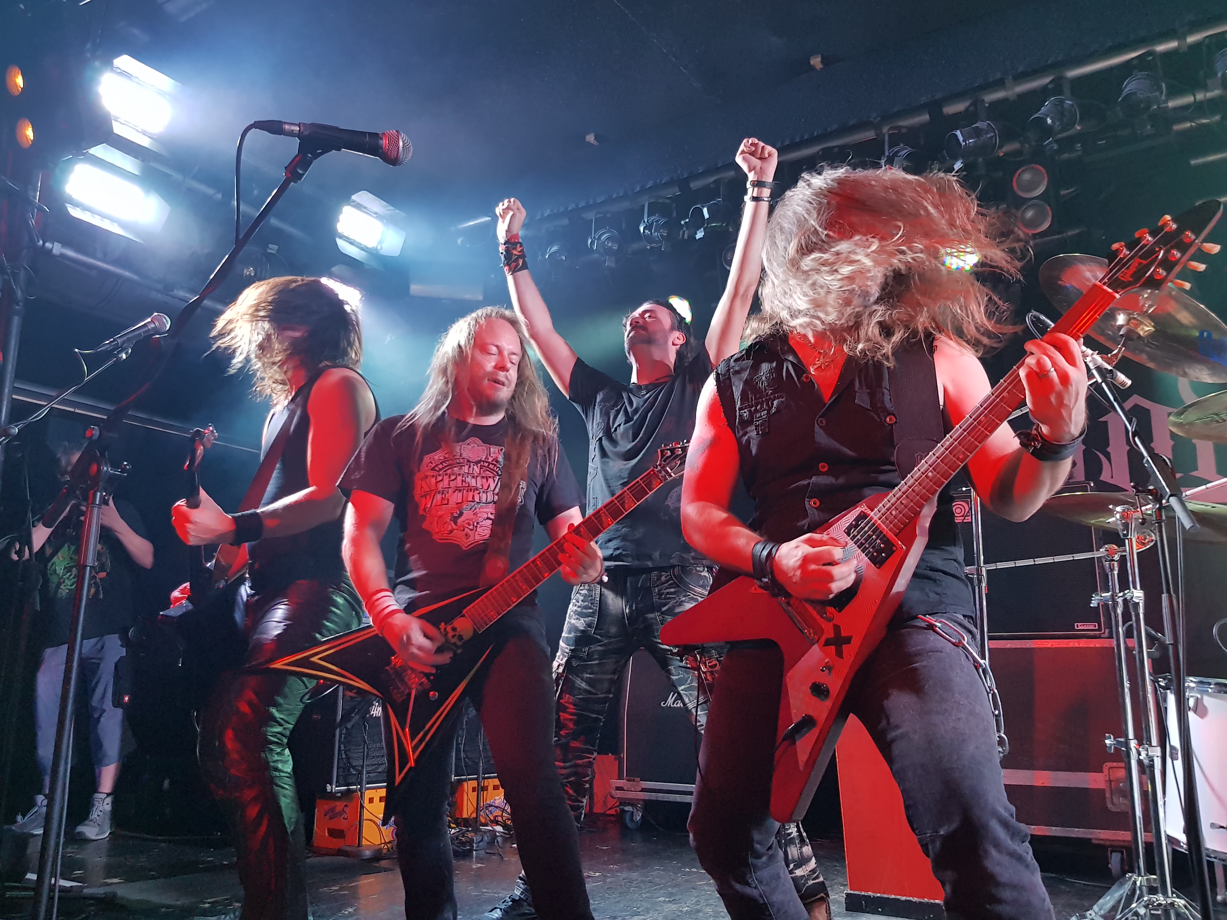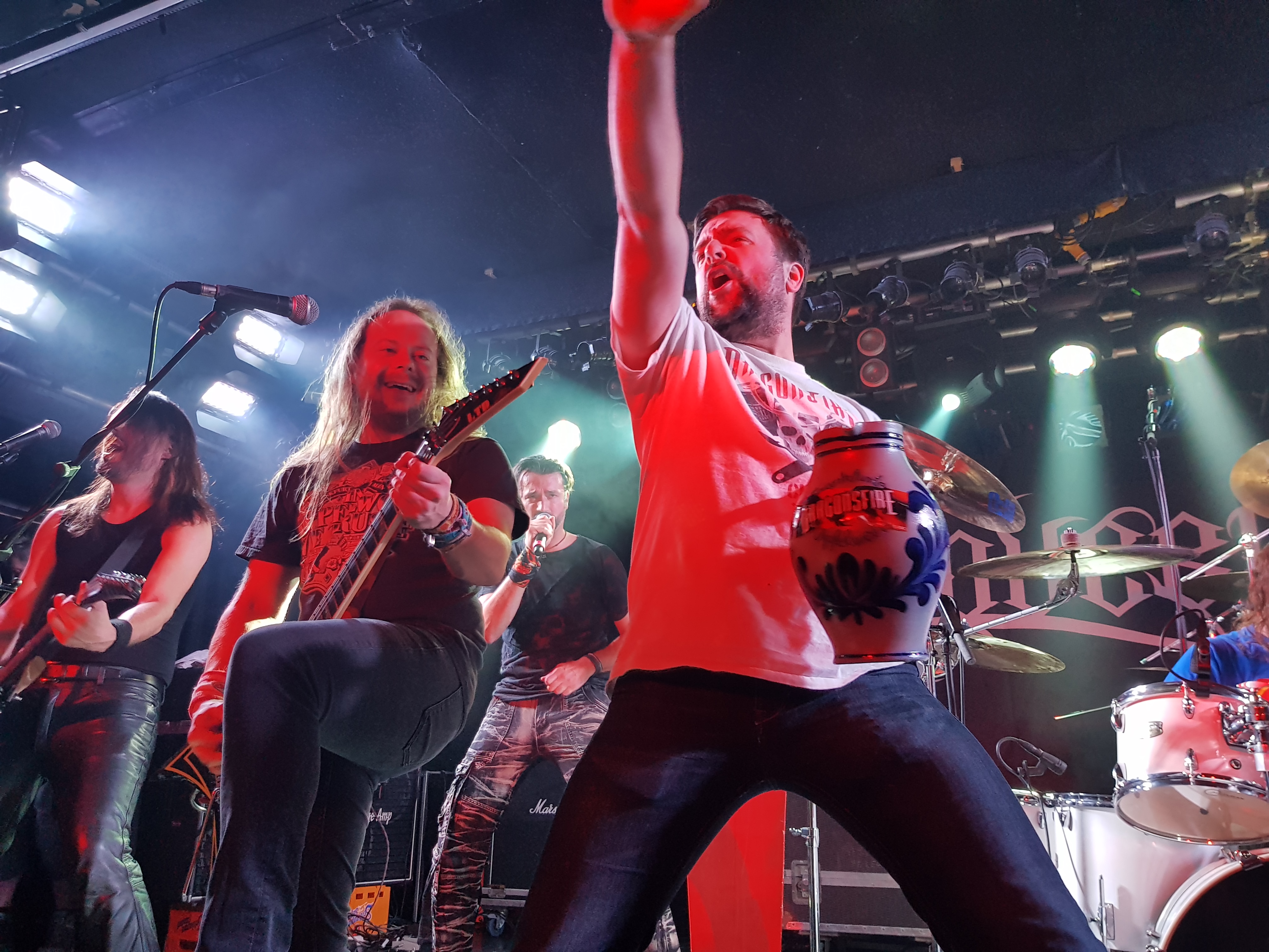 Im gar nicht mal so leeren Colos-Saal durften aber erst einmal DRAGONSFIRE aus Süd-Hessen ran und versetzten das Auditorium mit ihrem flotten Teutonen Metal mit humoristischer Note („Steel-Eel“ Story, Pommegabel in Lebensgröße) gleich mal in Betriebstemperatur. Mit „Speed Demon“, „The Prophet“ oder auch „Raging Fire“ hatten die sympathischen Herren Aschaffenburg schnell auf ihre Seite gezogen. Dass man sich selbst nicht zu 100% ernst nimmt, sorgte für eine lockere Stimmung und so vergingen die 45 Minuten wie im Flug und man machte Platz für die Hauptattraktion des Abends.