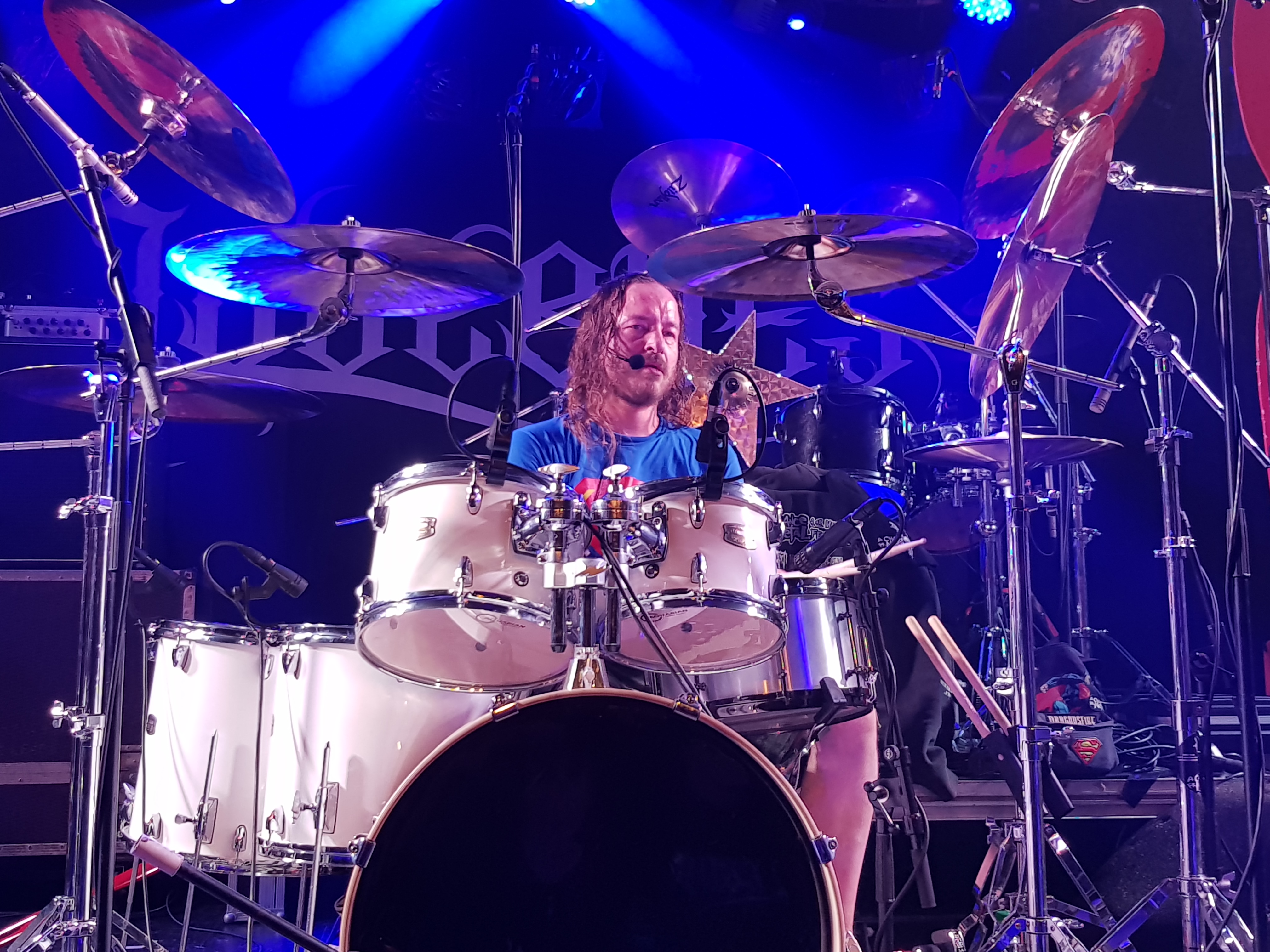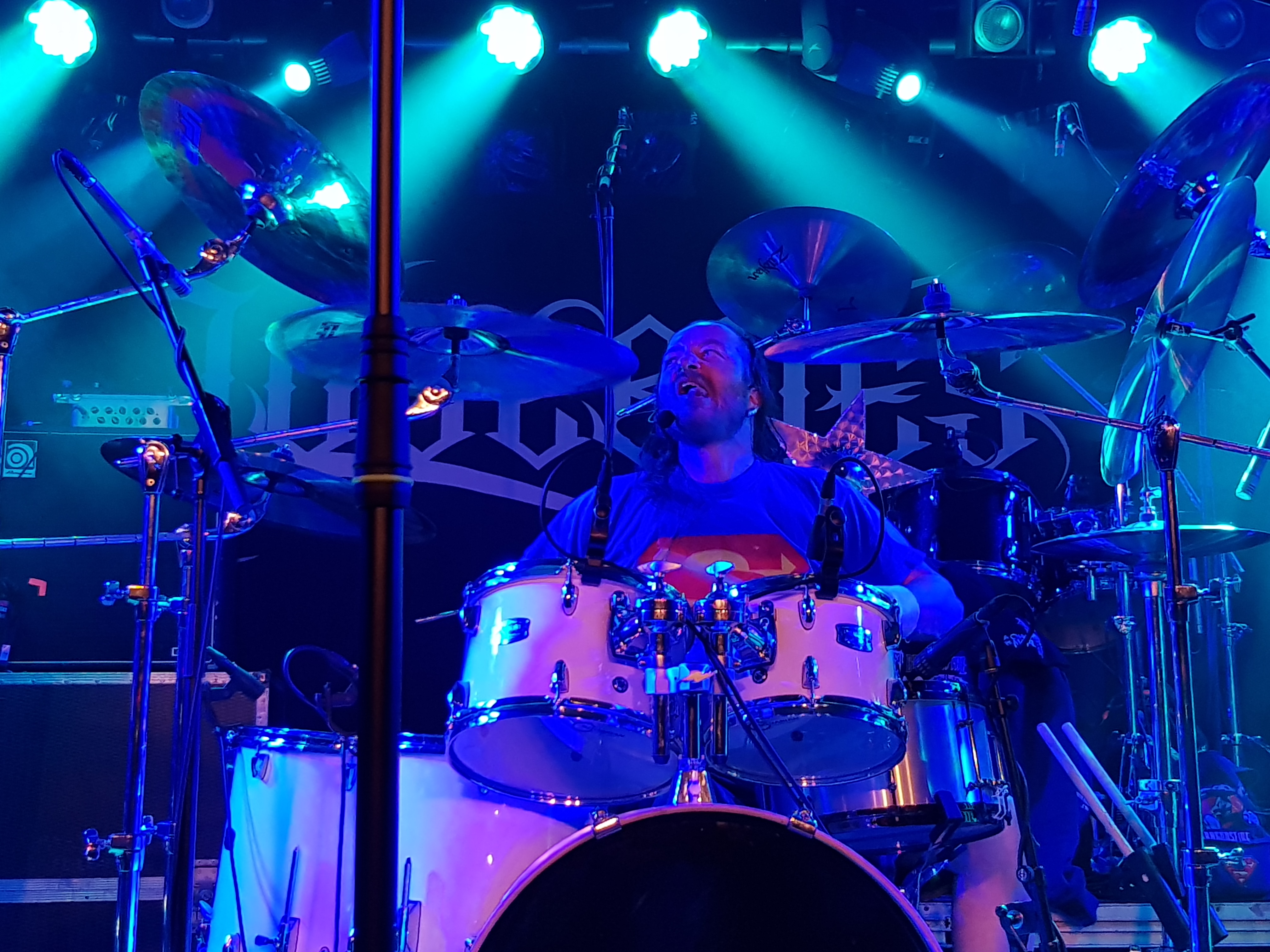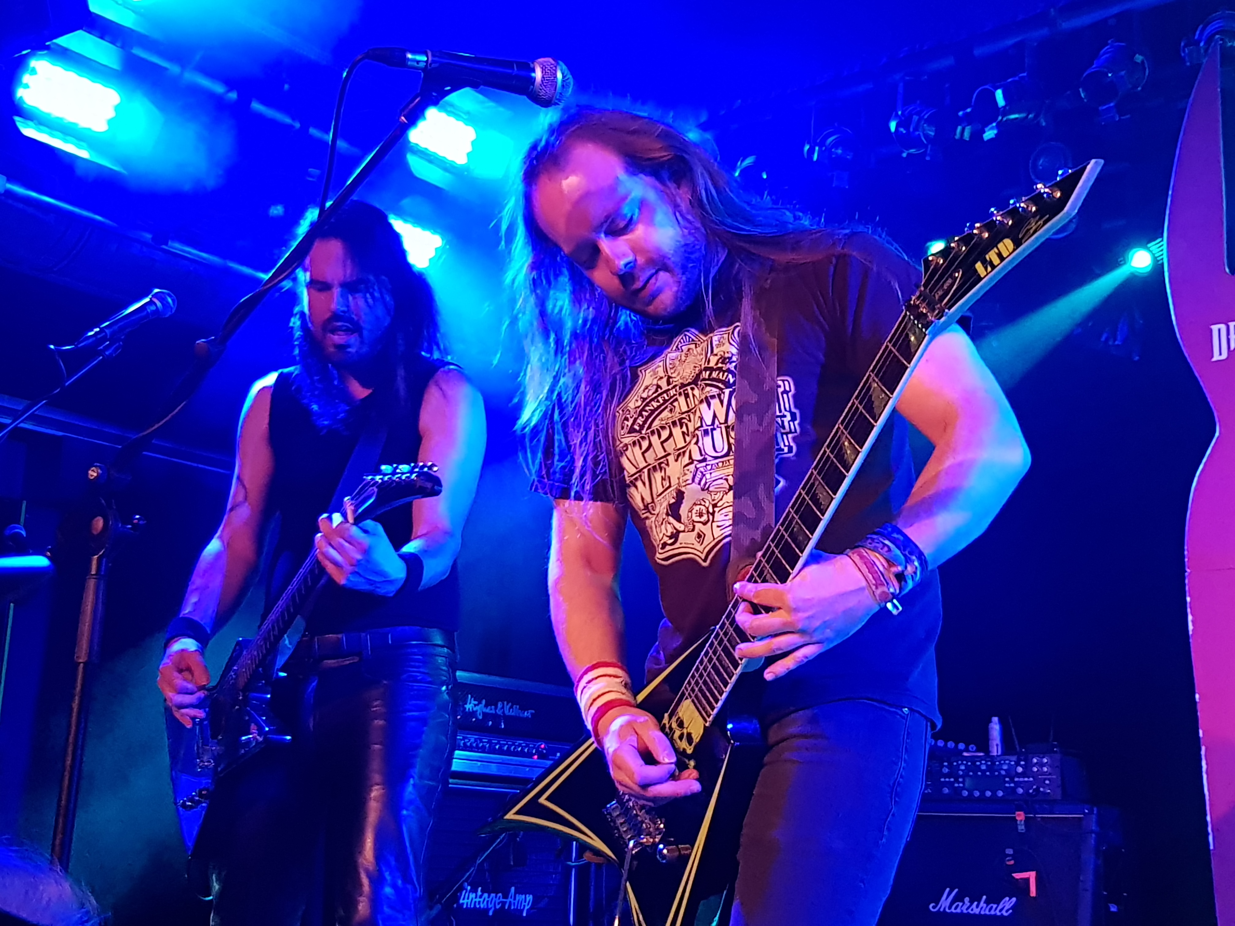 Im gar nicht mal so leeren Colos-Saal durften aber erst einmal DRAGONSFIRE aus Süd-Hessen ran und versetzten das Auditorium mit ihrem flotten Teutonen Metal mit humoristischer Note („Steel-Eel“ Story, Pommegabel in Lebensgröße) gleich mal in Betriebstemperatur. Mit „Speed Demon“, „The Prophet“ oder auch „Raging Fire“ hatten die sympathischen Herren Aschaffenburg schnell auf ihre Seite gezogen. Dass man sich selbst nicht zu 100% ernst nimmt, sorgte für eine lockere Stimmung und so vergingen die 45 Minuten wie im Flug und man machte Platz für die Hauptattraktion des Abends.