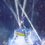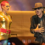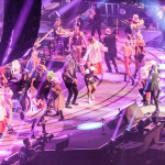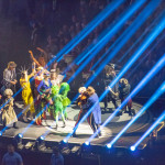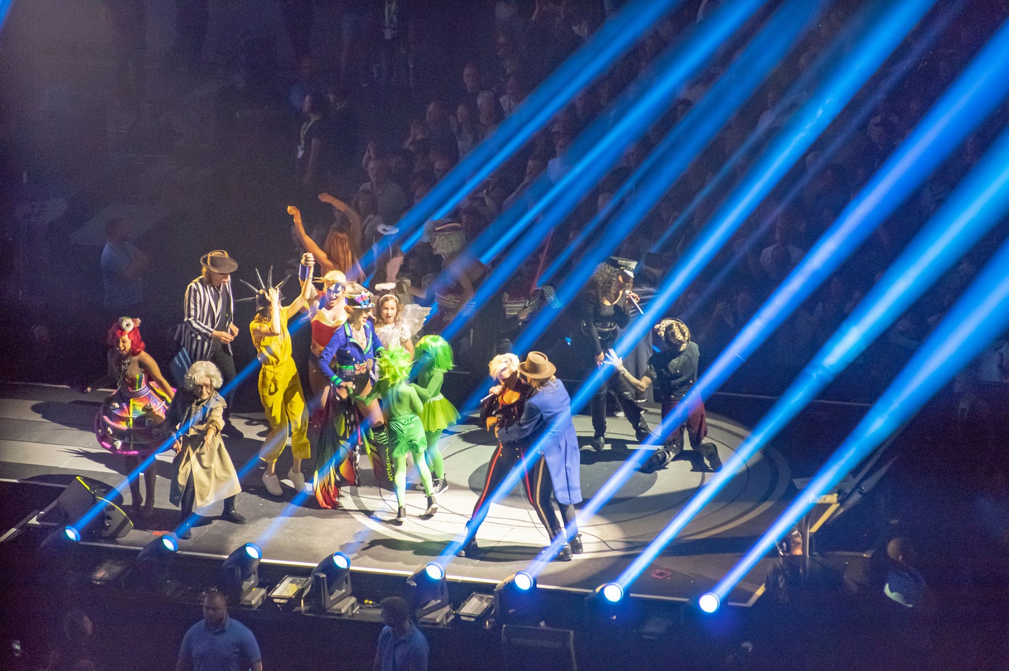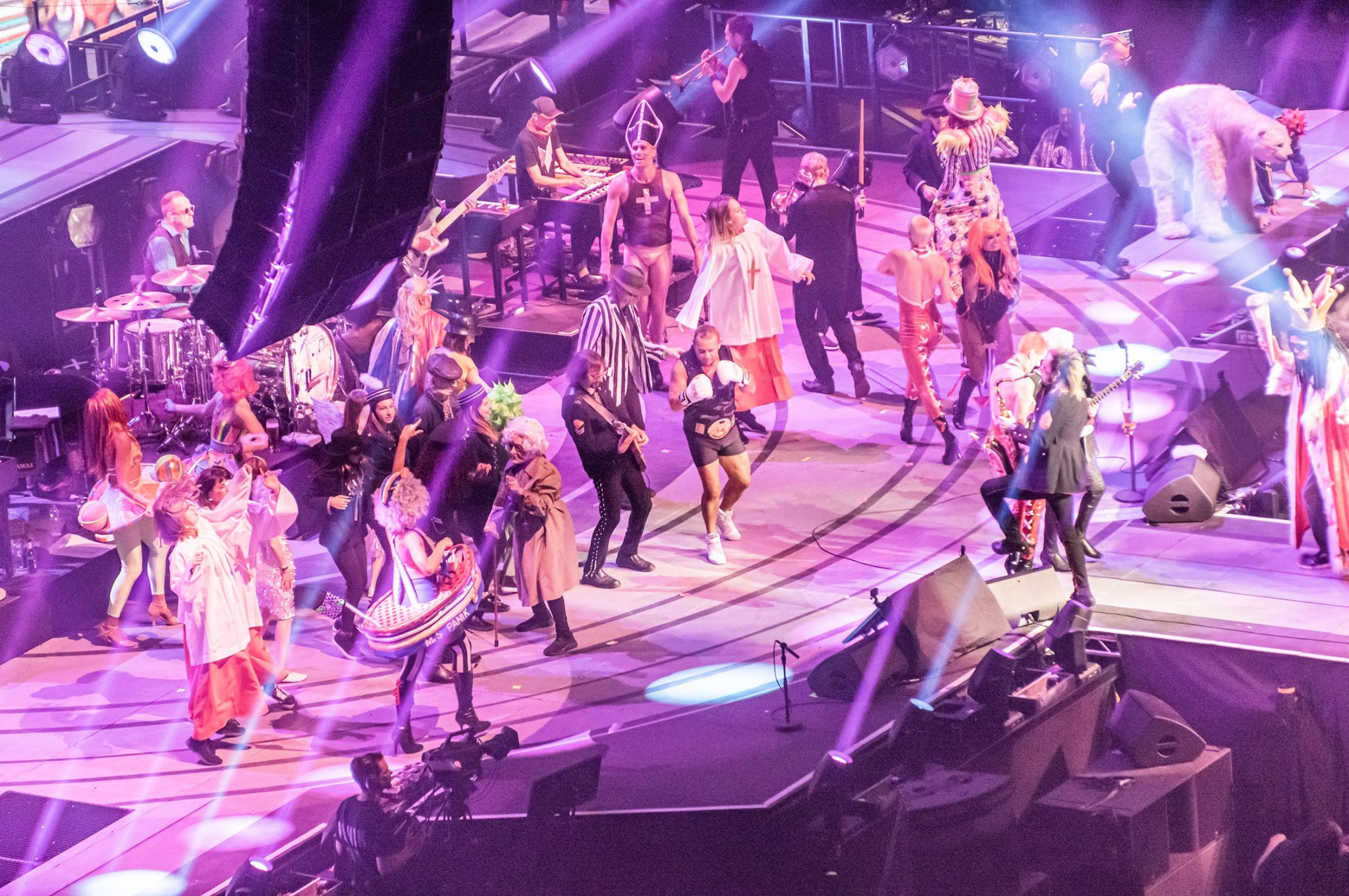 Die bunten, chaotischen Wirbelbilder auf der Bühne gibt es immer mal wieder, wenn die Panik-Familie auf Party macht. Bei „König von Scheißegalien“ wächst ein prächtig colorierter, bewegter Wald, in dem Flamingos Riesentüten verteilen. Zu „Alles was sie anhat, ist ihr Radio“ wird in knallengen, hautfarbenen Trikots getanzt, bevor ein Gitarrengewitter alles beendet. Wenn bei „Cello“ vier Cellistinnen und eine Göttin aus dem Himmel herab schweben, ist das allemal ein so überwältigendes Bild wie bei „Du heißt jetzt Jeremias“ mit viel Halleluja, Kirchenoberen, Glocke, Kirchenillustration in Cinemascope und Kathedralenlicht. Szenische Fantasien im Sarkastic-Sound gegen Zölibat und für gleichgeschlechtliche Ehe. Es tanzten Nonnen in Strapsen, die zu Orgelmusik Priester verführten. Trump und Putin traten zum Boxkampf an, begleitet von einer Horde wilder Wrestlerinnen.