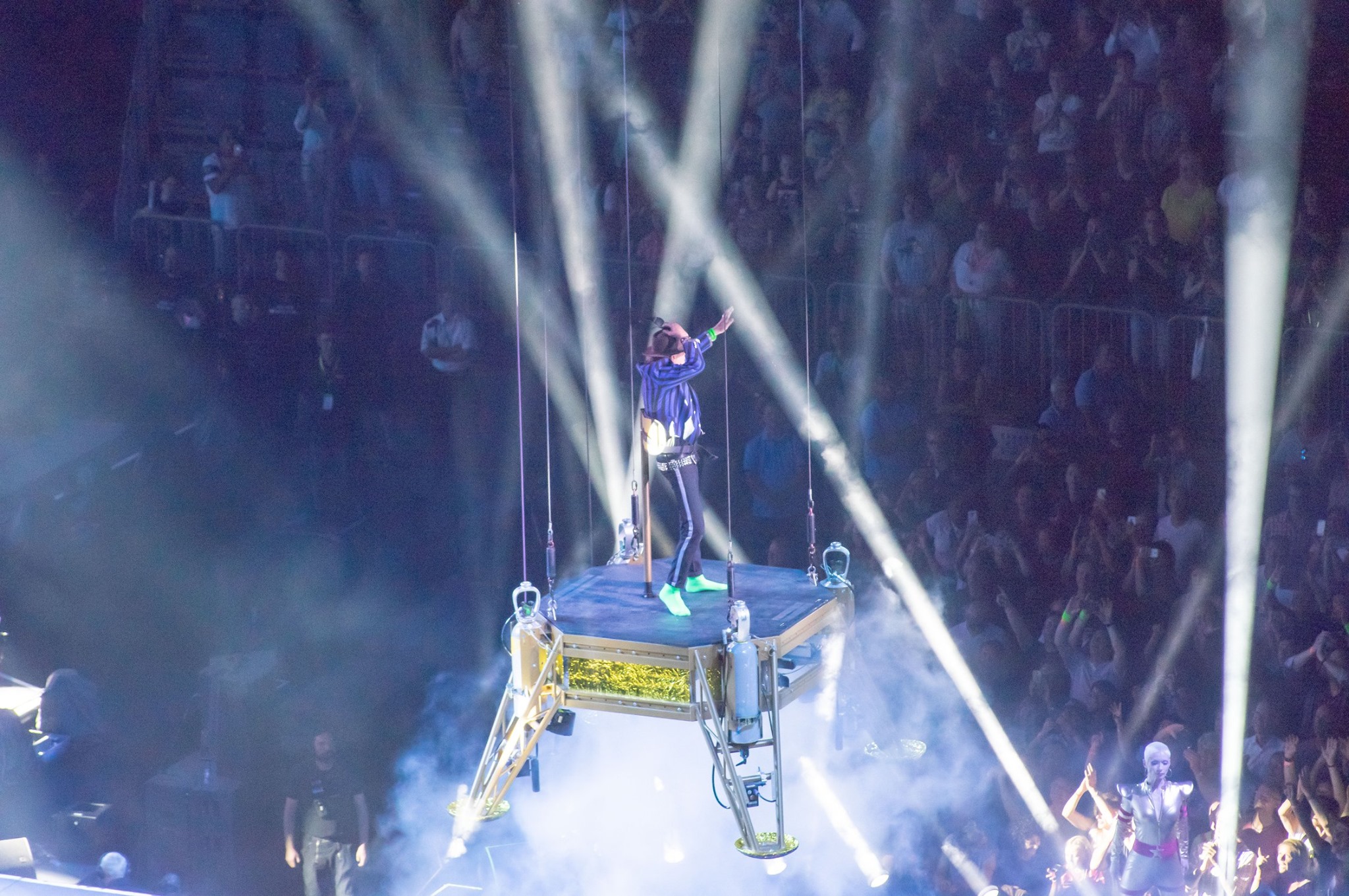 Zu den Klängen von Odyssee, steigt er auf ein Podest und fährt in den Arena-Himmel. Eine Leinwand, ein Flugzeug, das ins Meer stürzt, ein Riesenknall und eine Feuerfontäne. Auf dem Screen erscheint: Keine Panik. Wir sehen uns ganz bald wieder. Um 22.52 Uhr ist das Konzert dann beendet.