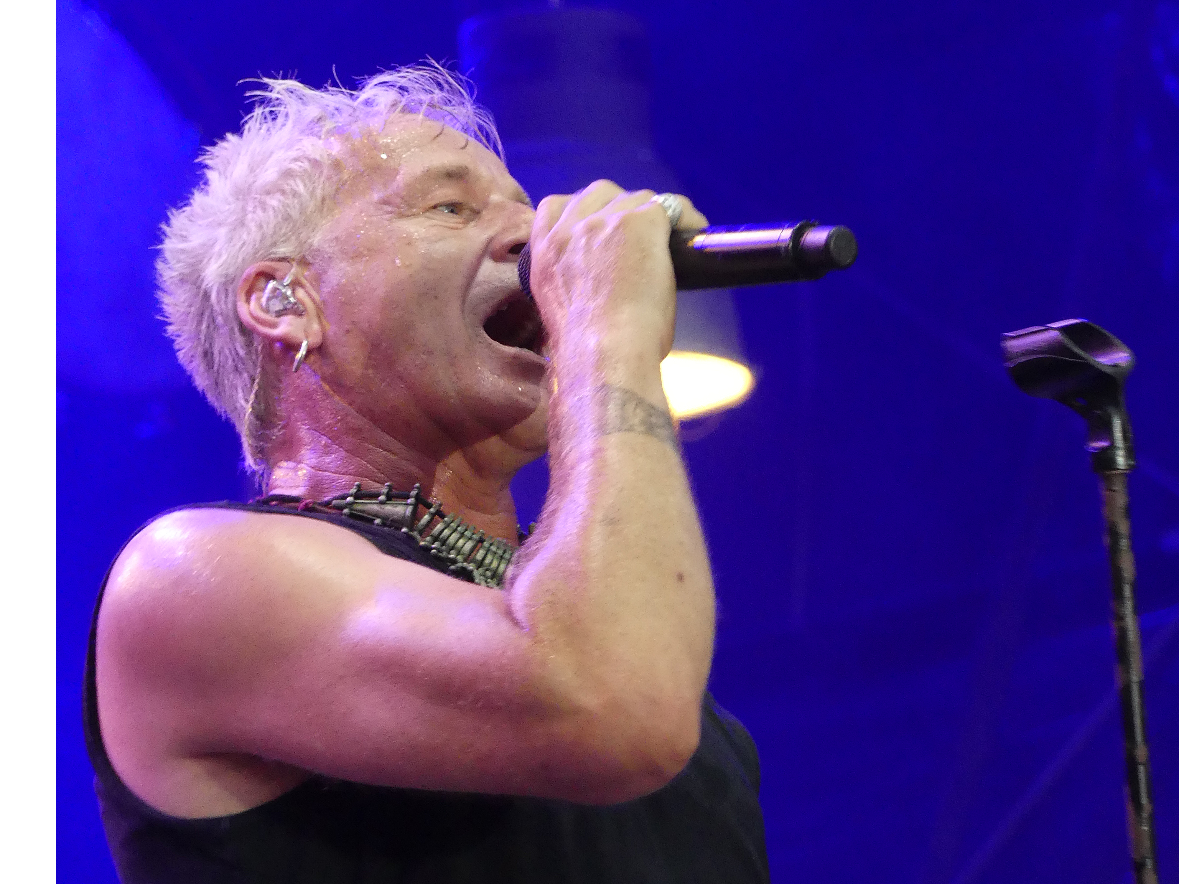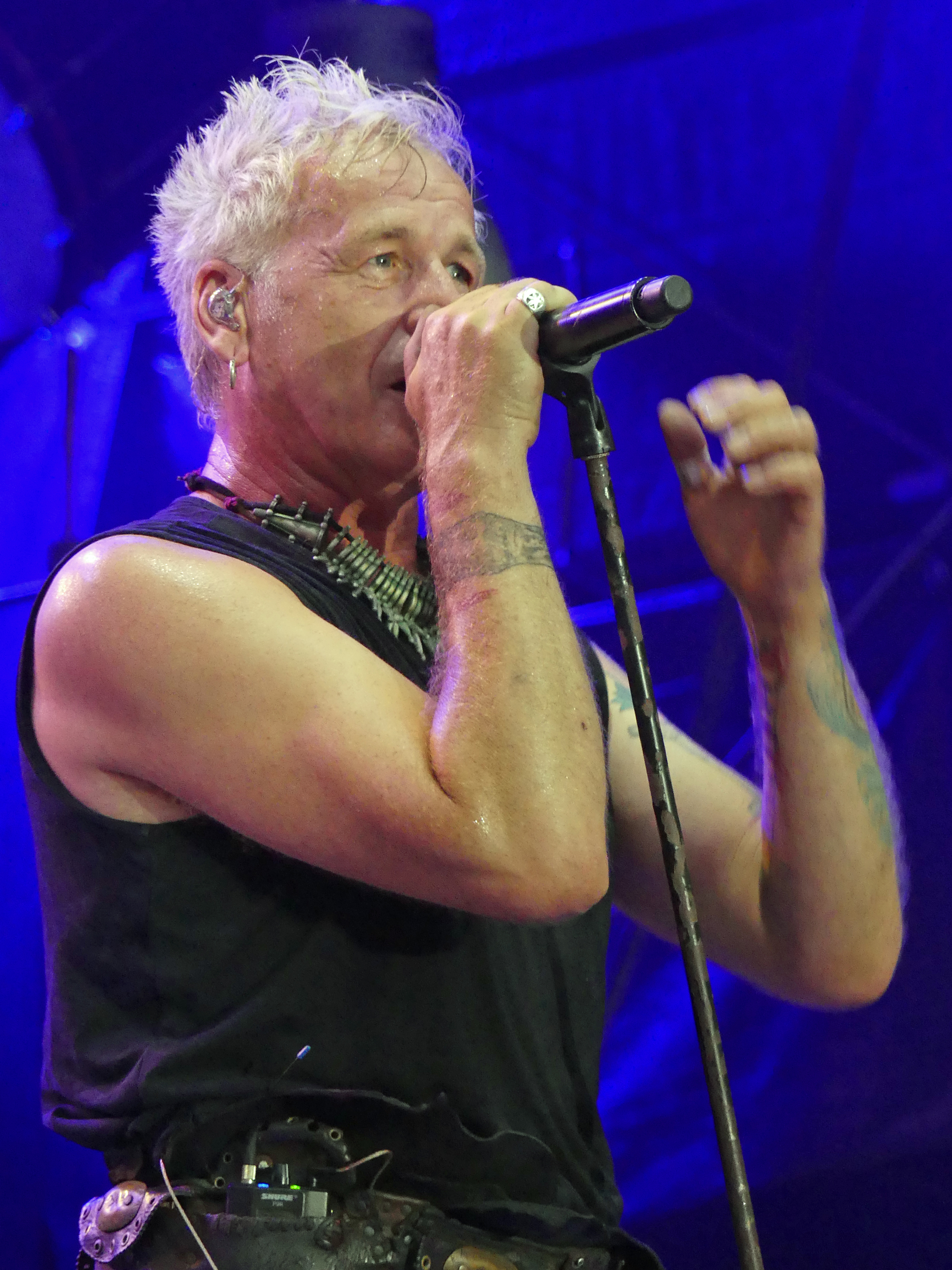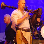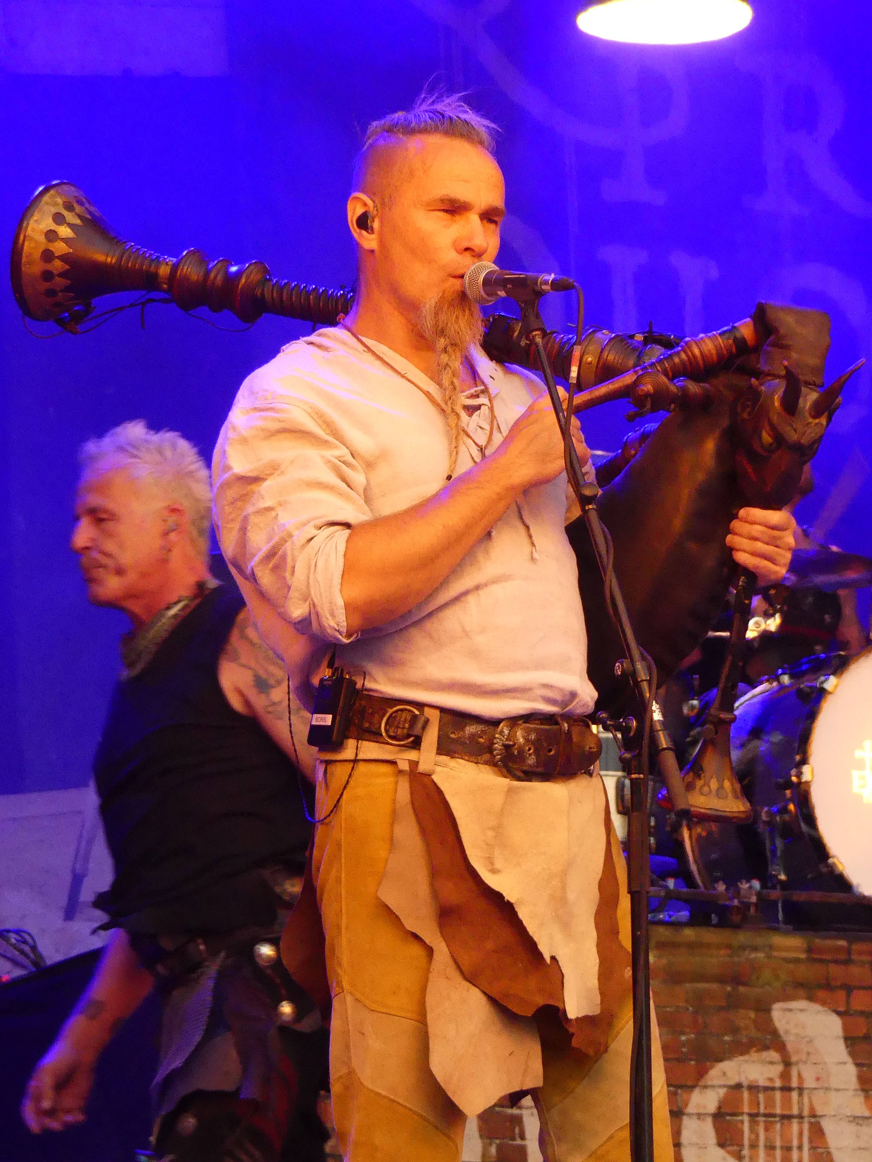Nach einer halbstündigen Atem- und Umbaupause schließlich ertönte das Intro der Headliner und IN EXTREMO betraten die Bühne, um von Pyrotechnik untermalt mit „Sängerkrieg“ direkt in die Vollen zu gehen. Mit „Vollmond“ folgte kurz darauf ein weiterer Bandklassiker gleich zu Anfang des Sets, eingeleitet von Dr. Pymontes wunderbaren Harfenklängen, bevor man mit dem treibenden „Störtebeker“ einen Song vom letzten Album präsentierte. Trotz der durch die vereinten Anstrengungen von Außentemperatur, Scheinwerfer und Pyrotechnik auf der Bühne herrschende Gluthitze gaben die Spielleute Vollgas und kümmerten sich überdies galant um ihr Publikum – O-Ton Micha, schmunzelnd: „Liebe Security, könnt ihr uns vielleicht auch ein paar Wasserflaschen geben, die wir weiterreichen können? Dann sieht es nämlich so aus, als würden WIR die verteilen, wisst ihr?“ Mit „Gaukler“ und „Unsichtbar“ wurden etwas ruhigere Töne angeschlagen, bevor für „Quid Pro Quo“ die Zuhörer um gesangliche Unterstützung gebeten wurden, welche sie nur gar zu gerne gewährten. Die Stimmung im Amphitheater war bestens und die Menge schmetterte aus Leibeskräften mit. Die Band dankte es, indem das Letzte Einhorn an späterer Stelle den Text von „Rotes Haar“ umdichtete: „Ich hab´ mich heute in Trier verliebt…“ Nach einem weiteren ruhigen Stück in Form des getragenen „Lieb Vaterland, Magst Ruhig Sein“ traten die Spielleute wieder aufs Gas und kredenzten mit „Rasend Herz“ einen weiteren Klassiker, dem die Freiheitshymne „Frei Zu Sein“ folgte. Dass unter der Hitze nicht nur der Mensch, sondern auch das Material litt, wurde danach offenkundig, als Sänger Micha um einen Moment Geduld bitten musste, um seine Cister neu zu stimmen: „Ja, bei der Wärme leiden auch die Instrumente… ich brauch´ mal nen Moment!“ Das kleine Problem war jedoch flugs behoben und die Musiker konnten wieder loslegen—mit dem live in den letzten Jahren etwas vernachlässigten, nun dafür aber eine umso grandiosere archaische Wucht entfaltenden „Herr Mannelig“, das in der imposanten historischen Kulisse sogar noch stimmungsvoller wirkte als sonst. Währenddessen wurde auch das letzte verbliebene technische Problem beseitigt, von dem die Menge vor der Bühne zwar bis dato noch gar nicht groß Notiz genommen hatte, das der Band aber sicherlich (noch mehr) den Schweiß auf die Stirn getrieben haben dürfte, auch wenn sie dabei eine bemerkenswerte und hochprofessionelle Ruhe ausstrahlte: einer der Dudelsäcke hatte vorübergehend den Geist aufgegeben, war aber in der Zwischenzeit von Crew-Mitglied Sascha erfolgreich wieder zum Leben erweckt worden, wofür man diesen umgehend zum Dank auf die Bühne holte und ausgiebig beklatschen ließ. Das Publikum johlte und skandierte seinen Namen, der Instrumentenretter selbst schien eher verlegen und darum bemüht, das Rampenlicht schnellstmöglich wieder zu verlassen, während die Band ihm angesichts bevorstehender Reisepläne fröhlich nachrief: „Eins steht fest, Sascha – das letzte Ticket nach Japan ist für dich!“