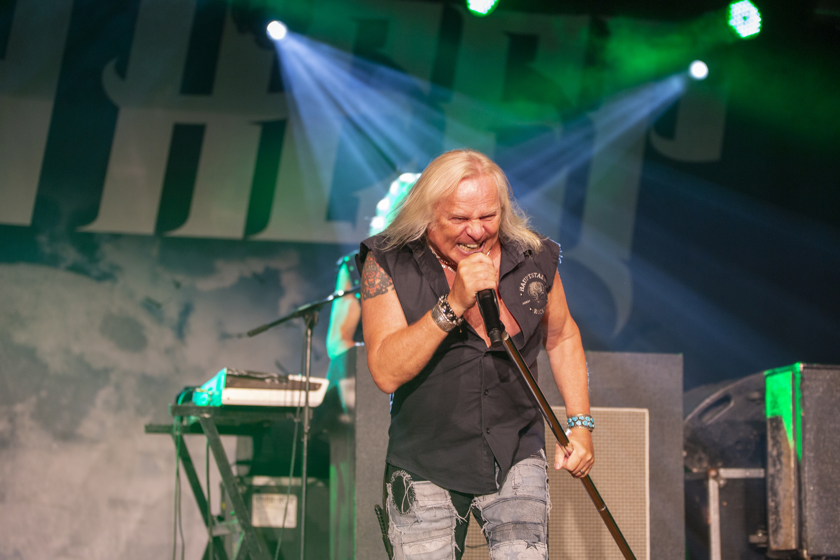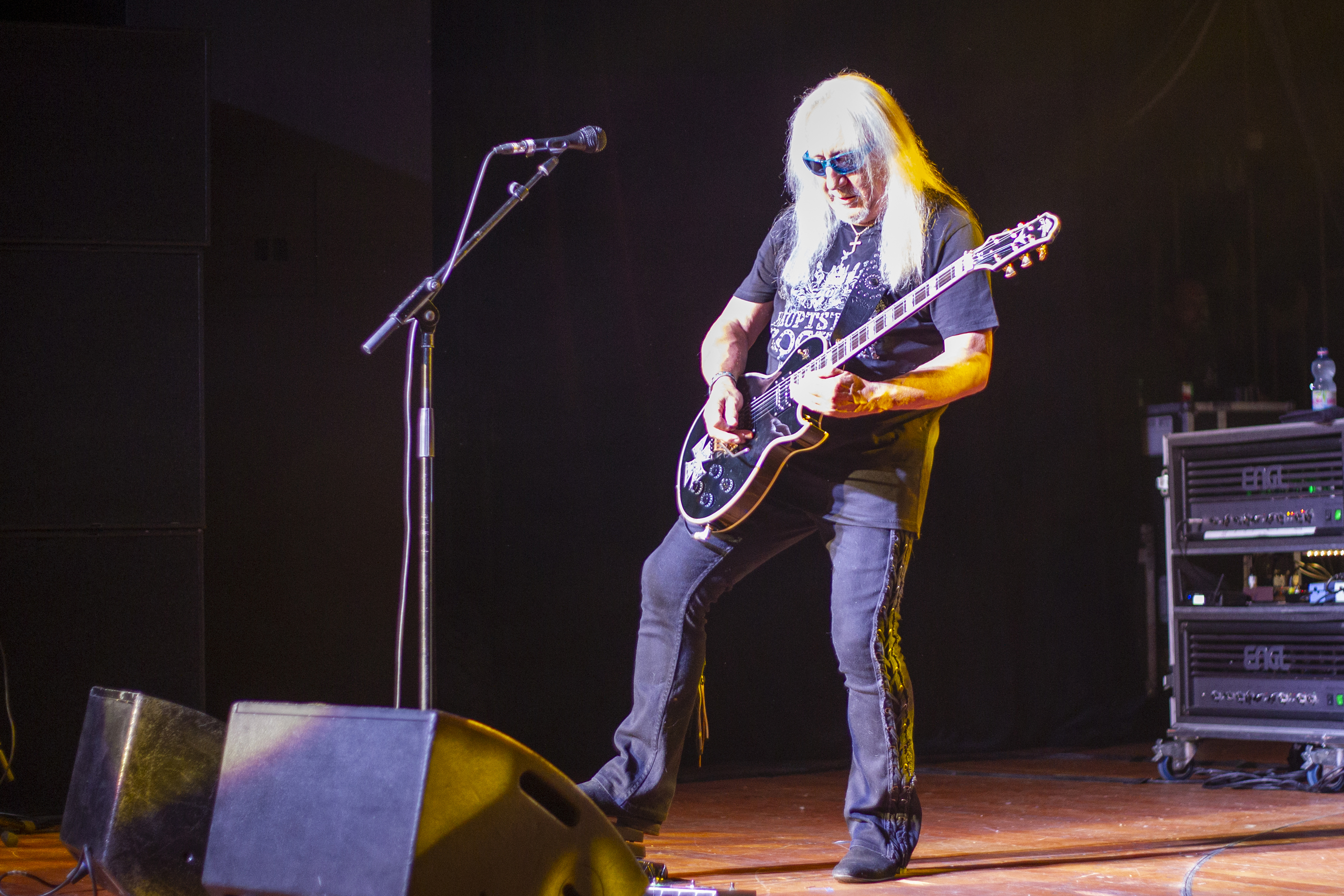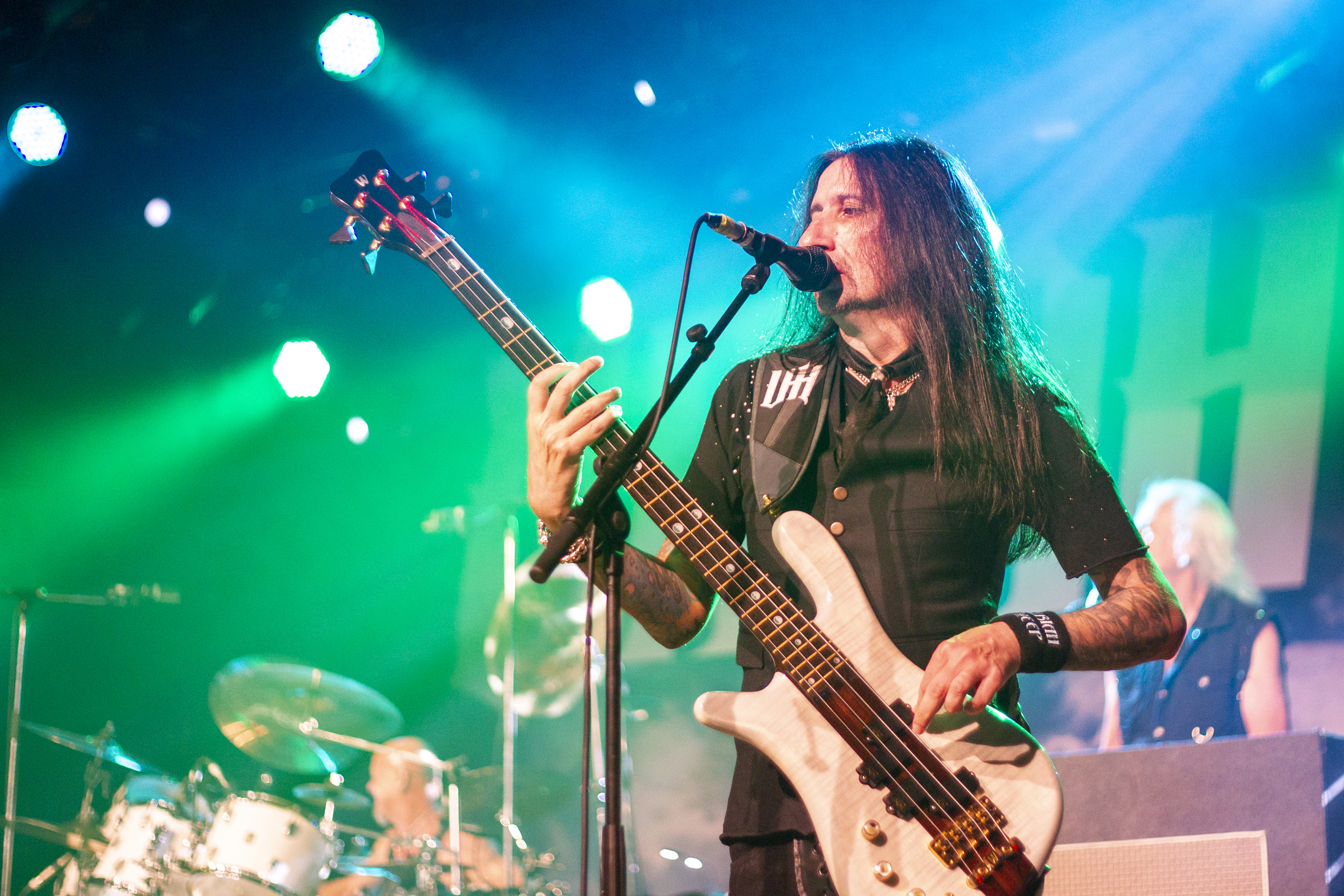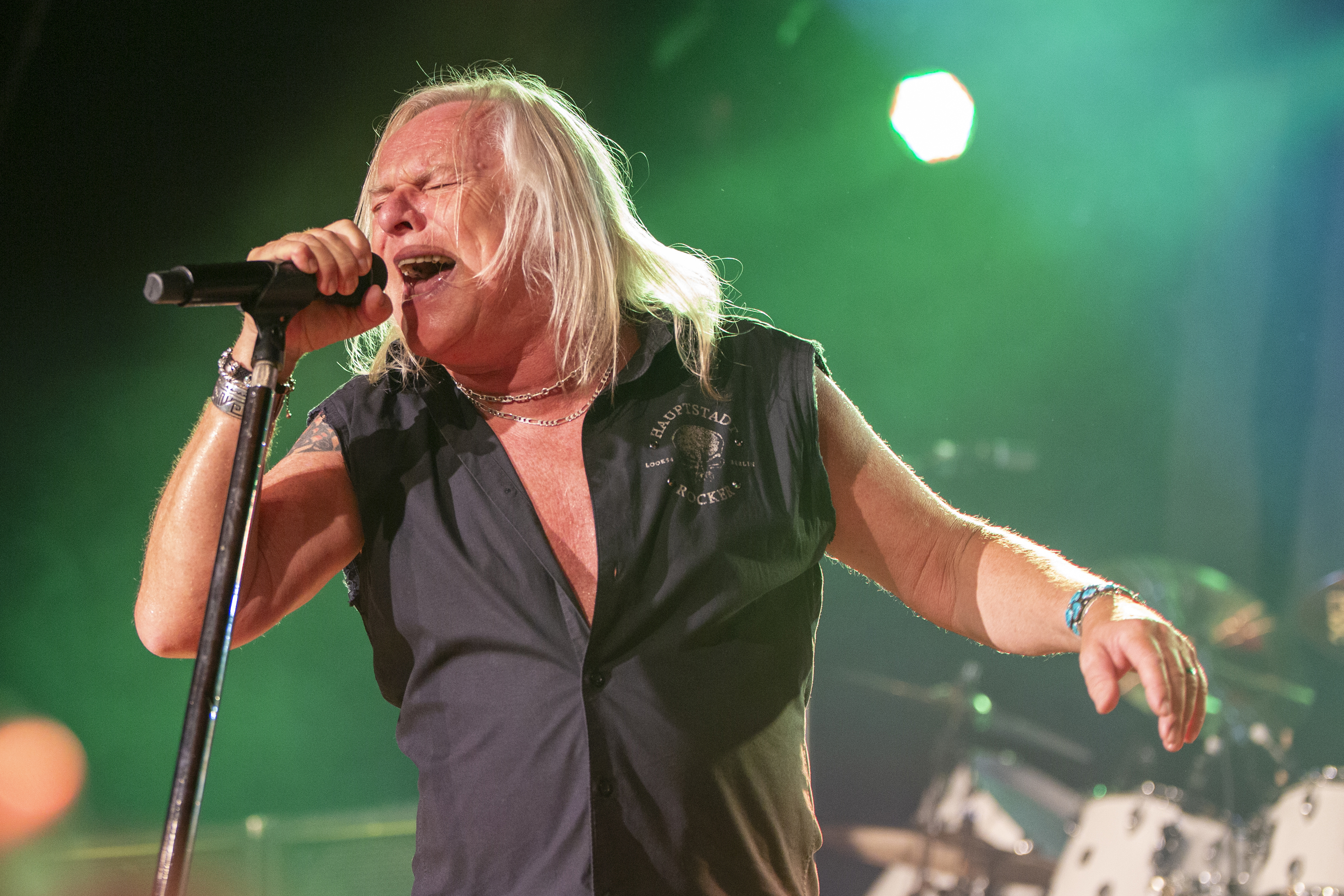 Doch bereits kurz danach ging es weiter mit URIAH HEEP die alle schon sehnsüchtig erwartet hatten. Trotz der Hitze im Saal machte es niemanden mehr etwas aus, als es los ging. Mick Box das Urgestein von URIAH HEEP an der Gitarre, top gestylt im Swarovski Outfit, mit langen weißen Haaren war der optische Lichtblick des Abends. Auch nach nunmehr 49 Jahren im Musik Business lassen URIAH HEEP auch heute noch so manchen Newcomer alt aussehen. Hits wie „Grazedby Heaven“ aus ihrer letzten CD von 2018, „Living in the Dream“ „Too Scared to Run“ und als absoluter Top Song „Lady in Black“ brachten den Saal zum Beben. URIAH HEEPs Frontman Bernie Shaw ist der absolute Showman und diese Gabe weiß er auch einzusetzen, um das Publikum mitzunehmen. Seine auf Deutsch gehaltenen Talks, machen diese Band so unwiderstehlich und man sieht, dass hier viele Jahre Rock´ n Roll gelebt werden und alle Freude und Spaß an der Musik haben. Bassist Davey Rimmer mit fliegenden Haaren, einem absoluten Top Posing und vielen blauen Leuchteffekten, bearbeitete seinen Bass, dass es eine Freude war ihm dabei zuzusehen. Sogar ich mit meinen nunmehr 59 Jahren konnte mich im Fotograben diesem Gänsehautfeeling nicht entziehen.