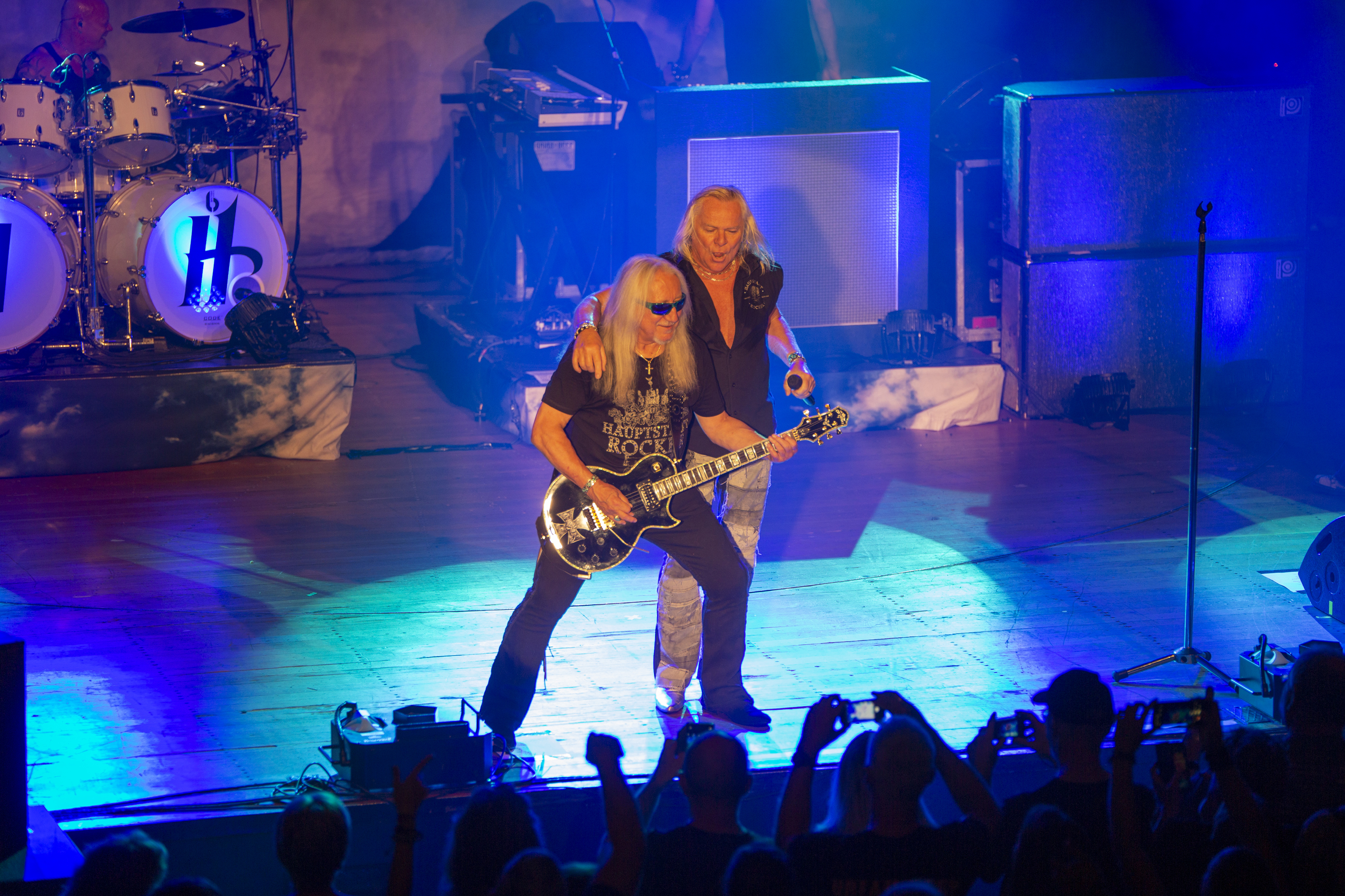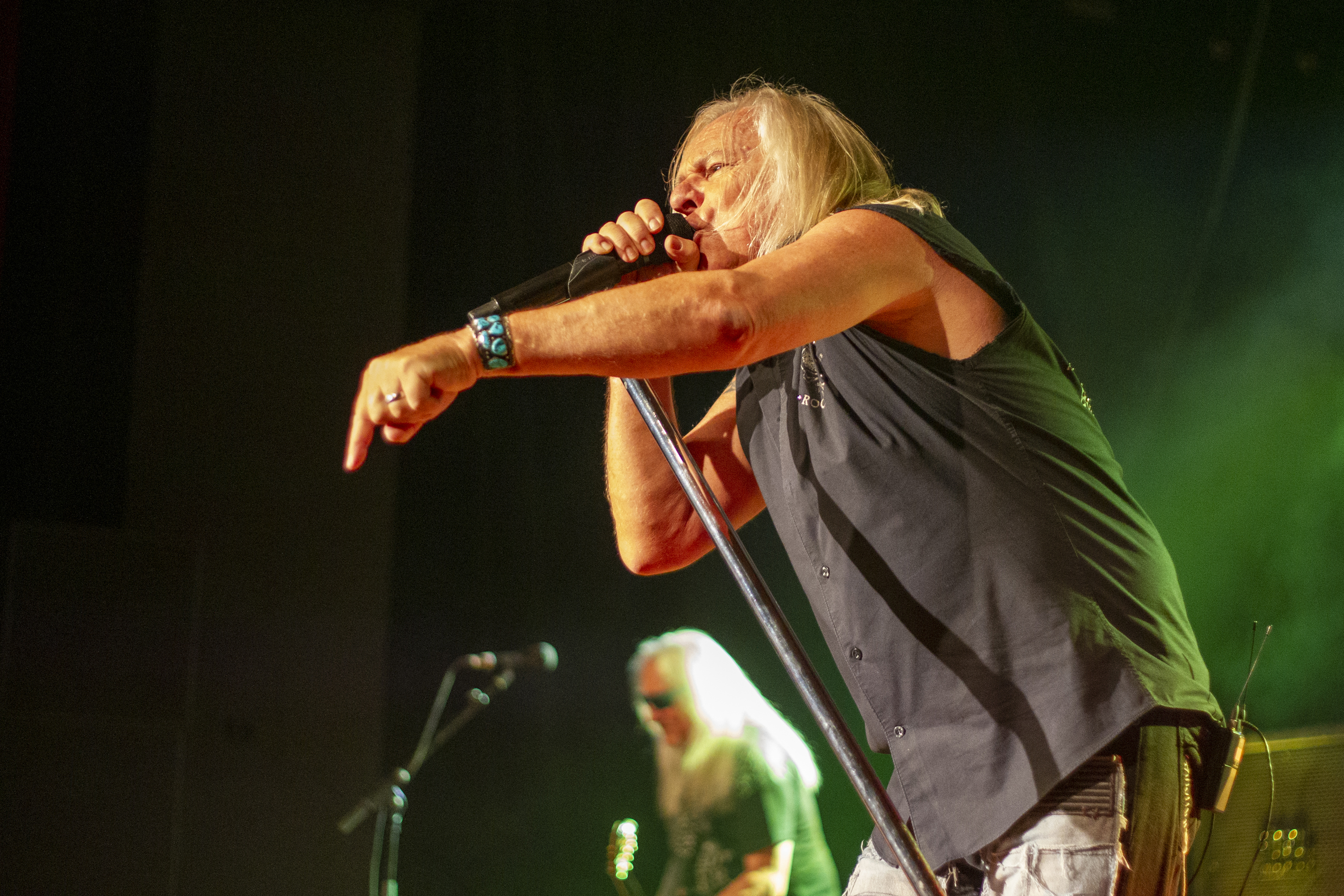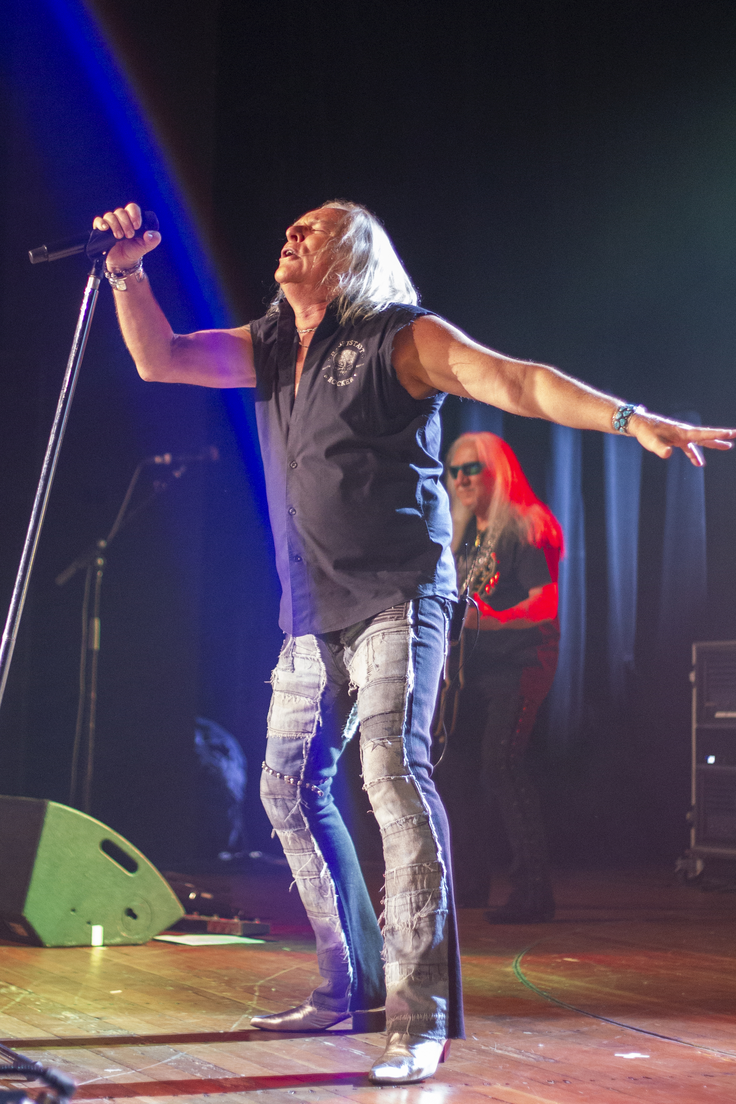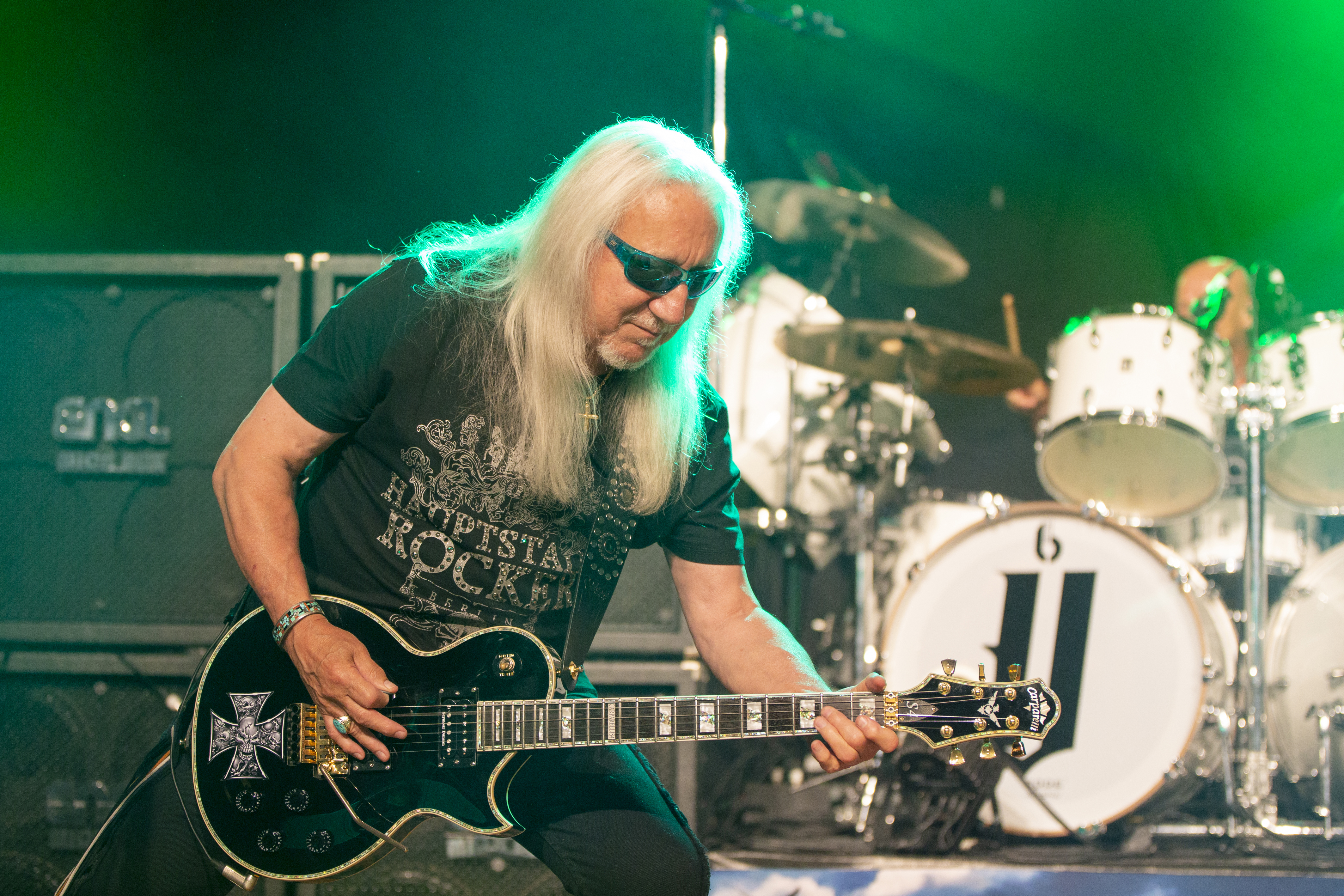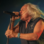 Doch bereits kurz danach ging es weiter mit URIAH HEEP die alle schon sehnsüchtig erwartet hatten. Trotz der Hitze im Saal machte es niemanden mehr etwas aus, als es los ging. Mick Box das Urgestein von URIAH HEEP an der Gitarre, top gestylt im Swarovski Outfit, mit langen weißen Haaren war der optische Lichtblick des Abends. Auch nach nunmehr 49 Jahren im Musik Business lassen URIAH HEEP auch heute noch so manchen Newcomer alt aussehen. Hits wie „Grazedby Heaven“ aus ihrer letzten CD von 2018, „Living in the Dream“ „Too Scared to Run“ und als absoluter Top Song „Lady in Black“ brachten den Saal zum Beben. URIAH HEEPs Frontman Bernie Shaw ist der absolute Showman und diese Gabe weiß er auch einzusetzen, um das Publikum mitzunehmen. Seine auf Deutsch gehaltenen Talks, machen diese Band so unwiderstehlich und man sieht, dass hier viele Jahre Rock´ n Roll gelebt werden und alle Freude und Spaß an der Musik haben. Bassist Davey Rimmer mit fliegenden Haaren, einem absoluten Top Posing und vielen blauen Leuchteffekten, bearbeitete seinen Bass, dass es eine Freude war ihm dabei zuzusehen. Sogar ich mit meinen nunmehr 59 Jahren konnte mich im Fotograben diesem Gänsehautfeeling nicht entziehen.
