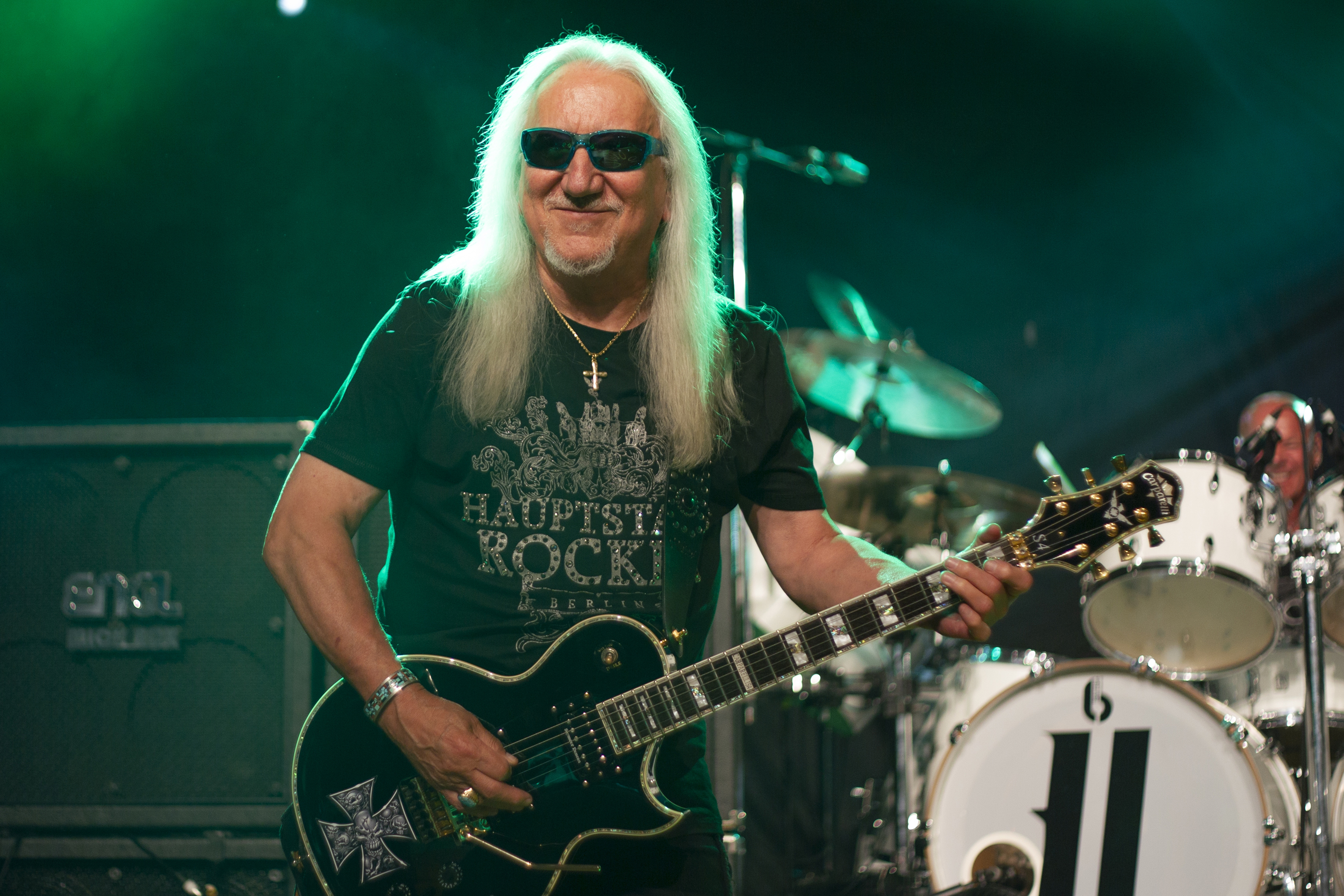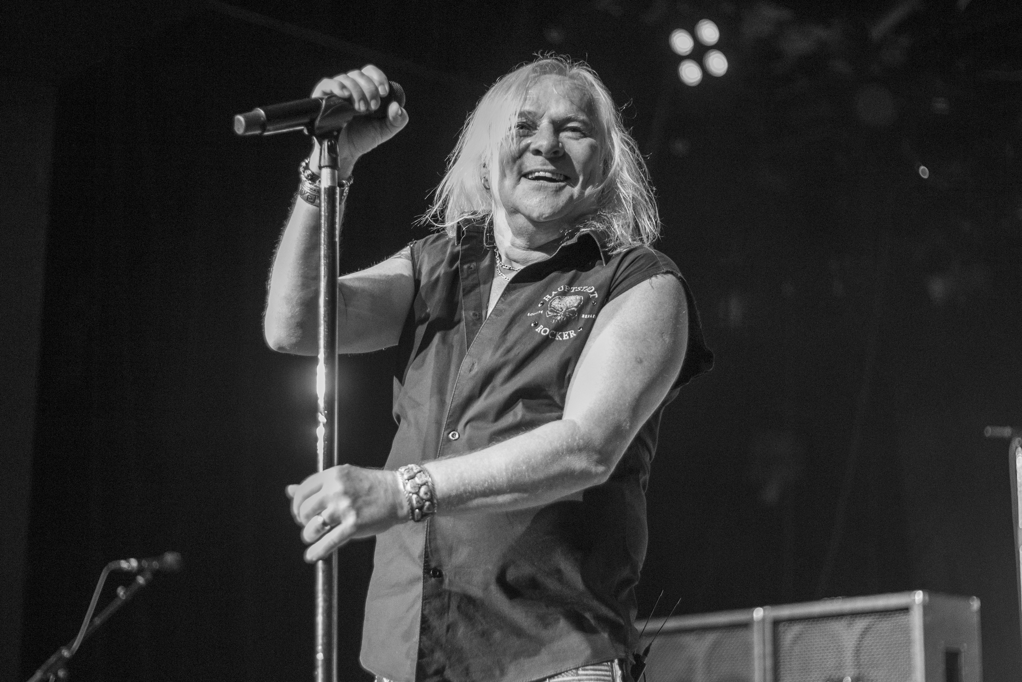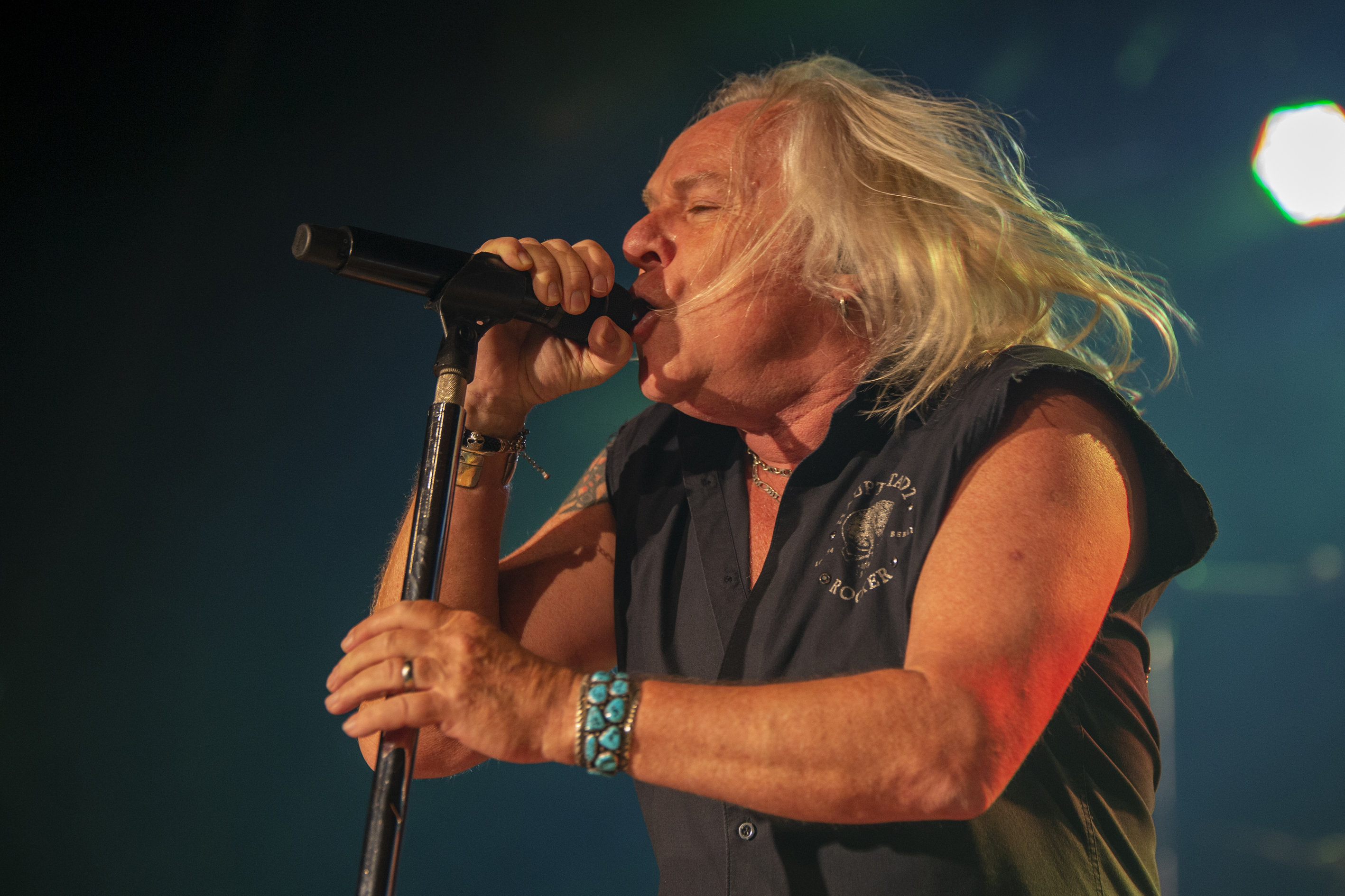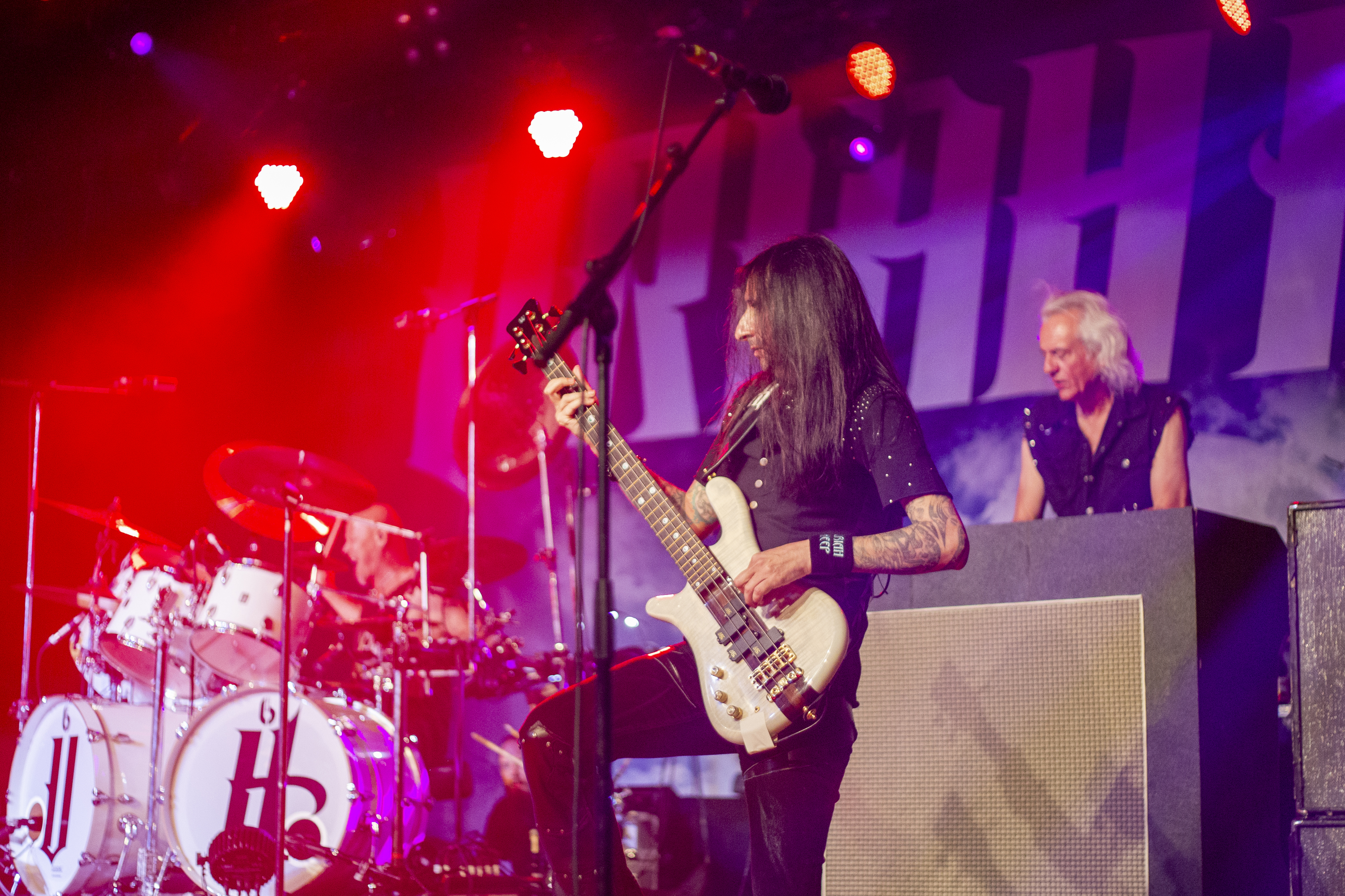 Doch bereits kurz danach ging es weiter mit URIAH HEEP die alle schon sehnsüchtig erwartet hatten. Trotz der Hitze im Saal machte es niemanden mehr etwas aus, als es los ging. Mick Box das Urgestein von URIAH HEEP an der Gitarre, top gestylt im Swarovski Outfit, mit langen weißen Haaren war der optische Lichtblick des Abends. Auch nach nunmehr 49 Jahren im Musik Business lassen URIAH HEEP auch heute noch so manchen Newcomer alt aussehen. Hits wie „Grazedby Heaven“ aus ihrer letzten CD von 2018, „Living in the Dream“ „Too Scared to Run“ und als absoluter Top Song „Lady in Black“ brachten den Saal zum Beben. URIAH HEEPs Frontman Bernie Shaw ist der absolute Showman und diese Gabe weiß er auch einzusetzen, um das Publikum mitzunehmen. Seine auf Deutsch gehaltenen Talks, machen diese Band so unwiderstehlich und man sieht, dass hier viele Jahre Rock´ n Roll gelebt werden und alle Freude und Spaß an der Musik haben. Bassist Davey Rimmer mit fliegenden Haaren, einem absoluten Top Posing und vielen blauen Leuchteffekten, bearbeitete seinen Bass, dass es eine Freude war ihm dabei zuzusehen. Sogar ich mit meinen nunmehr 59 Jahren konnte mich im Fotograben diesem Gänsehautfeeling nicht entziehen.