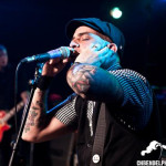 Höhepunkt des Abends war anscheinend für viele Besucher der STREET DOGS-Gigs, der Saal war so voll wie sonst was (bei THE BONES war hinterher weniger los) und die Stimmung bestens. Die Bostoner verstanden es, gute Laune zu verbreiten und ordentlich Sympathiepunkte zu sammeln. Klassisch in Arbeiterkluft aus dem 19. Jahrhundert gekleidet und mit Boston Bruins-Schal verfeinert, wurde eine gute Stunde lang Gas gegeben und eine feucht-fröhliche Party gefeiert. Zum vollkommenen Glück fehlten den Bostonern nur noch Stagedivern, aber irgendwas ist ja immer…