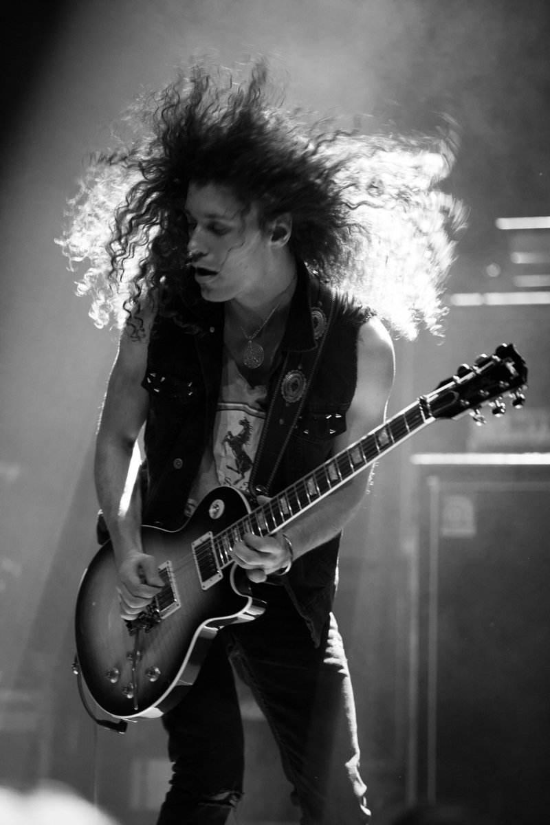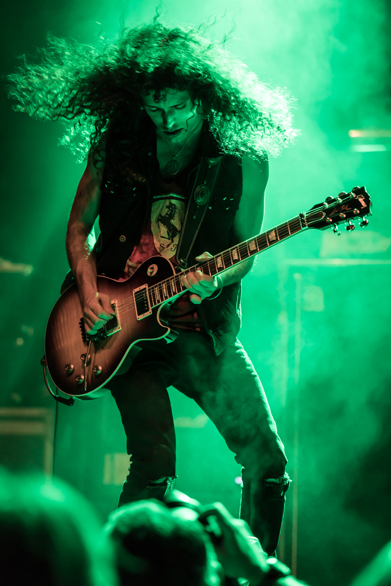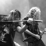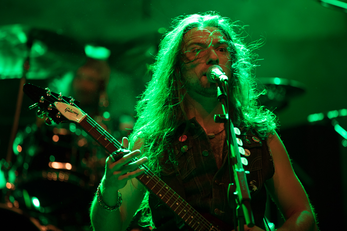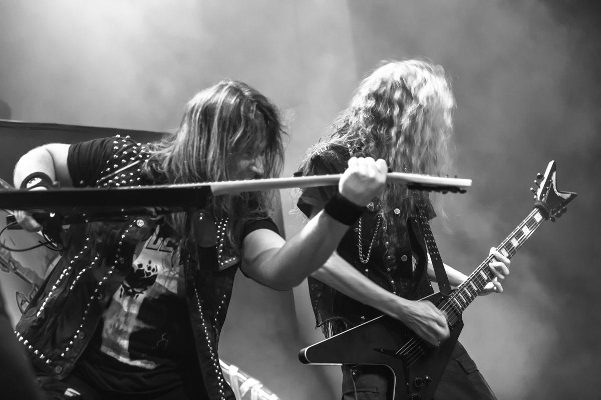 Dagegen fallen dann die beiden Gitarristen Linsk und Tailer, die doch recht – wie leider fast immer live – hüftsteif auf der Bühne stehen, sehr ab. Derek Tailer dreht sich manchmal etwas im Kreis oder schnippt Plektren nach vorne weg. Leicht gelangweilt, vielleicht lauffaul und sich auf ein paar Mimiken beschränkend, werden die Gitarrenriffs von Tailer und Linsk einfach runtergespielt und irgendwie wirkt es langweilig. Linsk bewegt sich nahezu nicht, vielleicht mal ein verbissenes Gesicht gibt er uns. Hier würde ein Typ wie Damir Eskić gut tun, der neben Blitz und D.D. Verni nochmals Energie auf die Bühne transportieren würde.