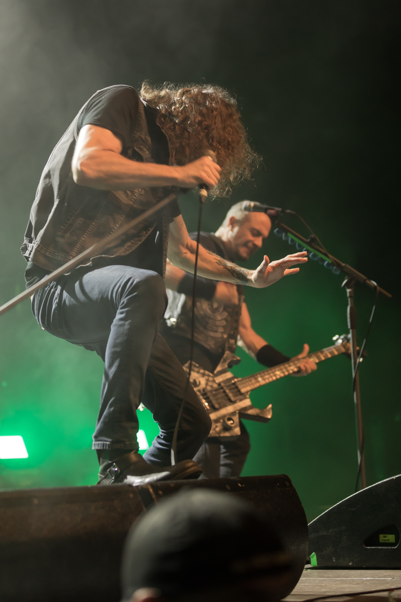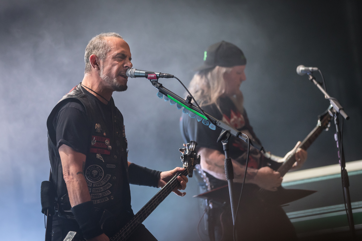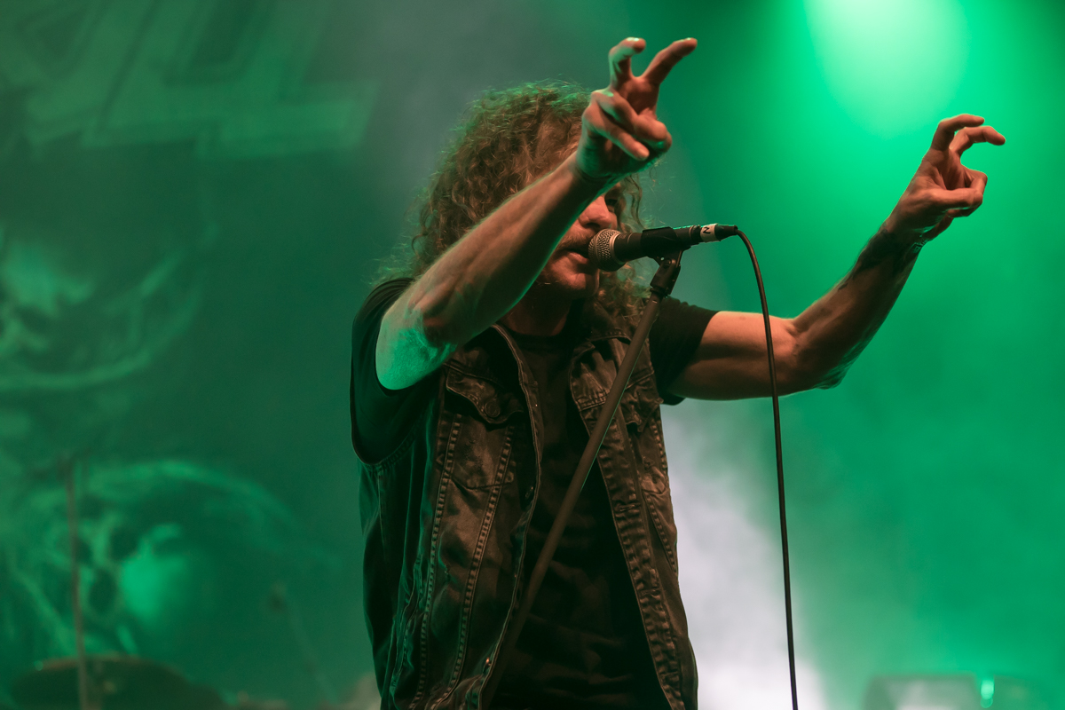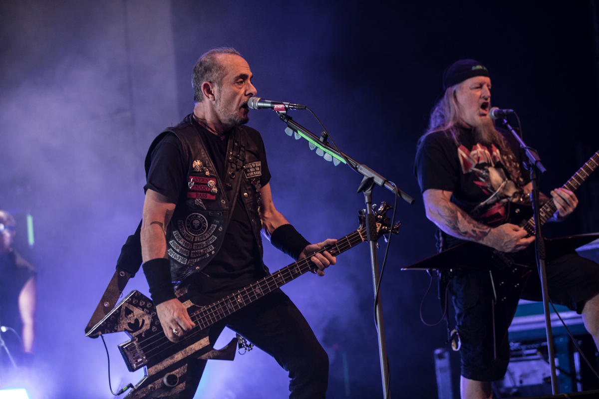 Mittlerweile hatte sich die Halle weiter gefüllt. Es sind die alten Thrashbands der 80er, die sich nun ankündigten, so dass es nicht verwunderte, dass das Durchschnittsalter der Metalheads dort doch gefühlt über 50 gelegen hat. Richtige Stimmung wollte an dem Abend aber generell nicht aufkommen: Zu weit gefächert stand man vor der Bühne und konnte sich über mangelnde Beinfreiheit nicht beklagen.