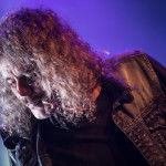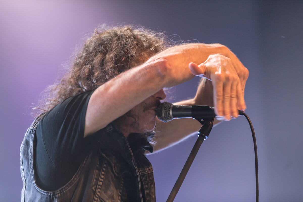 „Was macht er da eigentlich?“ fragte ich mich, bevor er dann für den nächsten Einsatz wie ein „geölter Blitz“ wieder zum Mikroständer am Bühnenrand sprintete, als dürfe er den Bus nicht verpassen. Dann hängt er am Mikroständer, einen Fuß auf der Monitorbox, wie eine Krake sieht es aus und er krächzt dann je nach Song spitze Schreie ins Mikro. Das bringt Action auf die Bühne, kommt aber teils auch grotesk daher.