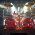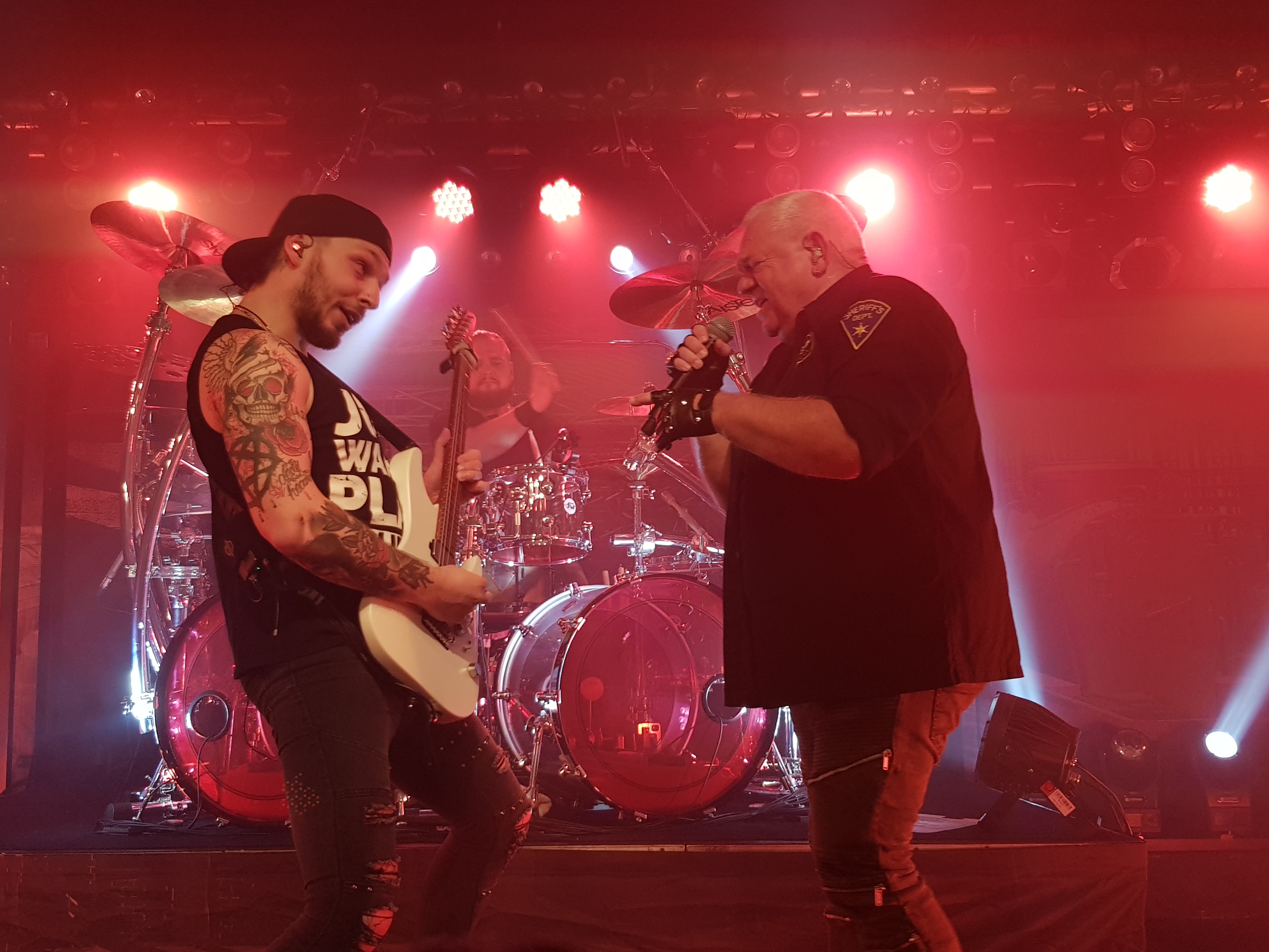Trotzdem wurde nur auf eine bestimmte Person gewartet. Zu den Klängen von „Tongue Reaper“ stürmten U.D.O. die Bühne, welche stilistisch ein gewisses Fabrikflair verbreitete und damit den Titel der aktuellen LP „Steelfactory“ sehr gut optisch umzusetzen wusste. Dass Udo mittlerweile 67 Jahre alt ist, merkt man nicht wirklich. Ich konnte zwischen der 97er „Solid“ Tour und seiner Performance am heutigen Abend jedenfalls keine wirklichen Unterschiede feststellen. Die Unterschiede lagen eher bei seiner Hintermannschaft, die in dieser Besetzung erst relativ kurze Zeit zusammenspielt und deren am längsten aktives Mitglied Gitarrist Andrey Smirnov ist, welcher 2012 in die Band kam. Diese Hintermannschaft zeigte sich aber perfekt eingespielt, tight und mit richtig Bock. Die Band vermittelte eine lockere Stimmung und es machte Spaß die „Kids“ beim Mitsingen (Backings kamen nicht vom Band!), Rochieren auf der Bühne und Grimassen schneiden zu beobachten. Die Freude am Rock ‘n‘ Roll kam jedenfalls glaubhaft rüber. Ein weiterer Blickfang war das transparente und mit gebogenen Beckenständern versehen Drumkit von Udos Sohn Sven, welcher einen knallharten Beat vorgab.