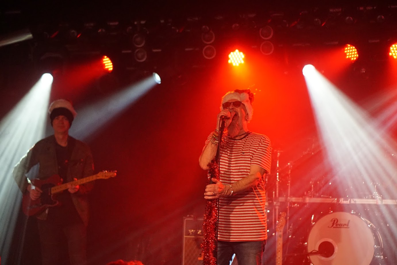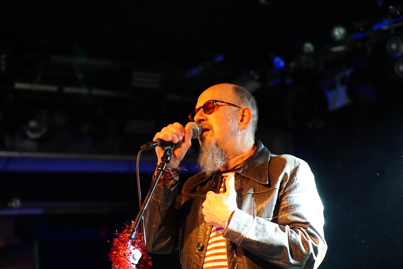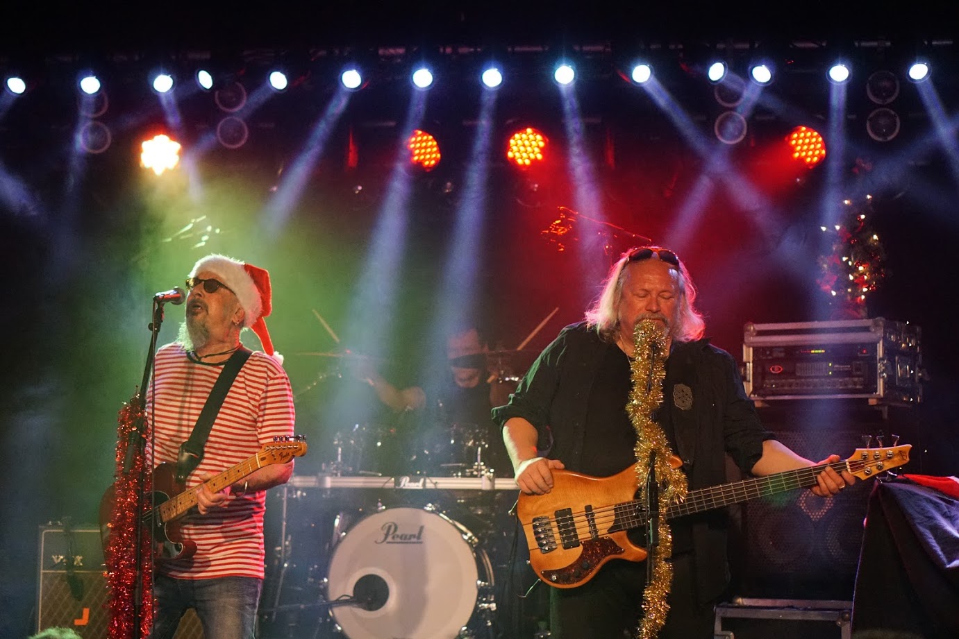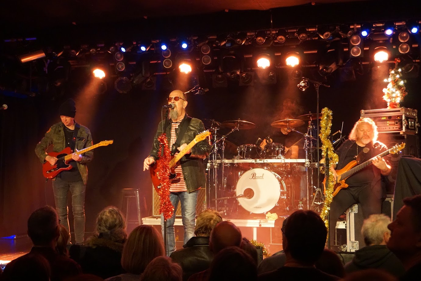 CHRIS THOMPSON hört man seine 71 Jahre an. Seine Stimme hat an Elastizität und Kraft eingebüßt und ist Lichtjahre entfernt von seiner glorreichen Vergangenheit. Mich stört dabei insbesondere, dass er das noch nicht wirklich verinnerlicht hat. So wird teilweise manche Nummer nahezu akapella performed, also die Vokals unbekleidet in den Fokus ("Blinded by the Light" , "For you" ) gestellt. Die Krux bzw. das Gute bei der Sache ist, dass das niemanden so wirklich zu stören scheint. Und das ist im Kern auch gut so. Das ordentlich gefüllte Colos-Saal trägt den gealterten Musiker, der mal mit, mal ohne Gitarre, mal mit, mal ohne Nikolausmütze bestens gelaunt unsterbliche Klassiker nacheinander raushaut. Es wird lautstark mitgesungen, geklatscht, gejohlt und gefeiert, als ob die Zeit ihm wie auch den Songs nichts anhaben kann. Auch wenn ich das eine Spur realistischer beurteile, erkenne ich doch, dass das Publikum hier alles richtig macht. So denke ich, bis auf ein, zwei Kritiker und den Rezensienten hatte niemand hier im Aschaffenburger Kultschuppen etwas zu bemängeln, und der überwiegende Teil genoss einen Abend mit einer leidenschaftlichen und gut eingespielten Band sowie einer der prägenden Stimmen des Classic Rock.