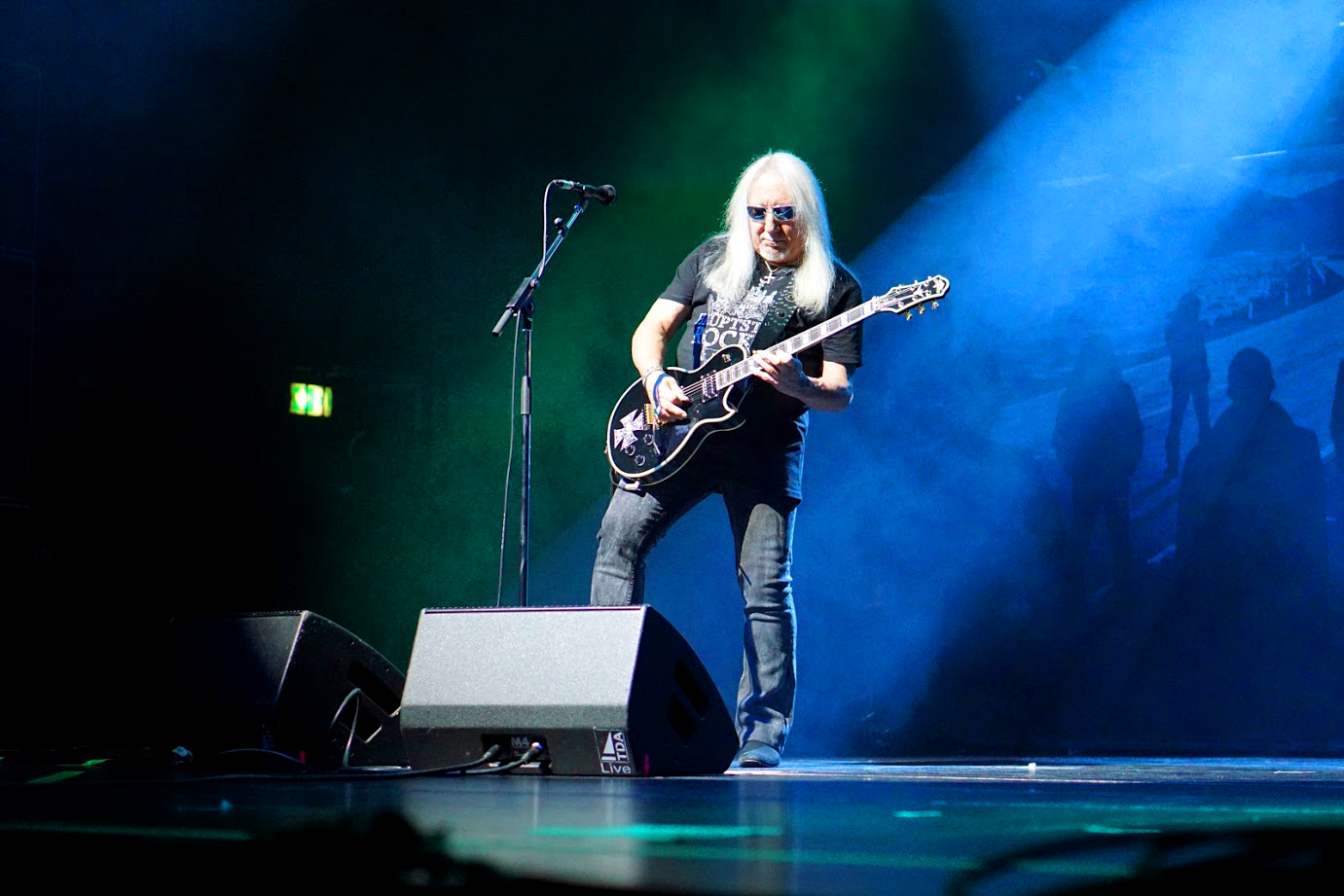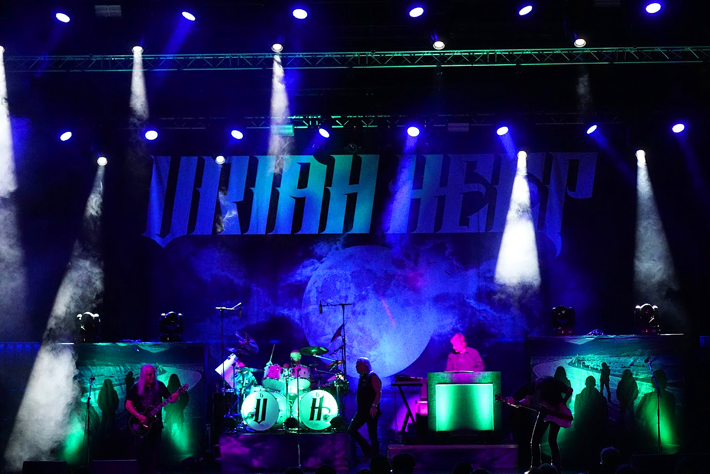 Zu guter Letzt kommen URIAH HEEP auf die nun vergrößerte und komplette Bühne. Volle Lightshow und die zusätzlichen Bühnenaufbauten signalisieren Headliner. Die Briten haben Frankfurt vom ersten bis zum letzten Ton in der Tasche. Hier sind es die Songs "Too Scared To Run", "Gypsy" und "Look At Yourself" wie auch das Stage Acting der Musiker, die überzeugen. Das Publikum im Innenraum steht und sammelt sich zusehends vor der Bühne. Mick Box zeigt, was für ein überragender Gitarrist er ist, und Sänger Bernie Shaw ist stimmlich in Topform. Wie bereits erwähnt, setzt kein geringerer als Don Airey mit warmen Keyboard-Schwaden starke Akzente und bereichert damit zusätzlich den Gig.