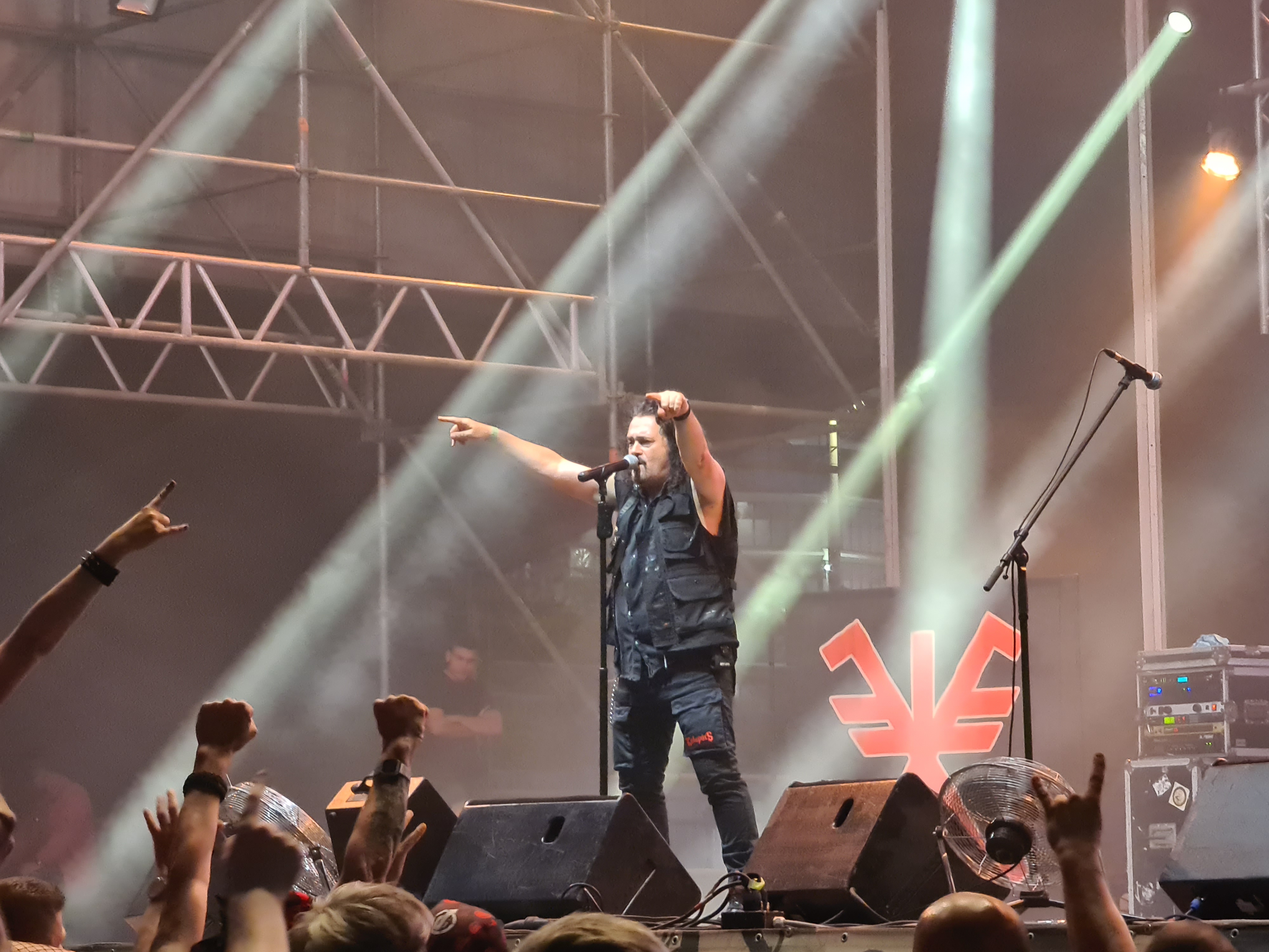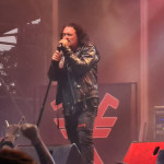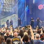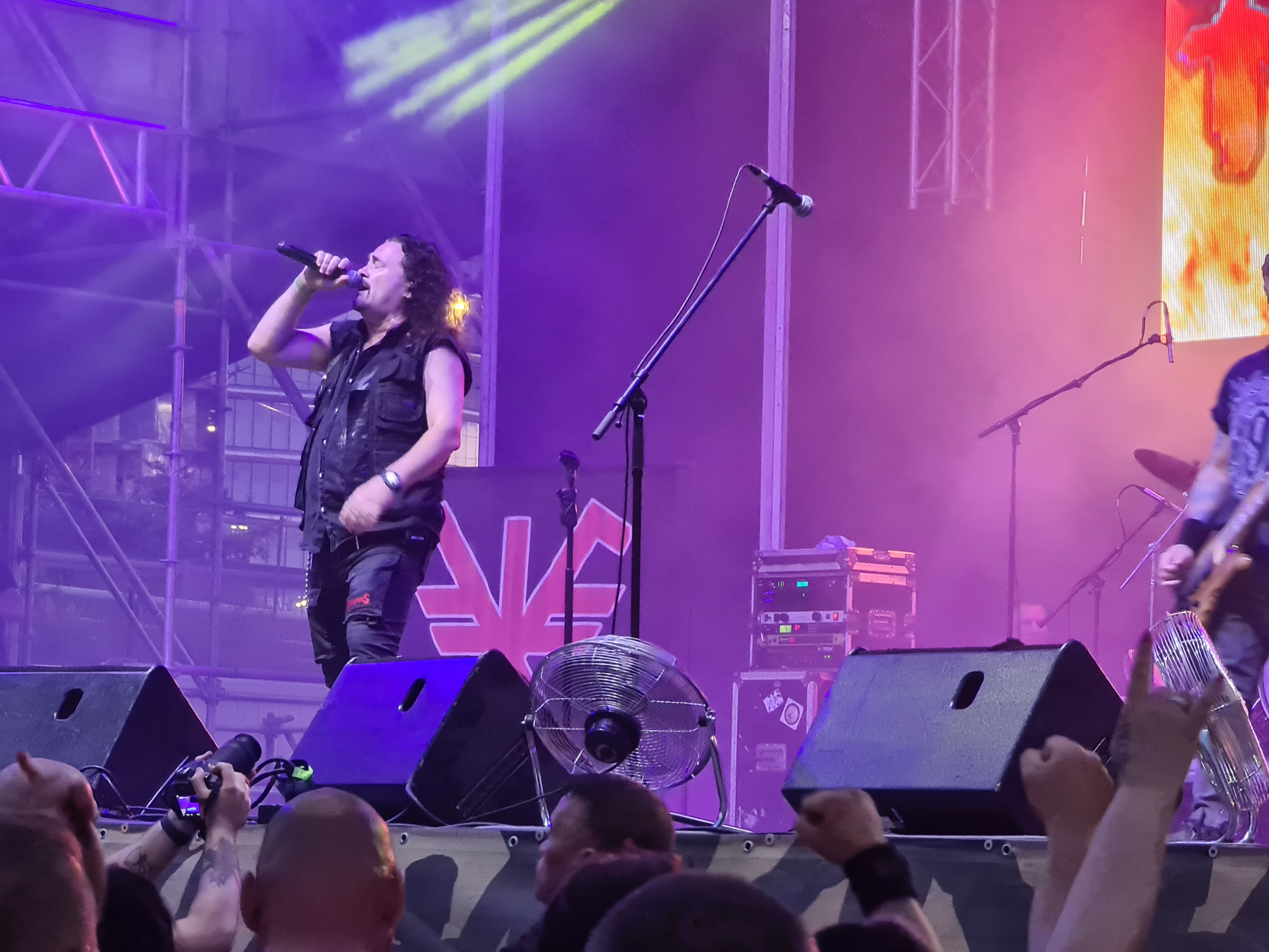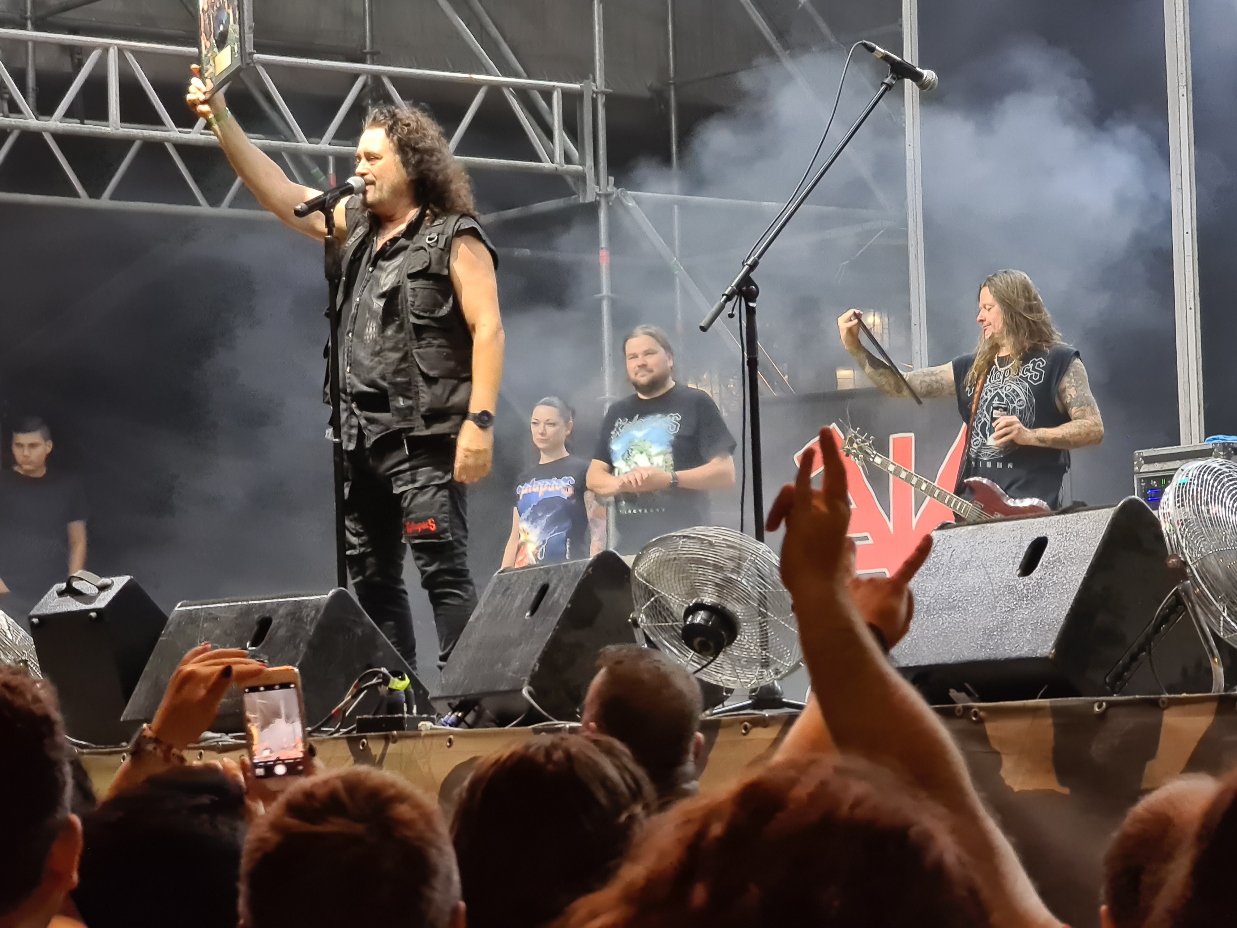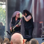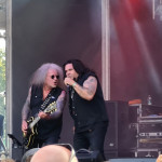 OMEN machten mit dem alten Gassenhauer „Könnyű Szívvel“ gleich mächtig Dampf, und besonders Urgestein László Nagyfi sah man den Spaß an der Sache mehr als deutlich an. Mittlerweile zwar in Würde ergraut, aber noch genauso motiviert wie einst im Mai. Aber auch der neue Sänger Péter Molnár hat sich gut ins Bandgefüge integriert und wird entsprechend wohlwollend begrüßt. Seine angeraute, kraftvolle Stimme passt gut zum rustikalen Old School-Metal OMENs. Ein weiteres Highlight kam bald mit der Hymne „Vámpírváros“. Da begann der Nacken schon merklich zu zucken, und ich wurde gewahr, wie sehr ich das alles vermisst habe. Die erste richtige Überraschung kam in Form von Árpád Koroknai, welcher zwischen 2009 und 2019 als Frontmann bei OMEN tätig war. Gemeinsam mit seinen alten Kollegen schmetterte er „Villámokkal Jönnöd“. Die Interaktionen auf der Bühne machten deutlich, dass es ganz offensichtlich keine Trennung im Streit gewesen war. Noch kultiger wurde es aber im Anschluss, als bei „Fagyott Világ“ auch noch Ur-Sänger József Kalapács mit auf die Bühne kam. Selbiger Song wurde dann unter lautem Beifall von alle drei Sängern zum Besten gegeben. Gänsehaut pur. Den Rest der Show bestritt Péter Molnár souverän im Alleingang. Mit „Hajsza A Tűzzel“ verabschiedeten sich OMEN und machten Platz für die Hauptattraktion des Abends.