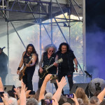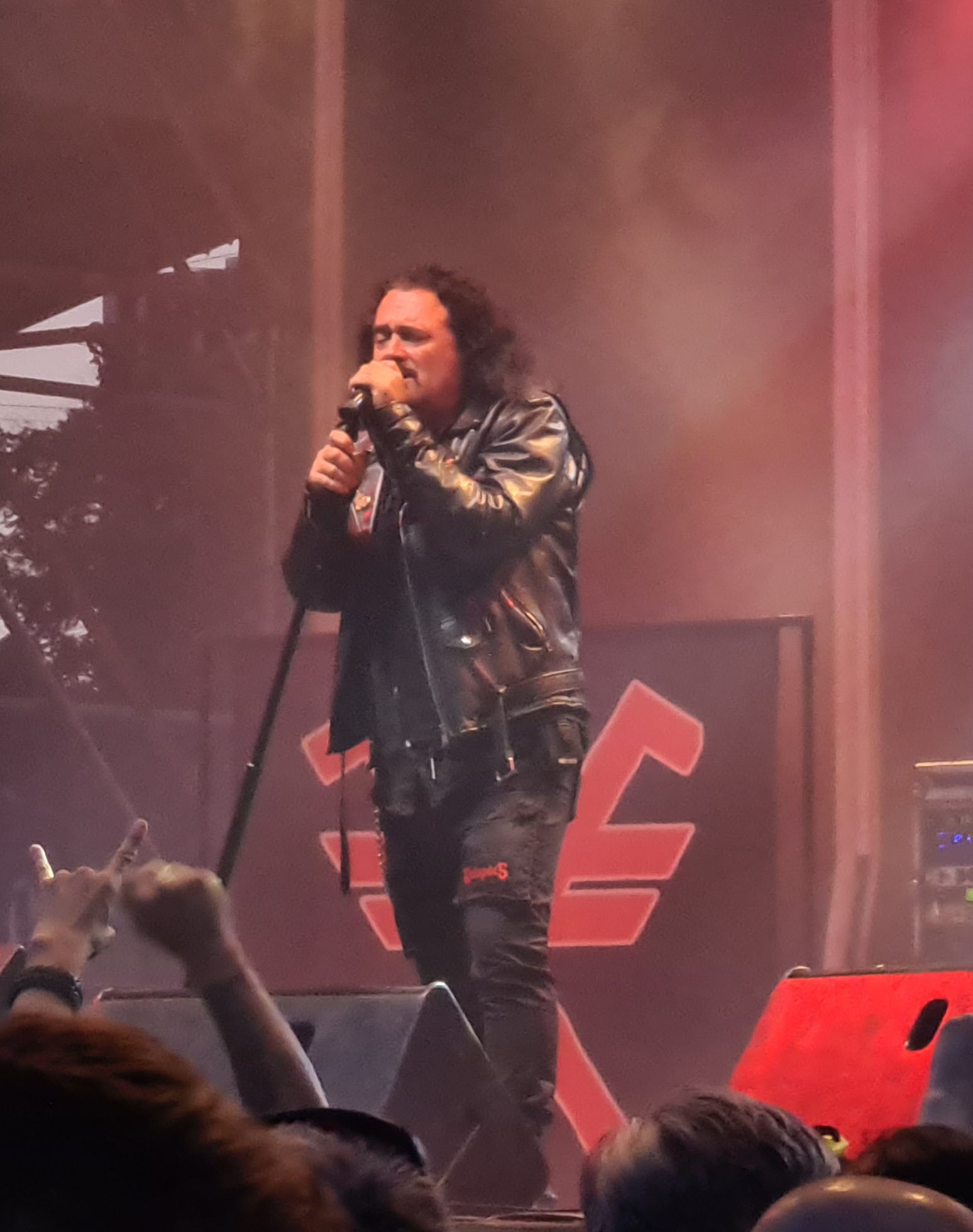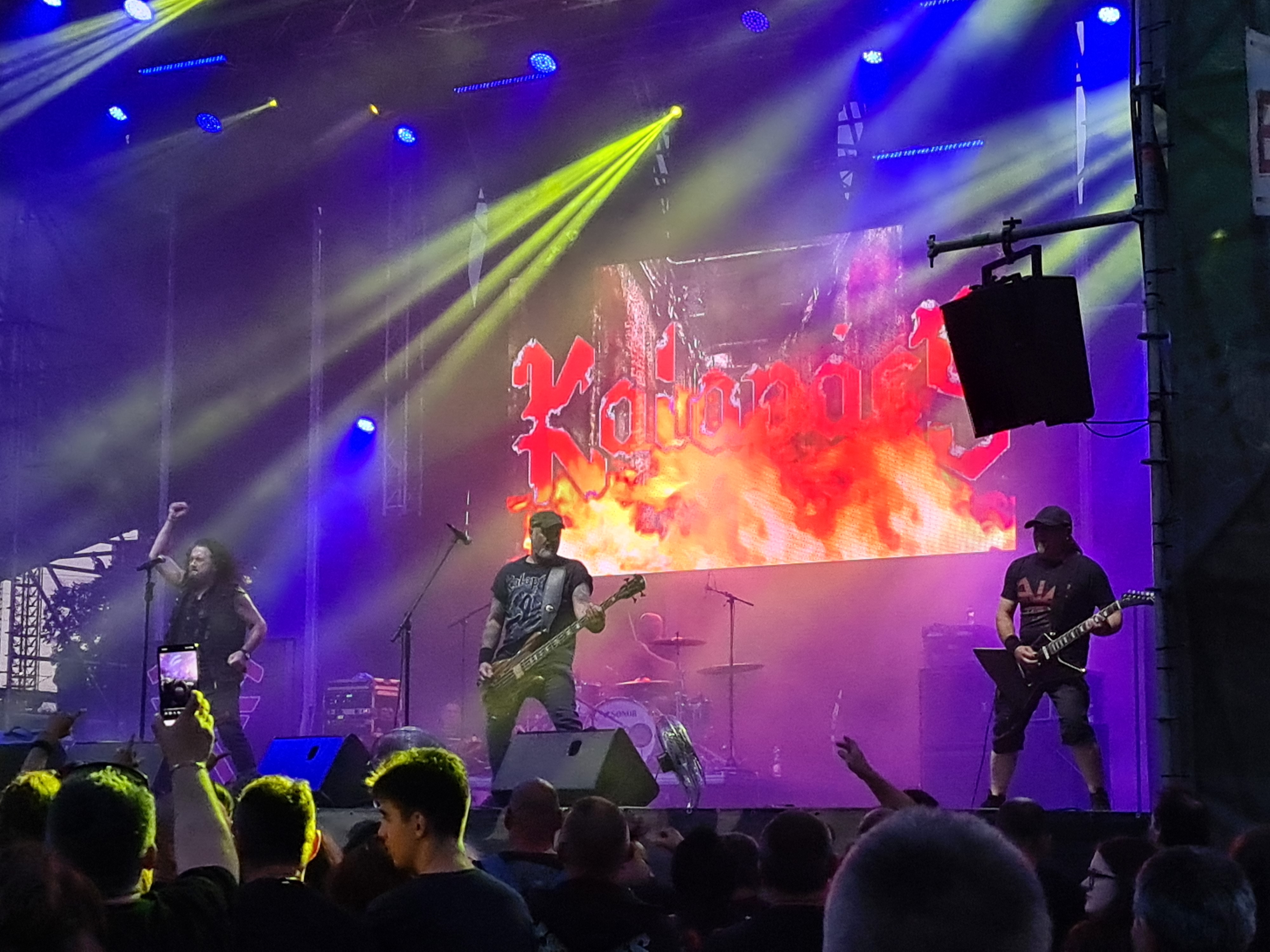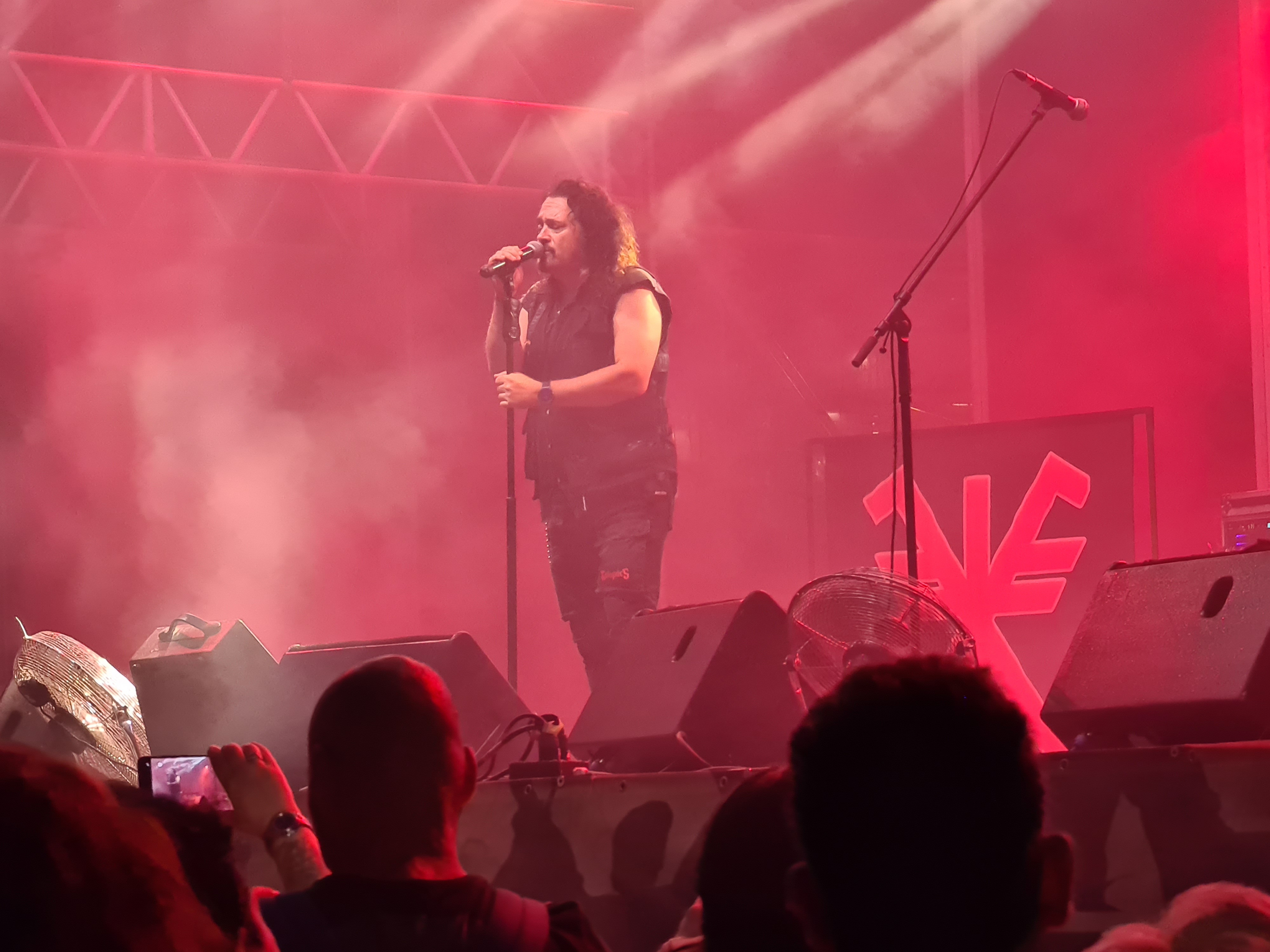 OMEN machten mit dem alten Gassenhauer „Könnyű Szívvel“ gleich mächtig Dampf, und besonders Urgestein László Nagyfi sah man den Spaß an der Sache mehr als deutlich an. Mittlerweile zwar in Würde ergraut, aber noch genauso motiviert wie einst im Mai. Aber auch der neue Sänger Péter Molnár hat sich gut ins Bandgefüge integriert und wird entsprechend wohlwollend begrüßt. Seine angeraute, kraftvolle Stimme passt gut zum rustikalen Old School-Metal OMENs. Ein weiteres Highlight kam bald mit der Hymne „Vámpírváros“. Da begann der Nacken schon merklich zu zucken, und ich wurde gewahr, wie sehr ich das alles vermisst habe. Die erste richtige Überraschung kam in Form von Árpád Koroknai, welcher zwischen 2009 und 2019 als Frontmann bei OMEN tätig war. Gemeinsam mit seinen alten Kollegen schmetterte er „Villámokkal Jönnöd“. Die Interaktionen auf der Bühne machten deutlich, dass es ganz offensichtlich keine Trennung im Streit gewesen war. Noch kultiger wurde es aber im Anschluss, als bei „Fagyott Világ“ auch noch Ur-Sänger József Kalapács mit auf die Bühne kam. Selbiger Song wurde dann unter lautem Beifall von alle drei Sängern zum Besten gegeben. Gänsehaut pur. Den Rest der Show bestritt Péter Molnár souverän im Alleingang. Mit „Hajsza A Tűzzel“ verabschiedeten sich OMEN und machten Platz für die Hauptattraktion des Abends.