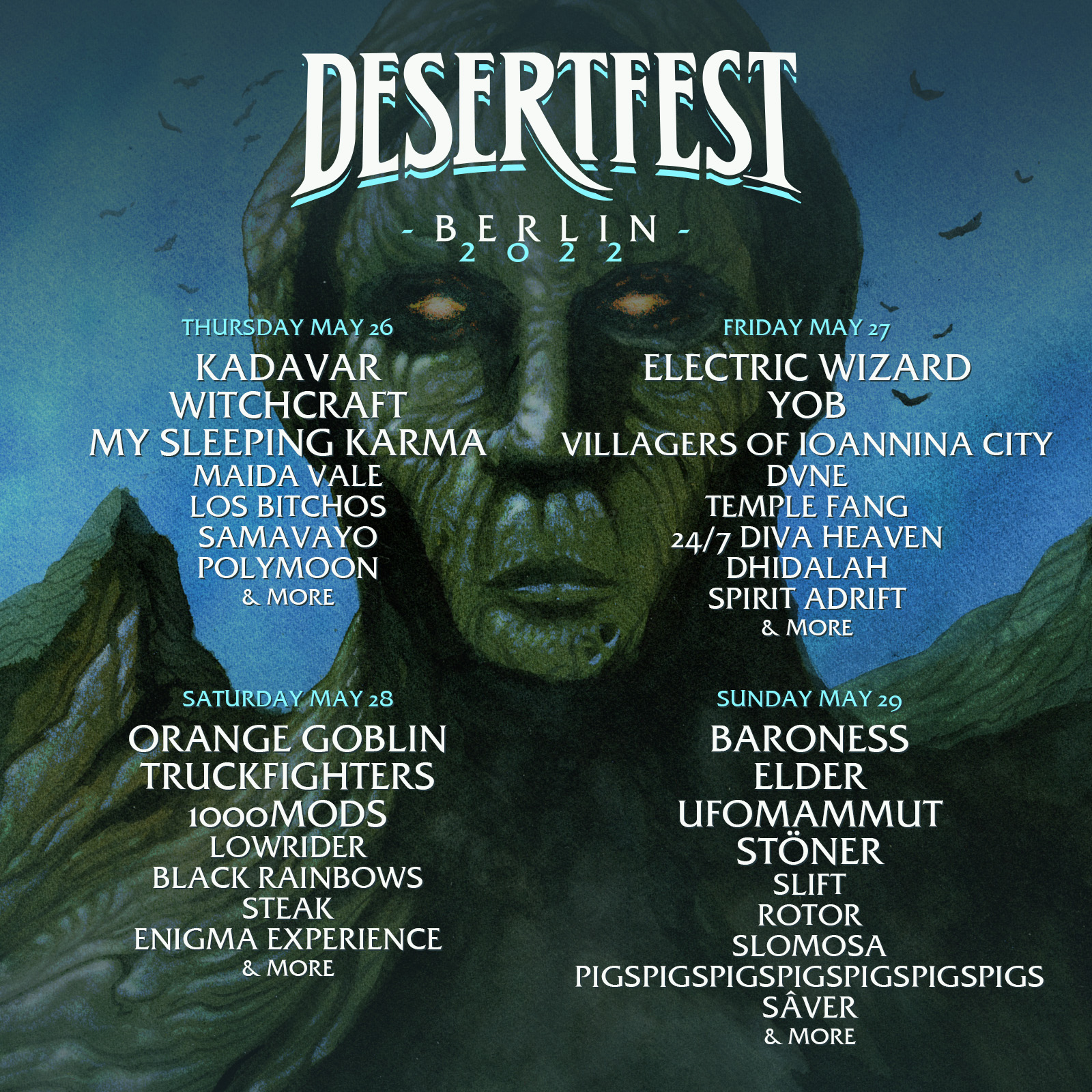 Gute zwei Jahre später sitze ich hier an diesen Zeilen und starre auf das Line-Up. Die Macher vom Desertfest haben seinerzeit versprochen, dass das ausgefallene Desertfest annähernd so wie geplant einfach ins nächste (oder übernächste) Jahr geschoben wird, und so liest es sich fast, als wäre da gar nichts gewesen. Fast nichts, es gibt ein paar Veränderungen, aber die Mischung ist nach wie vor exzellent. Wie immer, wenn irgendwo „Desertfest“ draufsteht. Es werden sowohl die härteren als auch fuzzigeren Bedürfnisse versorgt.