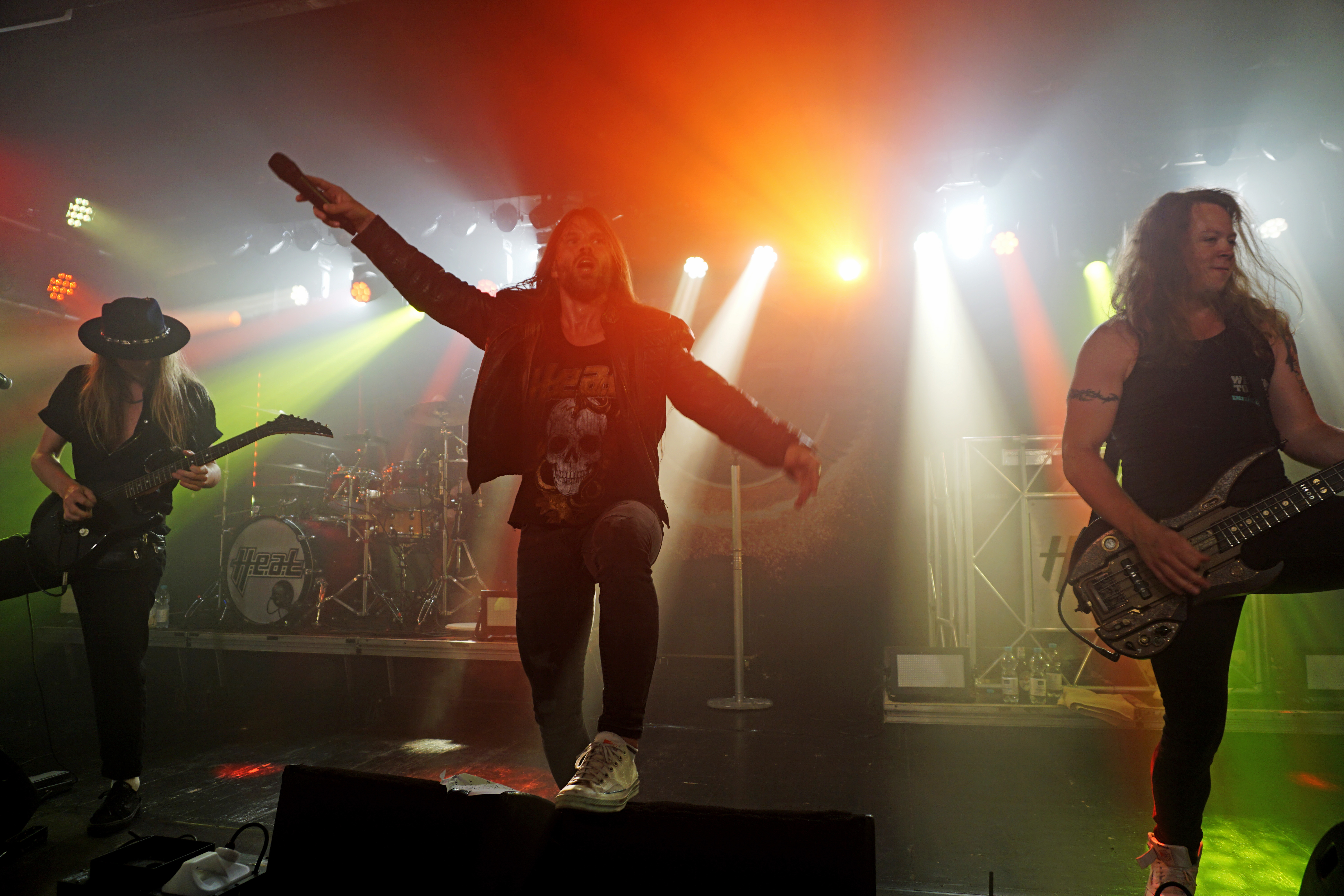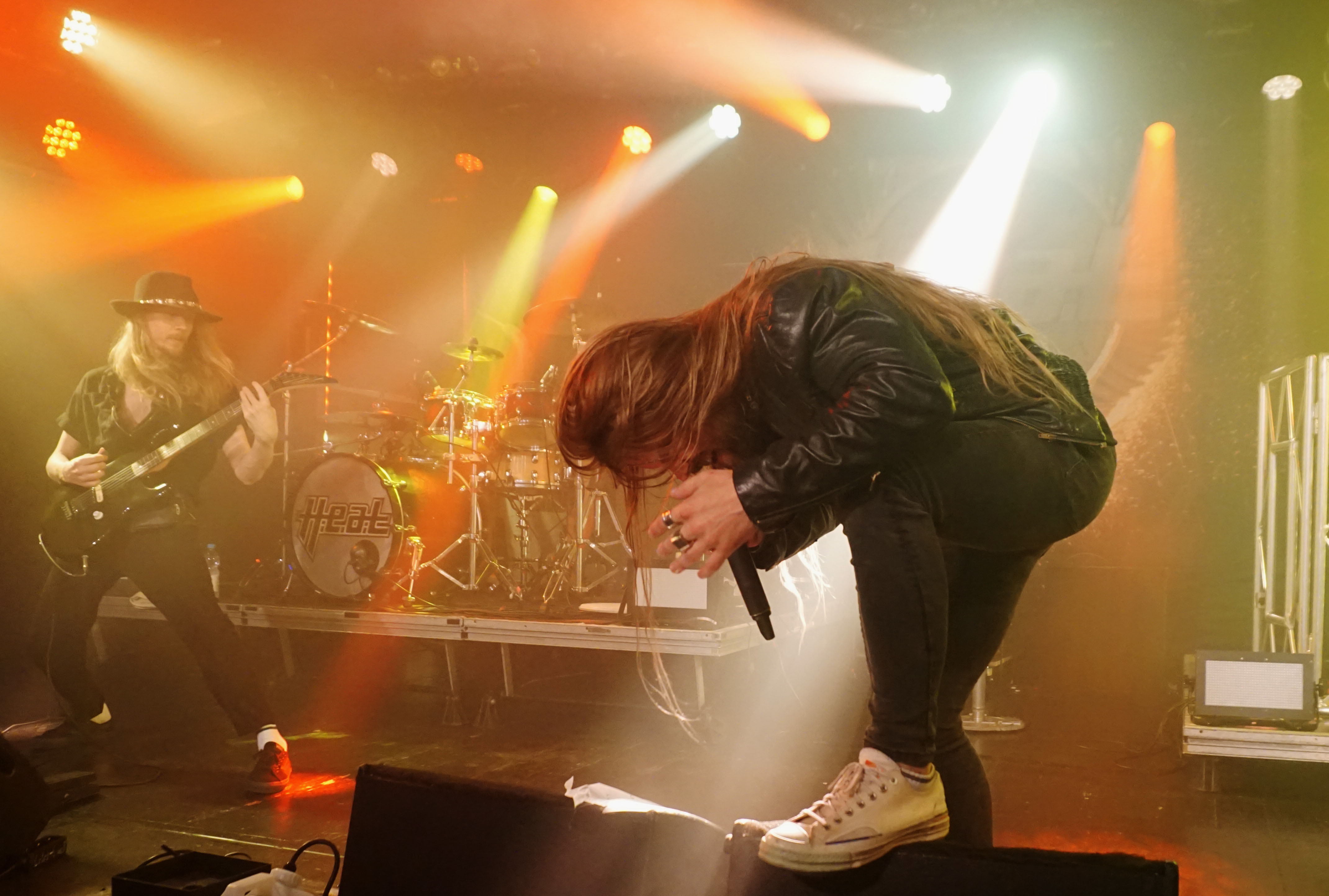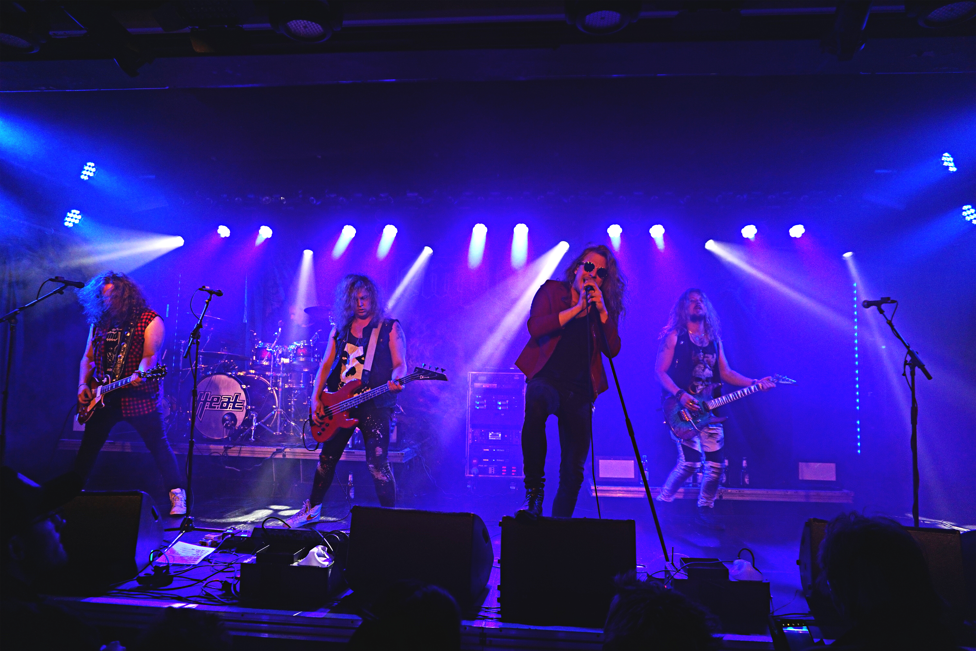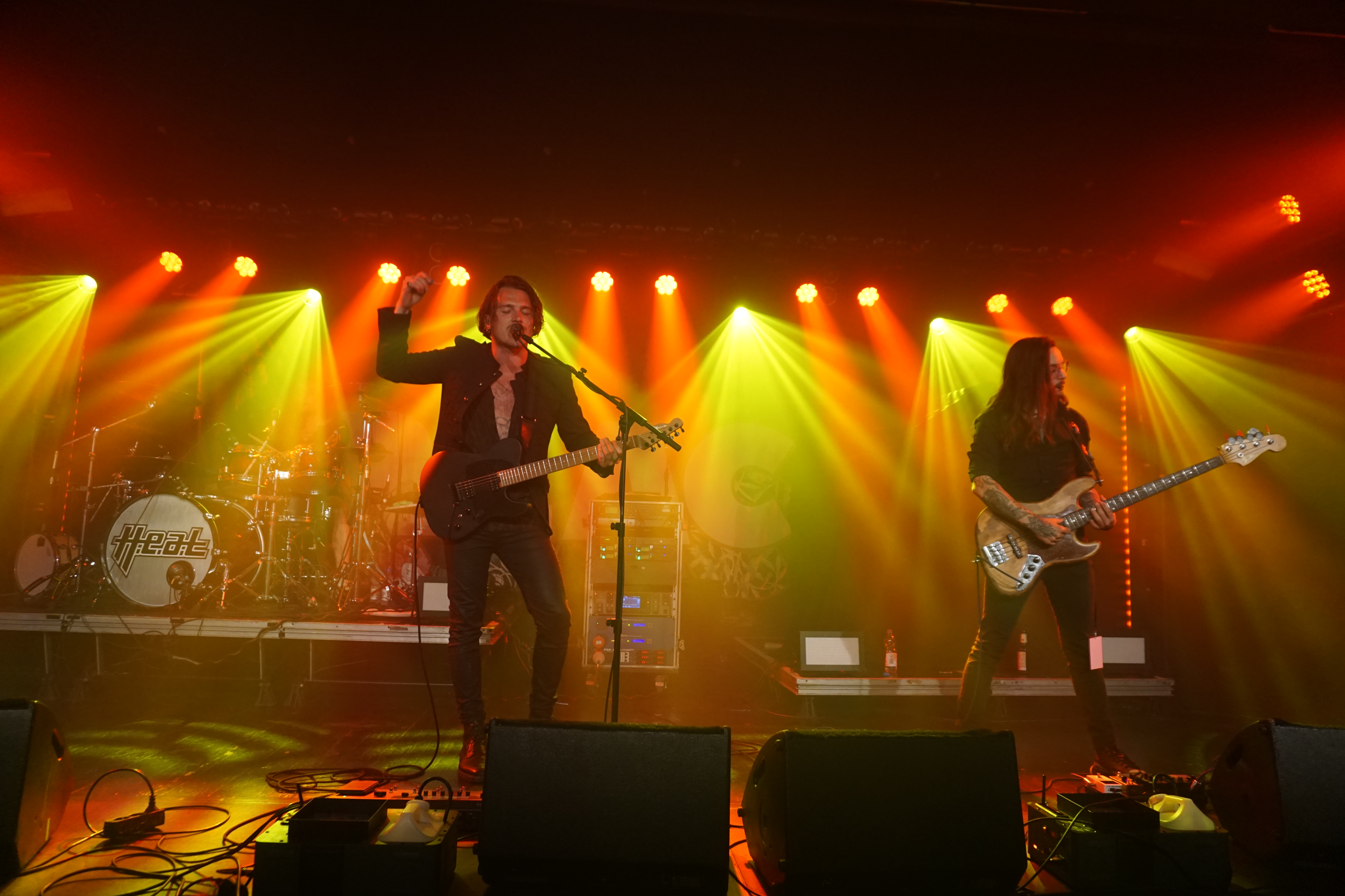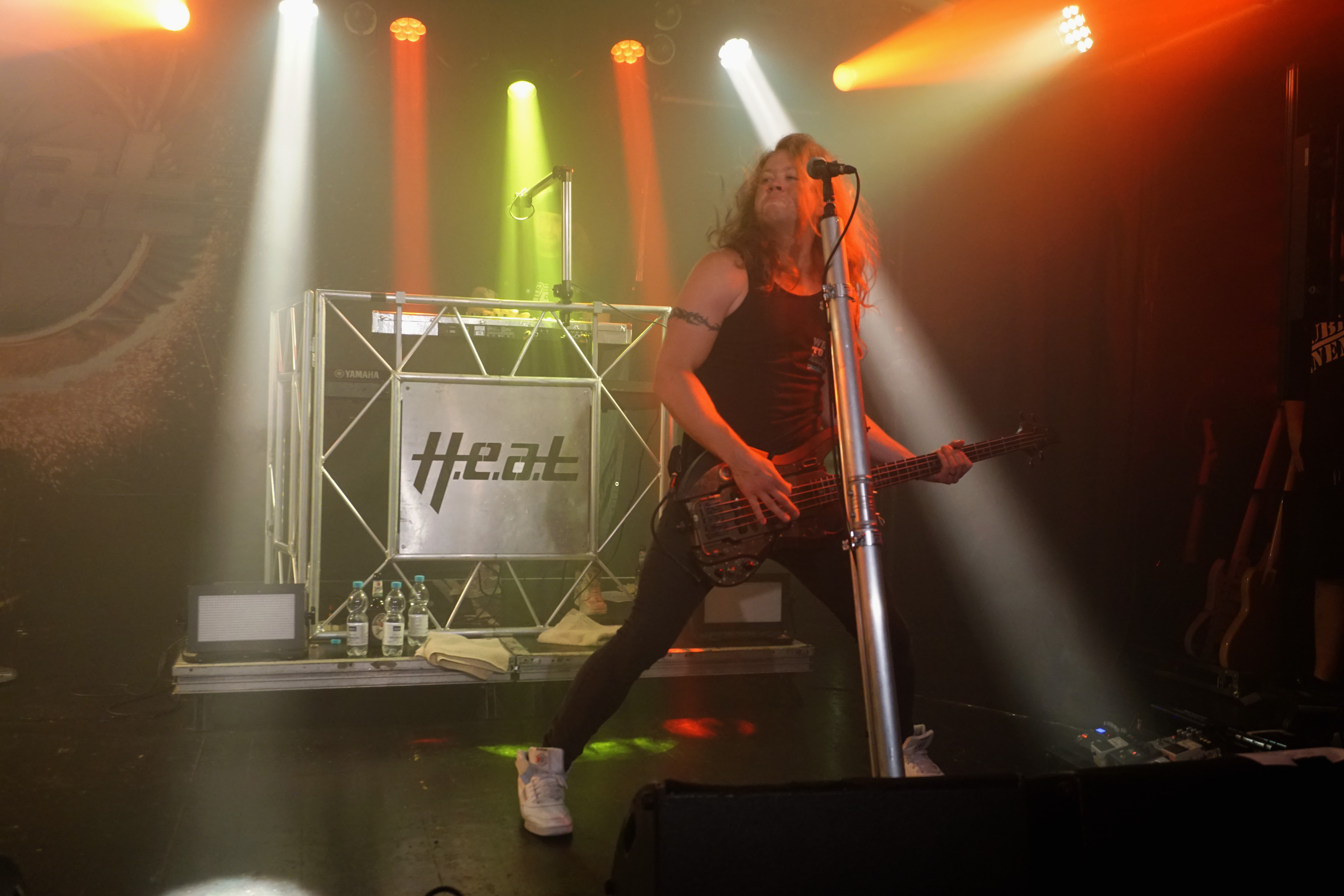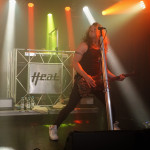 Pünktlich um 21 Uhr kündigt der Klassiker von GLENN FREY “The Heat Is On“ (vom Band) den Headliner des Abends an. Mit “One By One“ startet das Set und der neue/alte Mann am Mikro geht direkt ab, wie die berühmte Katze des Herrn Schmitt. Das Licht ist schon wieder blau und der Kerl bleibt keine Sekunde stehen, wie soll man da vernünftig Bilder machen, schießt es mir durch den Kopf, bemerke aber, dass es mir selbst schwer fällt ruhig zu stehen, so ansteckend ist die Dynamik dieser Truppe. Ohne Luft zu holen legen sie direkt “Rock Your Body“ und “Dangerous Ground“, allesamt vom aktuellen Output, hinterher. Ich kenne H.e.a.t seit den Anfangstagen und kann mich des Eindrucks nicht erwehren, dass der gute Kenny ein wenig an seiner Stimme gearbeitet hat. Erstaunlich gut findet er sich ausgerechnet in den oberen Tonlagen zurecht und bringt die Nummern, die während seiner Abwesenheit entstanden, so als seien sie für ihn geschrieben. Wenig überraschend, gibt es an diesem Abend natürlich aus der ersten Scheiben reichlich Material, das dann jeweils im Doppelpack dargereicht wird. Zu “Straight For Your Heart“ gibt’s “Late Night Lady“ und “Cry“ wird mit “1000 Miles“ kombiniert. Die Interaktion mit dem Auditorium wirkt von beiden Seiten höchst euphorisch, was die oben erwähnte Lust auf solche Events untermauert. Allen Beteiligten ist das Grinsen nicht mehr aus dem Kopf zu nehmen.
