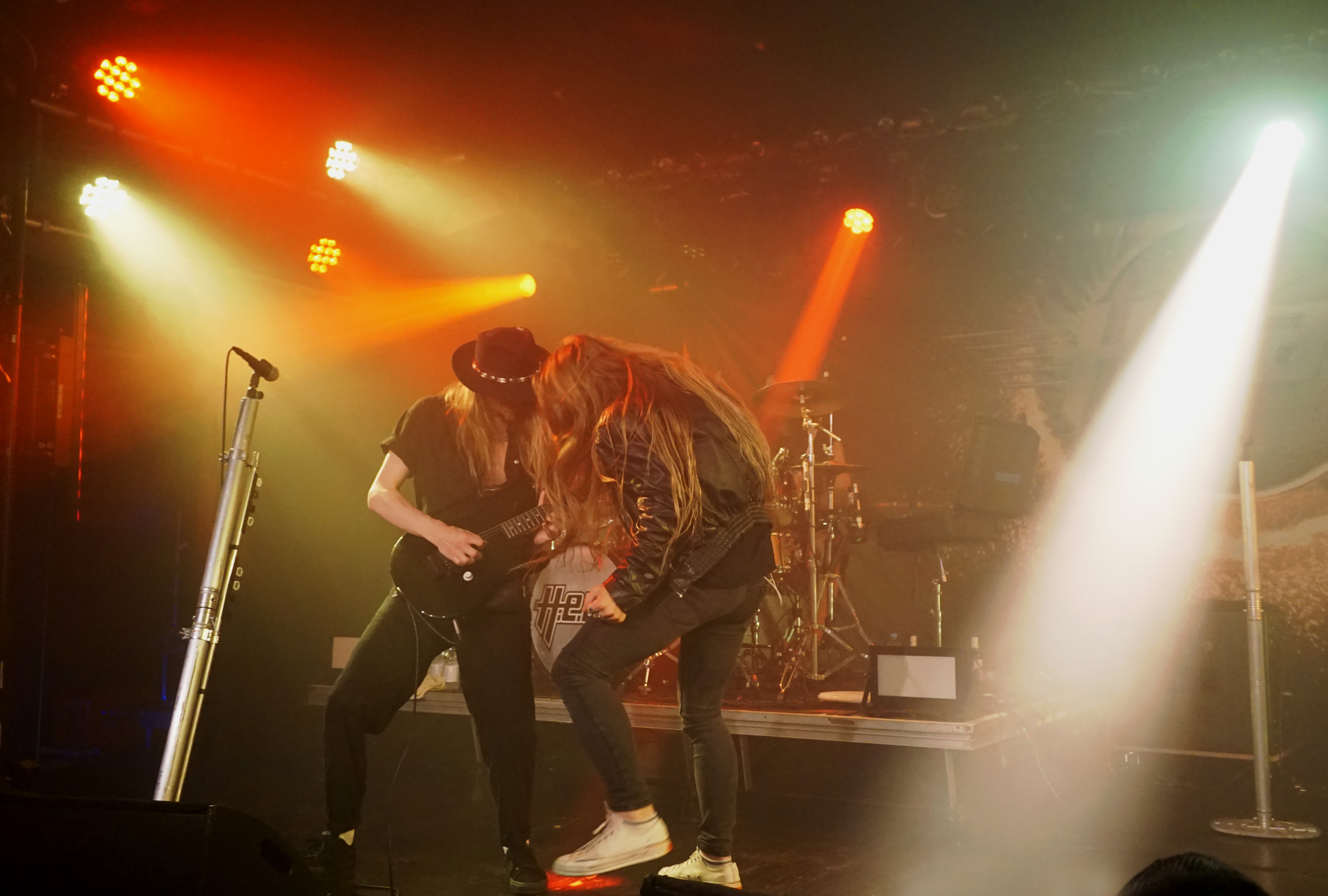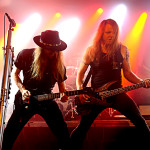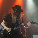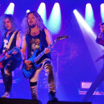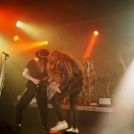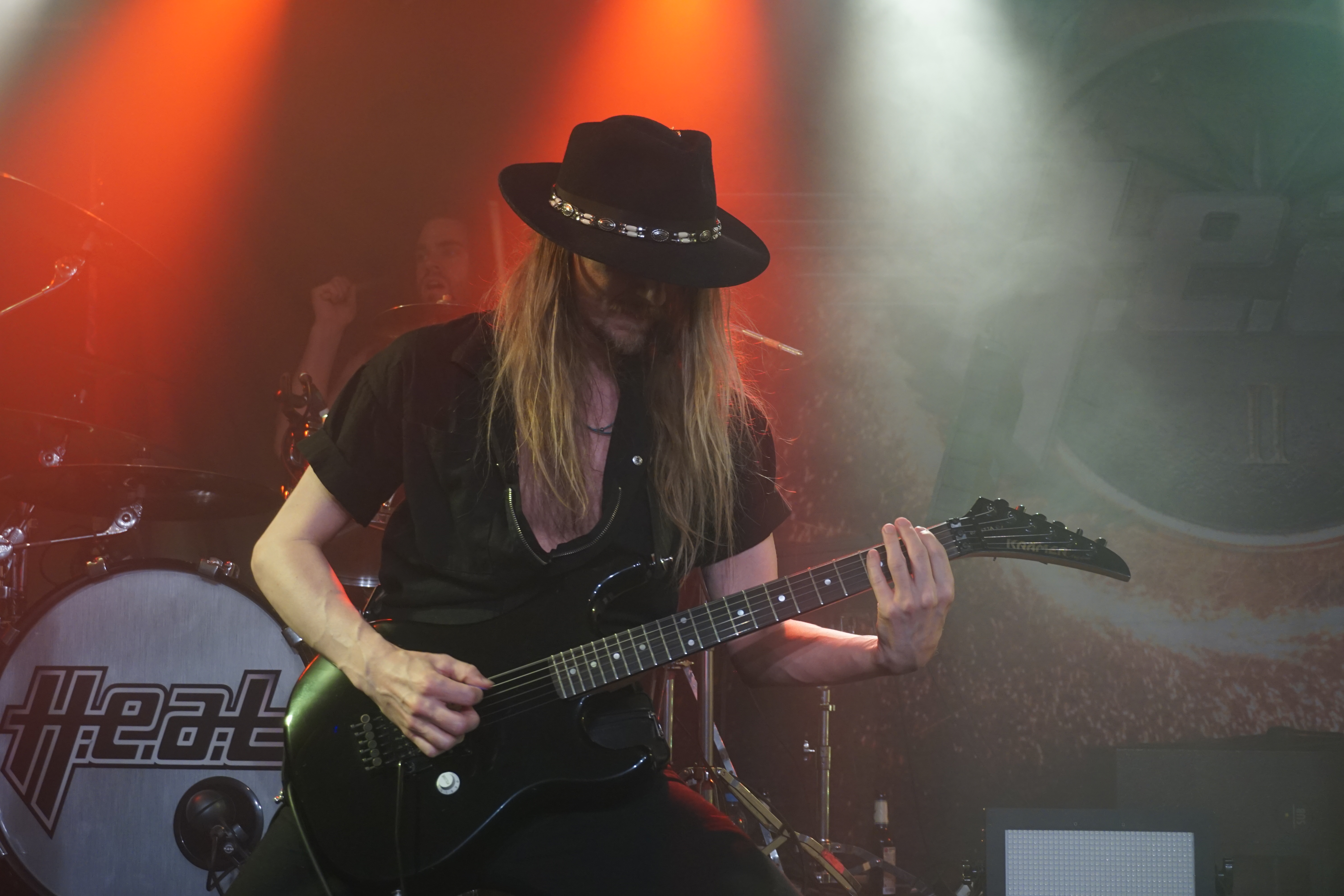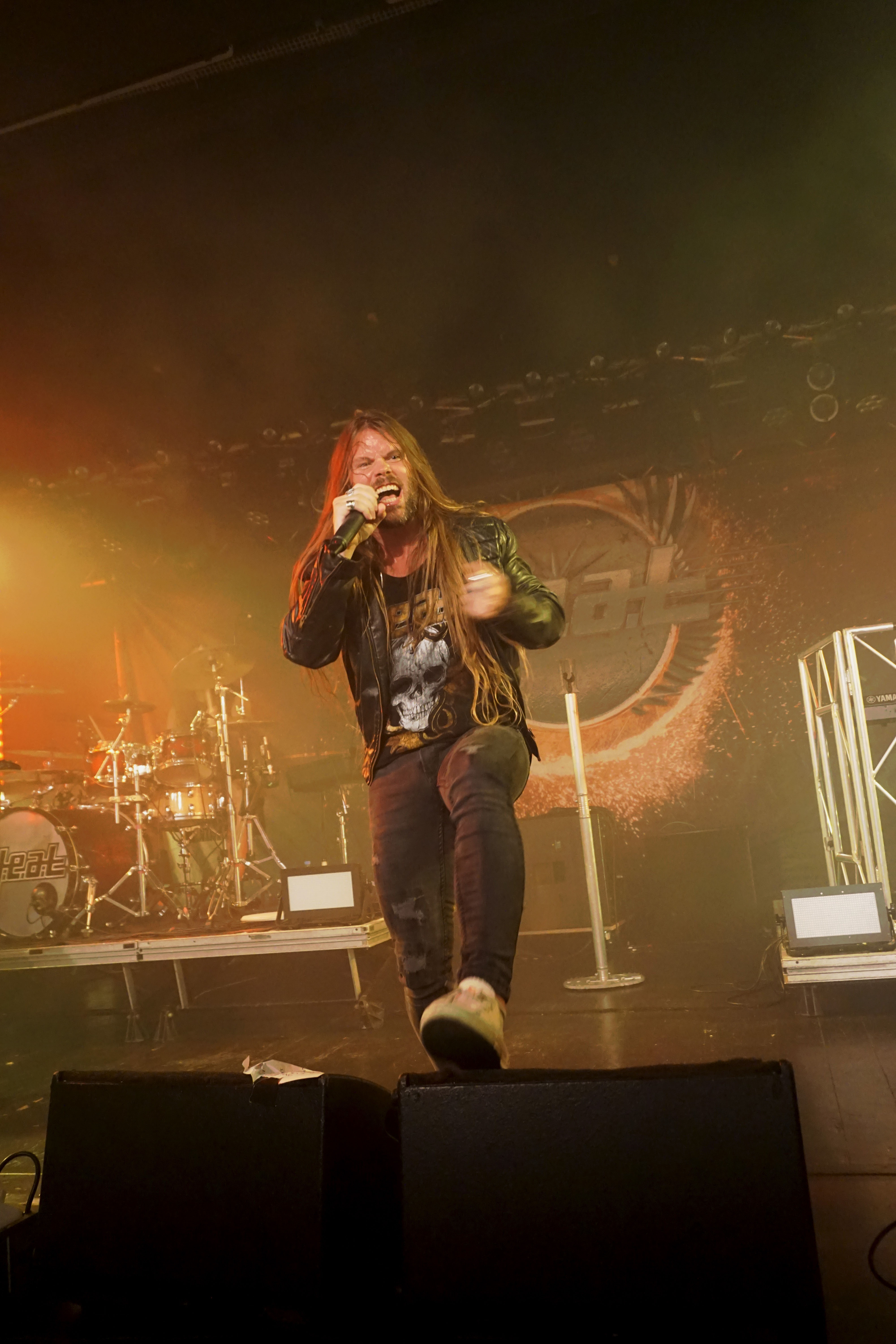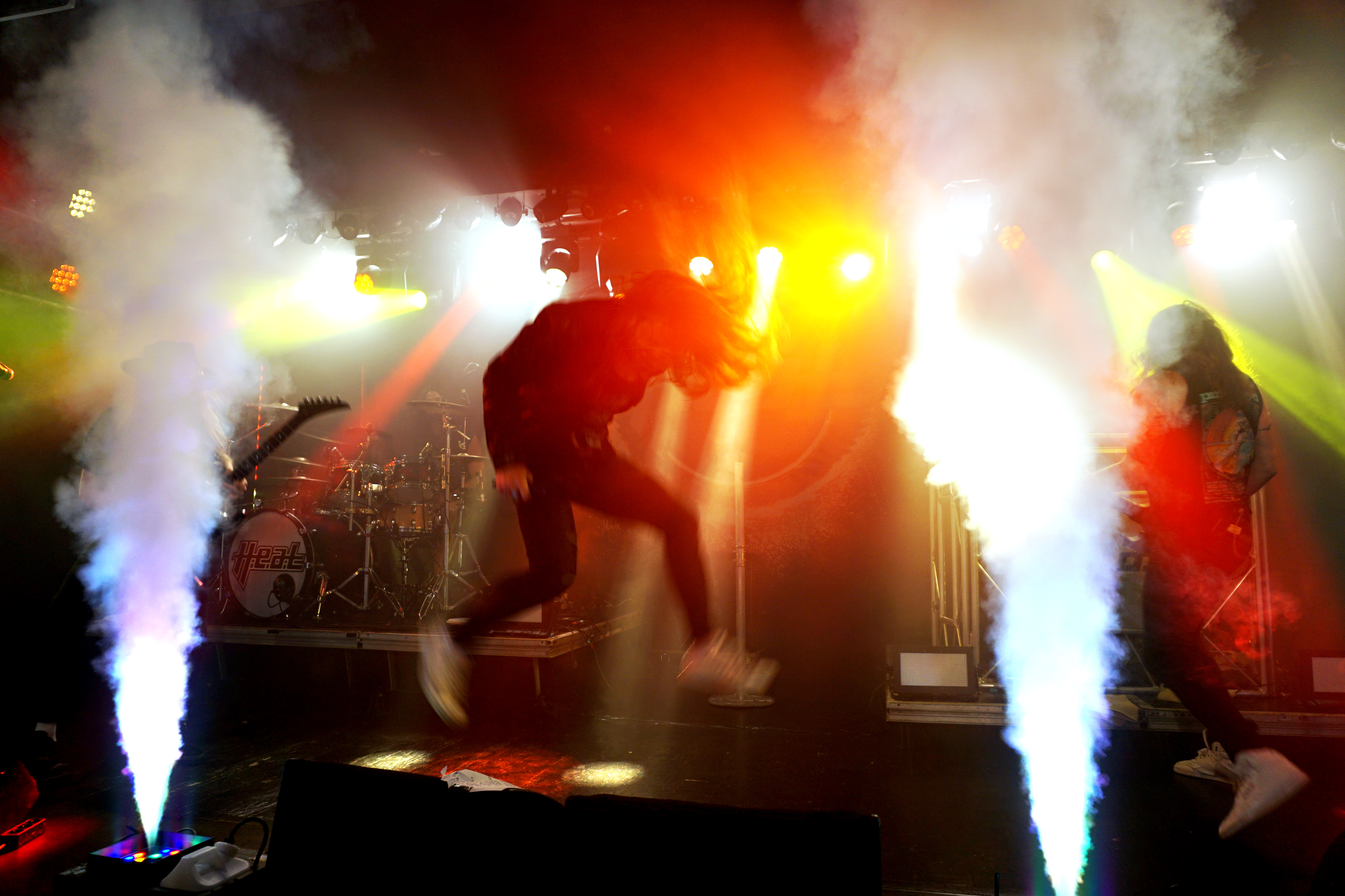 Pünktlich um 21 Uhr kündigt der Klassiker von GLENN FREY “The Heat Is On“ (vom Band) den Headliner des Abends an. Mit “One By One“ startet das Set und der neue/alte Mann am Mikro geht direkt ab, wie die berühmte Katze des Herrn Schmitt. Das Licht ist schon wieder blau und der Kerl bleibt keine Sekunde stehen, wie soll man da vernünftig Bilder machen, schießt es mir durch den Kopf, bemerke aber, dass es mir selbst schwer fällt ruhig zu stehen, so ansteckend ist die Dynamik dieser Truppe. Ohne Luft zu holen legen sie direkt “Rock Your Body“ und “Dangerous Ground“, allesamt vom aktuellen Output, hinterher. Ich kenne H.e.a.t seit den Anfangstagen und kann mich des Eindrucks nicht erwehren, dass der gute Kenny ein wenig an seiner Stimme gearbeitet hat. Erstaunlich gut findet er sich ausgerechnet in den oberen Tonlagen zurecht und bringt die Nummern, die während seiner Abwesenheit entstanden, so als seien sie für ihn geschrieben. Wenig überraschend, gibt es an diesem Abend natürlich aus der ersten Scheiben reichlich Material, das dann jeweils im Doppelpack dargereicht wird. Zu “Straight For Your Heart“ gibt’s “Late Night Lady“ und “Cry“ wird mit “1000 Miles“ kombiniert. Die Interaktion mit dem Auditorium wirkt von beiden Seiten höchst euphorisch, was die oben erwähnte Lust auf solche Events untermauert. Allen Beteiligten ist das Grinsen nicht mehr aus dem Kopf zu nehmen.