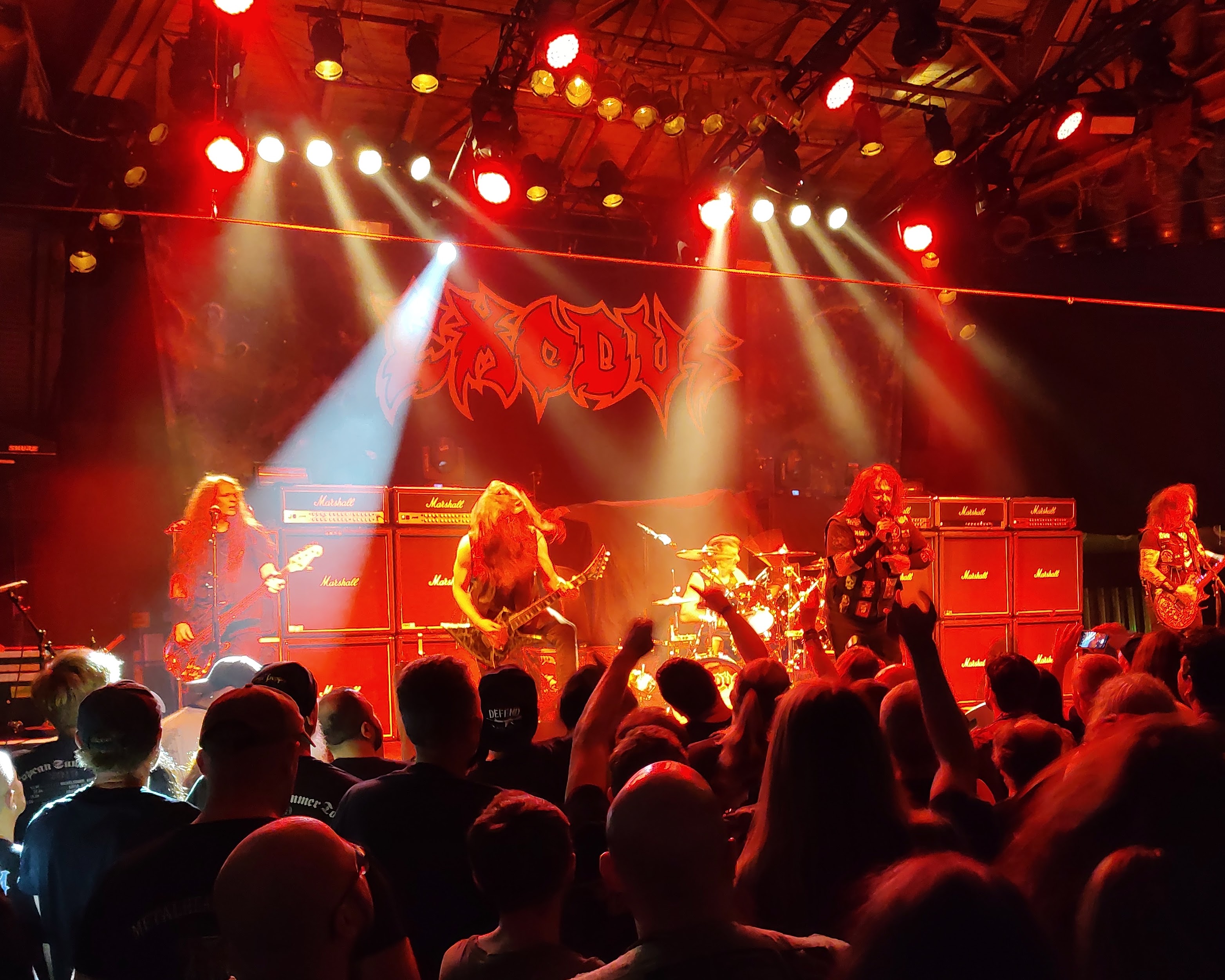 Weiter ging es mit der Thrash-Maschine schlechthin. EXODUS stiegen ebenfalls mit neuen Songs ein. Man frage den Rezensenten bitte nicht nach Titeln, habe "Persona Non Grata" einmal gehört und dann abgehakt. Live ist die Band jedoch eine Macht. Mit Gitarrist Brandon Ellis (THE BLACK DAHLIA MURDER) hat man dazu noch einen absoluten Glücksgriff getan. Der Junge ist nicht nur technisch brillant, er hat auch eine coole Bühnenpräsenz und zeigte Geschmack mit seinem SAVATAGE-Shirt. So richtig steil ging die Menge dann selbstverständlich bei den alten Granaten wie "Strike Of The Beast", "Bonded By Blood" oder "The Toxic Waltz". Mosh Pit, Crowdsurfing, volles Programm. Erwähnenswert ist die fehlerlose Leistung von Tom Hunting an den Drums, der seine schwere Erkrankung glücklicherweise wohl vollständig überwunden hat. Und dann ist da noch Zetro: für mich schon immer einer der besten Frontleute im Thrash Metal, mutiert er irgendwie immer mehr zum Ozzy dieser Szene. Super sympathisch, mit kleinem Bewegungsradius und "wir-sind-alle-Familie"-Ansagen - wobei er stimmlich absolut auf der Höhe ist.