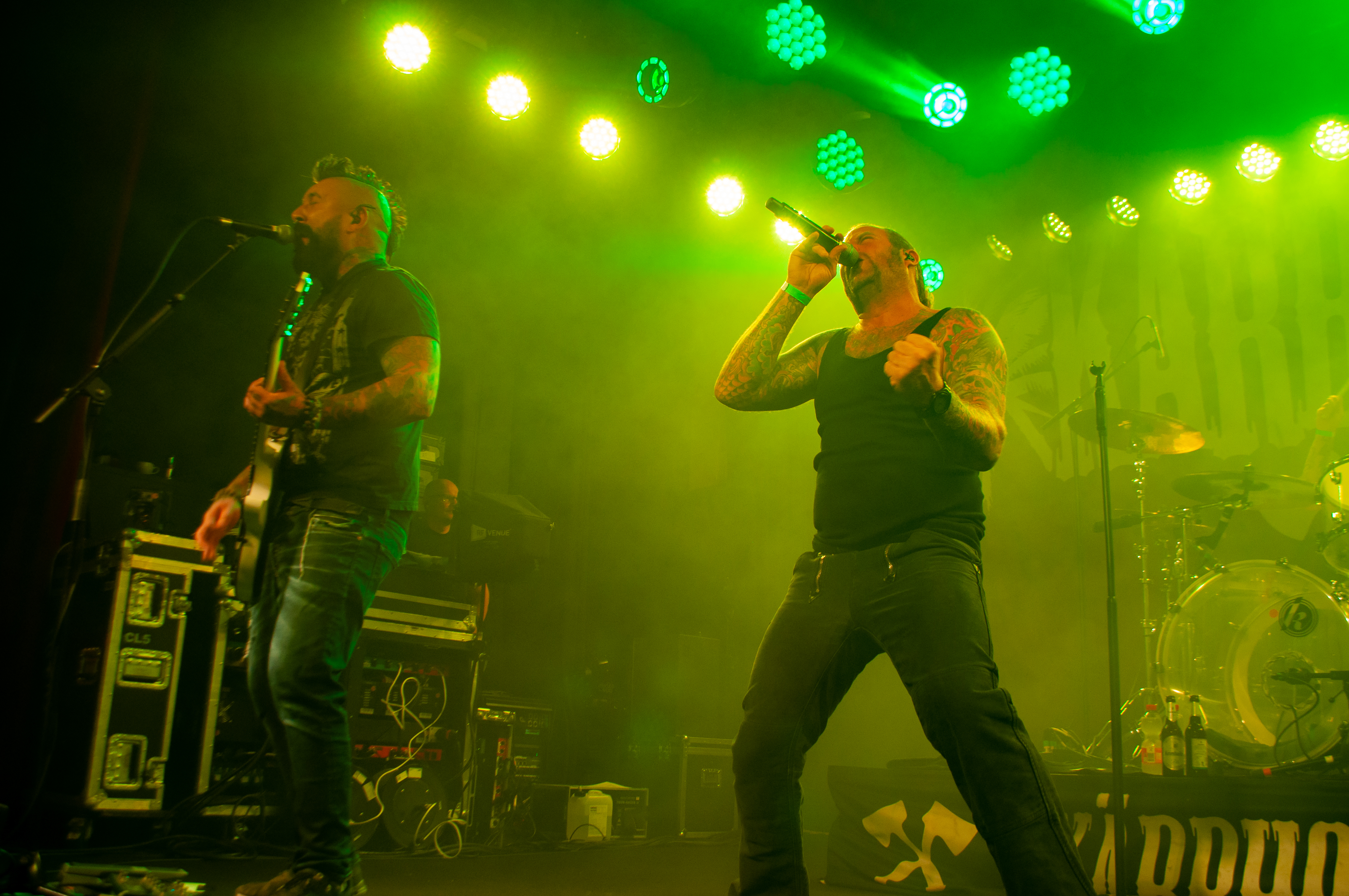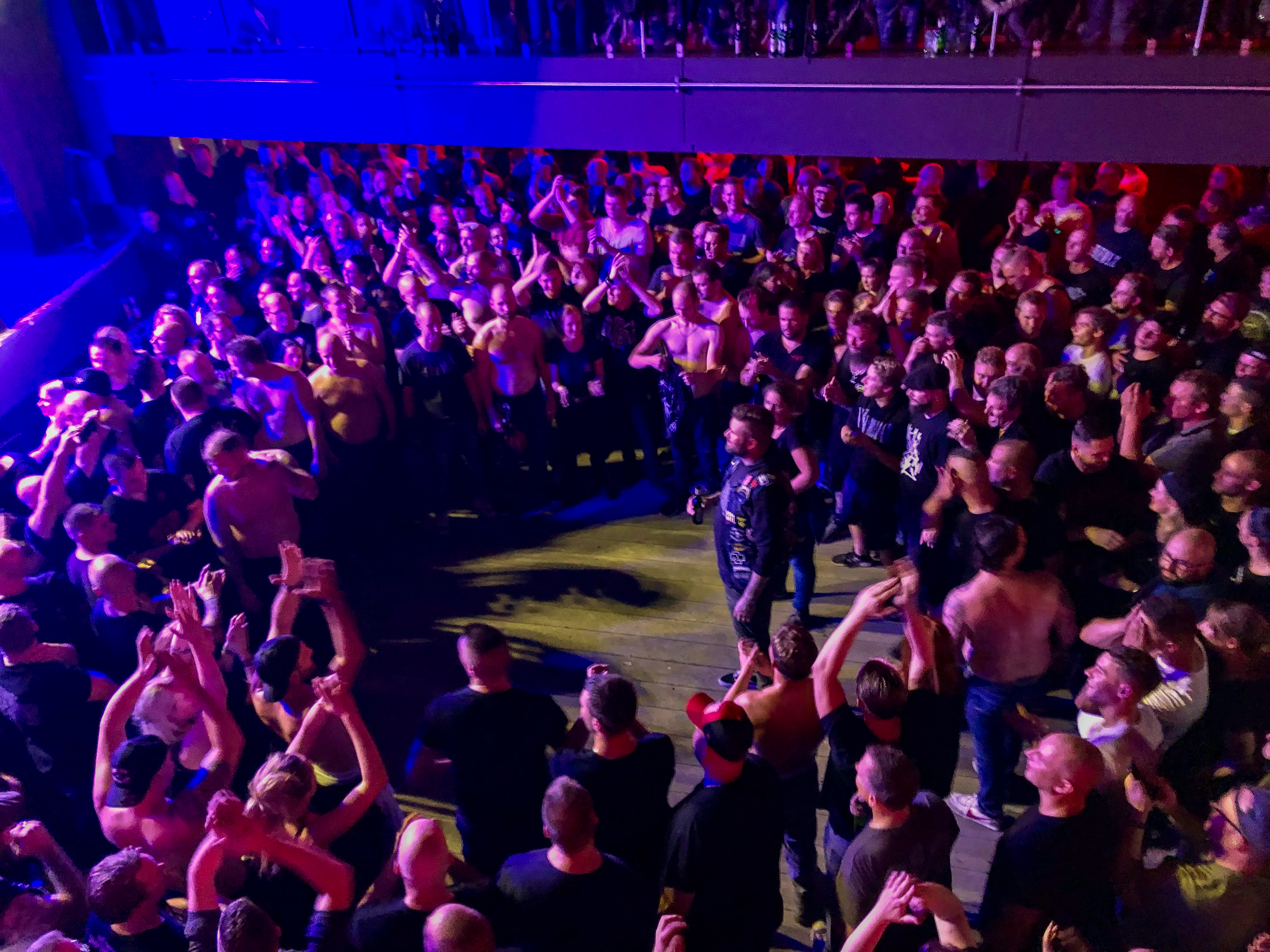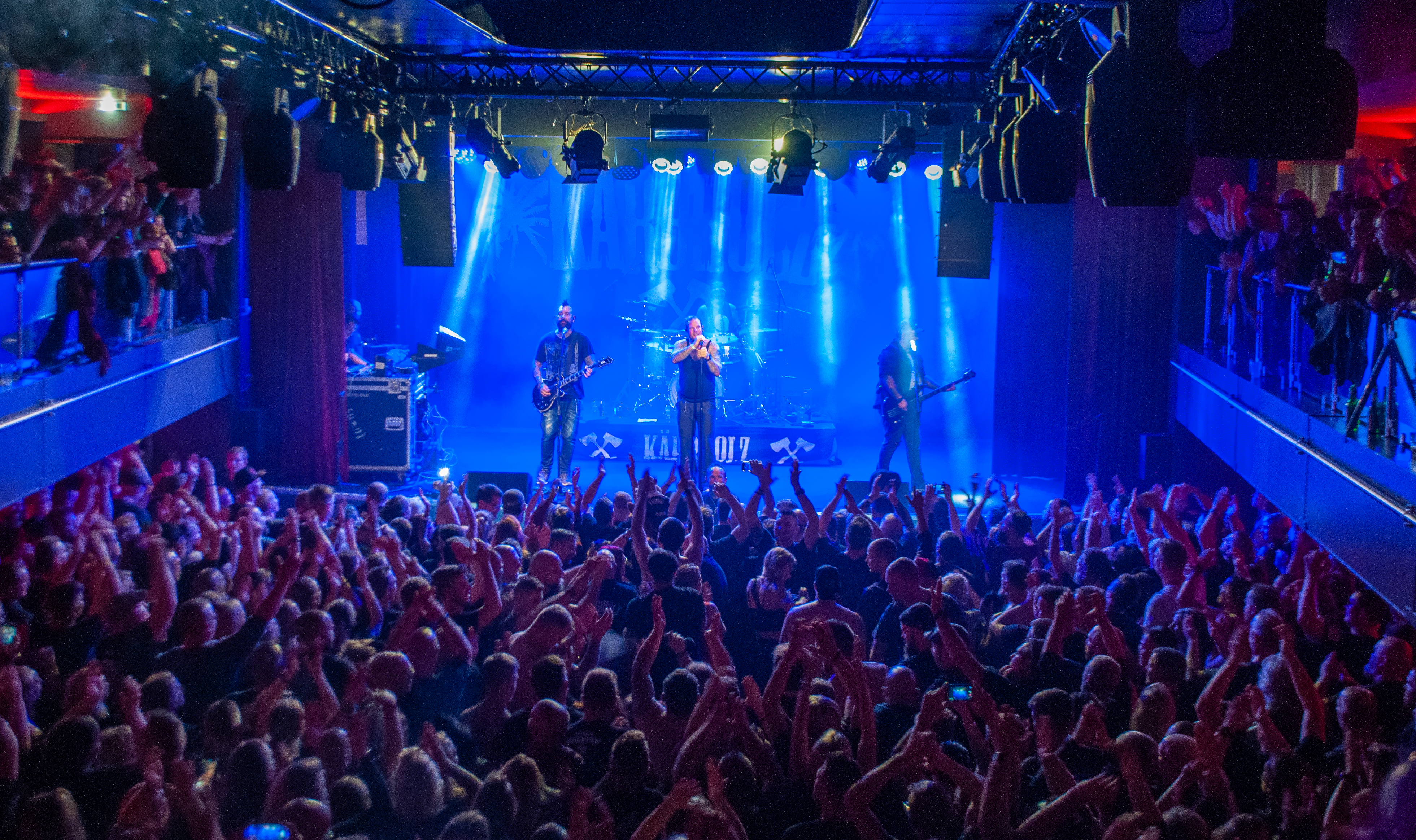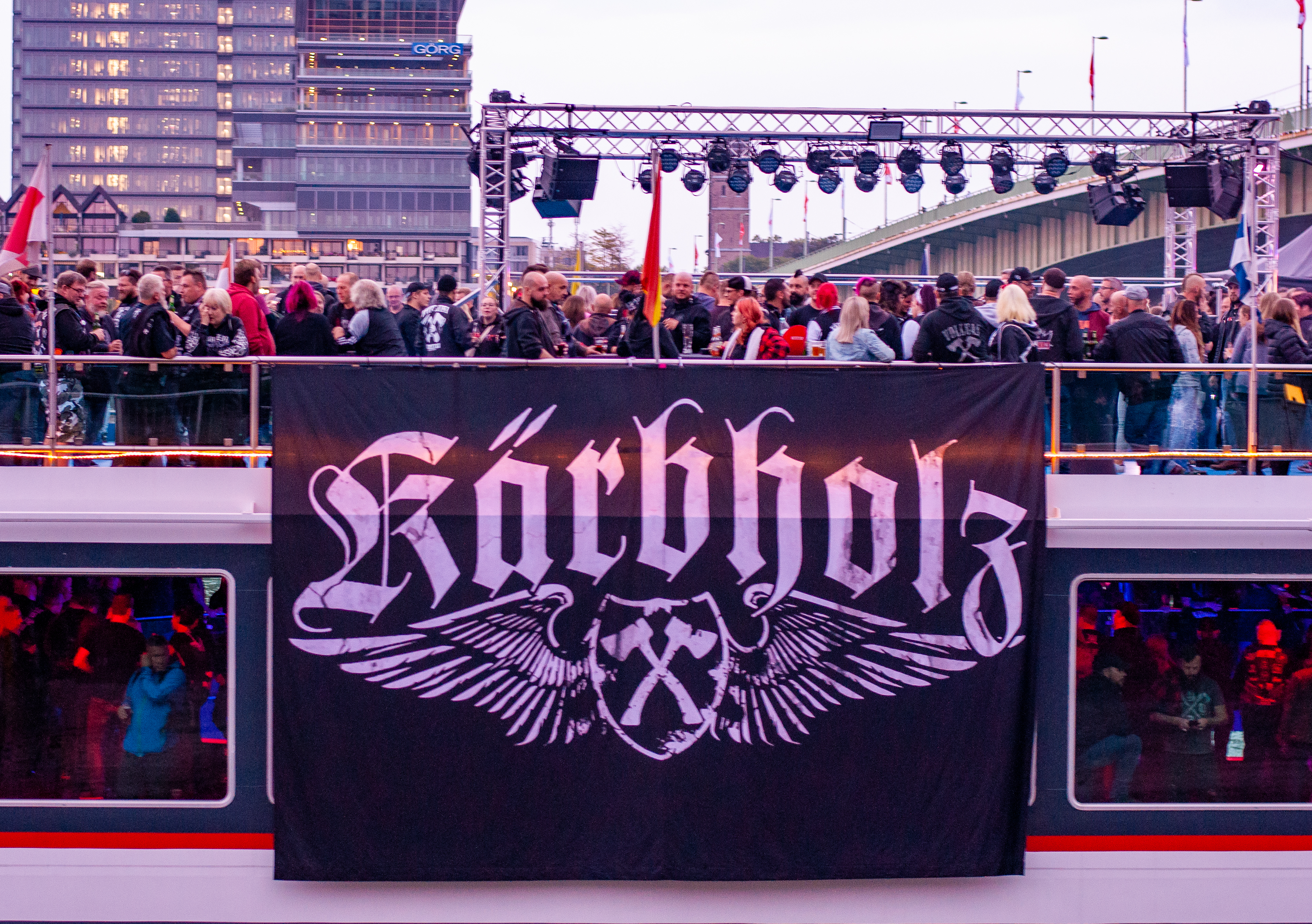 Ich erreiche die Kölner Altstadt, laufe über Kopfsteinpflaster die kleinen Gassen hinunter, vorbei an den Steilgiebelhäusern zum Rhein, und erblicke zwei Ausflugsschiffe. Kurz erschrecke ich mich ob des Klientels in feschen Lederhosen, welches „Lalala Layla“ singt. Zum Glück gehen die Jungs zum Nachbar-Schiff, auf dem ein Oktoberfest stattfindet. Gleich nebenan ist weitaus mehr los, denn hier heißt es heute Abend „Volldampf Rock’n’Roll“. Überall Menschen mit gekreuzten Äxten auf den Shirts; auf Deck tummelt sich die treue KÄRBHOLZ-Anhängerschaft. Es wird gesoffen und gegrölt. Ich kenne die Band eher flüchtig, was erwartet mich heute Abend? Eine coole Rockshow oder eher beliebiger Plattitüden-Rock? Für mich persönlich liegt die Wahrheit dazwischen: Ein gutes Rockkonzert bieten KÄRBHOLZ alle Male; die Mucke ist mir teilweise zu pathetisch und kreist um übliche Themen (Freundschaft und so) gespickt mit Durchhalteparolen und romantischer Kameradschaftlichkeit. Das ist natürlich Geschmackssache und muss an dieser Stelle gar nicht vertieft werden, denn das Quartett aus Ruppichteroth hat heute Abend richtig Bock die Sau rauszulassen. Nachdem der Kahn pünktlich um 20 Uhr in See sticht und der Kapitän sein nautisches Horn ertönen lässt, wird der Konzertsaal im unteren Teil des Schiffes geöffnet und allseits ist Vorfreude zu vernehmen. Im Jahr 2021 wurde die Trinkfreudigkeit der Gäste unterschätzt, offenbar war man eher Piccolo-nippende Andrea Berg-Fans gewöhnt. So war schon vor Konzert-Beginn der kölsche Gerstensaft ausverkauft. Dieses Jahr wurde in weiser Voraussicht großzügig kalkuliert.