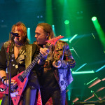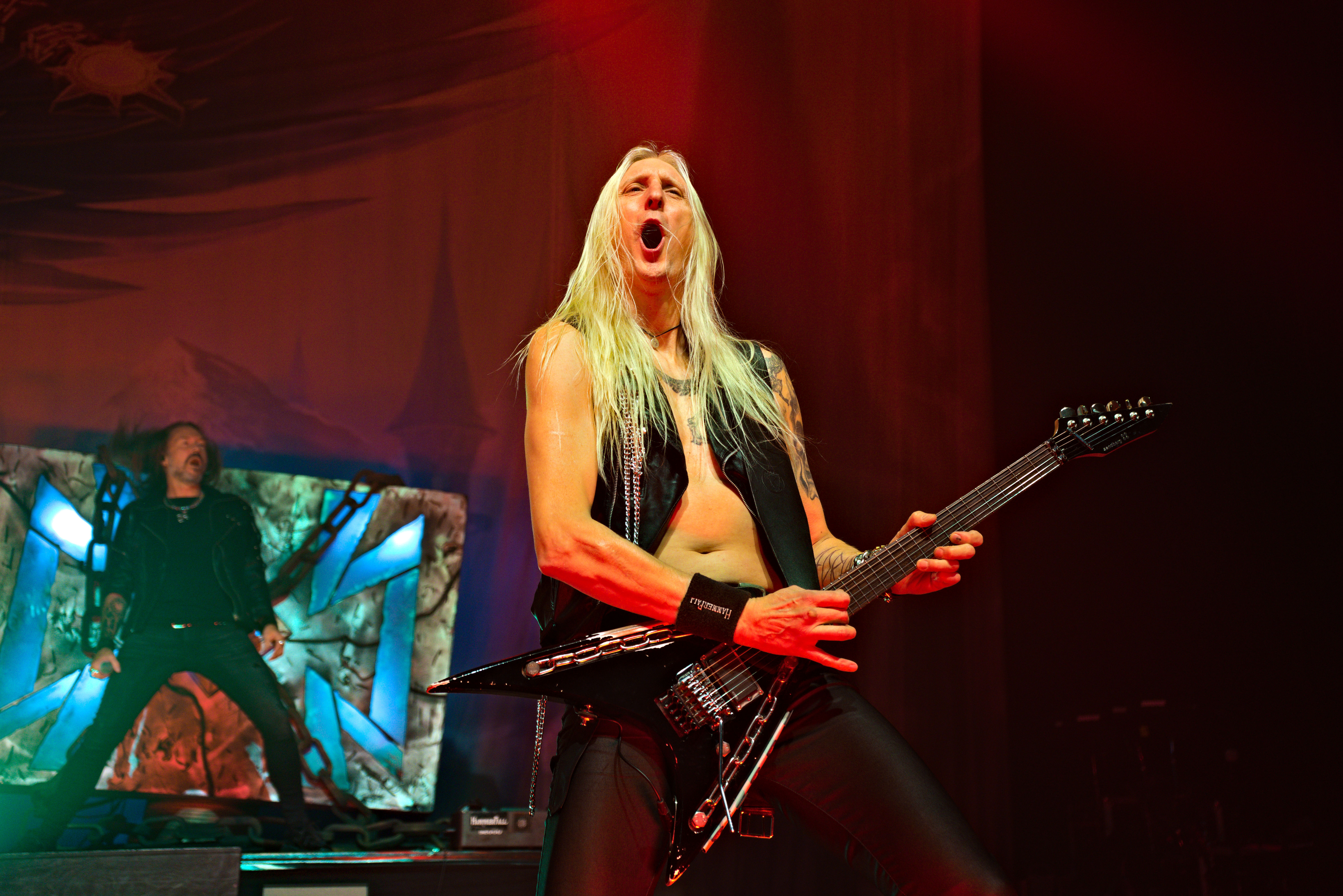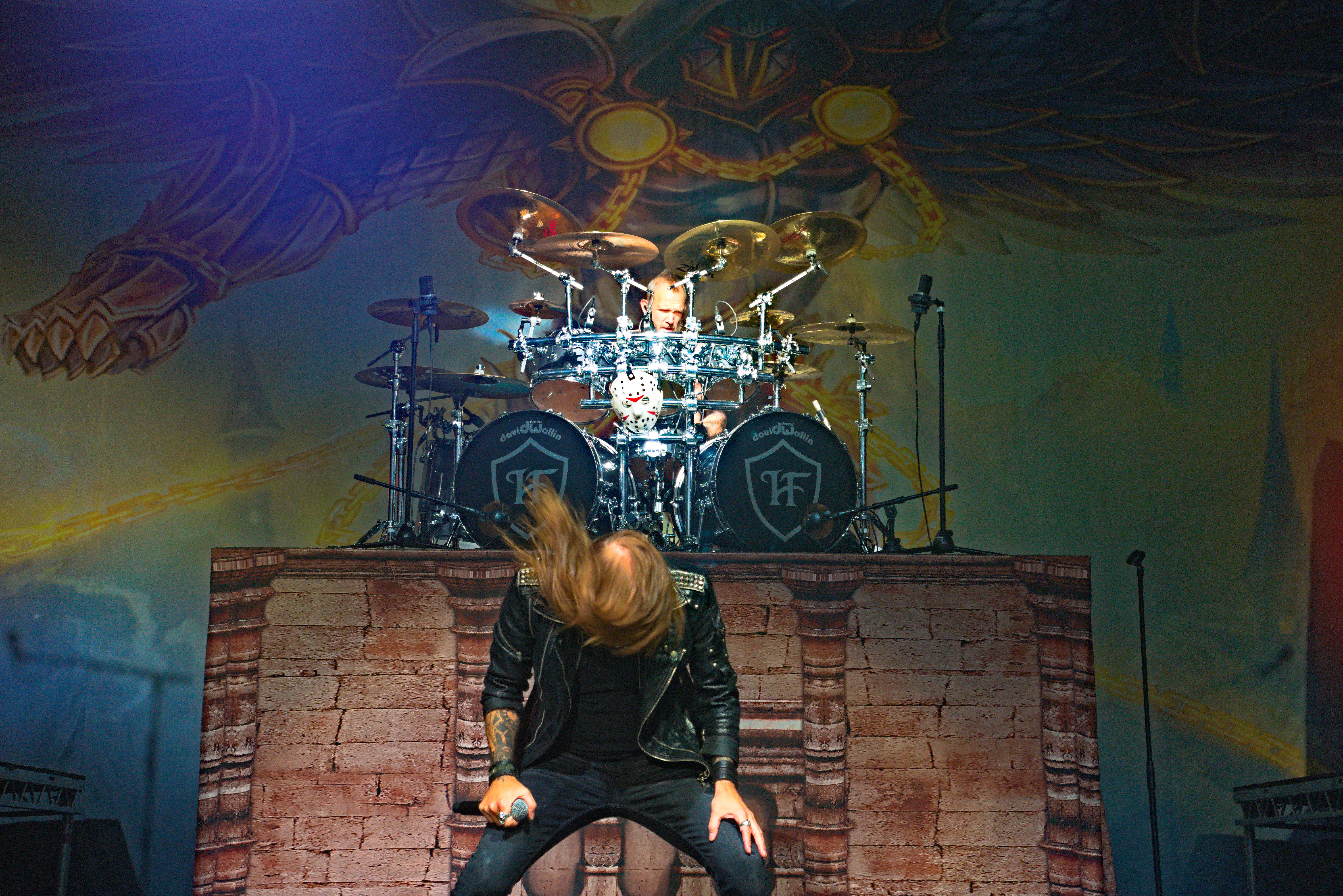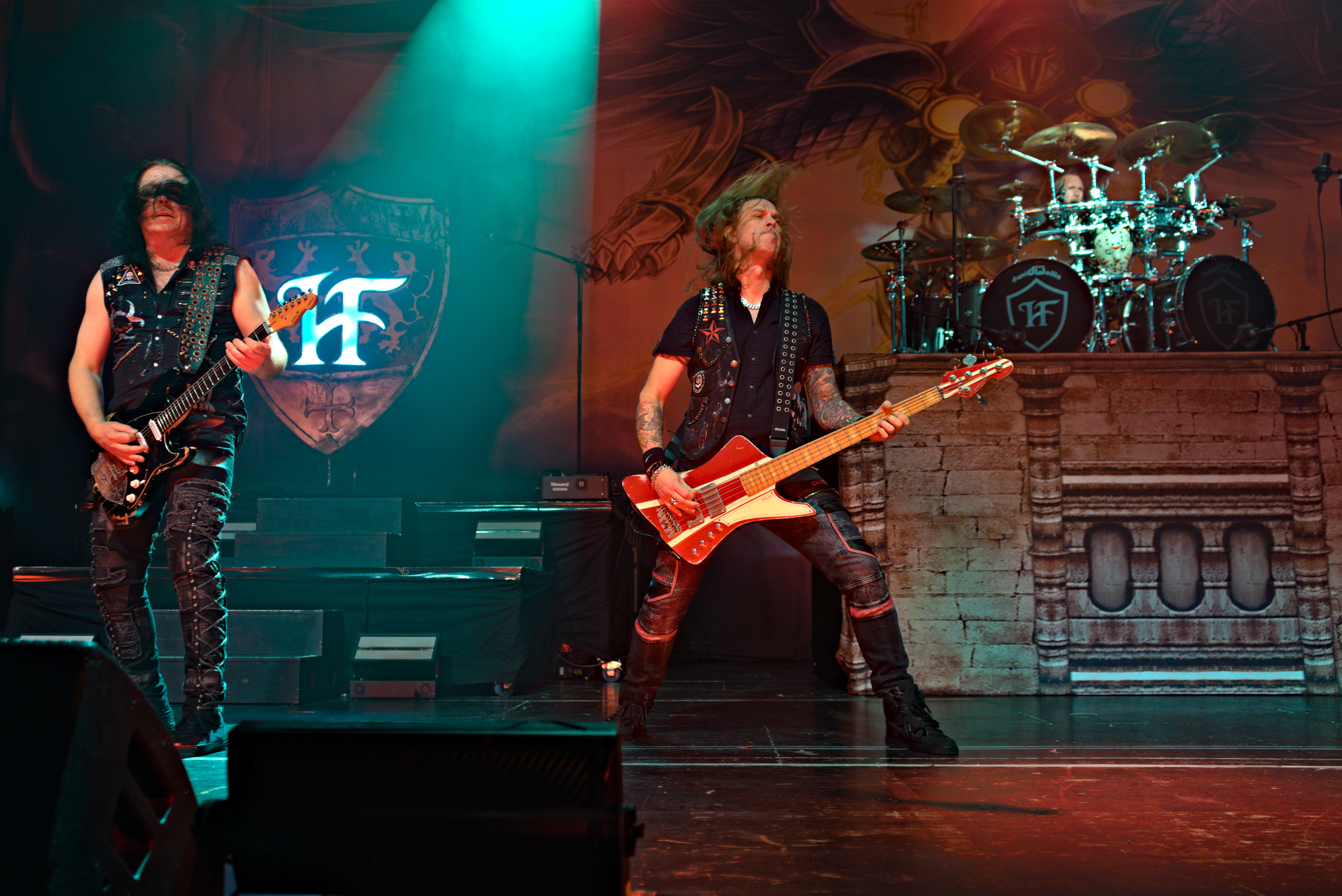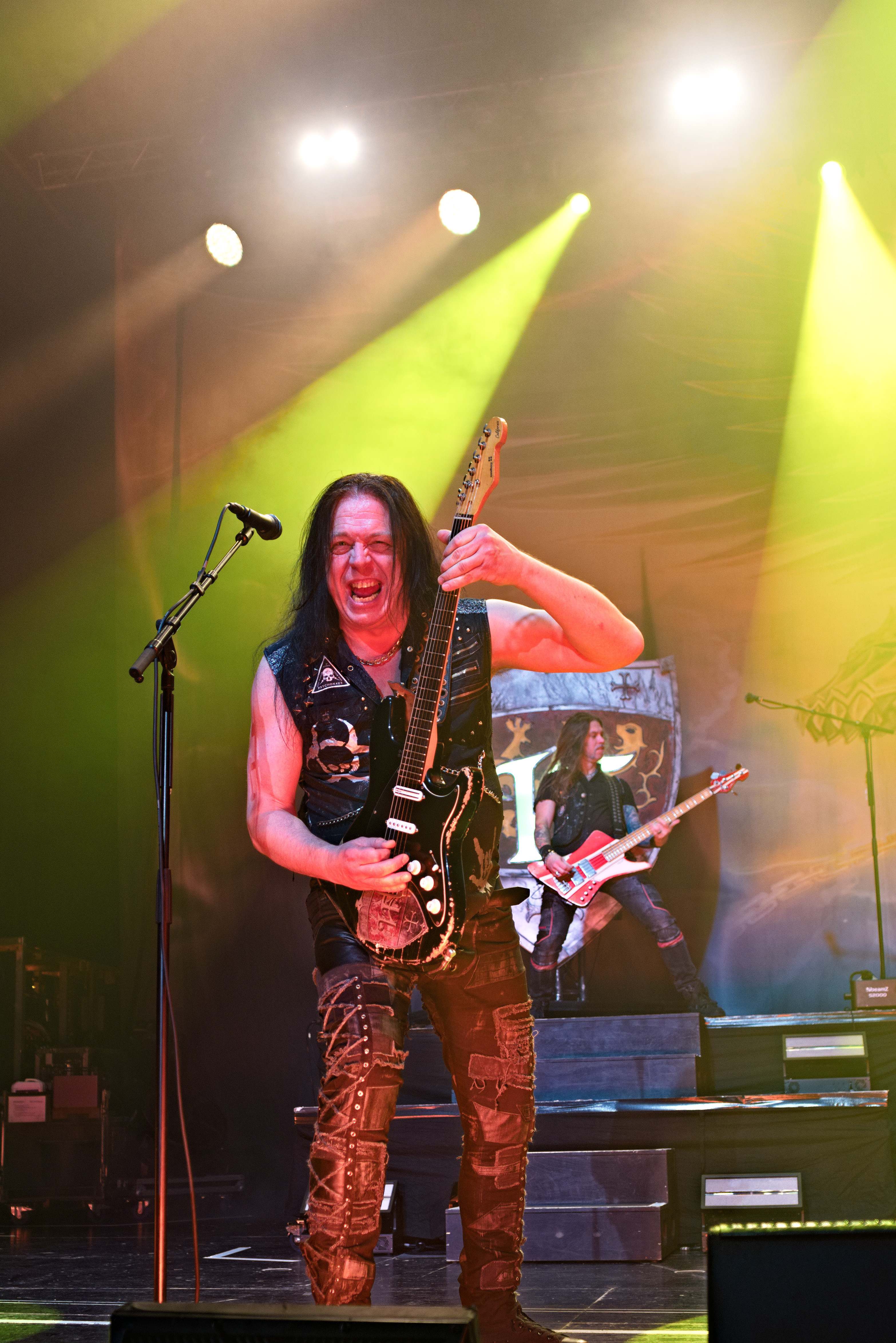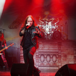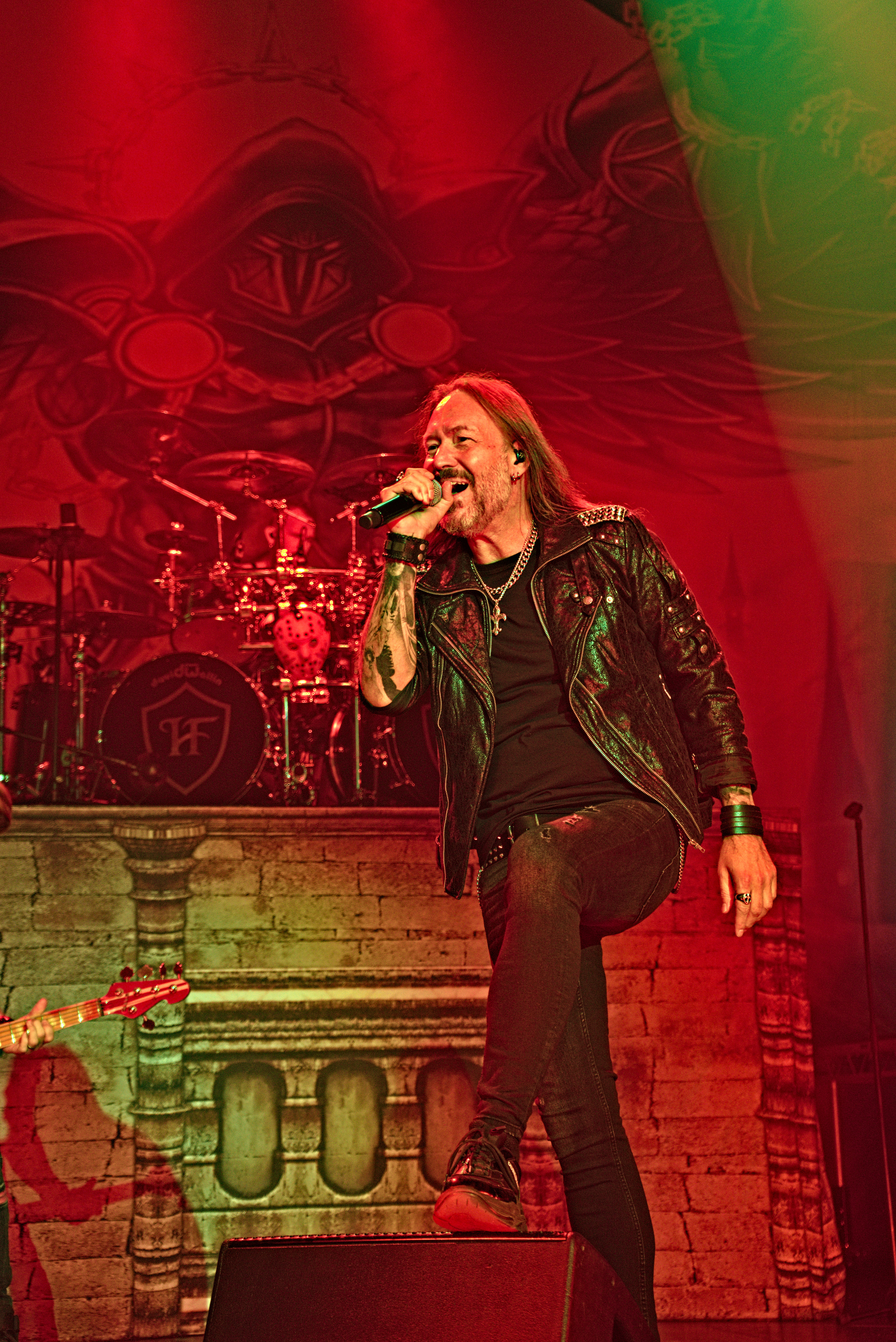 Zuerst durften sich HAMMERFALL beweisen, deren Status weit über den einer normalen Supportband hinaus ging. Sie hatten die volle Bühne, Licht und Sound zu Verfügung und bekamen darüber hinaus auch noch über 70 min Spielzeit zugestanden. Offenbar ist die Stimmung im Tourtross eine sehr gute und der große Nutznießer ist dabei der Fan, welcher zwei fette Shows an einem Abend geboten bekam. Der Einstieg mit dem neuen „Brotherhood“ ist gut gewählt und sofort hatten die Schweden einen Großteil der Leute auf ihrer Seite. Joacim war einmal mehr ein souveräner Frontman, welcher sowohl mit klarer, kraftvoller Stimme, als auch mit sympathischen Ansagen punktete. Wenn man allerdings HAMMERFALL schon oft live bewundern durfte, dann kam einem doch vieles schon sehr bekannt vor und ein bisschen Spontanität würde dem Vergnügen keinen Abbruch bereiten. Aber das ist Meckern auf hohem Niveau, denn die Schweden boten eine knackige, bewegungsfreudige und kurzweilige Metalshow. Unterhaltung auf Topniveau sozusagen. Die Haare flogen, Oscar poste, Fredrik hatte augenscheinlich richtig Spaß und Pontus feuerte ein Flitzefingesolo nach dem anderen ab. Joacim und seine Mannen führten durch ein Programm, welches nahezu alle Hits im Umfangreichen Oeuvre der Schweden abdeckte. Egal ob alte Nummern wie „The Metal Age“ oder das „Crimson Thunder-Medley“, mittelaltes wie „Any Means Necessary“, „Blood Bound” oder „Last Man Standing“ oder aktuelles wie „Venerate Me“ und „Hammer Of Dawn“, jeder Song ein Treffer. Das Finale bestritten HAMMERFALL dann mit einer furiosen Version von „Hearts On Fire“, welches von der ganzen Halle lauthals mitgesungen wurde. Ich persönlich habe zwar die eine oder andere Speednummer vermisst, dürfte da aber wohl der einzige gewesen sein. Alles in allem ein einmal mehr sackstarker Auftritt, welcher den Status HAMMERFALLs als eine der konstantesten Livebands wieder einmal untermauerte.