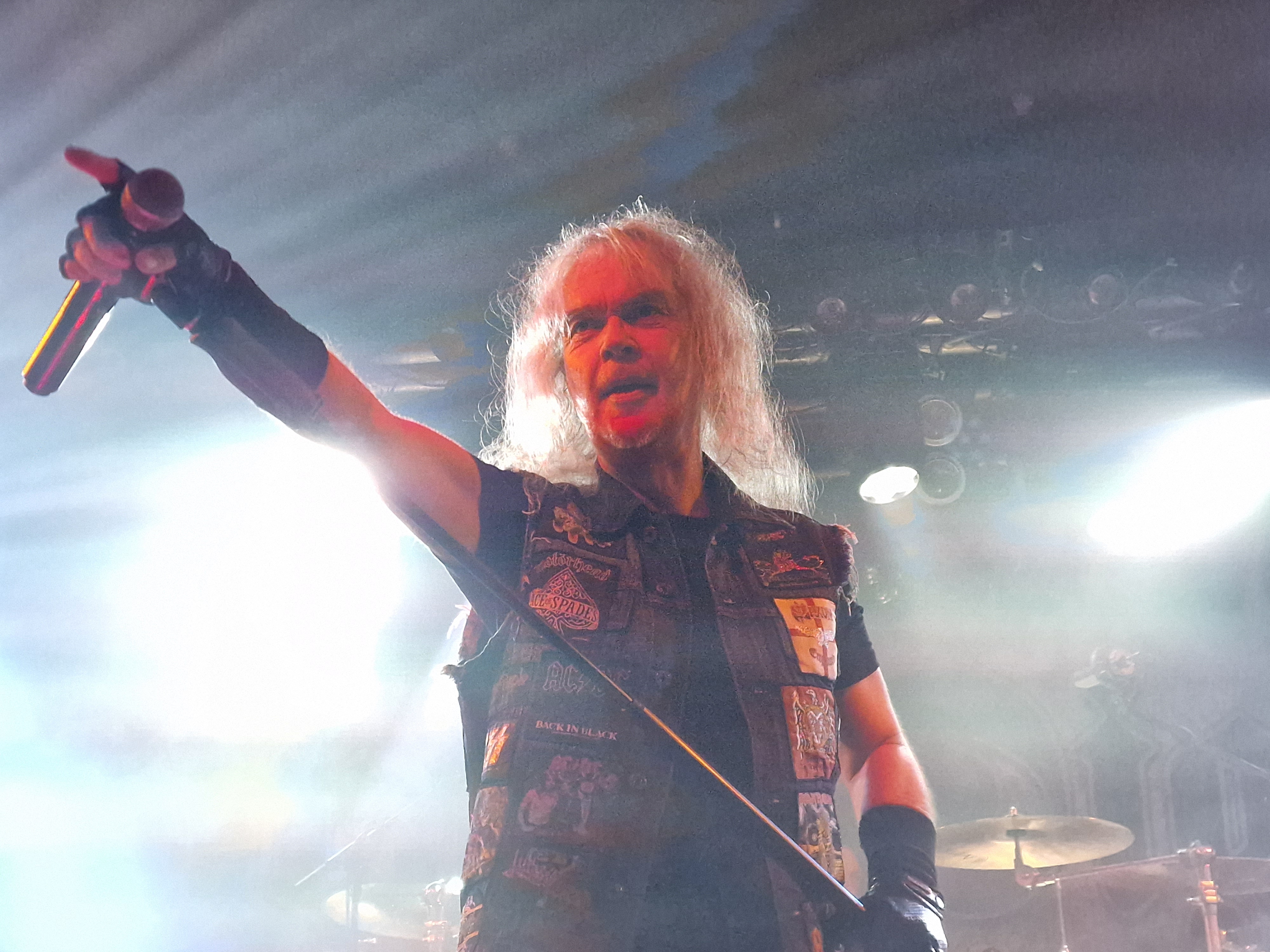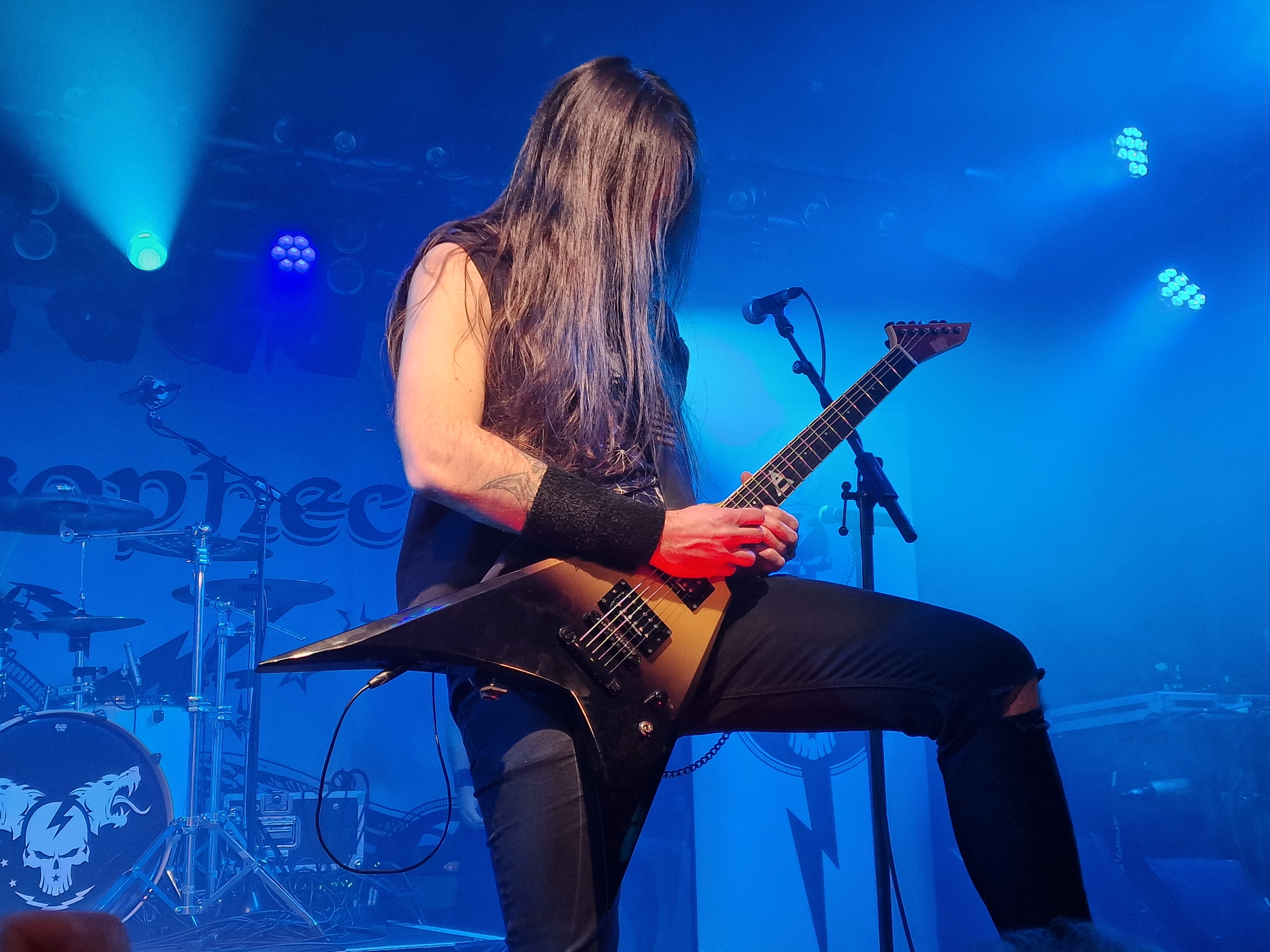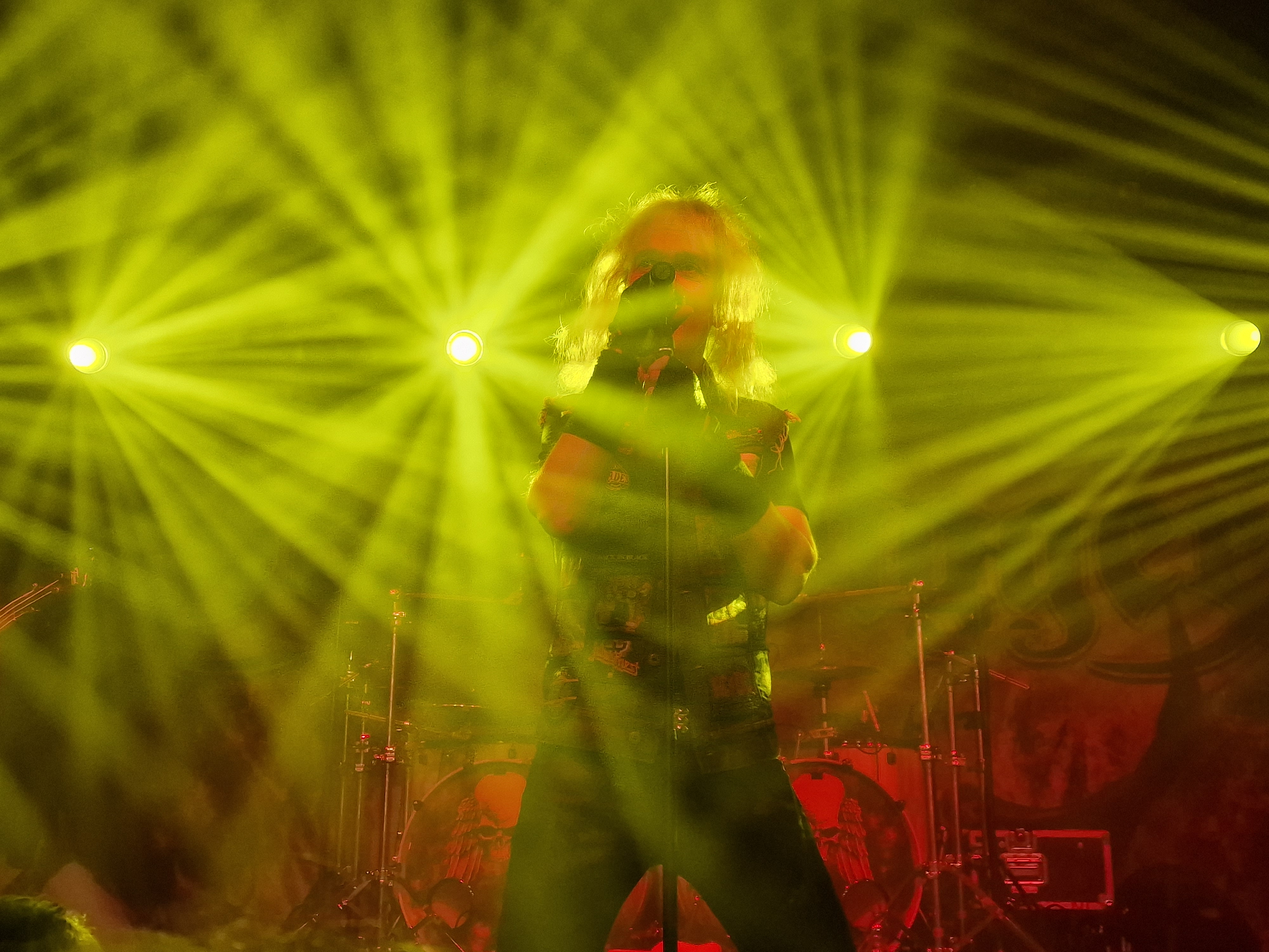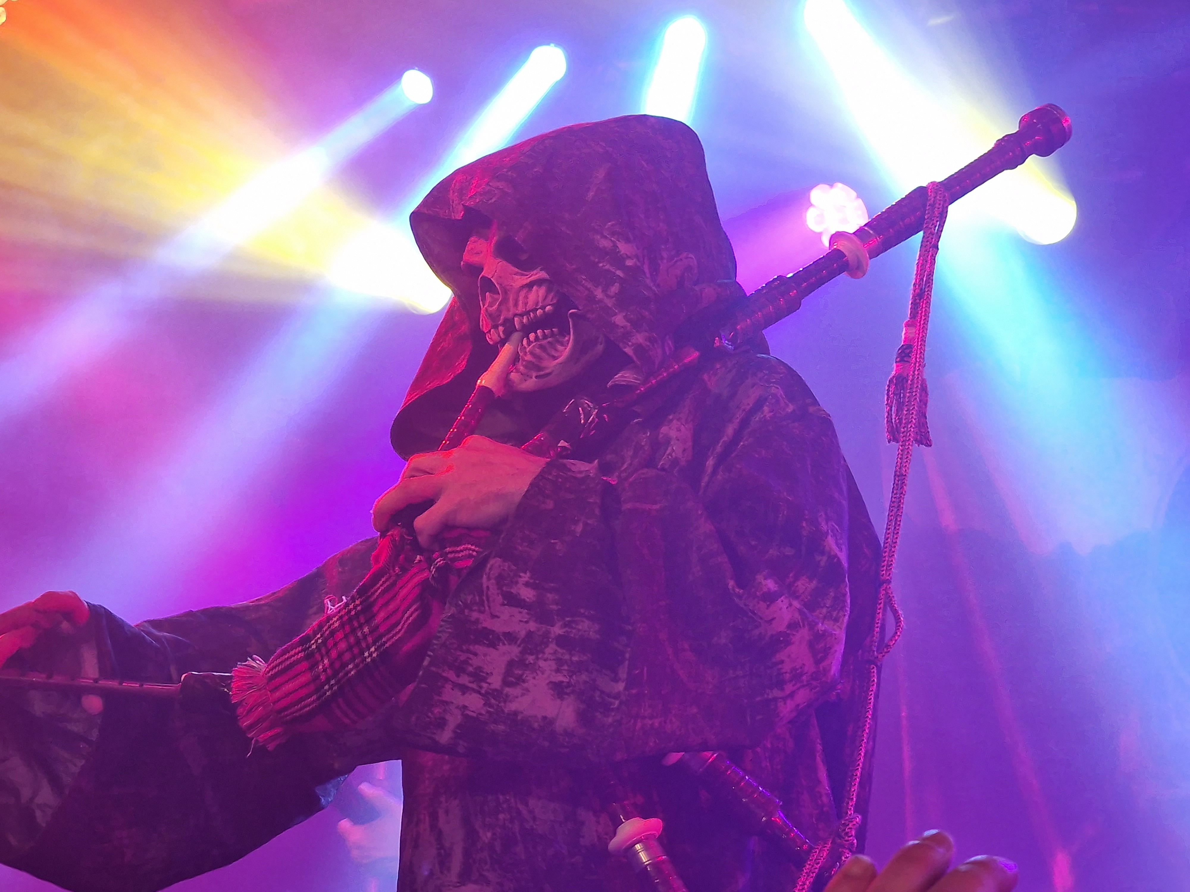 Mit „Lawbreaker“ vom „Healed By Metal“ Album steigen dann GRAVE DIGGER in ihr gut 90-minütiges Set ein. Etwas überraschend findet sich mit „Hell Is My Purgatory“ nur ein Song vom aktuellen Album „Symbol Of Eternity“ im Set. GRAVE DIGGER meistern aber dennoch den Spagat zwischen „Greatest Hit Show“ („“Circle Of Witches“, „Dark Of The Sun“, „Excalibur“ und natürlich „Rebelllion (The Clans Are Marching“) und einigen „deeper Cuts“ (©mein Kollege Steven) („The House“, „Wedding Day“, Morgane Le Fay“, „Yesterday“) vortrefflich. Bei „Dias De Los Muertos“ und „Highland Farewell“ schaut auch der gute alte Onkel Reaper vorbei und bläst entweder den Dudelsack oder bearbeitet mit seinen knochigen Händen eine Cowbell. Und wir alle wissen, dass es nie zu viel „Cowbell“ geben kann. Genau deshalb hat hier ja niemand Angst vor dem Reaper, aber ich schweife ab. Axel Ritt wirkt, als sei er immer schon Gitarrist bei GRAVE DIGGER gewesen und beindruckt neben seinem musikalischen Können, mit seinem Musculus Pectoralis Major, welchen er im Takt zucken lassen kann. Jens Becker ist die personifizierte Coolness und der in Würde ergraute Frontmann Chris Boltendahl führt souverän und sympathisch durch den Abend. Es wirkt irgendwie alles sehr vertraut und familiär und man hat den Eindruck, dass GRAVE DIGGER einfach froh sind, dass sie nach 40 Jahren immer noch das machen können, was sie lieben. Mit dem obligaten Klassiker „Heavy Metal Breakdown“, welcher den gesamten Abend perfekt zusammenfasst, findet die Show einen stimmigen Abschluss und als die Saallichtern angehen, kann man überall zufriedene Gesichter erblicken. Gerne im Januar 2024 wieder.