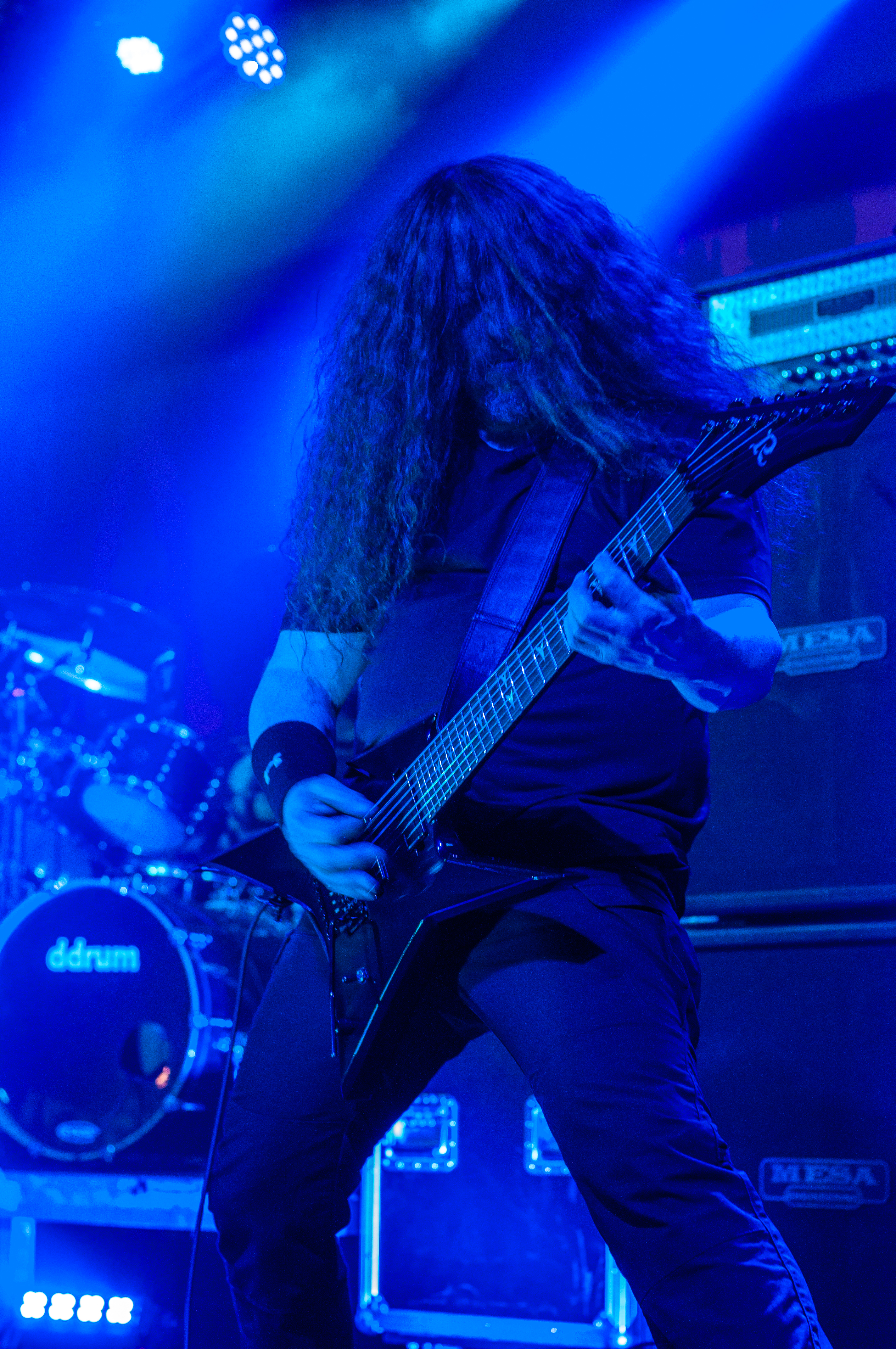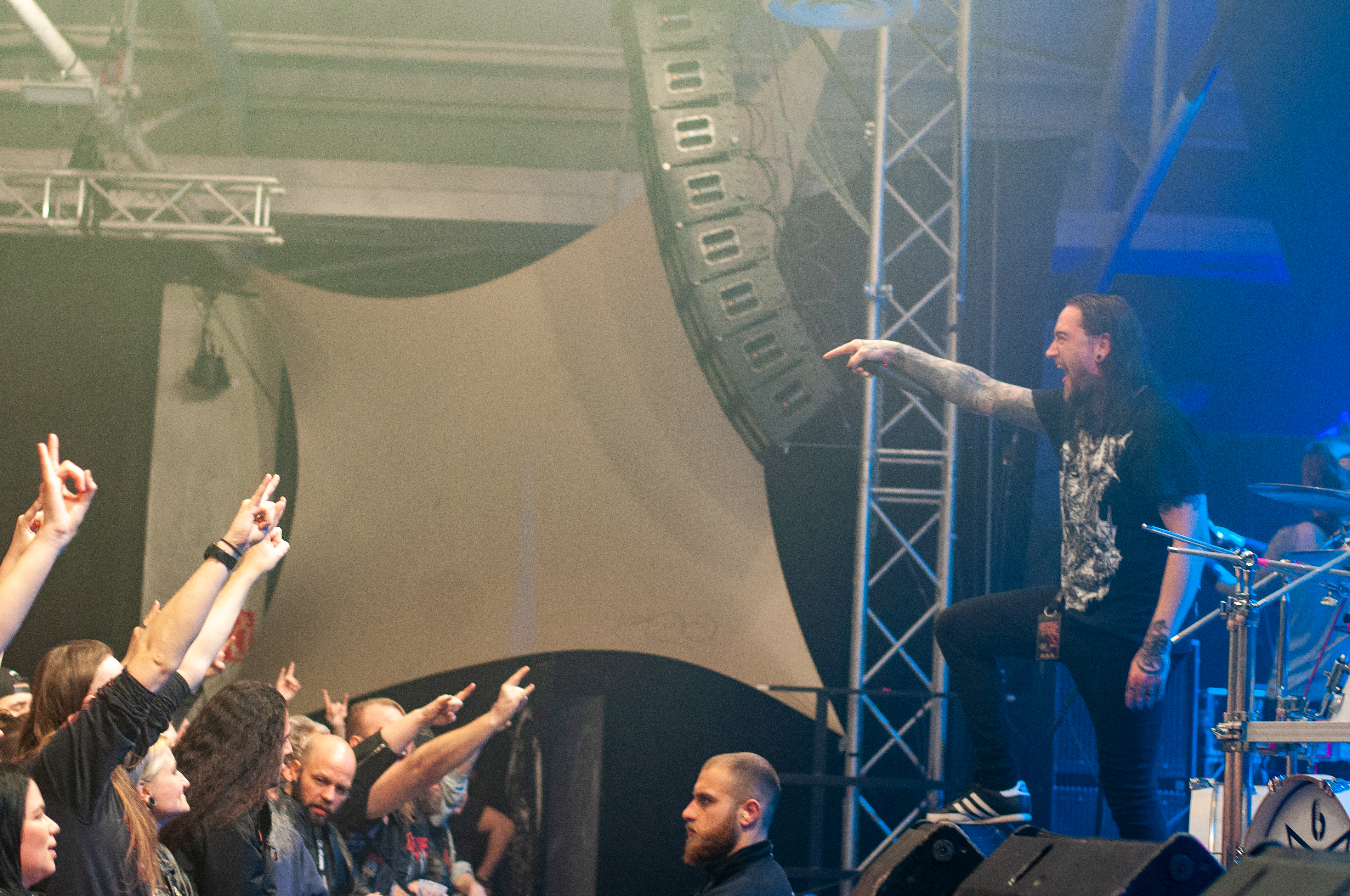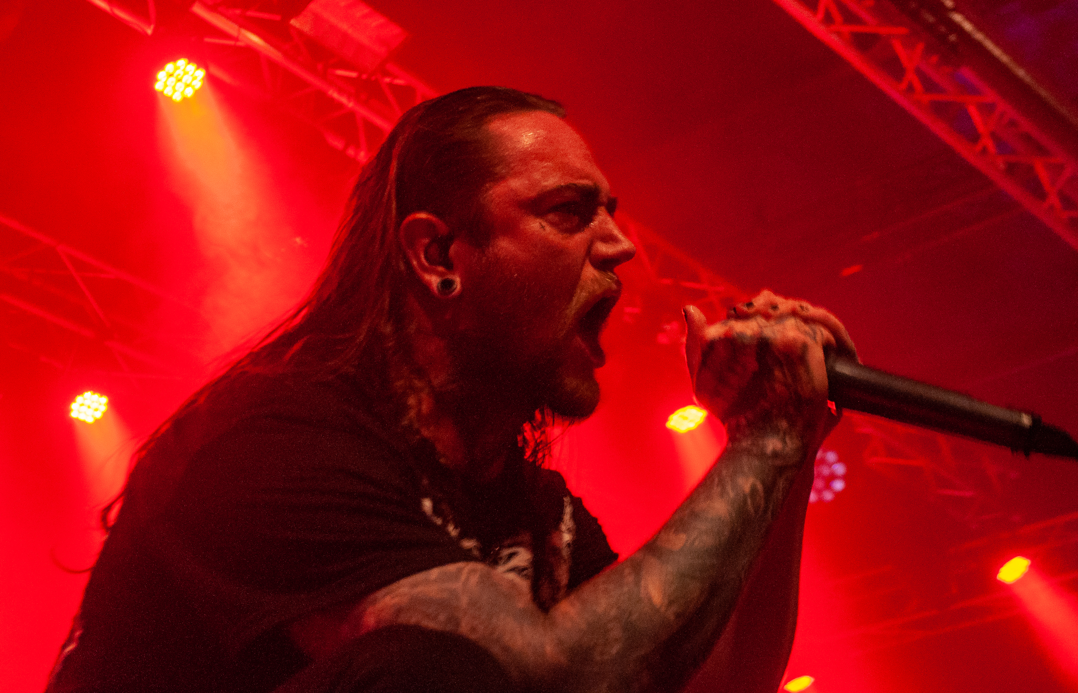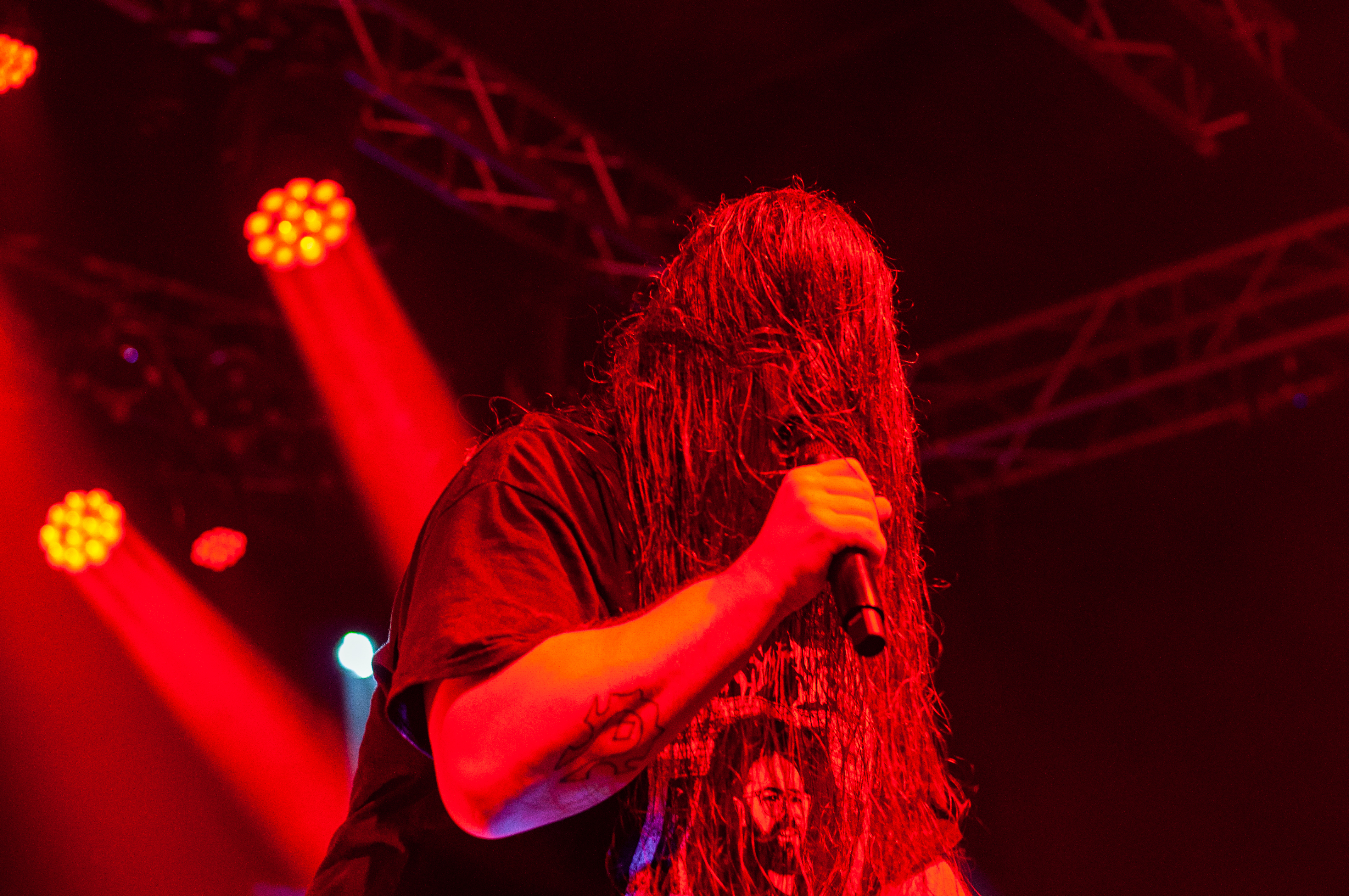 Weiter geht es mit der aggressiven Mischung aus Slam Death Metal und Deathcore von INGESTED aus England. Sie starten mit „Rebirth“ aus dem neuen Album „Ashes Lie Still“. Der Sänger Jason Evans heizt dem Kölner Publikum von Anfang an ordentlich ein und es bildet sich schnell der erste Circle Pit. Es folgen „No Half Measures“, „Invidious“ und schließlich „Echoes of Hate“. Die Mucke zeigt viele Deathcore-Elemente mit mörderischen Breakdowns und ein besonders fetter Groove baut sich auf, sobald das Tempo rausgenommen wird. Die Jungs aus Manchester wirbeln viel Staub auf und bringen das Publikum zum Schwitzen.
