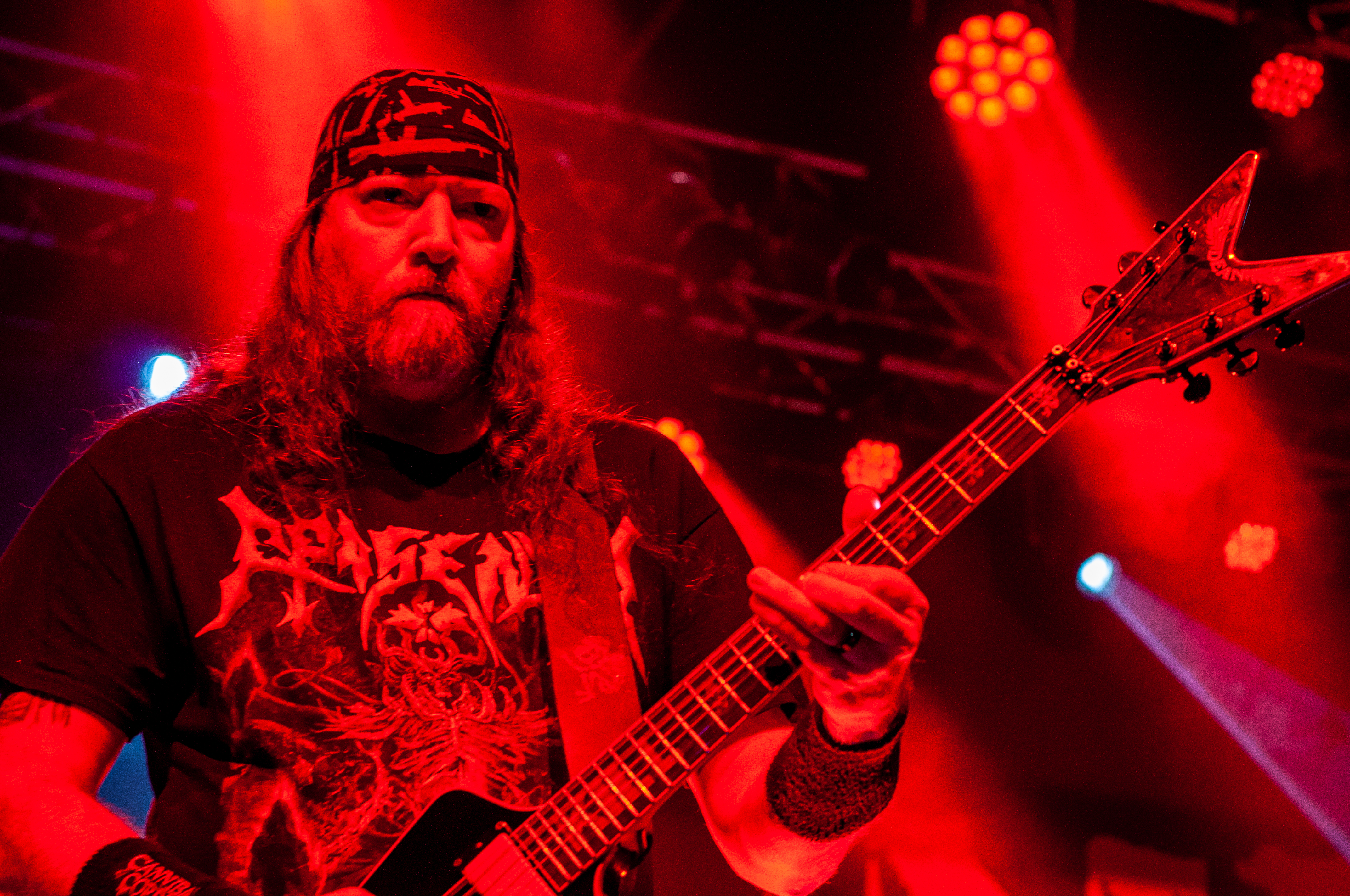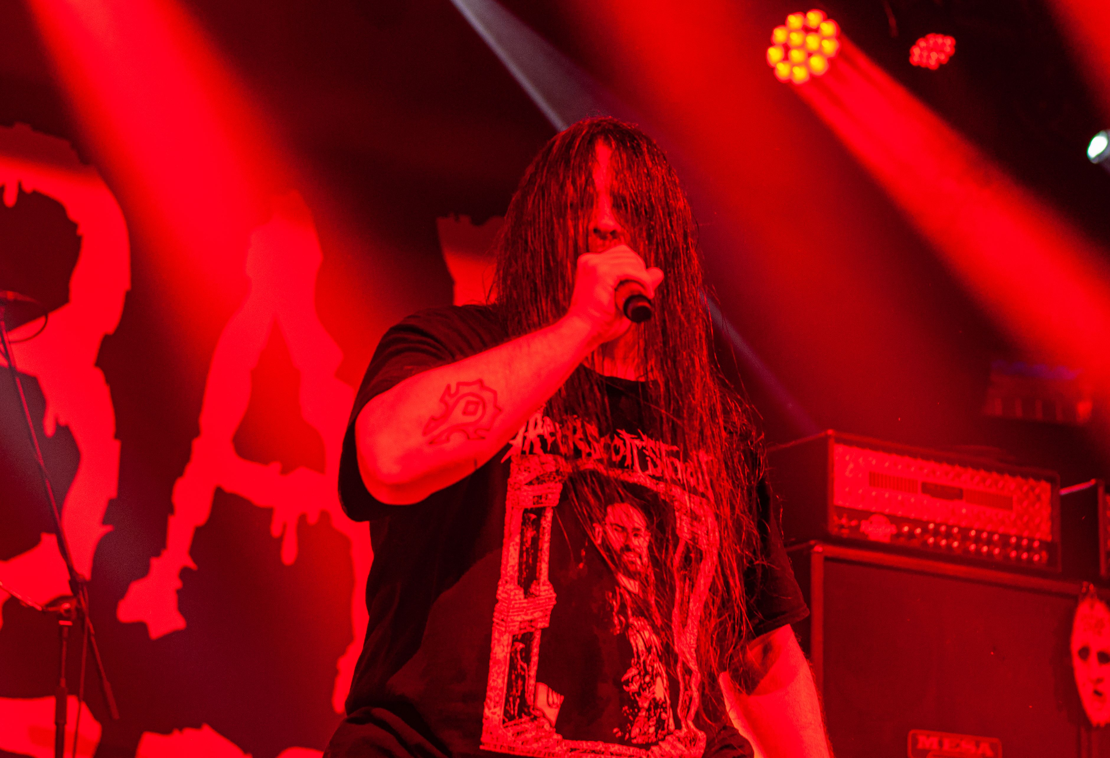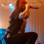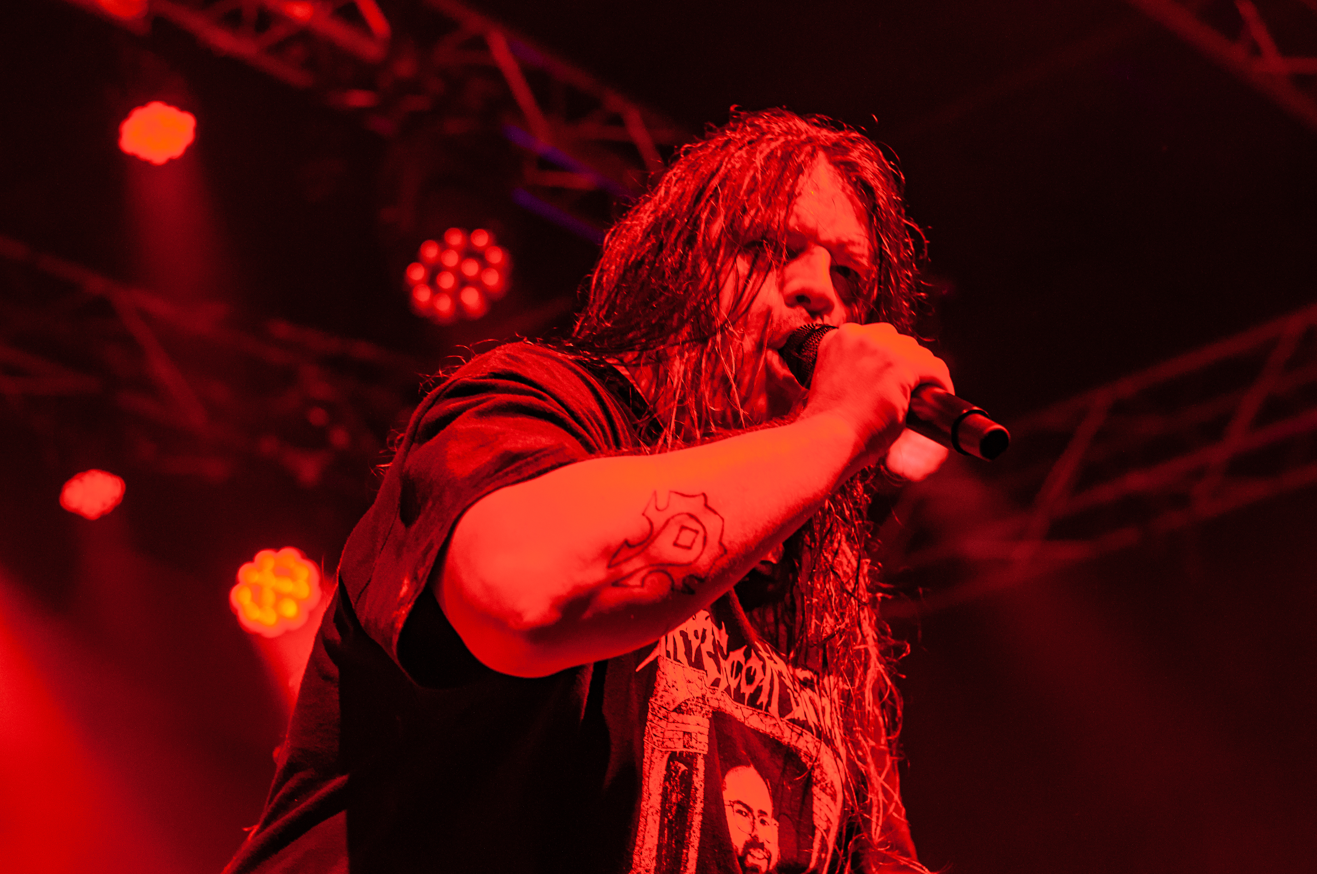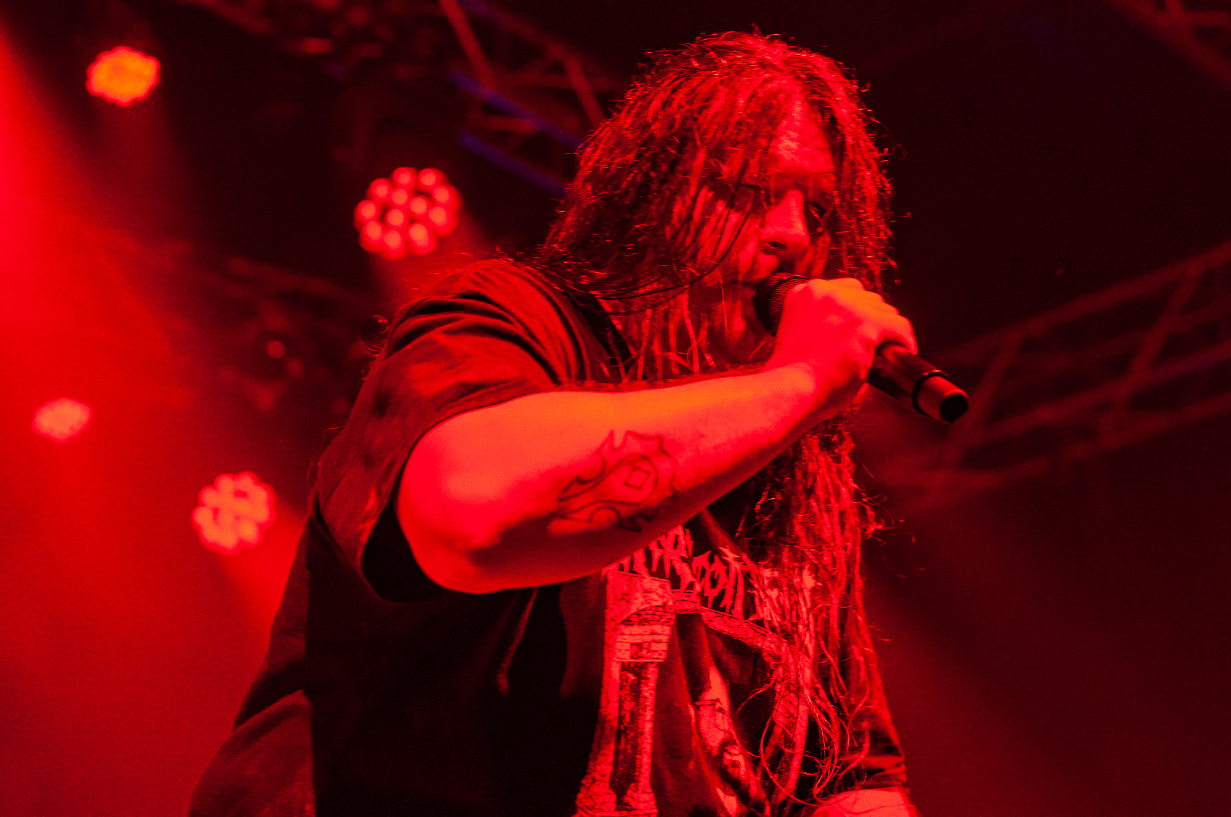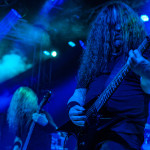 Jetzt kommt die Band, die wie keine andere, Präzision und Derbheit in Perfektion beherrscht: bei CANNIBAL CORPSE wird es dumpf, hart und komplex zugleich. Sie starten ohne Schnörkel und Brimborium mit „Scourge of Iron”, “The Time to Kill Is Now” und “Inhumane Harvest”. Schnell wird klar, dass die Truppe um Kampf-Nacken George „Corpsegrinder“ Fisher, unangefochtener Headliner ist: Köln hat Bock auf Gemetzel! Das nächste Lied ist ein lieblich-zärtlicher Lovesong und der Corpsegrinder widmet ihn dem weiblichen Publikum: „the next Song is dedicate to all the ladies here tonight: „Fucked With a Knife“. Beim gefeierten „Make them suffer“ kriegt Schlagzeuger Paul Mazurkiewicz viel zu tun, Maschinengewehr-Blastbeats, Tempo- und Taktwechsel machen einige Nummern zur sportlichen Herausforderung. Der neue Gitarrist Erik Rutan spielt das Material tight und mit flotten Fingern. Eine halsbrecherische Headbanging-Reise durch alte und neue CORPSE-Scheiben: „Necrogenic Resurrection“, “Unleashing the Bloodthirsty” und ein saustarkes „Devoured by Vermin“, dass auch schon einige Jahre auf dem Buckel hat. CANNIBAL CORPSE funktionieren wie eine gut geölte Schlachtermaschine. Bassist Alex Webster arbeitet sich virtuos durch das Set. Nach „Stripped, Raped and Strangled” folgt mit „Hammer Smashed Face“ der letzte Song. Doch George „Corpsegrinder“ Fisher hat noch Zeit und bleibt, während um ihn herum abgebaut wird, auf der Bühne. Er trällert Country-Songs, verschenkt Getränke und Setlists und gibt Autogramme. Es ist schön zu sehen, wie frei von Allüren und sympathisch er mit dem Publikum agiert und sich dabei ein Schlückchen Whiskey aus der Pulle genehmigt. Auf diese Art und Weise bleiben nach dem Gig viele Menschen in der Venue und die Security drängelt nicht nach dem letzten Ton das Publikum aus dem Saal. Respect for the Neck!