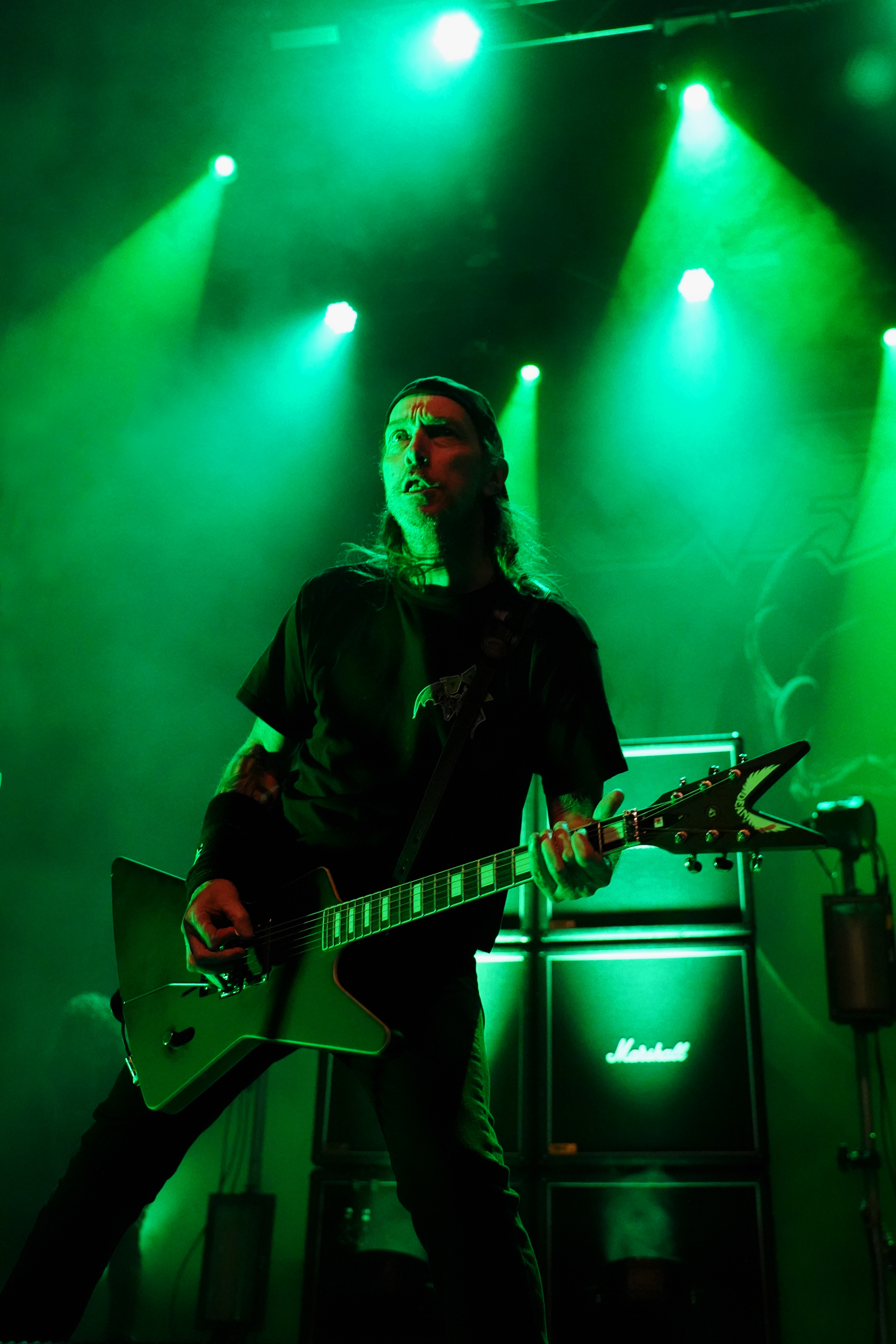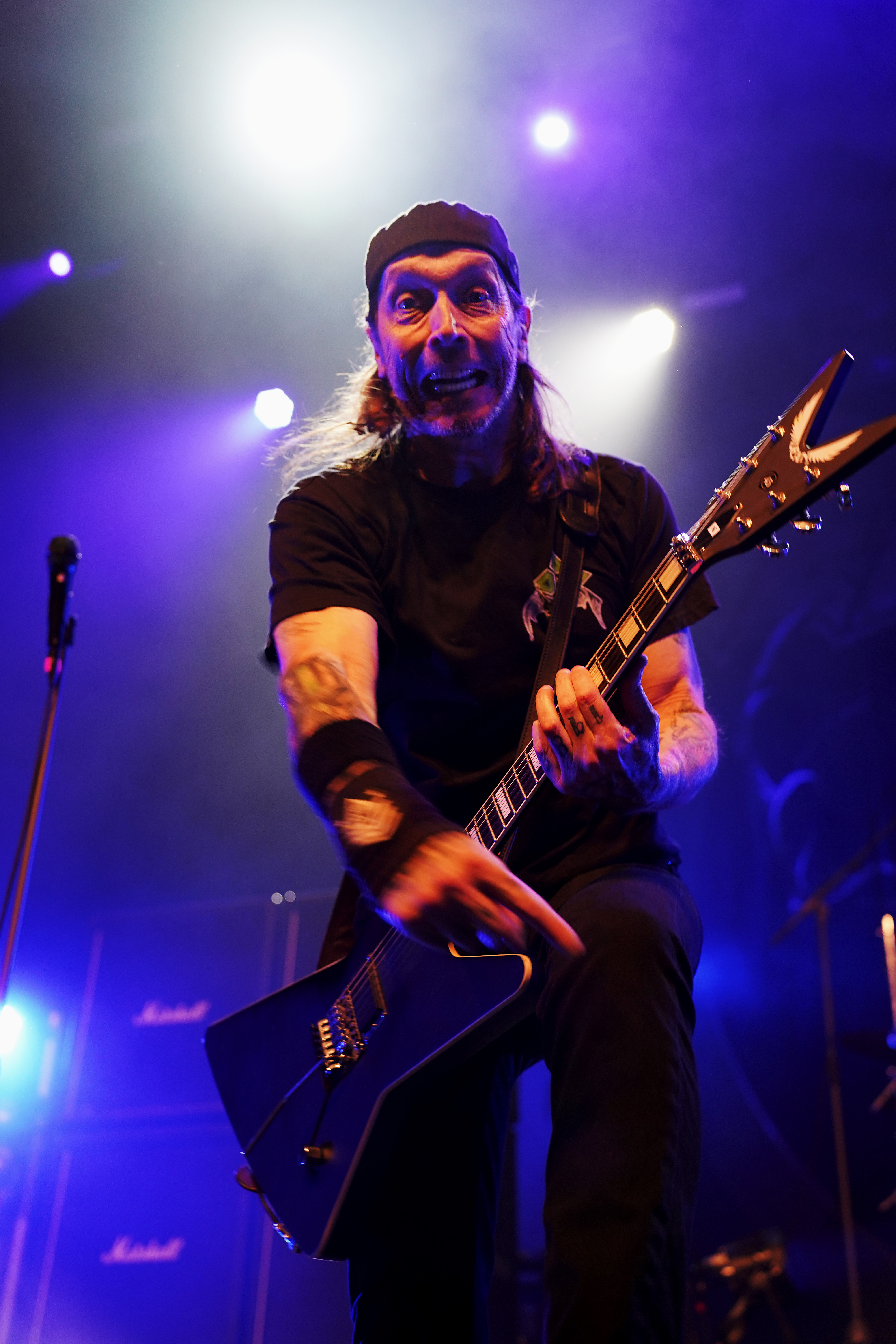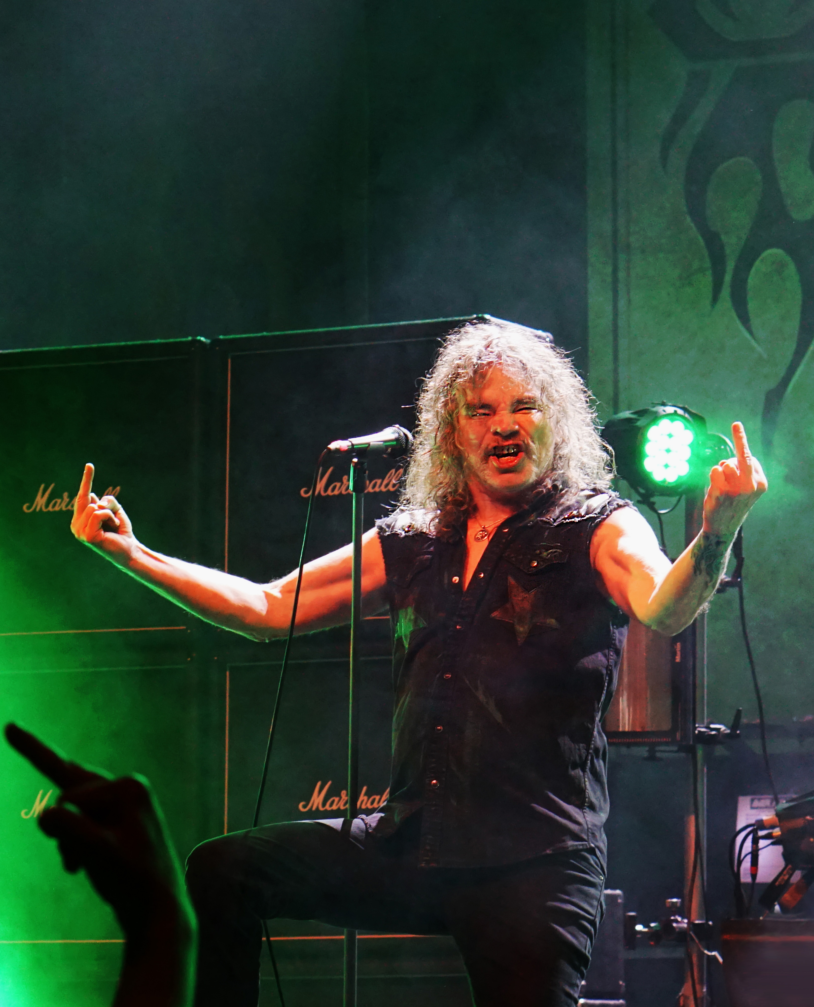 Als gegen halb zehn die Bühne in pulsierendes grünes Licht getaucht wurde, schlug dann aber die OVERKILL-Stunde. Hier war vom ersten Ton weg richtig Feuer unterm Dach, bei dem Bobby „Blitz“ Ellsworths den gnadenlosen Brandstifter mimte. Der Frontmann hat in über 40 Jahren keinen Deut nachgelassen. Nach wie vor treibt er kraftvoll und dynamisch die restliche Truppe an und das Auditorium hängt förmlich an seinen Lippen. Selbst die neuen Nummern, wie der Opener “Scorched“ werden frenetisch im Moshpit gefeiert. Auch “Wicked Place“ und “The Surgeon“ fügten sich fast nahtlos in das ansonsten ausgesprochen klassische Set ein. Aber fehlte da nicht schon wieder einer...ja klar! Gründungsmitglied am Bass D.D. Verni is not in the house. Warum, wurde uns nicht weiter erläutert, es soll sich um etwas privates bzw. familiäres handeln. Für ihn zupfte Christian "Speesy" Giesler (BONDED, ex-KREATOR) durchaus solide den Bass.