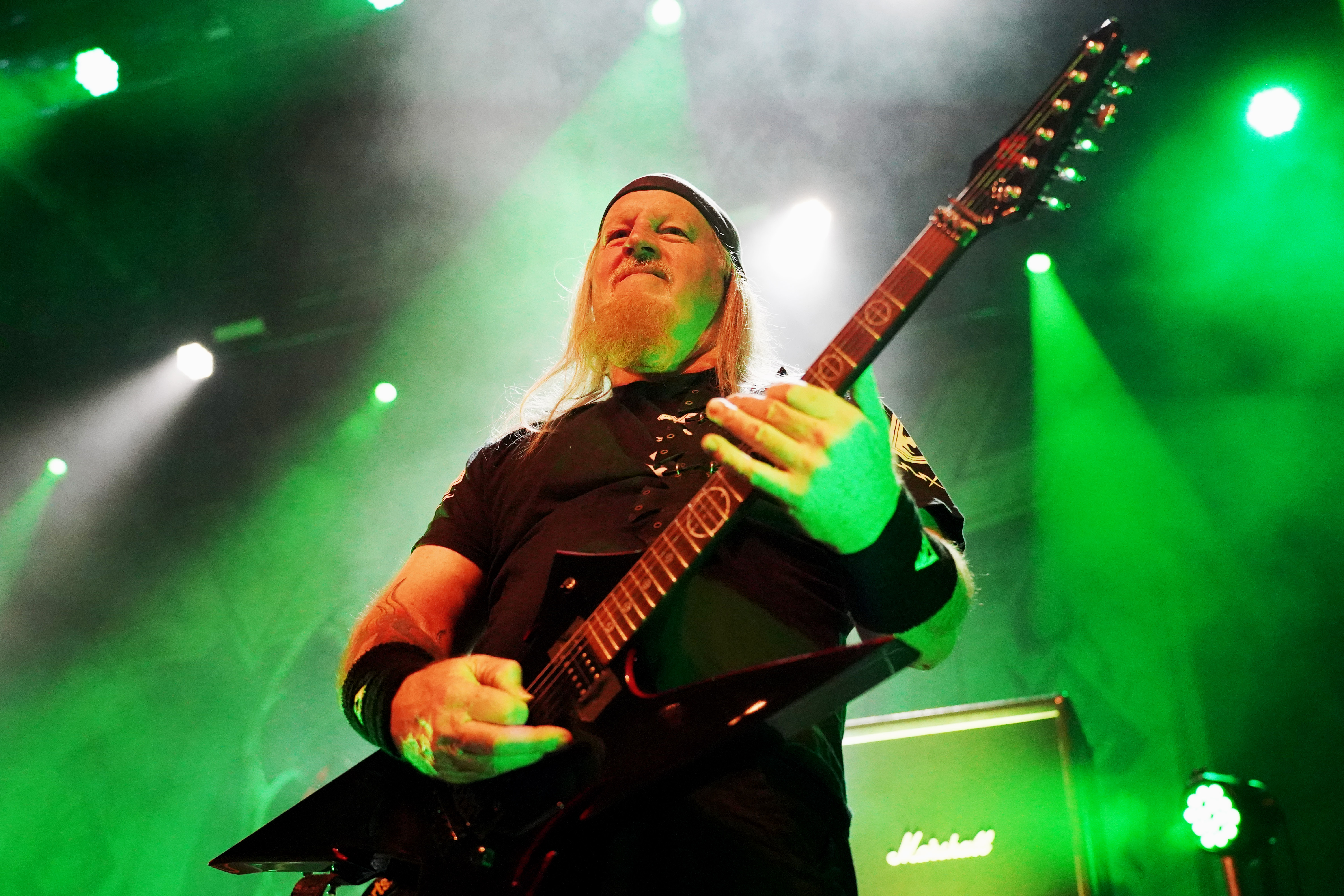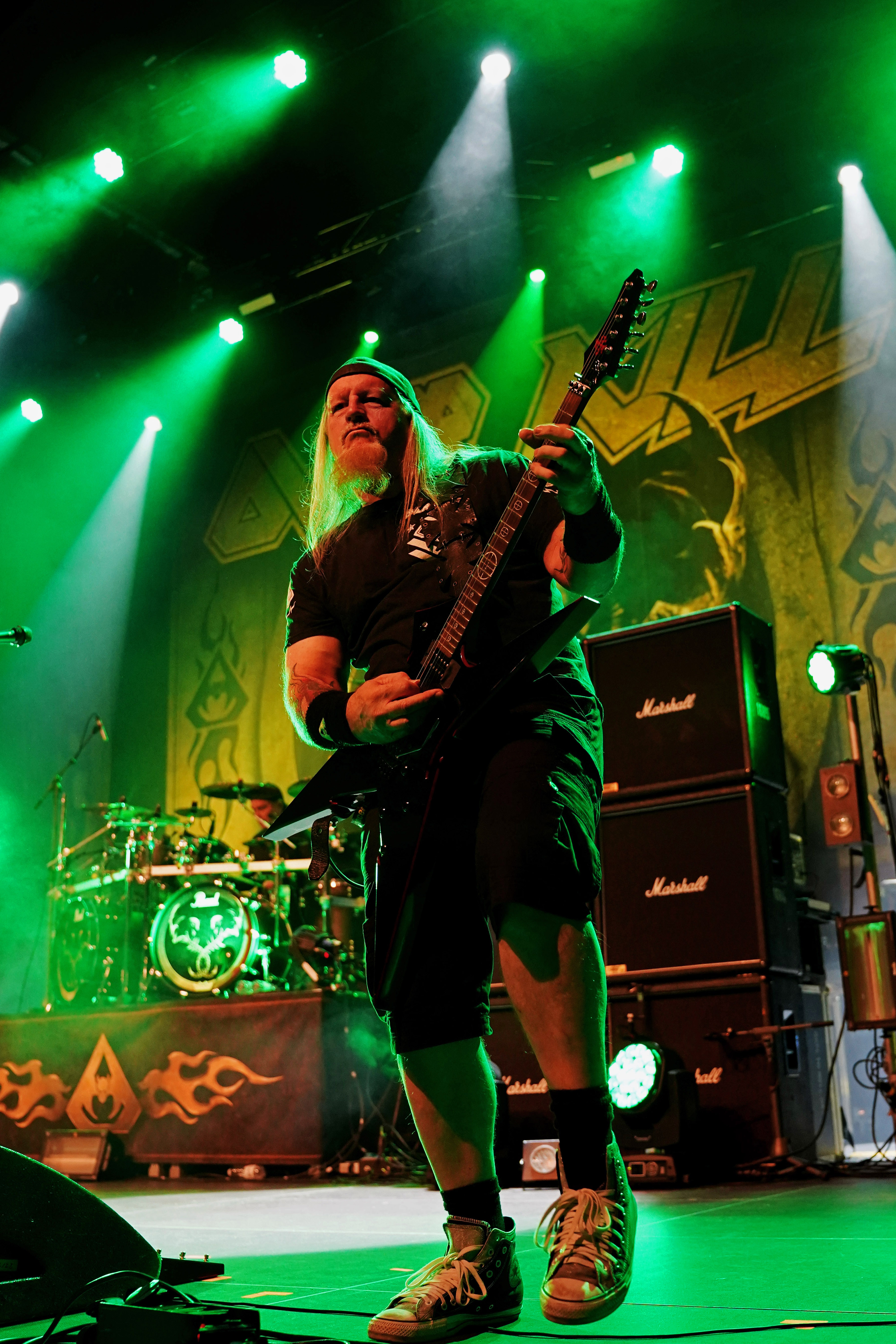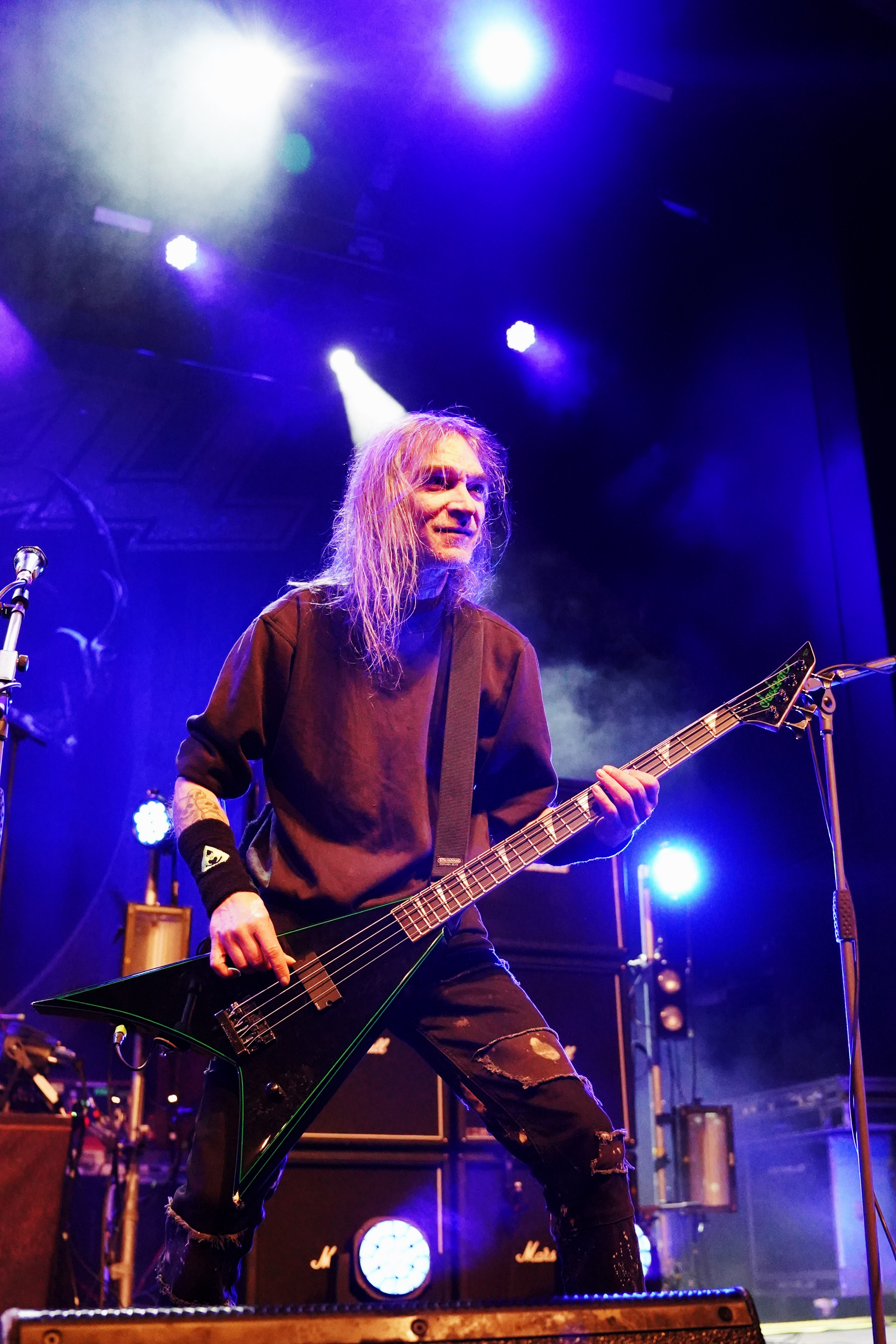 Als gegen halb zehn die Bühne in pulsierendes grünes Licht getaucht wurde, schlug dann aber die OVERKILL-Stunde. Hier war vom ersten Ton weg richtig Feuer unterm Dach, bei dem Bobby „Blitz“ Ellsworths den gnadenlosen Brandstifter mimte. Der Frontmann hat in über 40 Jahren keinen Deut nachgelassen. Nach wie vor treibt er kraftvoll und dynamisch die restliche Truppe an und das Auditorium hängt förmlich an seinen Lippen. Selbst die neuen Nummern, wie der Opener “Scorched“ werden frenetisch im Moshpit gefeiert. Auch “Wicked Place“ und “The Surgeon“ fügten sich fast nahtlos in das ansonsten ausgesprochen klassische Set ein. Aber fehlte da nicht schon wieder einer...ja klar! Gründungsmitglied am Bass D.D. Verni is not in the house. Warum, wurde uns nicht weiter erläutert, es soll sich um etwas privates bzw. familiäres handeln. Für ihn zupfte Christian "Speesy" Giesler (BONDED, ex-KREATOR) durchaus solide den Bass.