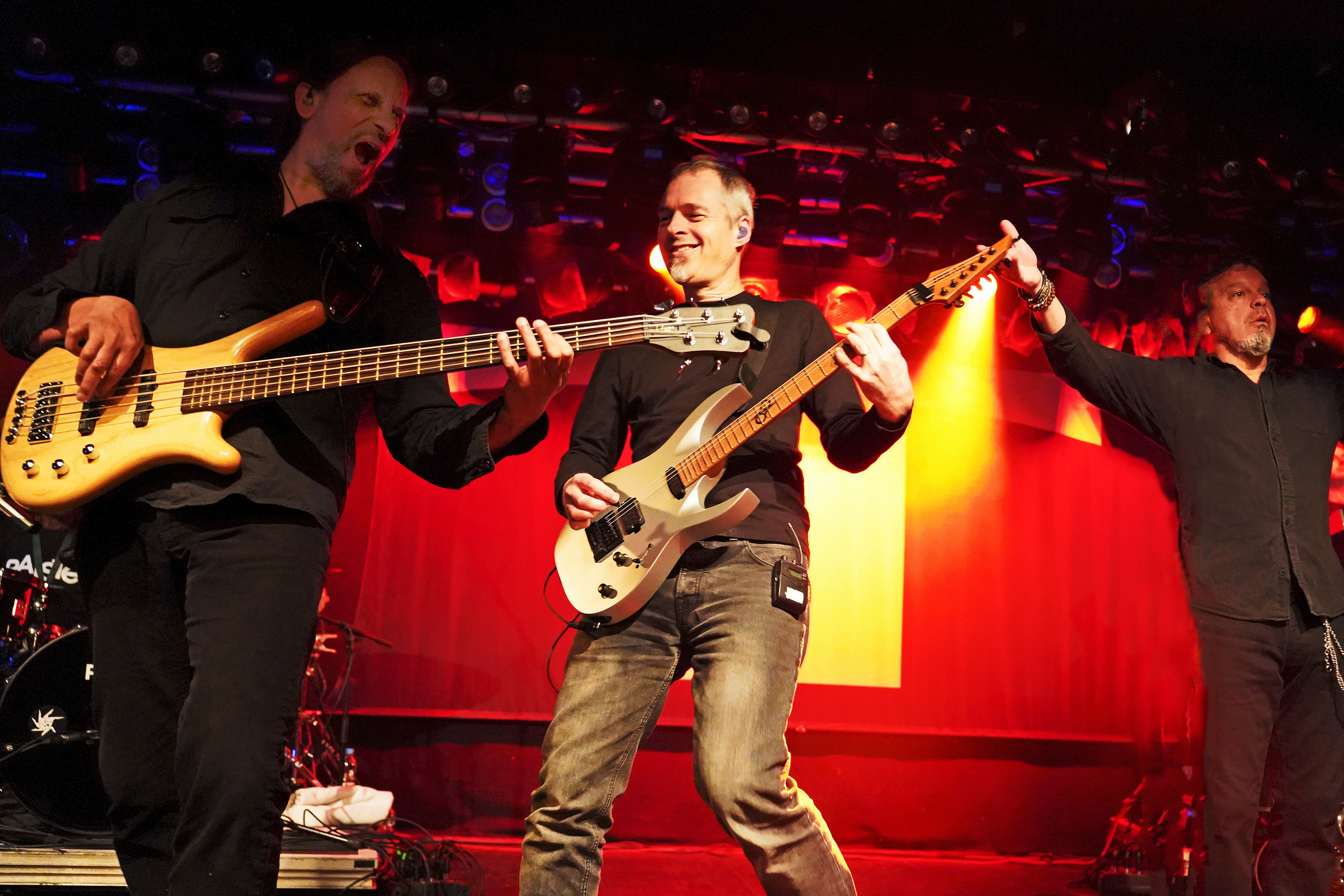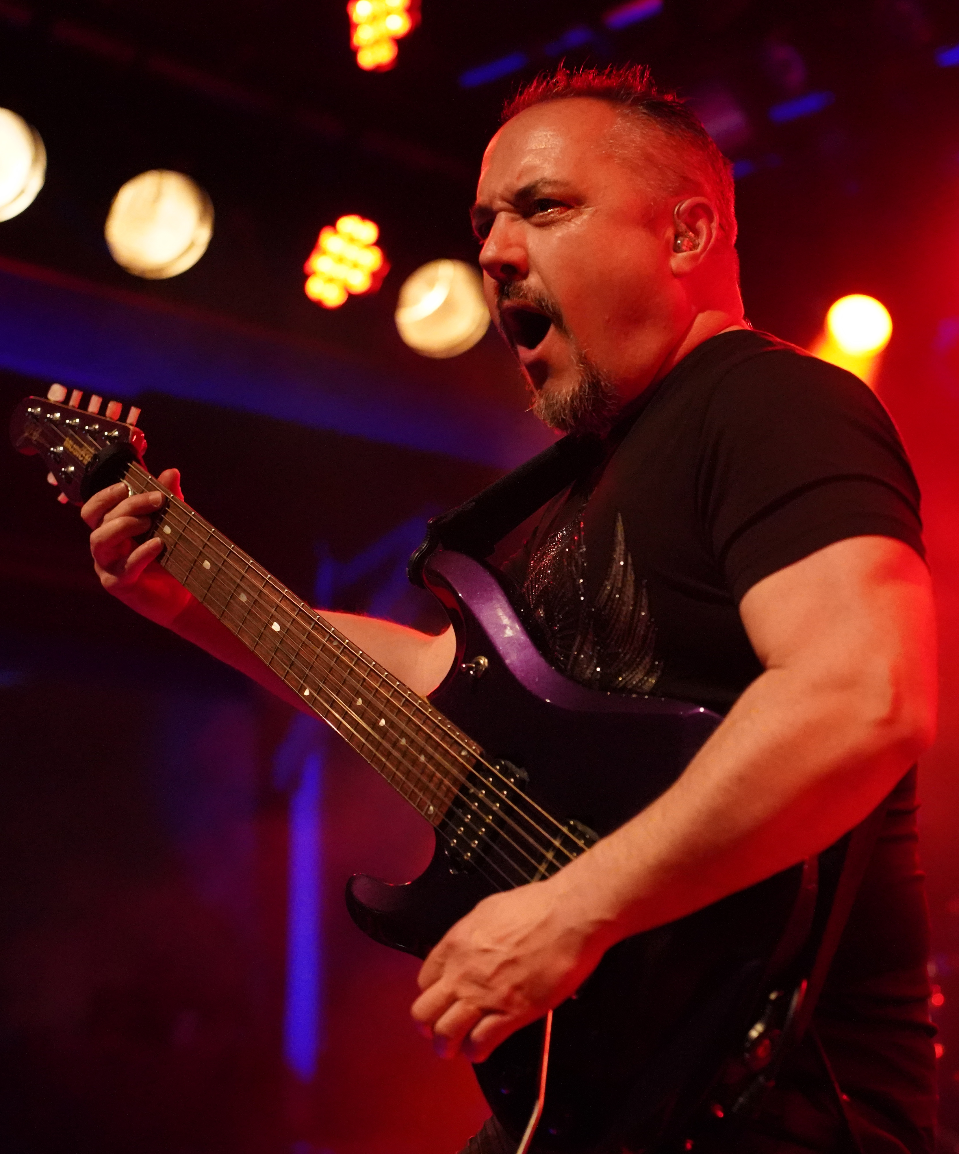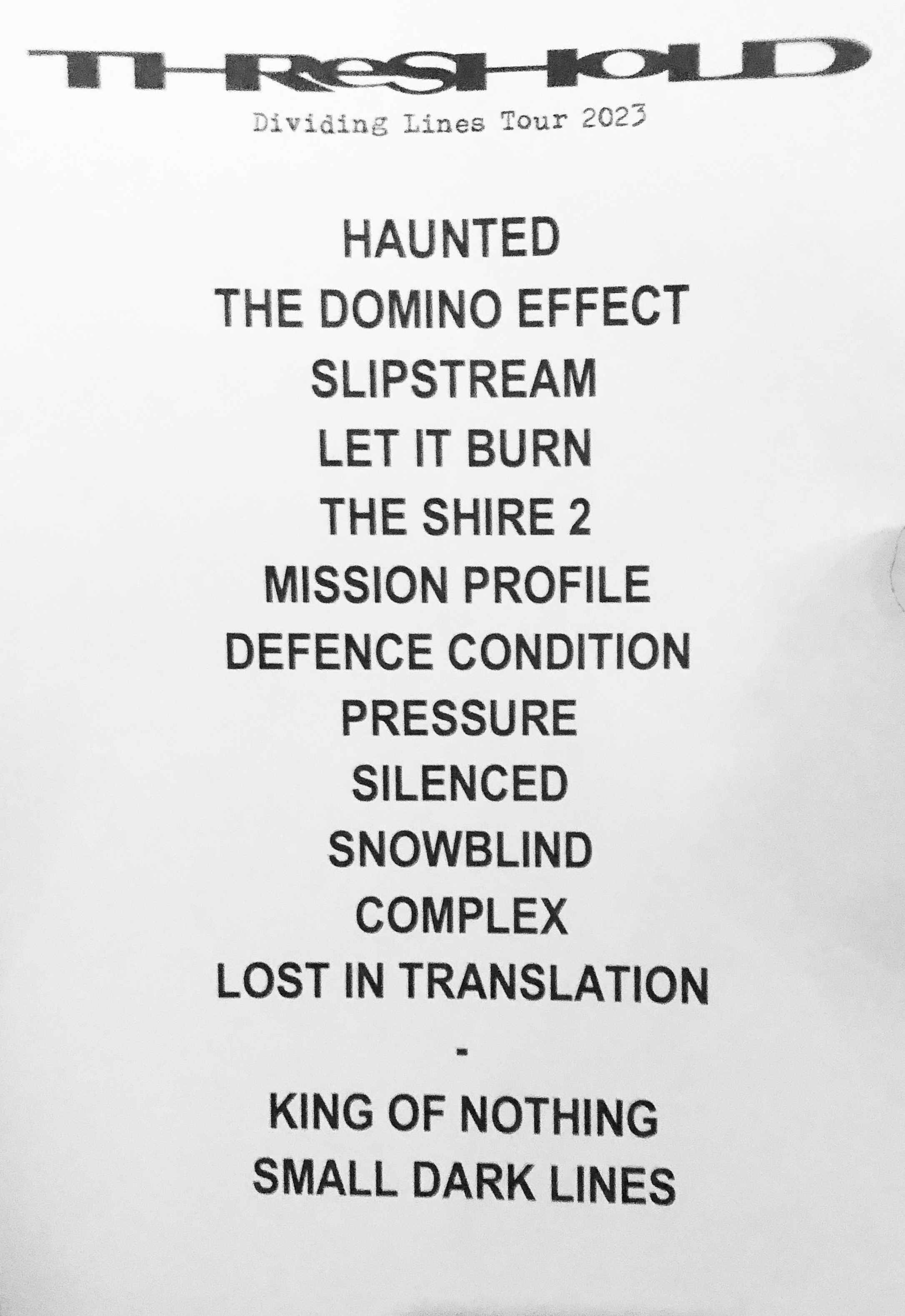 THRESHOLD stehen pünktlich um 21h auf der Bühne und die Band hat einen Sound zum Zunge schnalzen: fein, transparent, sehr druckvoll und trotzdem unfassbar laut. Man ist versucht, sich der Lautstärke mit Watte zu entziehen, aber der Klang ist einfach zu stark, um hier aktiv zu werden. Also geht man eben mit Pfeifgeräusch schlafen; das ist, frei nach Merkel, alternativlos heute Abend. Die spielfreudigen Briten überzeugen darüber hinaus mit tollen Songs, wobei hier einiges aus der Frühphase und sehr viel aus dem aktuellen Werk angeboten wird. Somit dominiert auf dem Gig eher die harte und riffbetonte Seite der Inselbewohner. Keyborder Richard West wirkt zuweilen etwas unterbeschäftigt. Dafür punktet Schlagzeuger Karl Groom mit enorm druckvollem und dynamischen Druming, aber auch der Bassist und der Gitarrist performen agil und präzise. Sänger Glynn Morgan überzeugt mit Stage Acting und Stimme. Auch wenn hin und wieder kleine Fehlerchen zu hören sind, empfinde ich den sympathischen Frontmann als starken Performer und charismatische Erscheinung. Das Publikum im Colos-Saal feiert die Band, es gibt - selbstredend - nach ca 90 Minuten eine Zugabe und am Schluss (ca.105 Minuten) einen verdienten frenetischen Applaus.