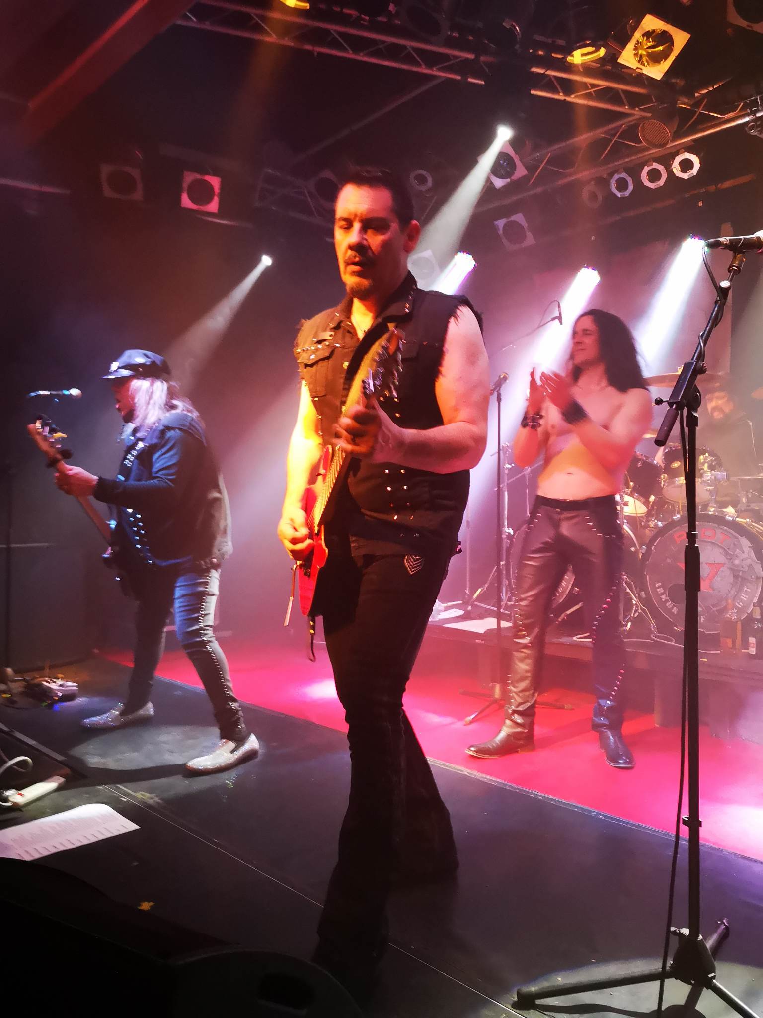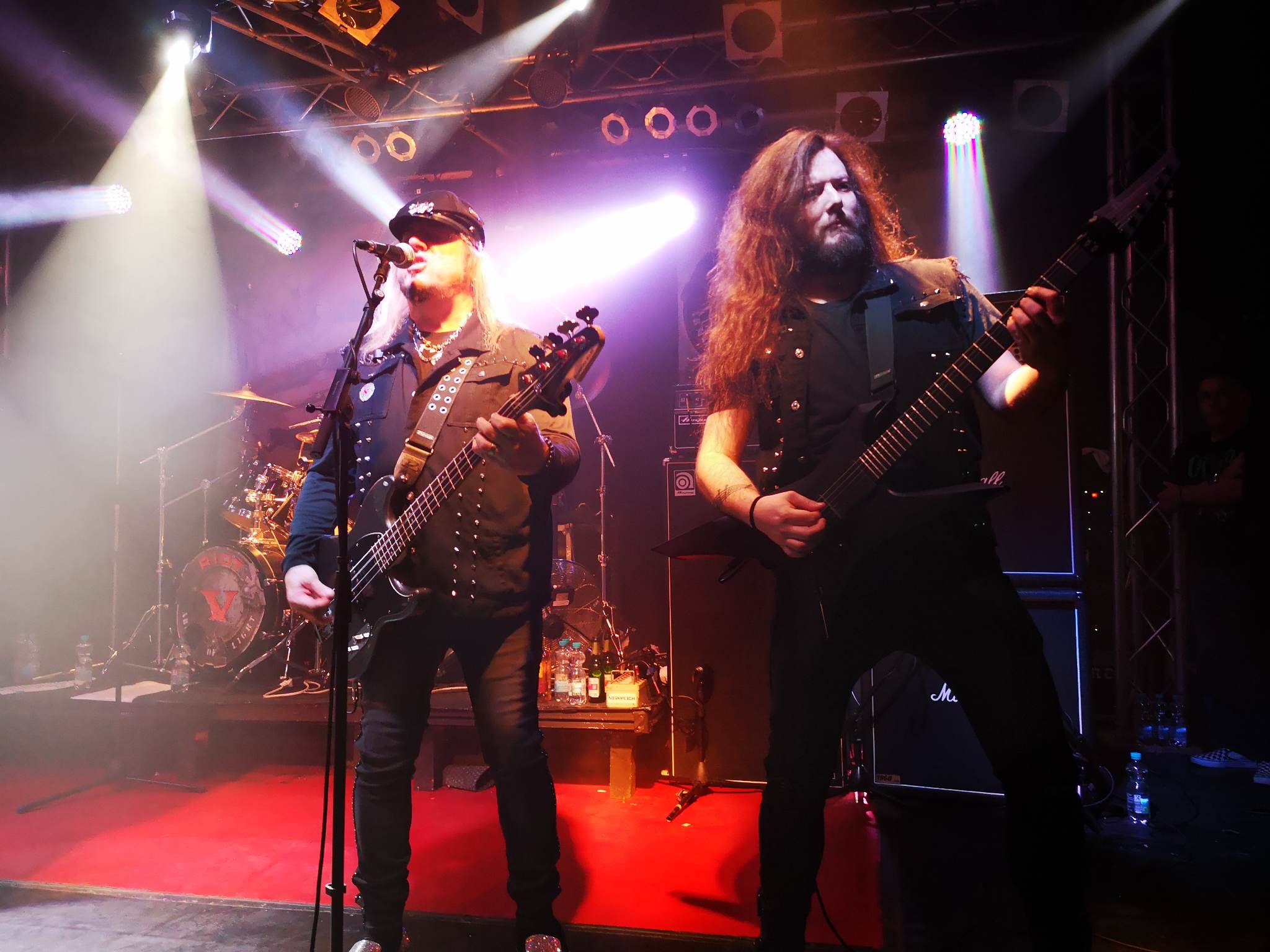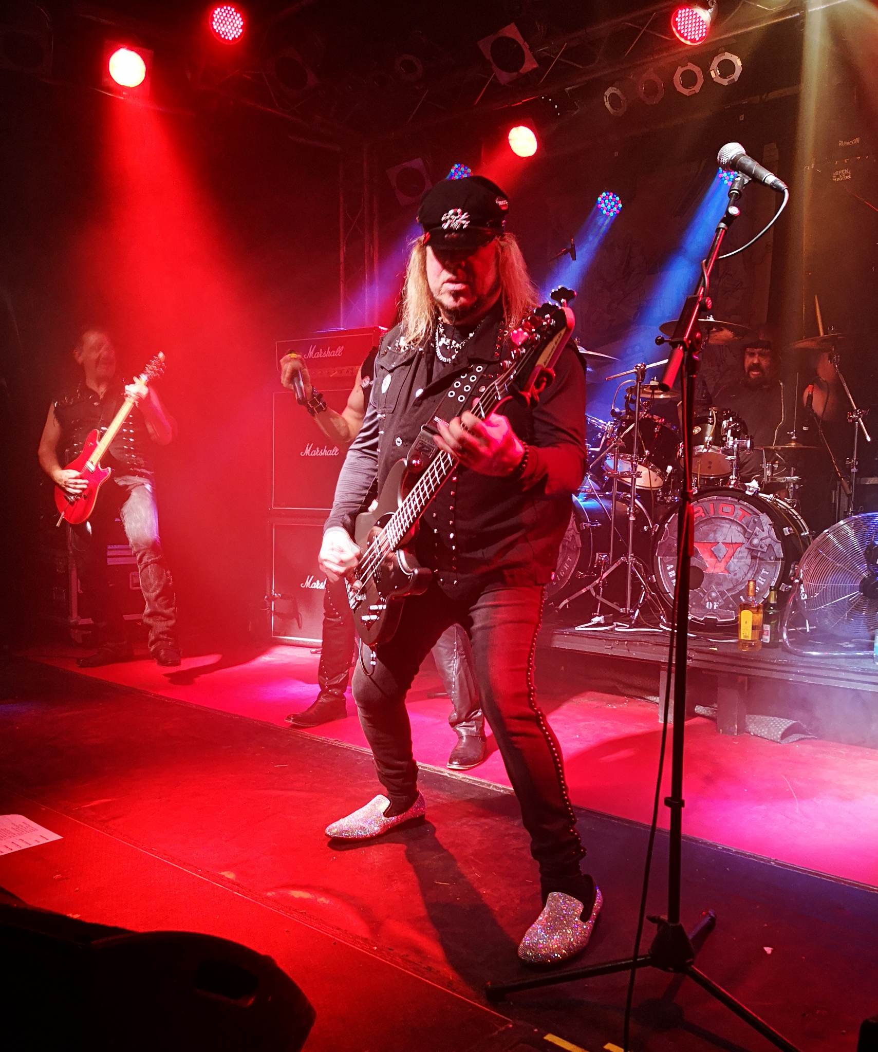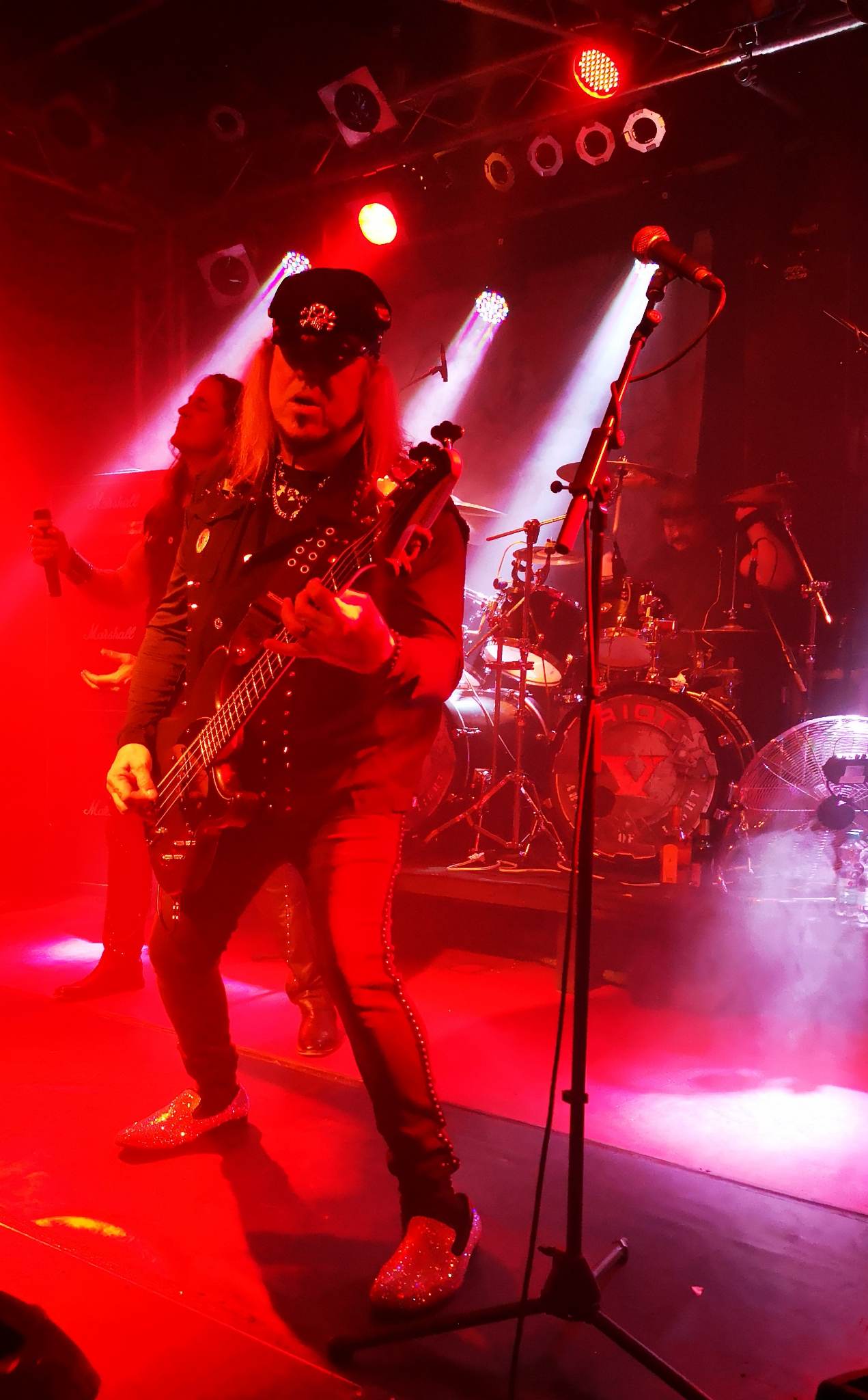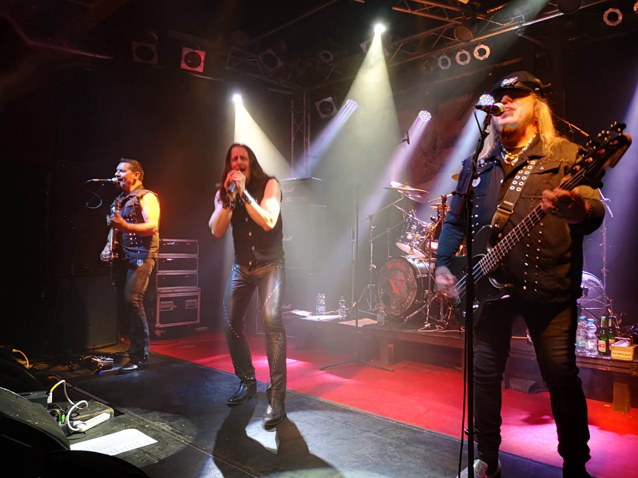 Danach ist das Publikum erst recht heiß auf eine der langlebigsten und beständigsten Bands des Planeten. Auch ohne Mark Reale und ohne jedes weitere Gründungsmitglied führen RIOT V das Erbe würdig weiter. Von der ersten Sekunde an gibt die Band Vollgas. 99% aller Bands hätten “Fight Or Fall” und “On Your Knees” in ihrem Zugabenblock, RIOT V eröffnen mit diesen Klassikern mal ganz locker ihren Gig. Natürlich ist auch die Meute vor der Bühne auf den Punkt hellwach. Glückliche Gesichter, gereckte Fäuste, leidenschaftliches Mitsingen… oder auch -gröhlen. Egal. Spätestens mit “Fire Down Under” an vierter Stelle des Sets explodiert die Stimmung im Club endgültig und von der ersten bis zur letzten Reihe sind alle voll dabei. Todd Michael Hall zeigt erneut eine souveräne, eigentlich völlig überirdische Gesangsleistung. Er trägt seine Vokalakrobatik mit solcher Lockerheit und ohne jeden unsicheren Ton vor, dass es eine wahre Freude ist. Auch Mike Flyntz an der Leadgitarre hat sich längst zur Identifikationsfigur der Band entwickelt. Er füllt die übergroßen Fußstapfen, die Mark Reale hinterließ, wirklich sehr gut aus. An der zweiten Gitarre macht der Ersatzklampfer Jonathan Reinheimer für den verhinderten Nick Lee seine Sache auch richtig gut. Das Rhythmus-Team van Stavern/Gilchriest legt einen bemerkenswert präzisen, auf den Punkt gespielten Teppich.