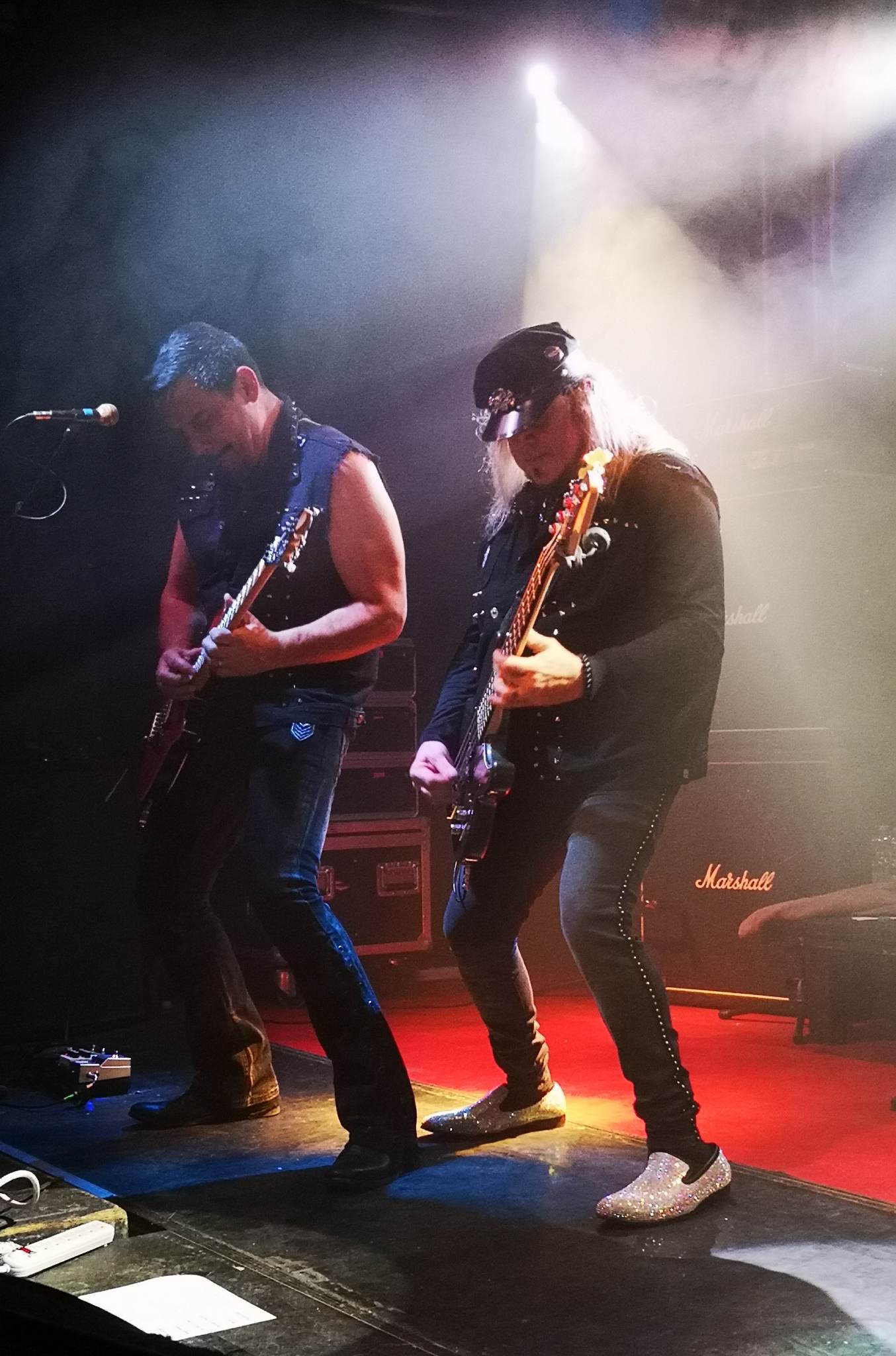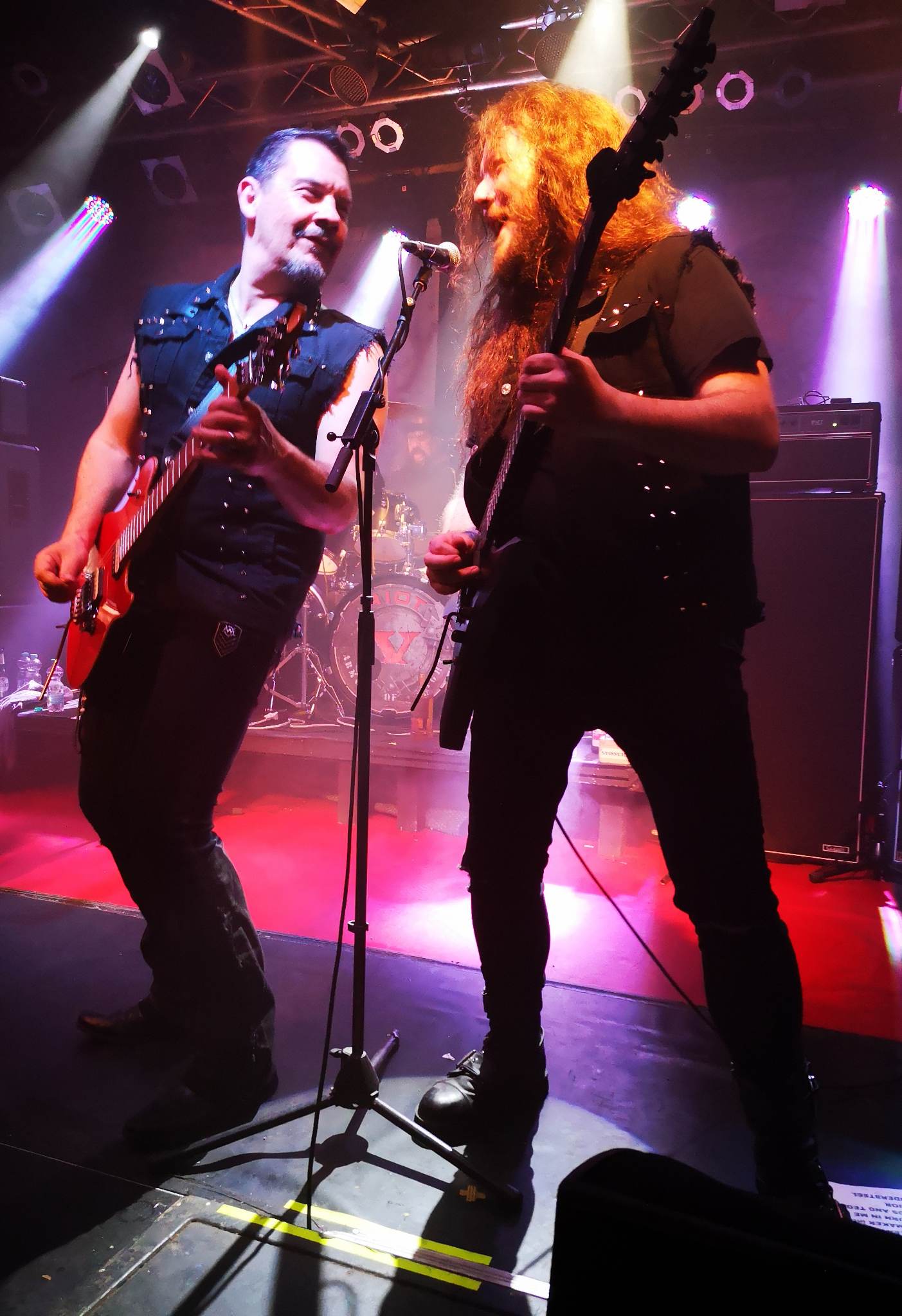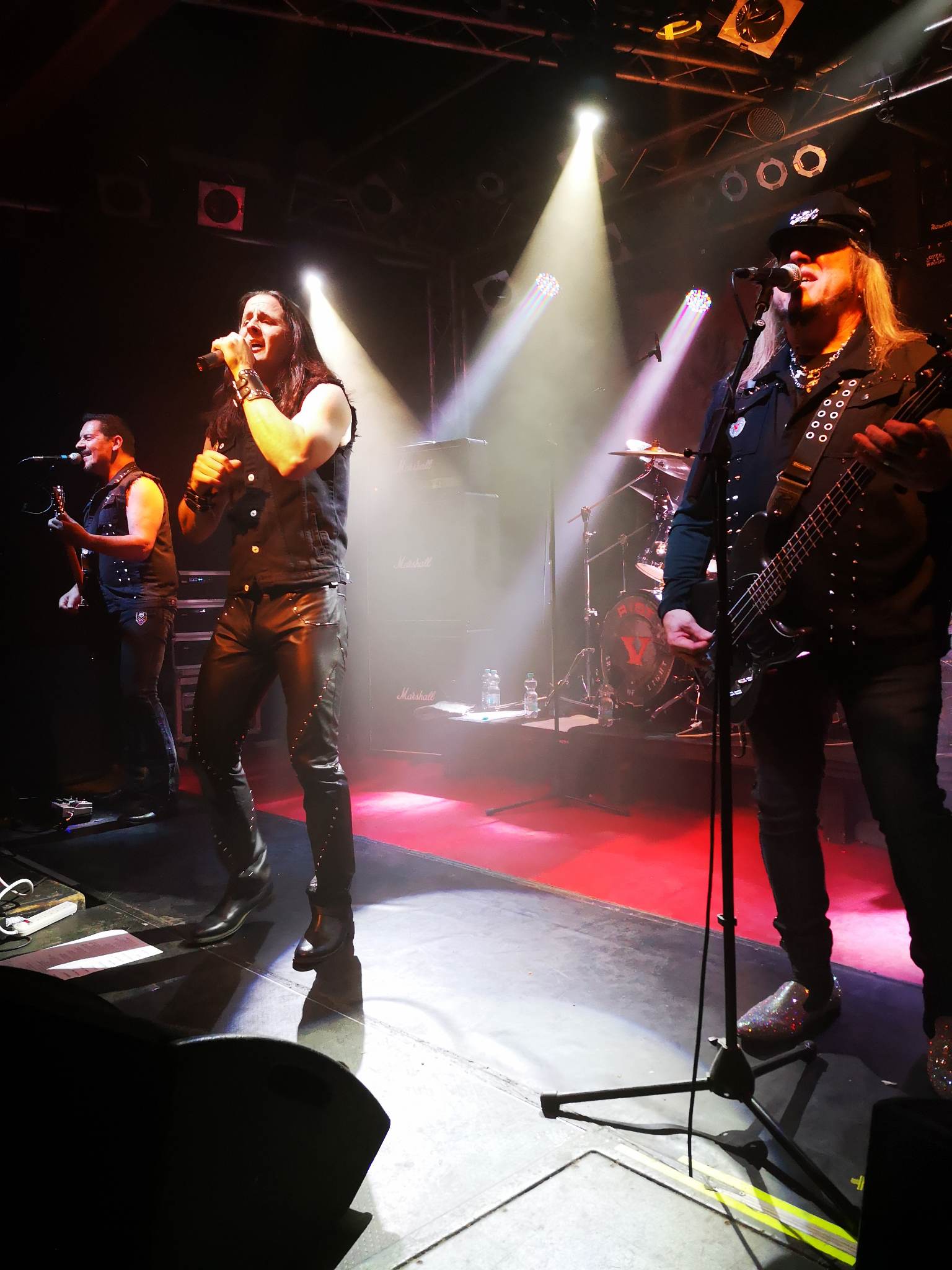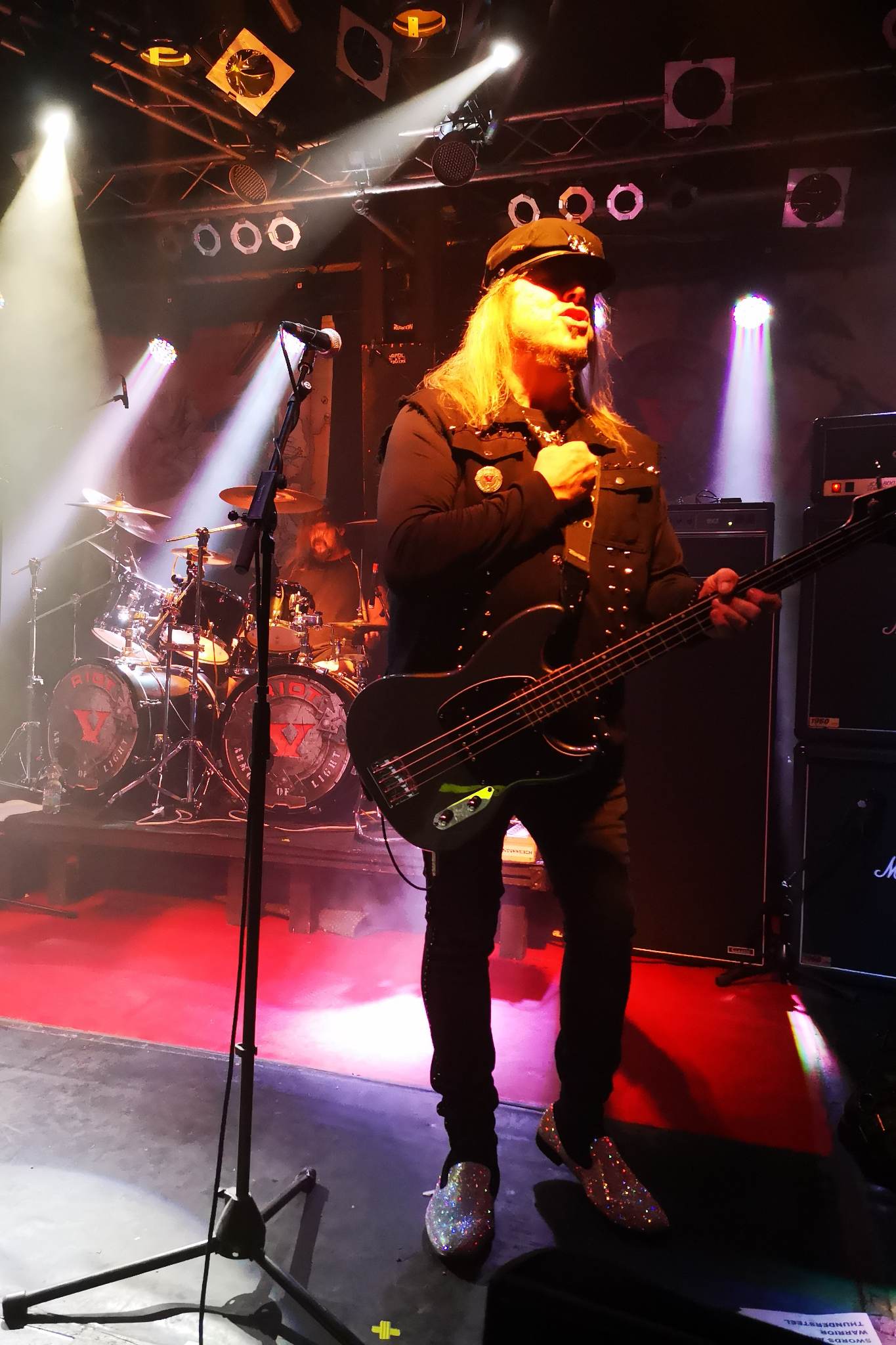 Danach ist das Publikum erst recht heiß auf eine der langlebigsten und beständigsten Bands des Planeten. Auch ohne Mark Reale und ohne jedes weitere Gründungsmitglied führen RIOT V das Erbe würdig weiter. Von der ersten Sekunde an gibt die Band Vollgas. 99% aller Bands hätten “Fight Or Fall” und “On Your Knees” in ihrem Zugabenblock, RIOT V eröffnen mit diesen Klassikern mal ganz locker ihren Gig. Natürlich ist auch die Meute vor der Bühne auf den Punkt hellwach. Glückliche Gesichter, gereckte Fäuste, leidenschaftliches Mitsingen… oder auch -gröhlen. Egal. Spätestens mit “Fire Down Under” an vierter Stelle des Sets explodiert die Stimmung im Club endgültig und von der ersten bis zur letzten Reihe sind alle voll dabei. Todd Michael Hall zeigt erneut eine souveräne, eigentlich völlig überirdische Gesangsleistung. Er trägt seine Vokalakrobatik mit solcher Lockerheit und ohne jeden unsicheren Ton vor, dass es eine wahre Freude ist. Auch Mike Flyntz an der Leadgitarre hat sich längst zur Identifikationsfigur der Band entwickelt. Er füllt die übergroßen Fußstapfen, die Mark Reale hinterließ, wirklich sehr gut aus. An der zweiten Gitarre macht der Ersatzklampfer Jonathan Reinheimer für den verhinderten Nick Lee seine Sache auch richtig gut. Das Rhythmus-Team van Stavern/Gilchriest legt einen bemerkenswert präzisen, auf den Punkt gespielten Teppich.