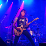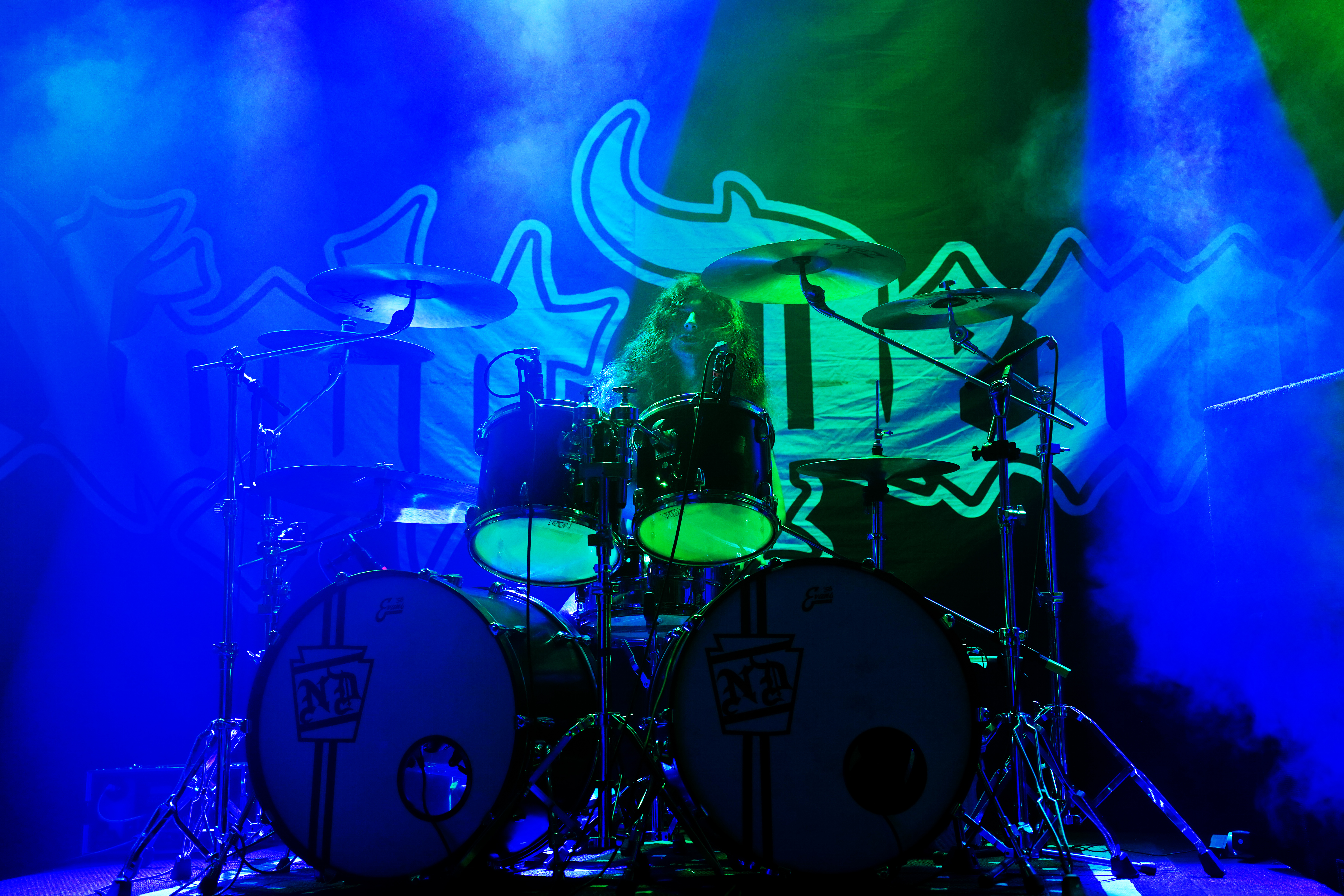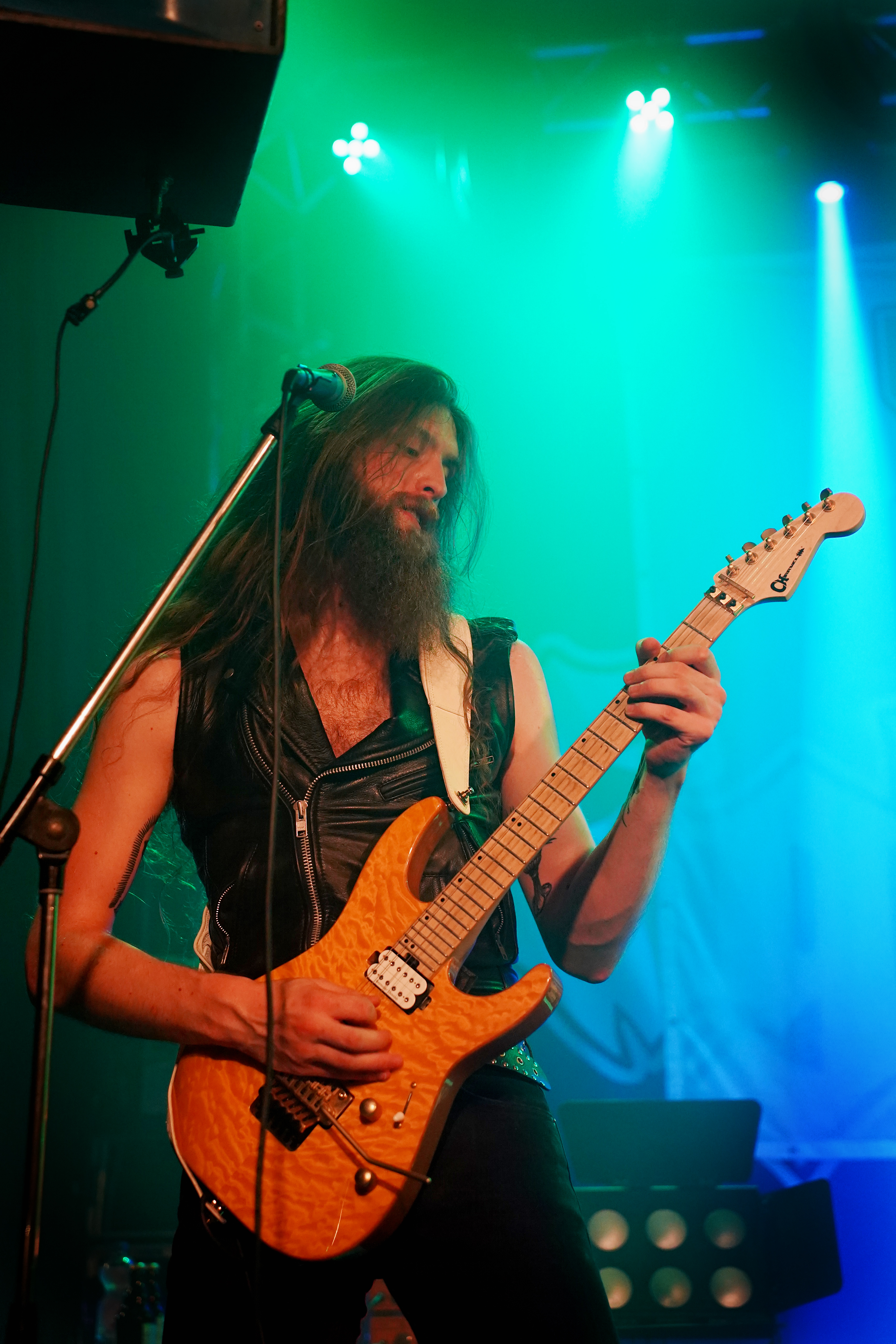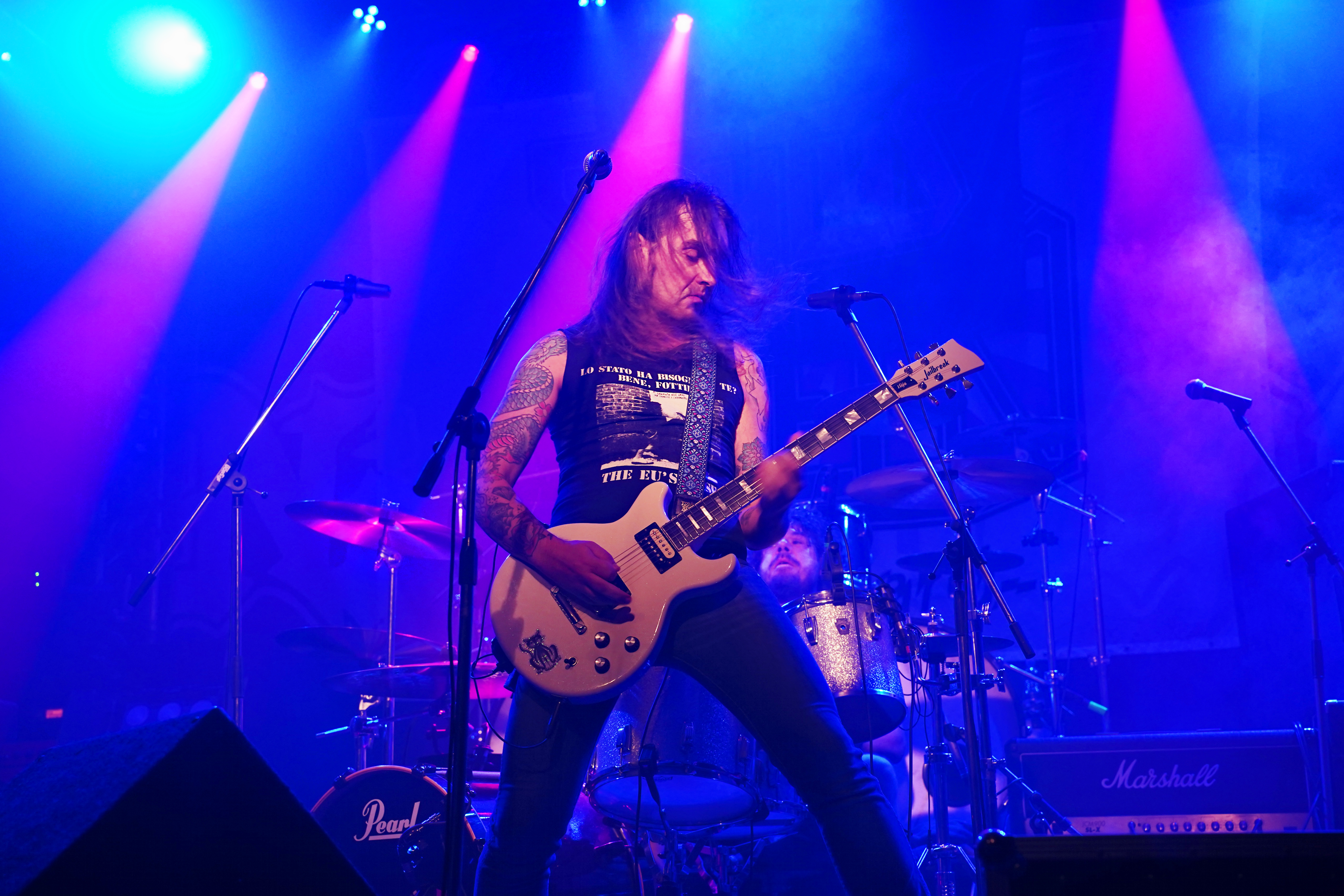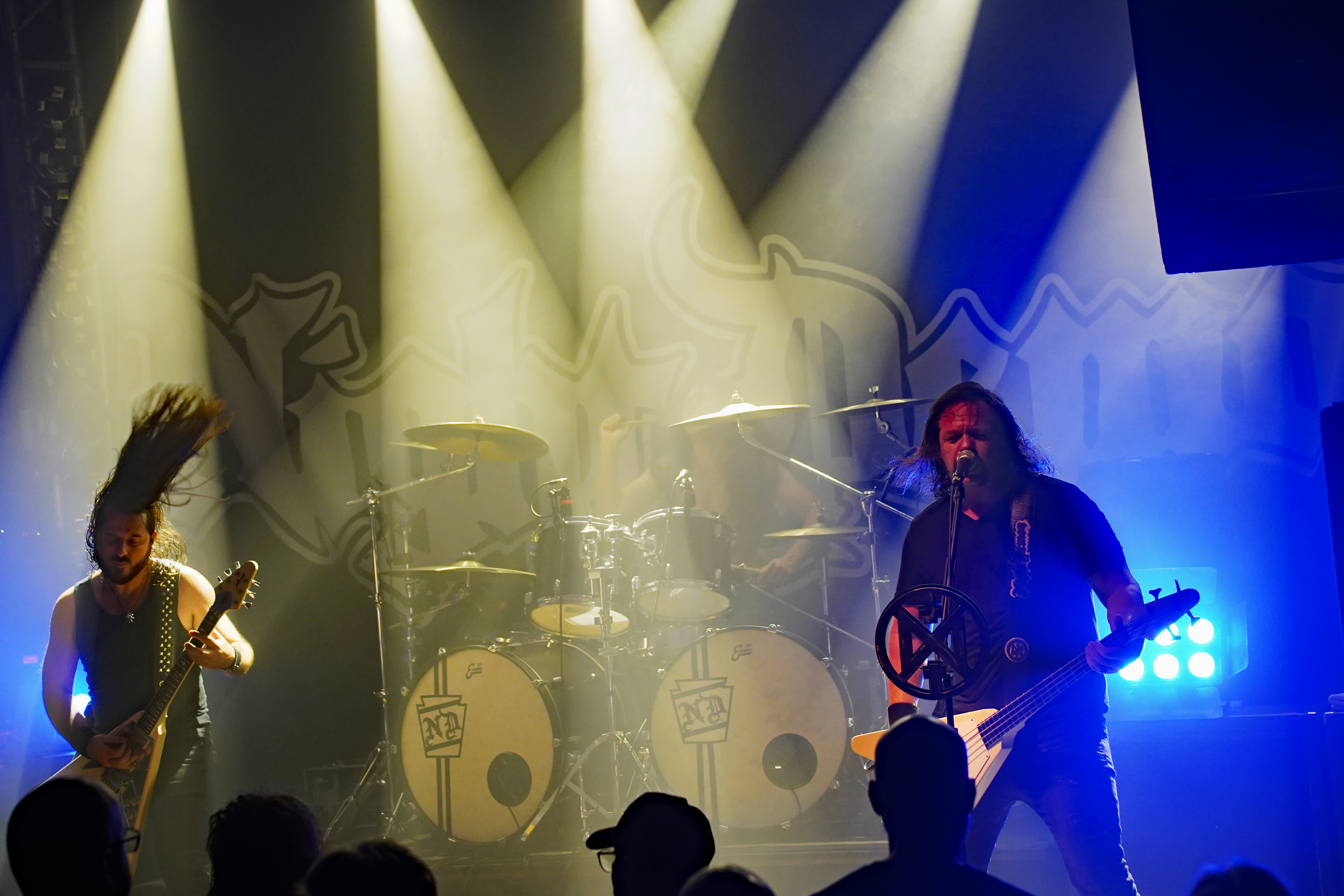 NIGHT DEMON überzeugen von Beginn an mit Atmosphäre, Knüppel auf den Kopf und einem sehr agilen und im weiteren Verlauf immer präziser werdenden Gitarristen, der sich häufigen Szenen-Applaus verdient hat. Das US-Trio ist verständlicherweise top eingespielt, und die Bühne wird gerecht zwischen den drei Musikern aufgeteilt. Das Set besteht in der ersten Hälfte komplett aus dem neuen Album "Outsider". Inklusive Intro gibt es 8 Songs des 9 Songs umfassenden Longplayers und diese in der gleichen Reihenfolge wie auf der Konserve. Danach kommen alle weiteren NIGHT DEMON-Veröffentlichungen zum Zuge. Zu unserer Überraschung gibt es keinen einzigen Coversong. Nicht, dass uns der gefehlt hätte. Aber NIGHT DEMON hat doch zuweilen eine ganze Riege wunderbarer Versionen im Programm, u.a. von BLACK SABBATH, THIN LIZZY, DIAMOND HEAD und den SCORPIONS; dieses Mal gibt es nur Eigengewächse. Hier freut mich das ungewöhnliche und stimmungsvolle "Darkness Remains" ganz besonders, das kurz vor dem Zugabenblock nochmal ordentlich Motivation in dem mittlerweile auf Saunatemperaturen angeheizten Club freisetzt. Nach gut 80 Minuten sind die US Boys fertig und das Publikum komplett nassgeschwitzt. Alle drei Musiker funktionieren als Einheit und präsentieren sich als würdigen Headliner. Der Gitarrist Armand John Anthony beeindruckt mit seinen tollen Soli und seinem immer mal wieder die Härte aufweichenden, hardrockigen Spiel. Der Club hat ein tolles, sehr nettes und immer entspanntes Personal und an diesem Freitag ein feierfreudiges, sympathisches Publikum zu bieten. Indes, eine Klimaanlage oder wenigstens ein Deckenventilator wäre ganz sicher eine lohnende Anschaffung bei einem solch heißen Package.